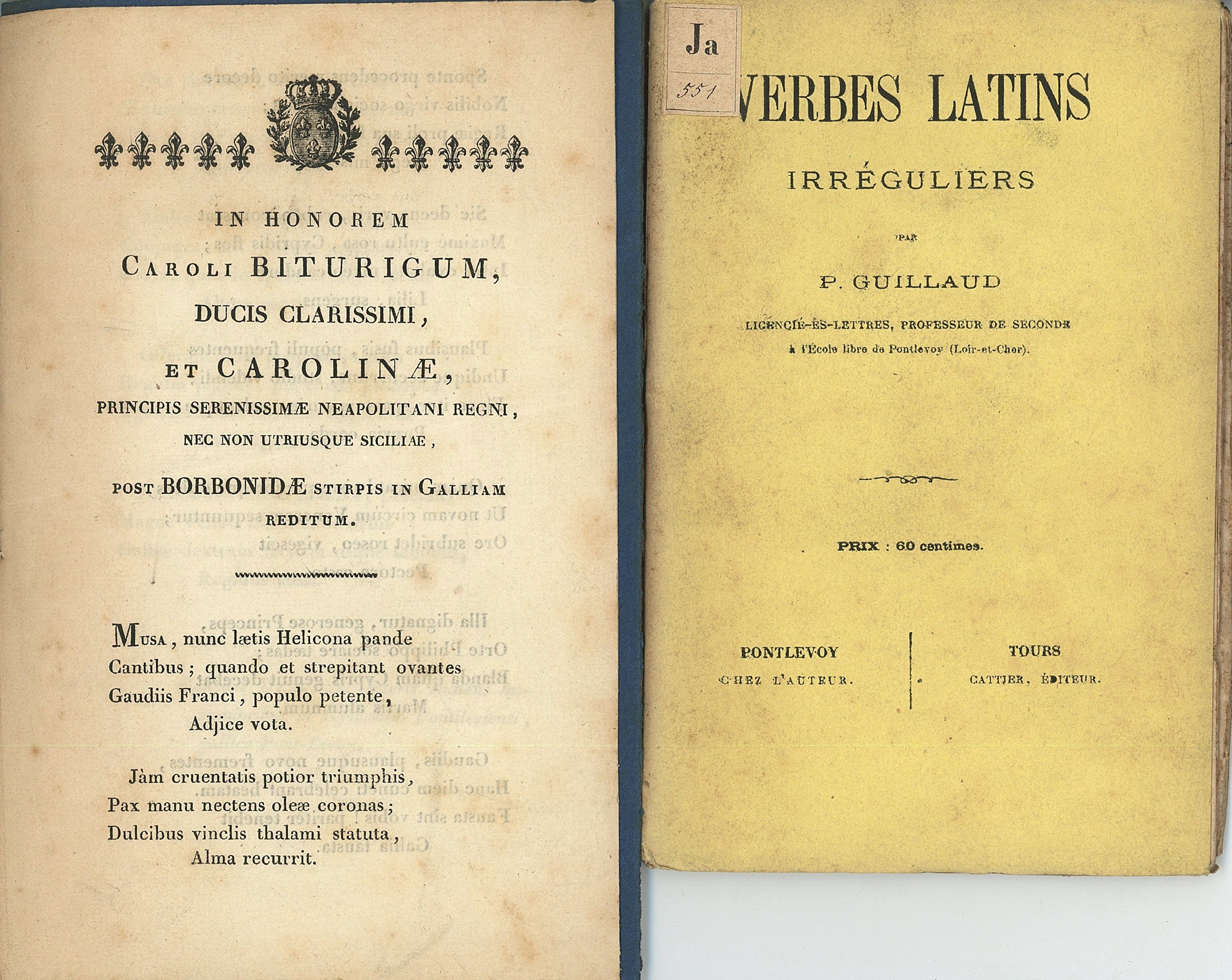 Annales pontiléviennes ou essais littéraires des rhétoriciens et des humanistes du collège de Pontlevoy, Blois, veuve Jahyer, 3 vol. rel. in-8, années 1820, 1821 et 1822 ; exemplaires ayant appartenu à Charles Alexandre Pornin, fils du sous-directeur ; chaque ex. contient en fin de vol. une table manuscrite des sujets ; Henri Quatre à Gabrielle, partition musicale dédiée à M. Chappotin directeur et propriétaire du collège ;