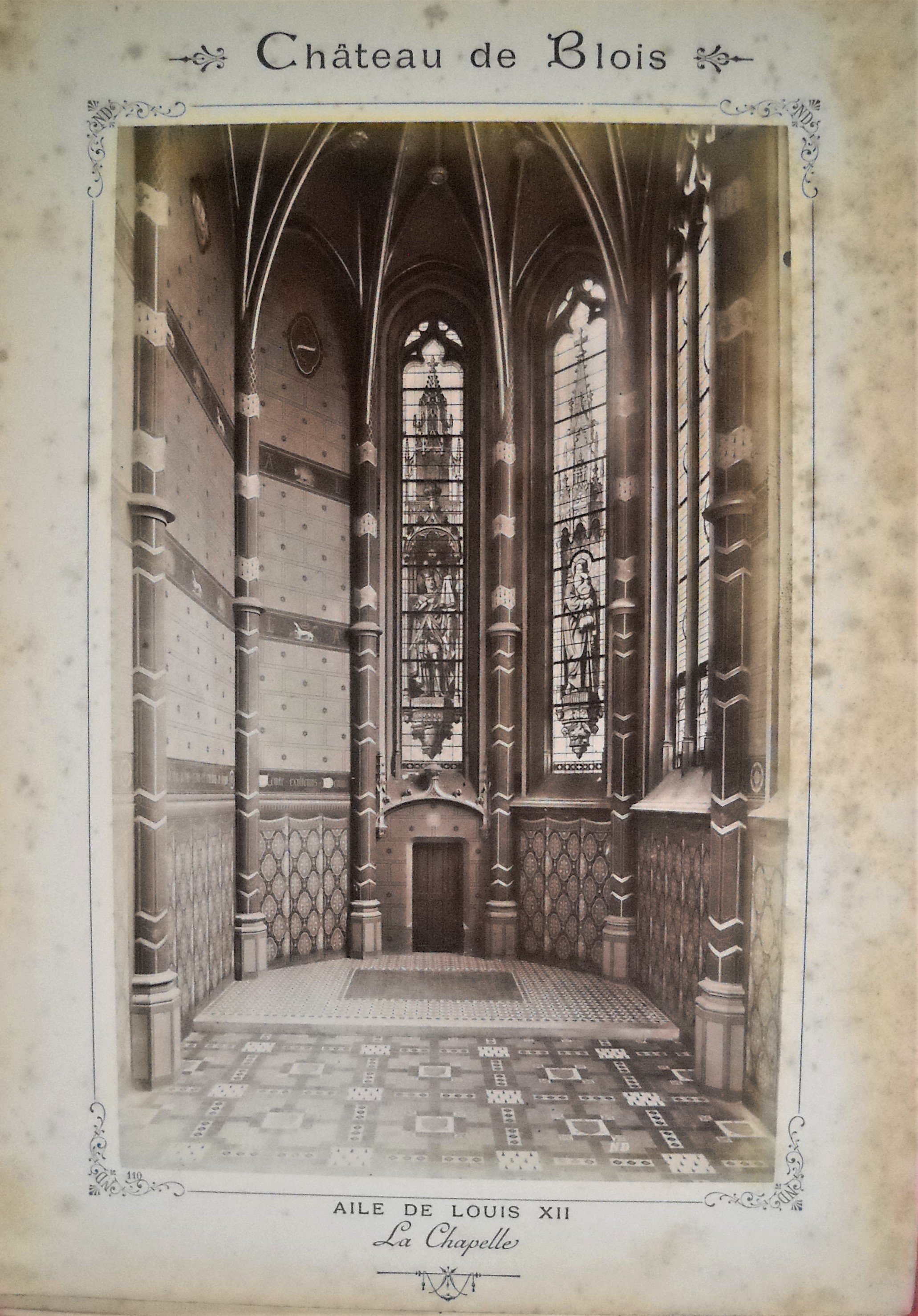 Joint: Château de Blois, album à l’italienne de 24 tirages photographiques (env. 12 x 20 cm) contreccollés sur carton fort, légendes et encadrés imprimés, fin du 19e siècle (nombreuses rousseurs).