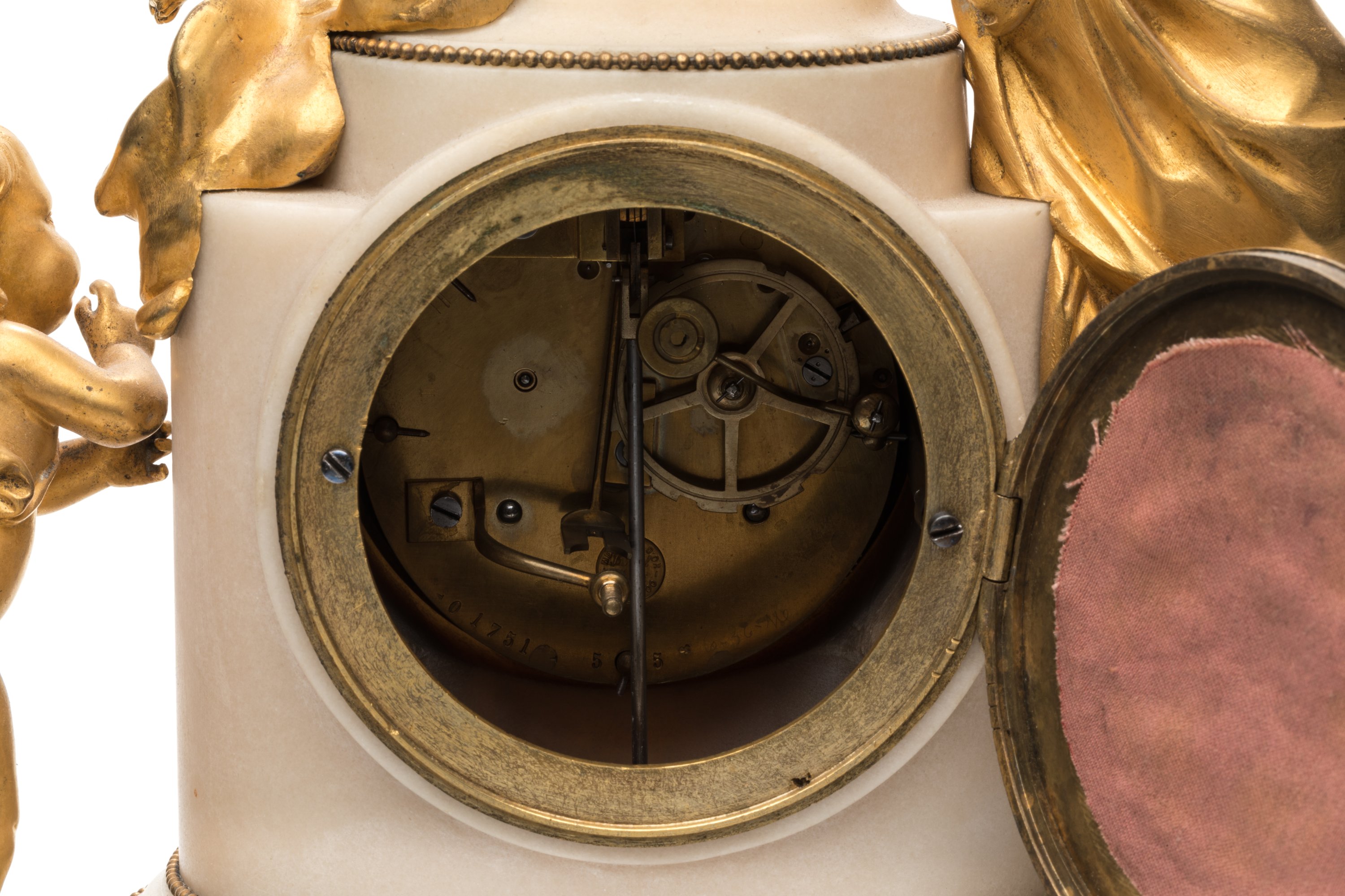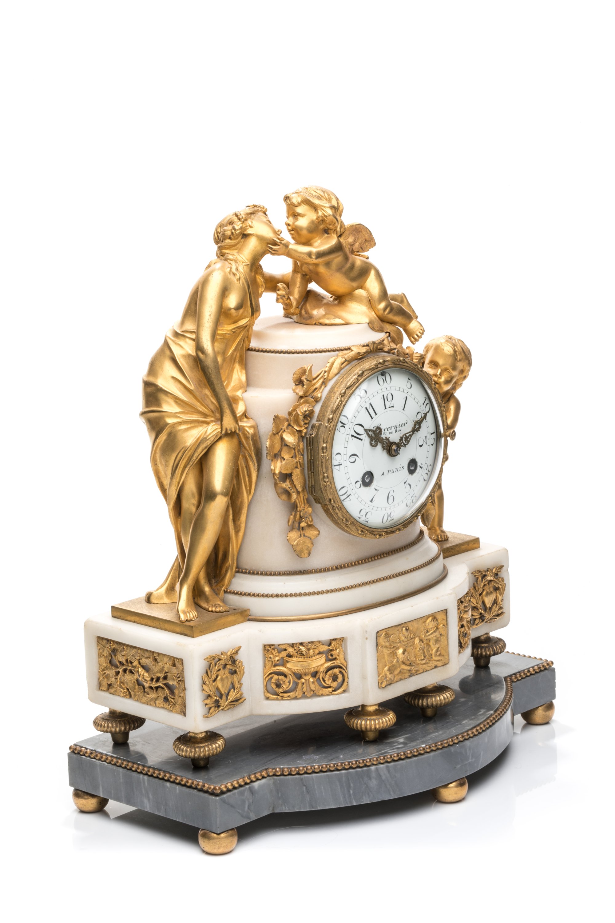 en marbre de Carrare et bronze doré. Le cadran est adossé à un cylindre en marbre entouré de guirlandes feuillagées et de frises de perles. Il est entouré de Vénus se laissant embrasser par un Amour et d'un second Amour. La base est ornée de métopes figurant les Amours alimentant le feu sacré, deux cratères feuillagés et deux curs enflammés inscrits dans une couronne de laurier. Piétement en toupie godronnée en bronze doré.