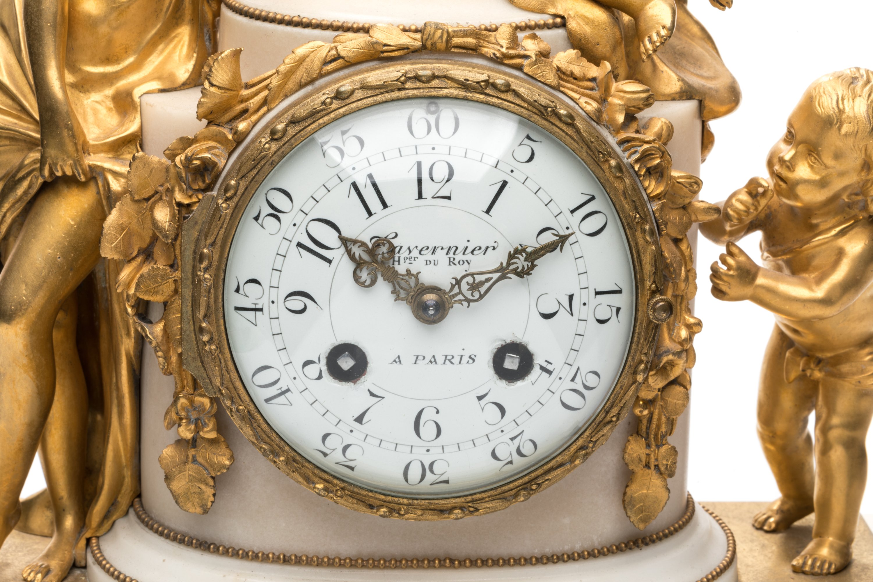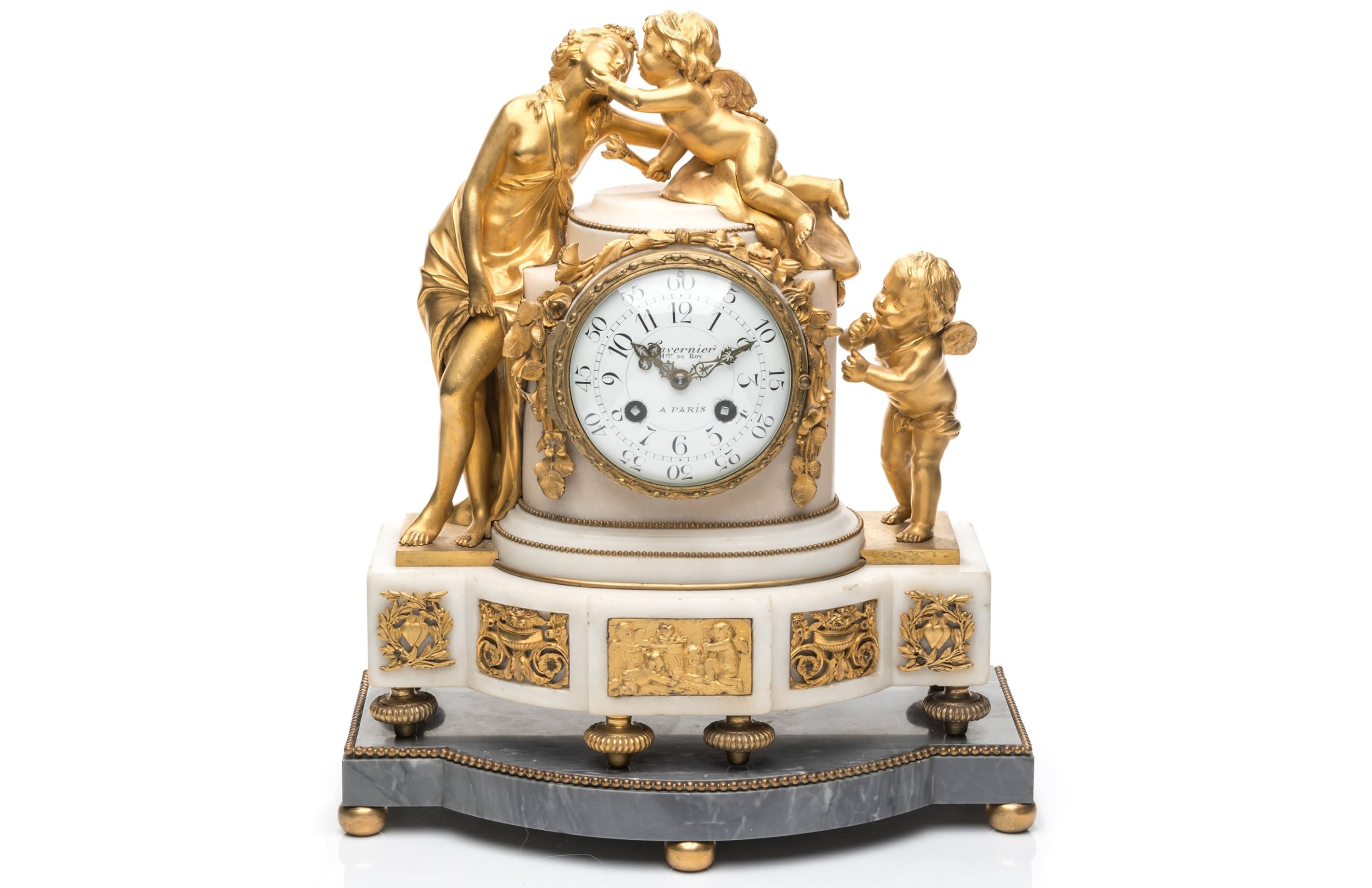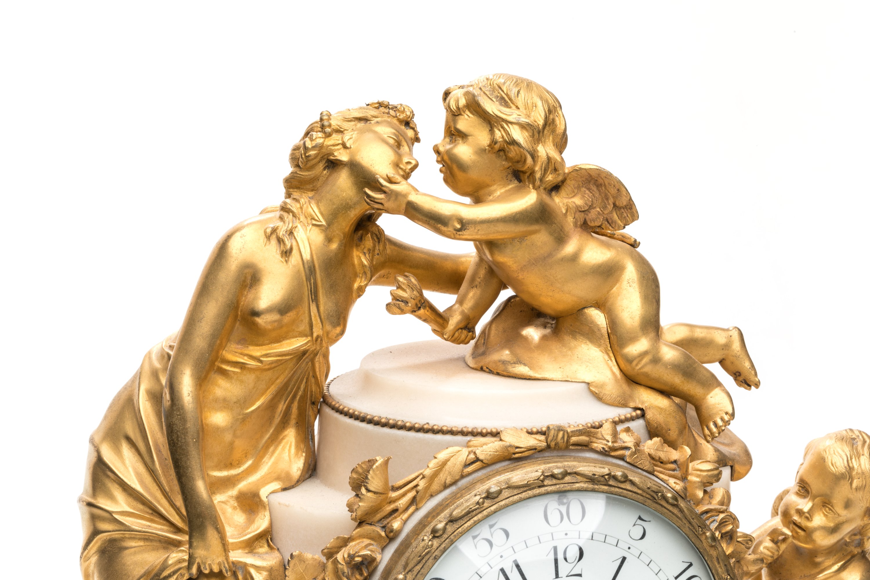A late Louis XVI period marble and gilded bronze clock representing Venus kissing Anteros under Cupid's watch. On a grey marble base decorated with bronze ornaments.