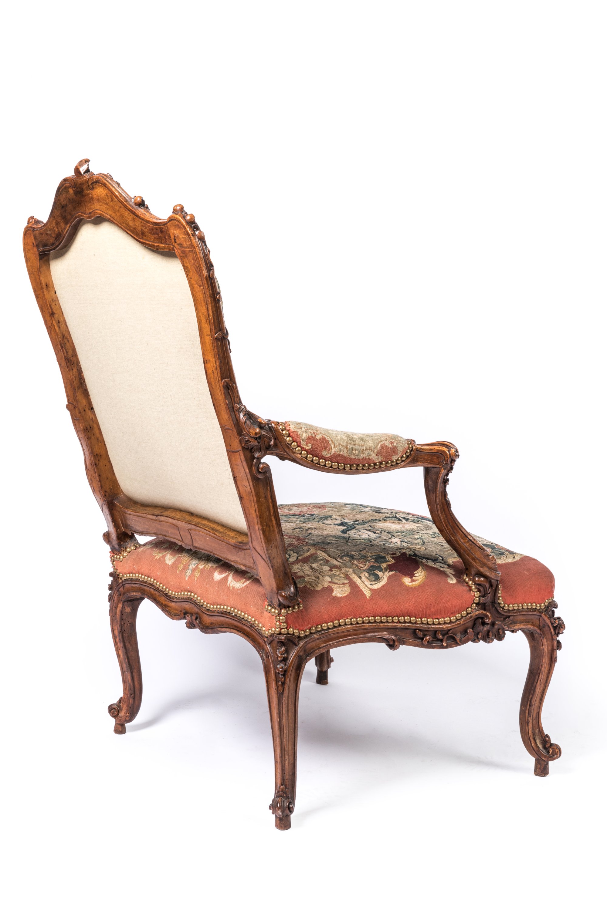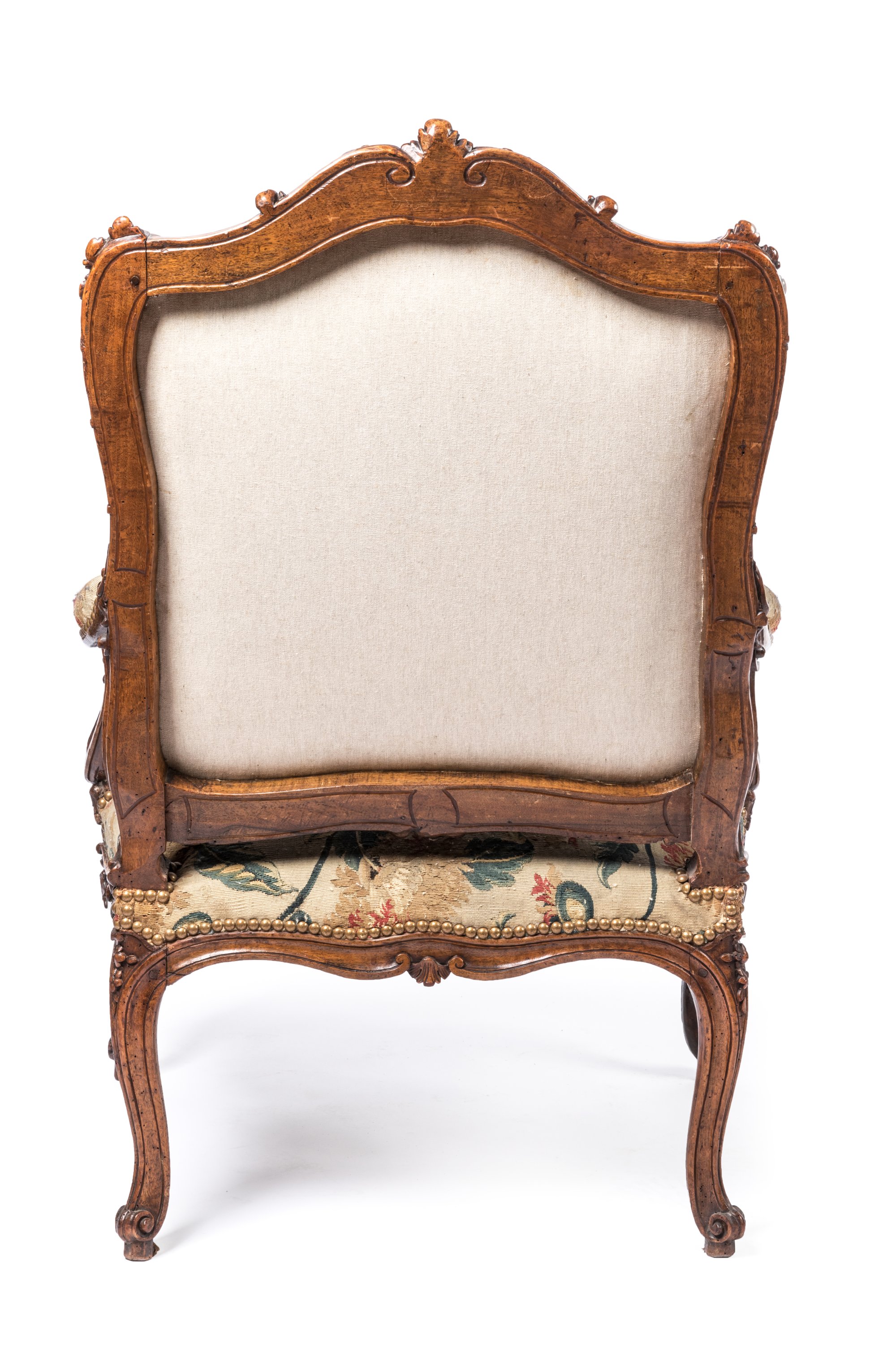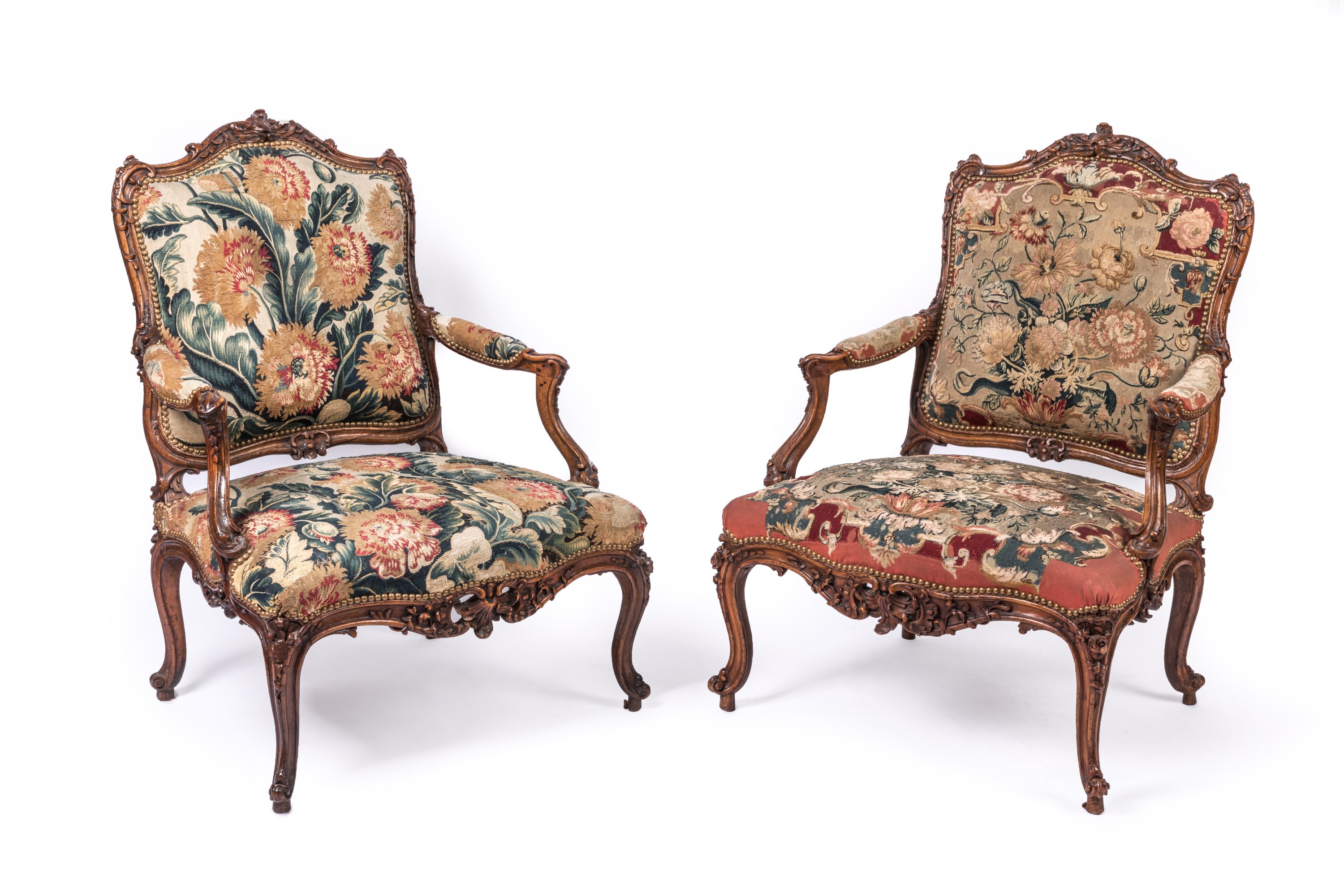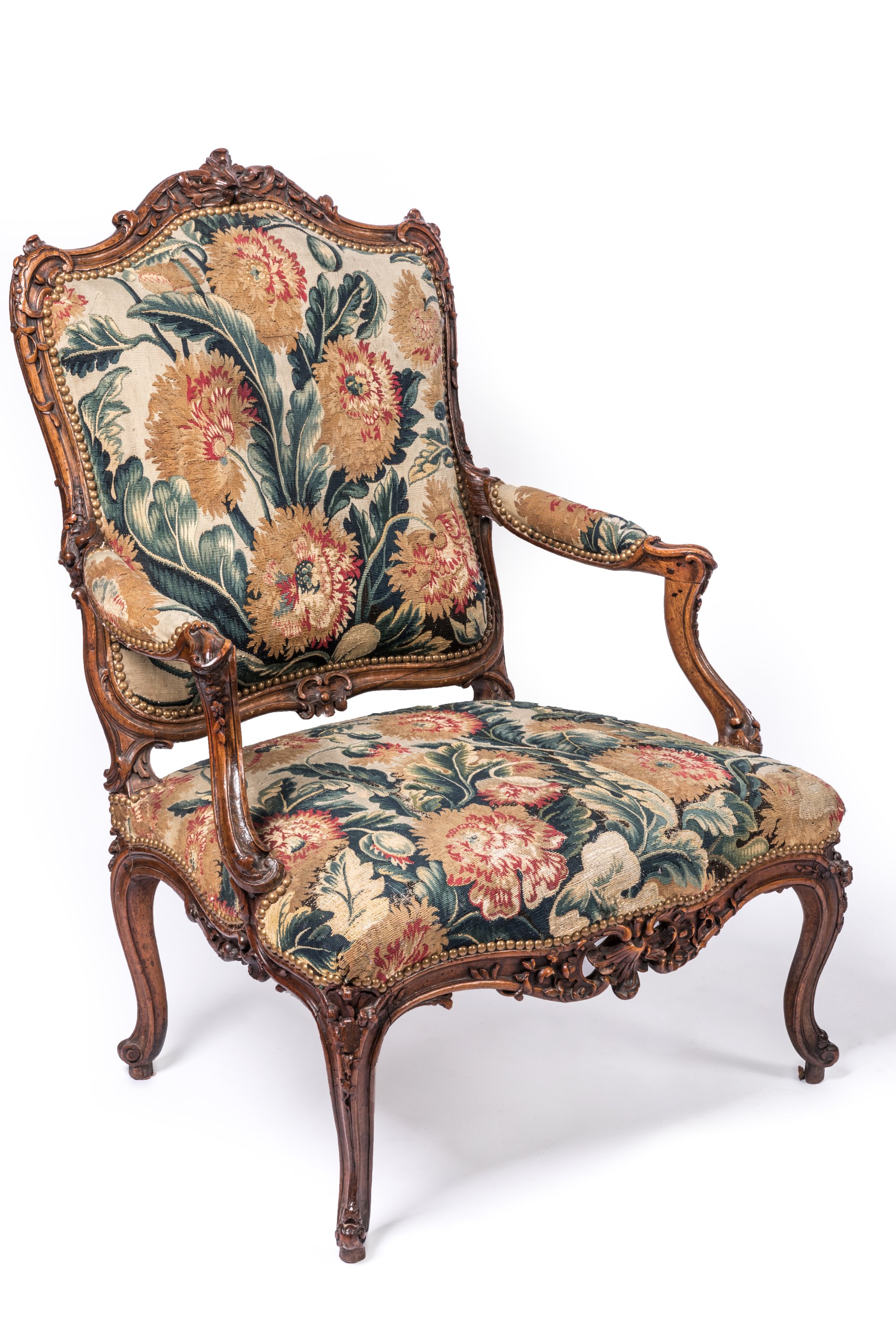 Two large 18th century walnut armchairs with flat backs attributed to Jean-Baptiste I Tilliard. Slightly different carvings and Aubusson upholstery. Early Louis XV rocaille style.