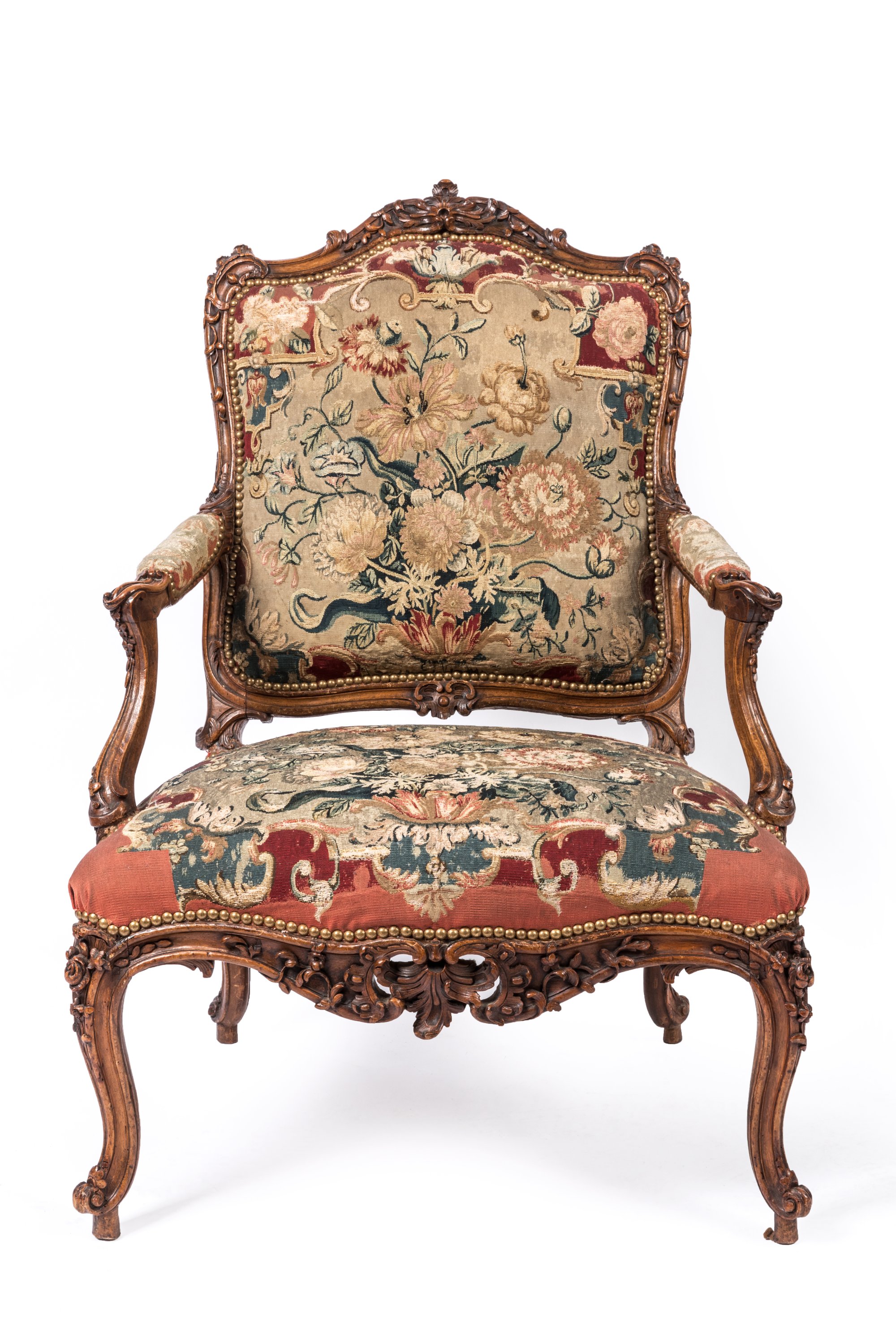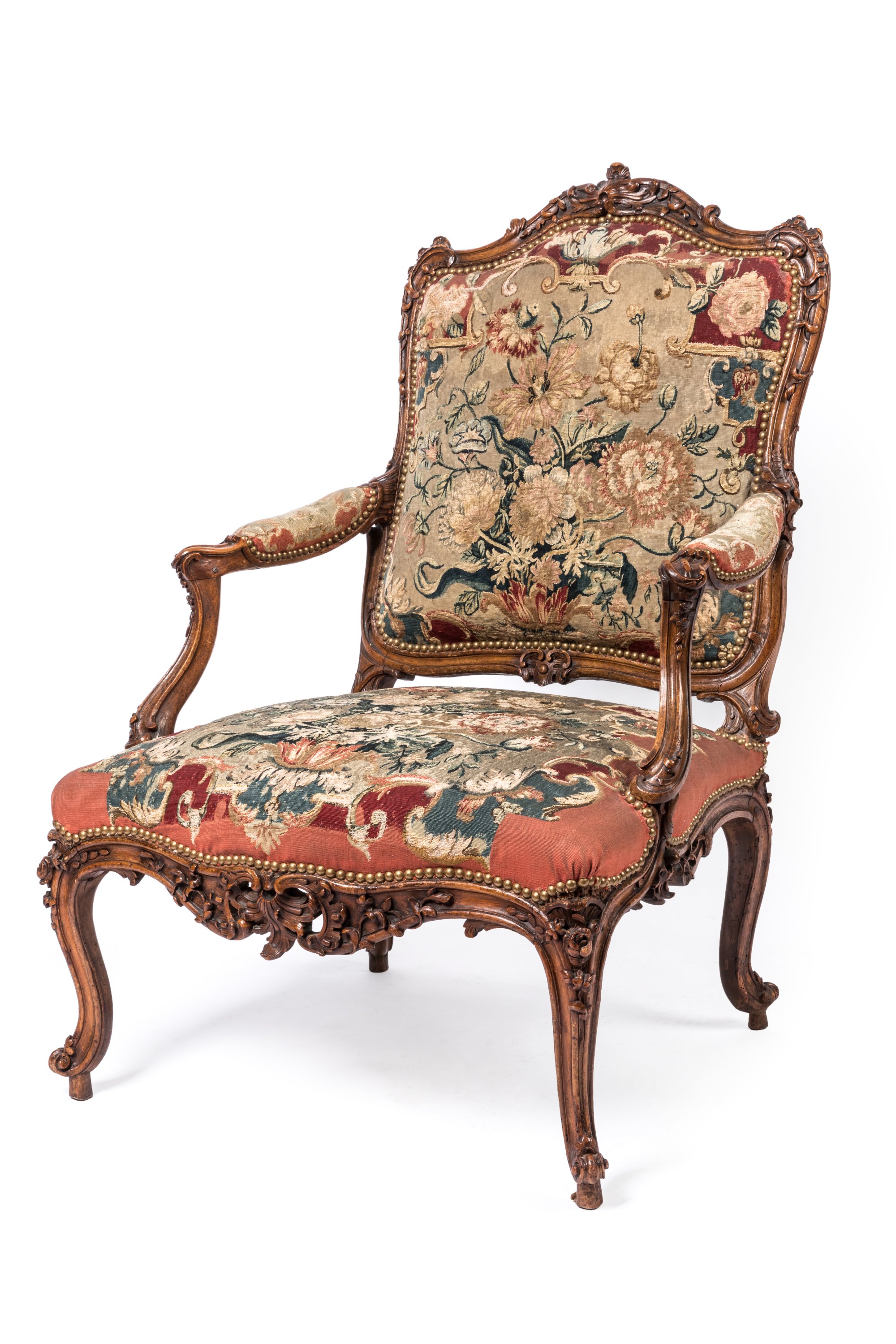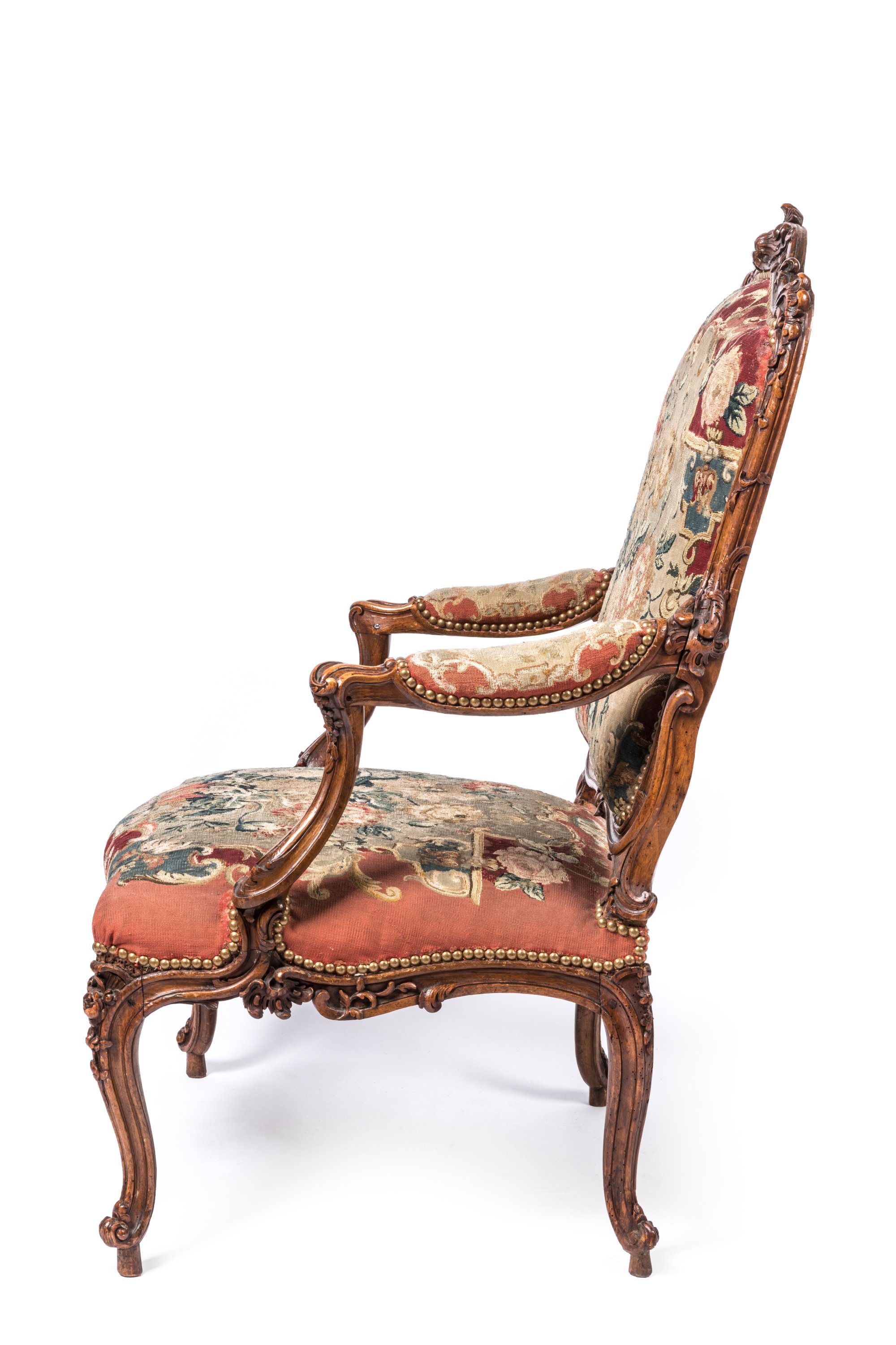 Two large 18th century walnut armchairs with flat backs attributed to Jean-Baptiste I Tilliard. Slightly different carvings and Aubusson upholstery. Early Louis XV rocaille style.