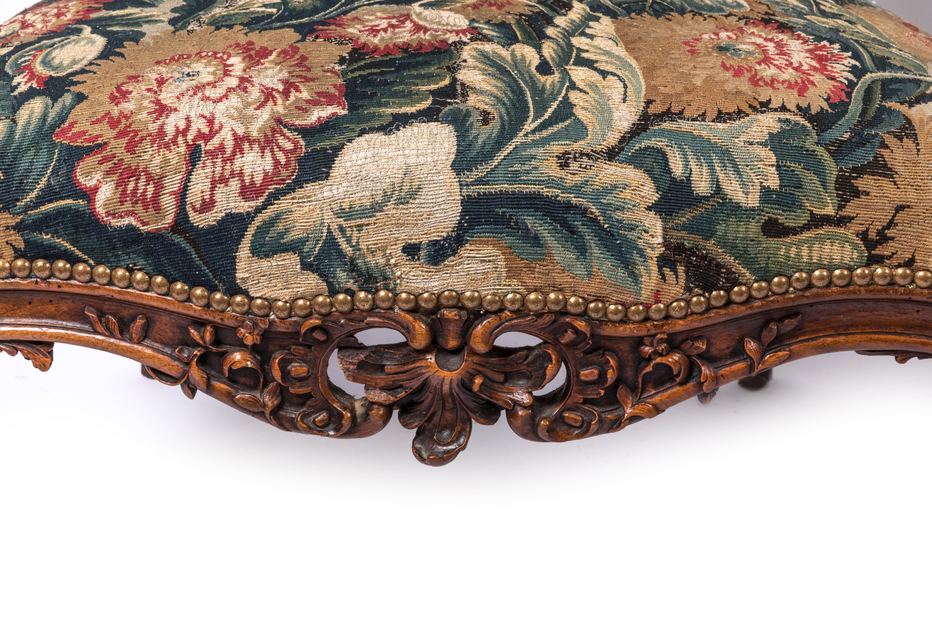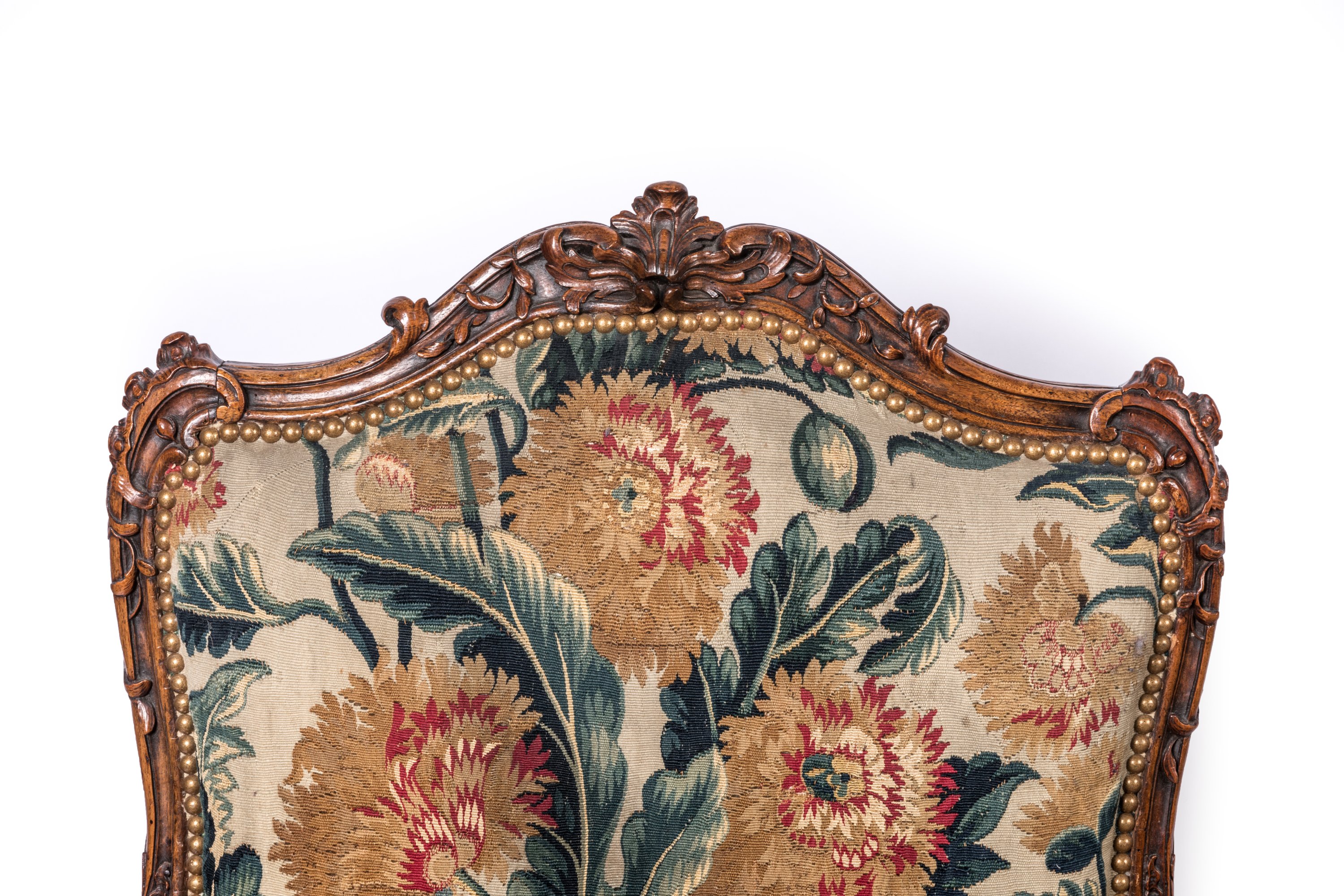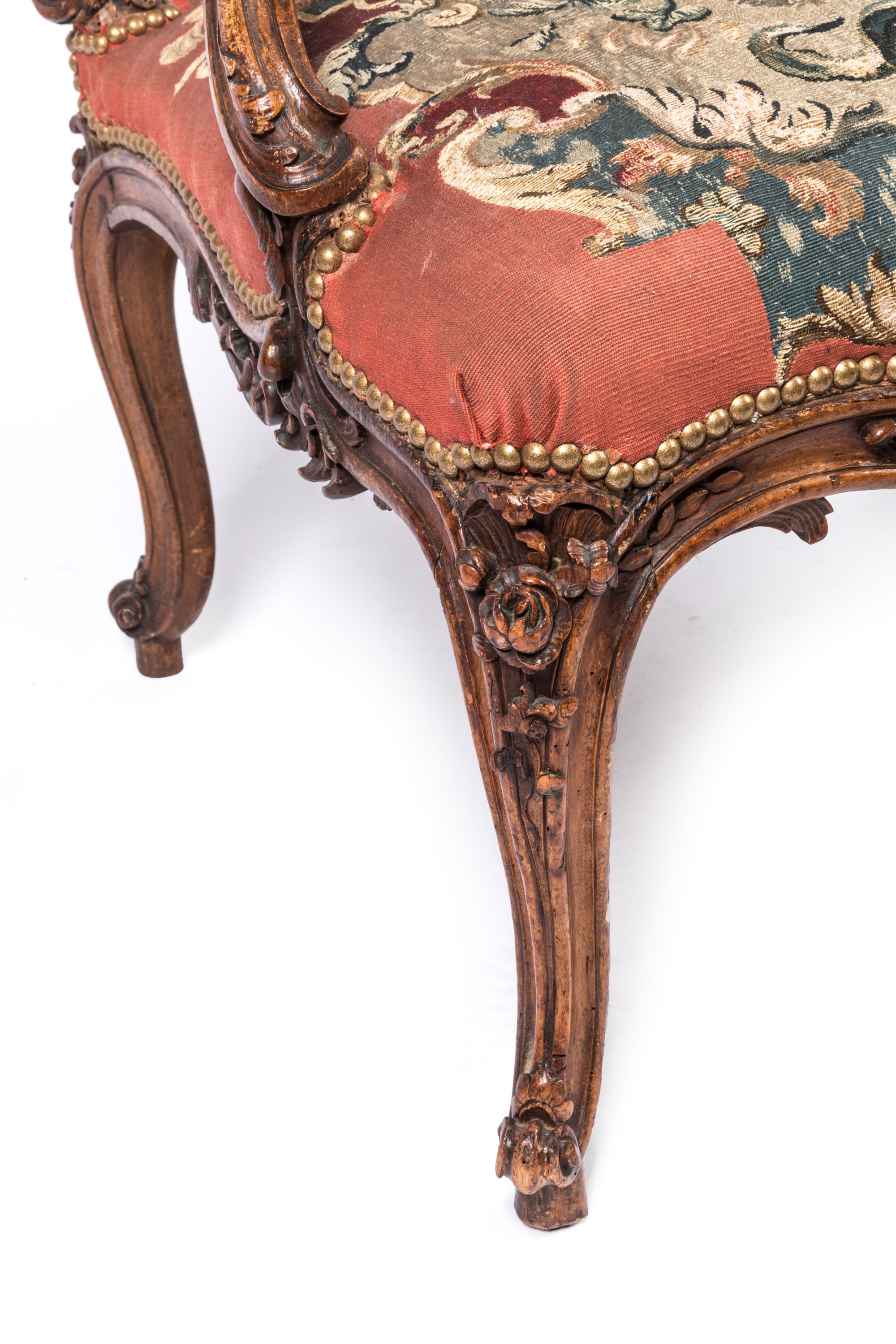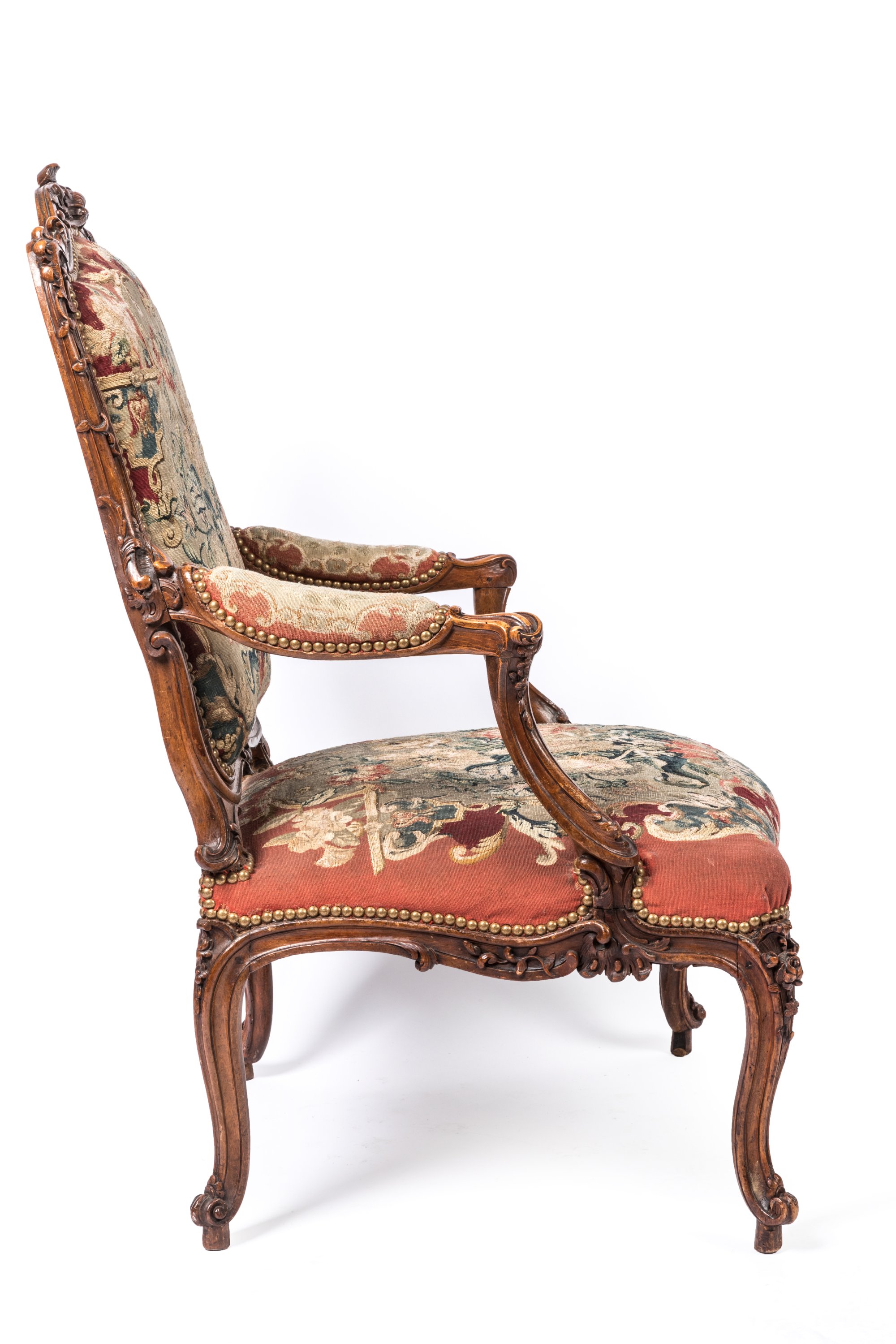 Two large 18th century walnut armchairs with flat backs attributed to Jean-Baptiste I Tilliard. Slightly different carvings and Aubusson upholstery. Early Louis XV rocaille style.