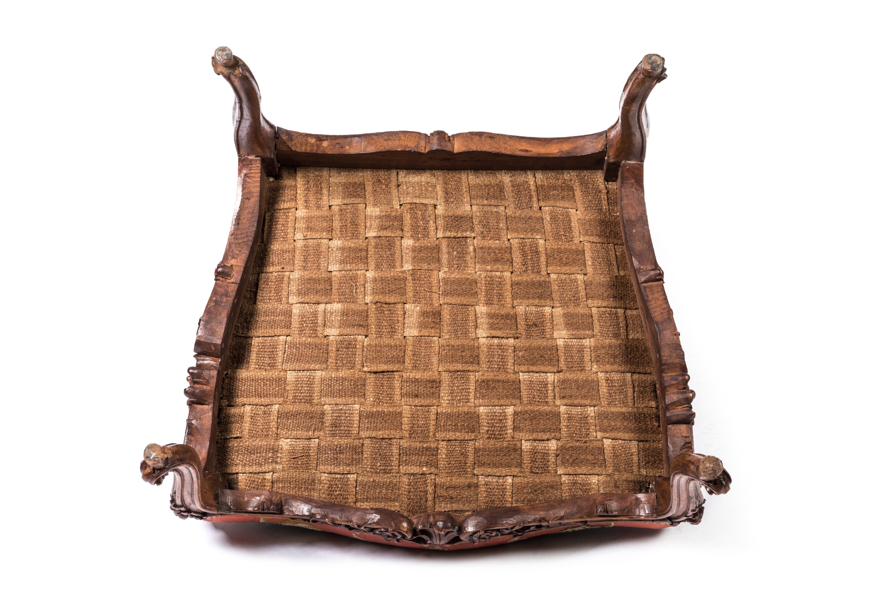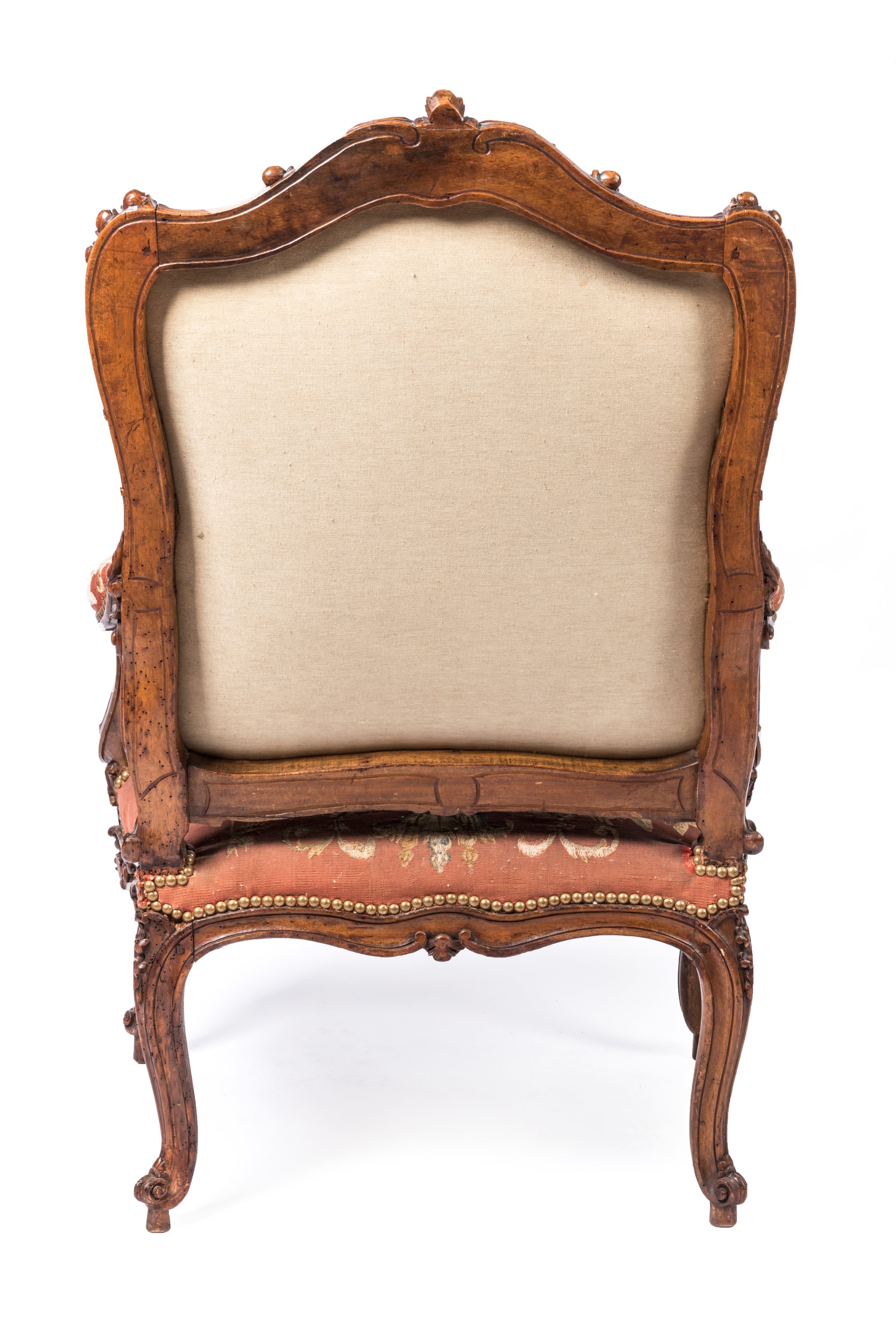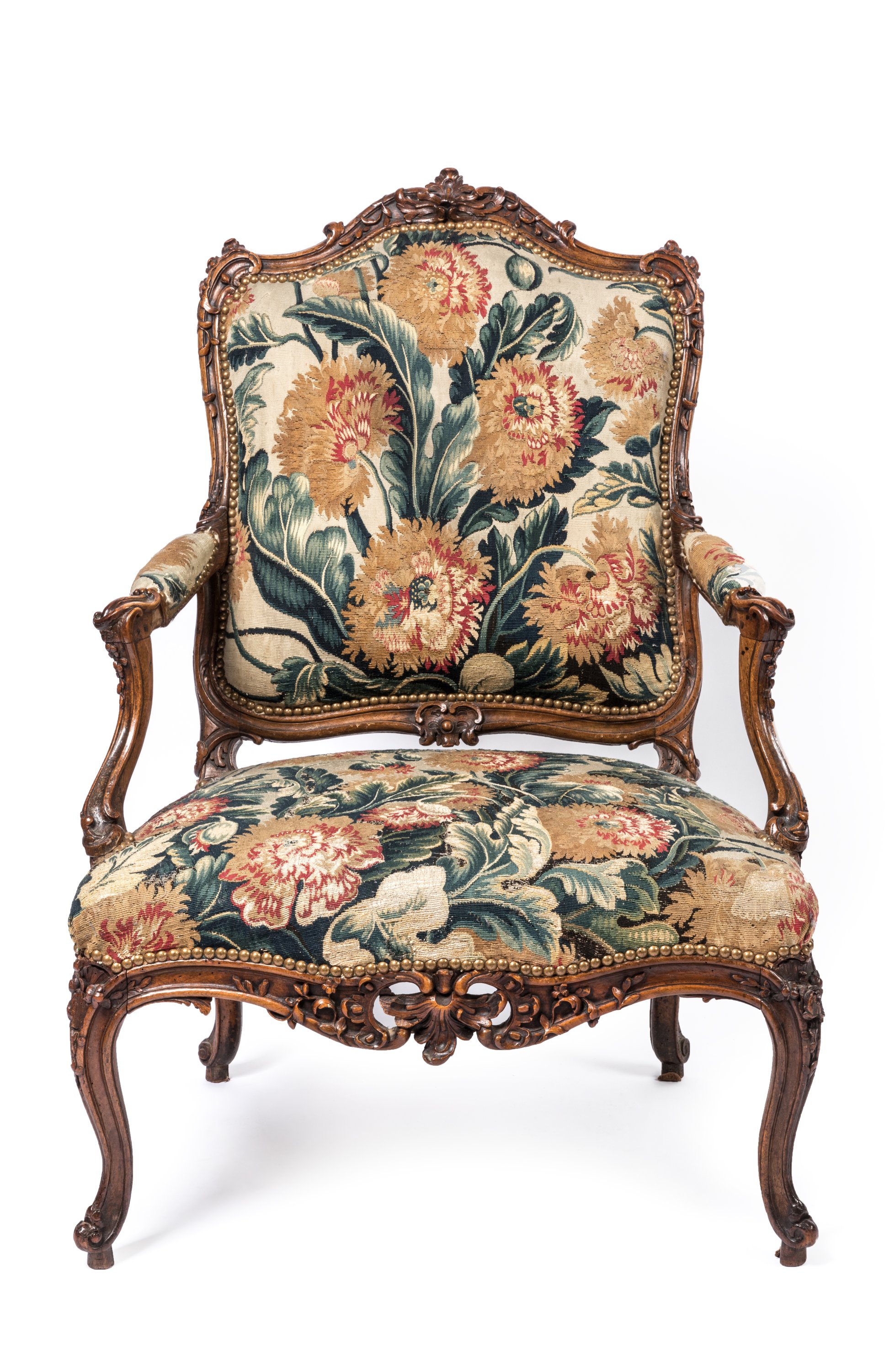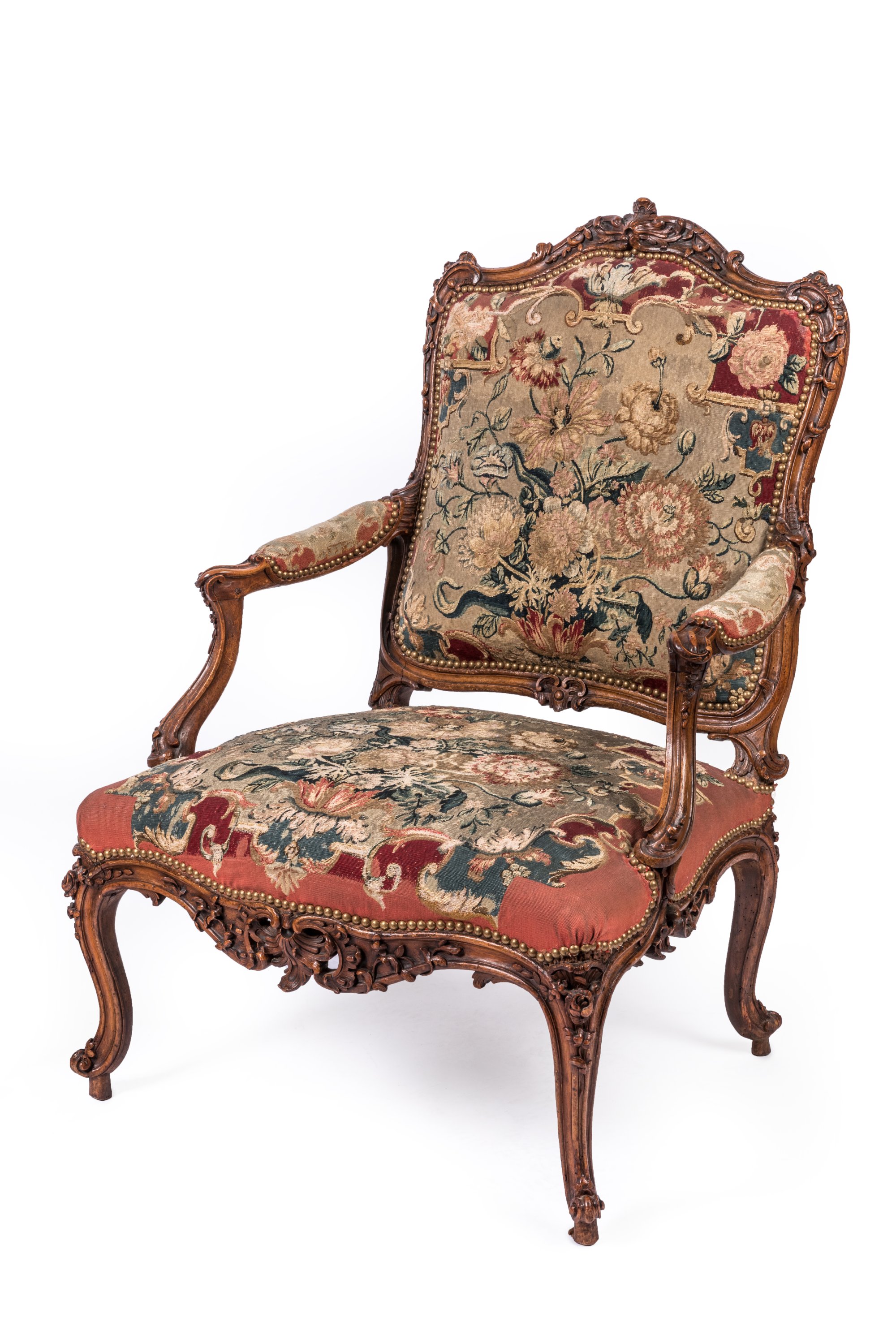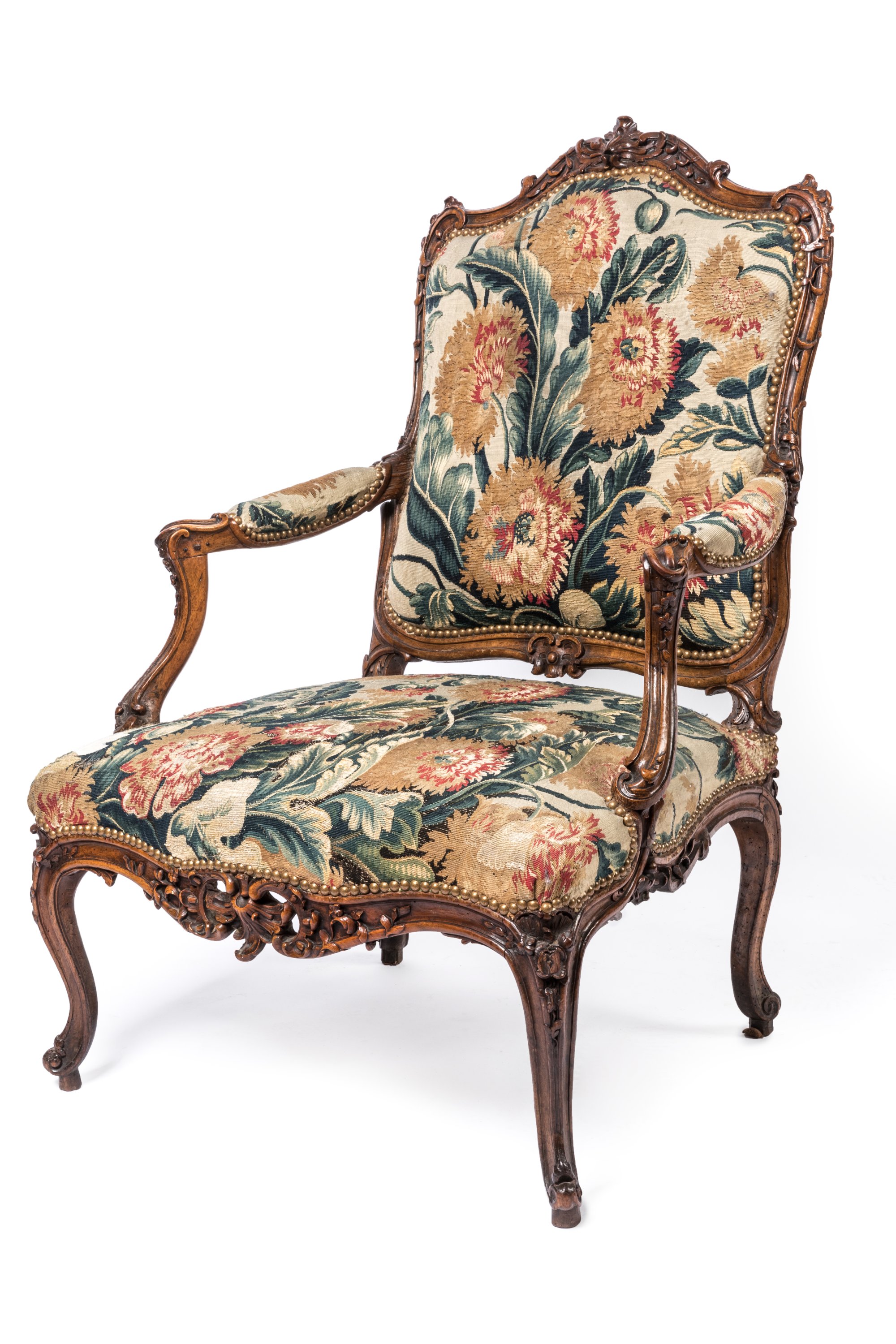 en noyer mouluré, abondamment sculptés de rocailles, pouvant former pendant. Décor exubérant de fleurs, feuillages, rinceaux, cartels, cur évidé au centre de la ceinture, ailes de chauve-souris. Les dossiers sinueux sont ornés "d'oreilles" à l'épaulement. Les accoudoirs en retrait ont un coup de fouet au dessin vigoureux. Le piétement galbé se termine par un enroulement.