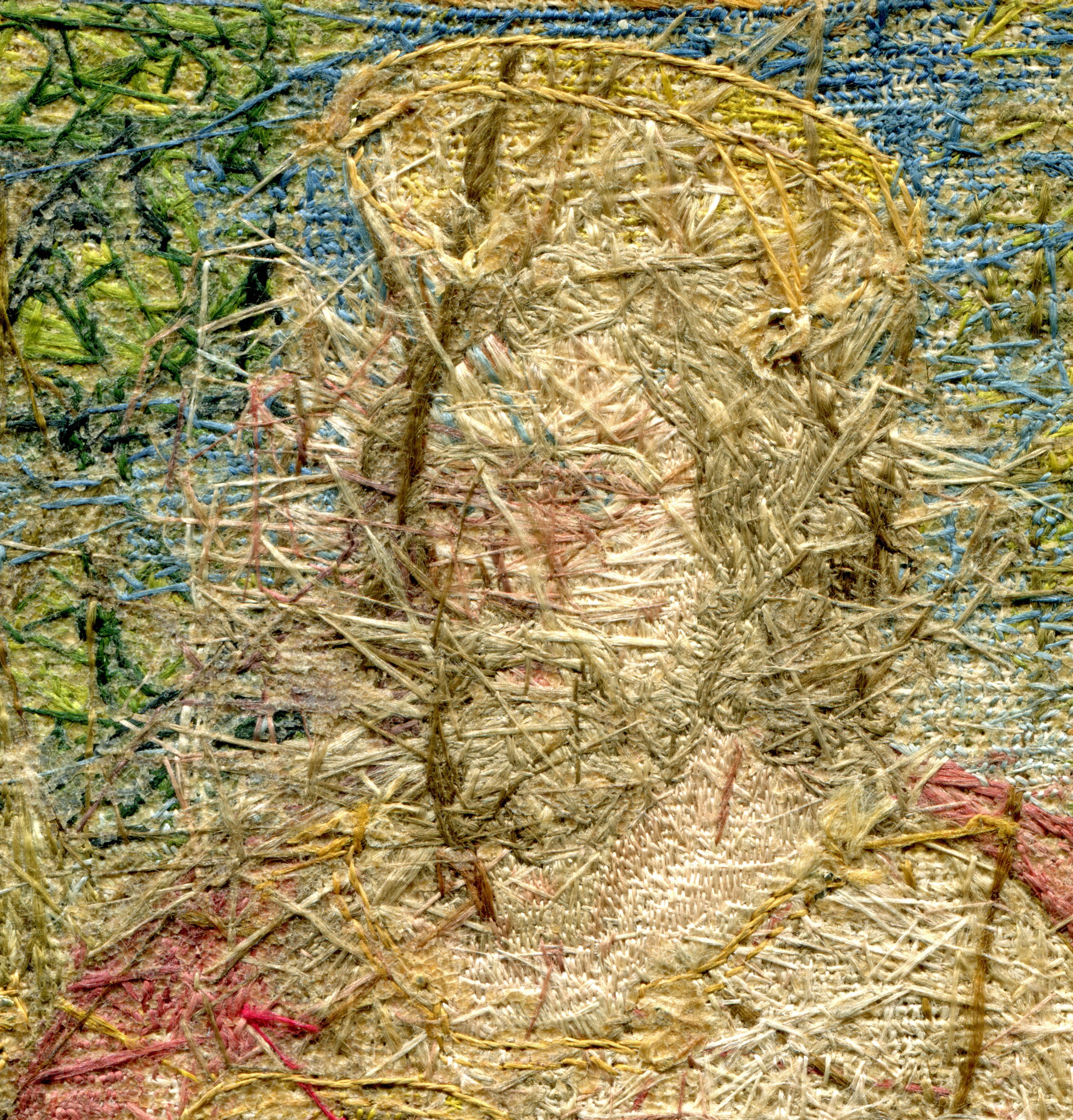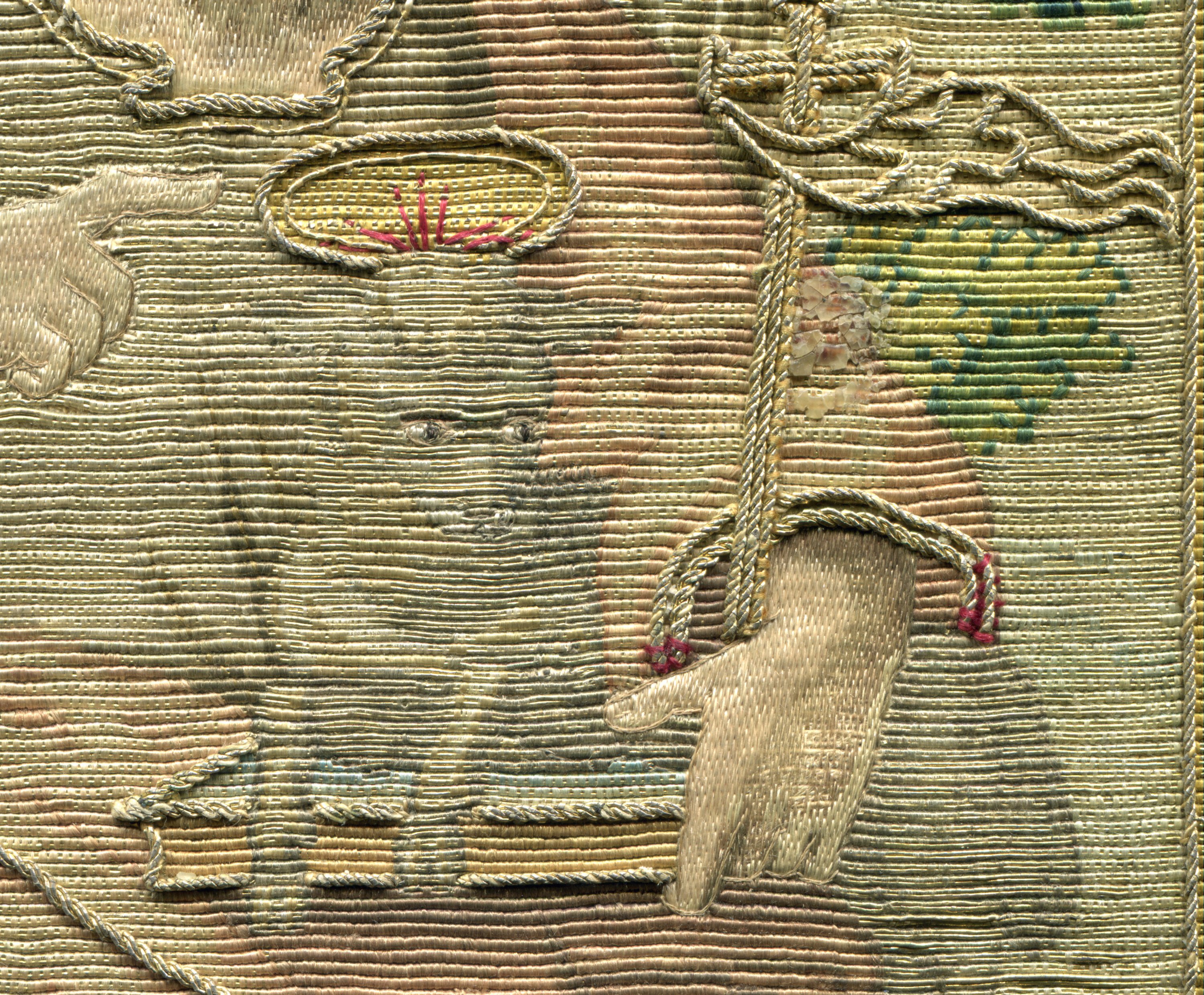 en broderie dor nué, fils dor, de soie et dargent. Les carnations, exécutées avec le point bouture croisant de soies au point satin les brins de filés or, après les avoir « dénudés » de la lame métal. La broderie des cheveux et barbes au point fendu, en suivant la direction des boucles ou des ondulations.