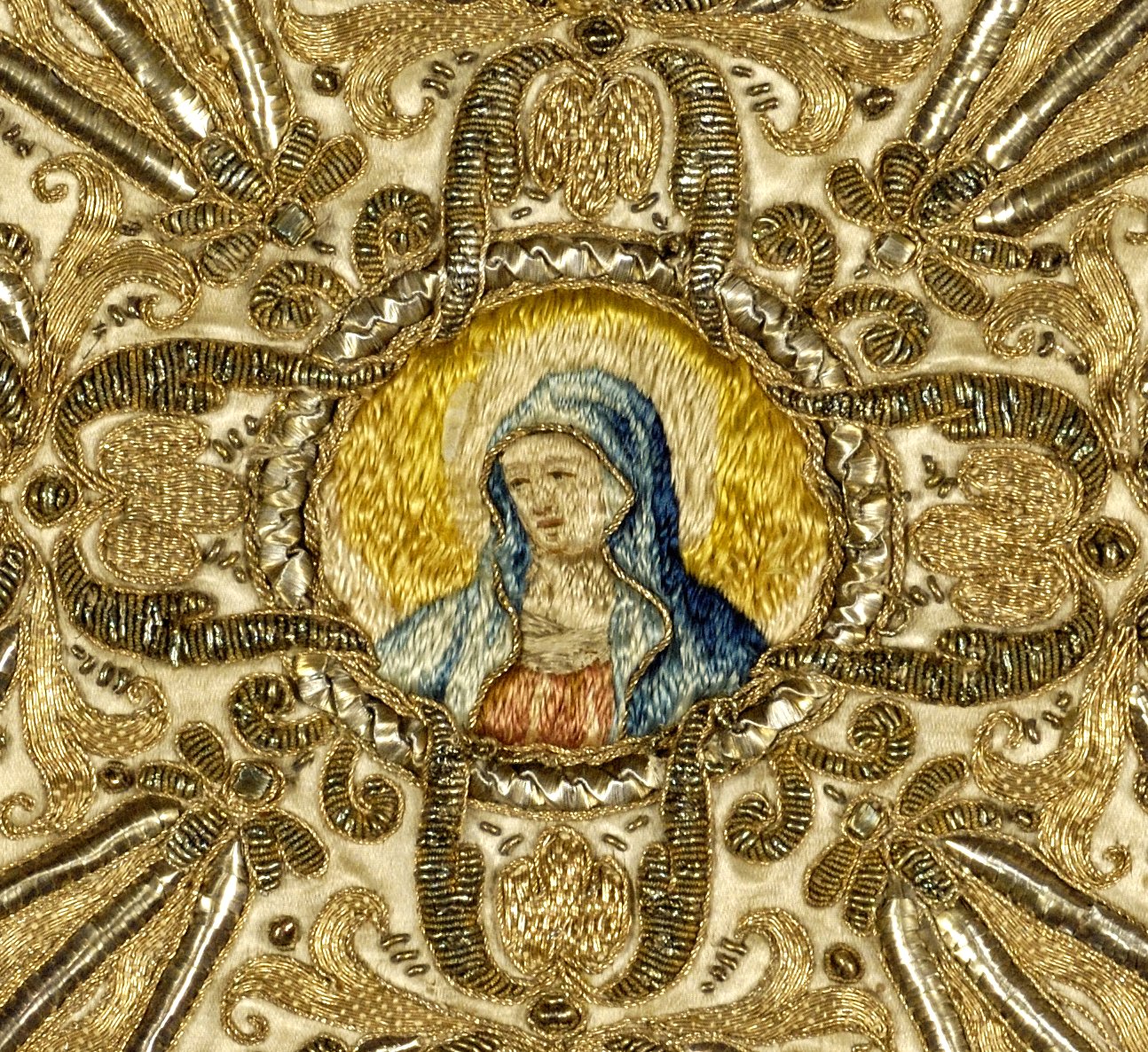 A 17th century French embroidered chalice veil depicting the Holy Virgin Mary. Presumably made in a French Ursuline convent.