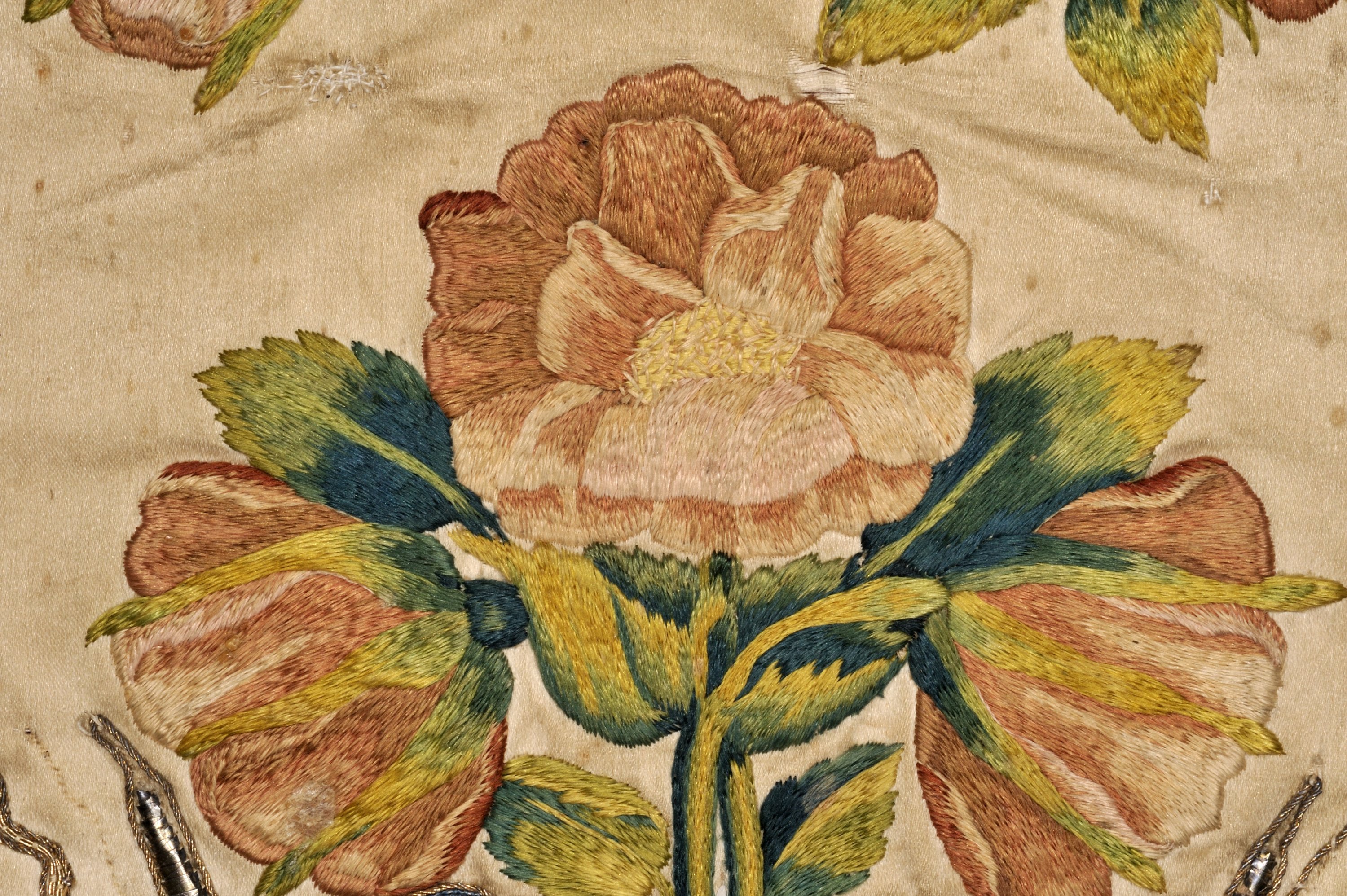 en broderie métallique de fils dor au couché, canetille dor, lame dargent en relief sur corde et cordonnet dor pour les entourages et les enroulements. Lencadrement du cartouche central est constitué dun rare enchevêtrement de deux cartisanes: fils dor enroulés sur une bande de parchemin ou carton.