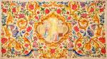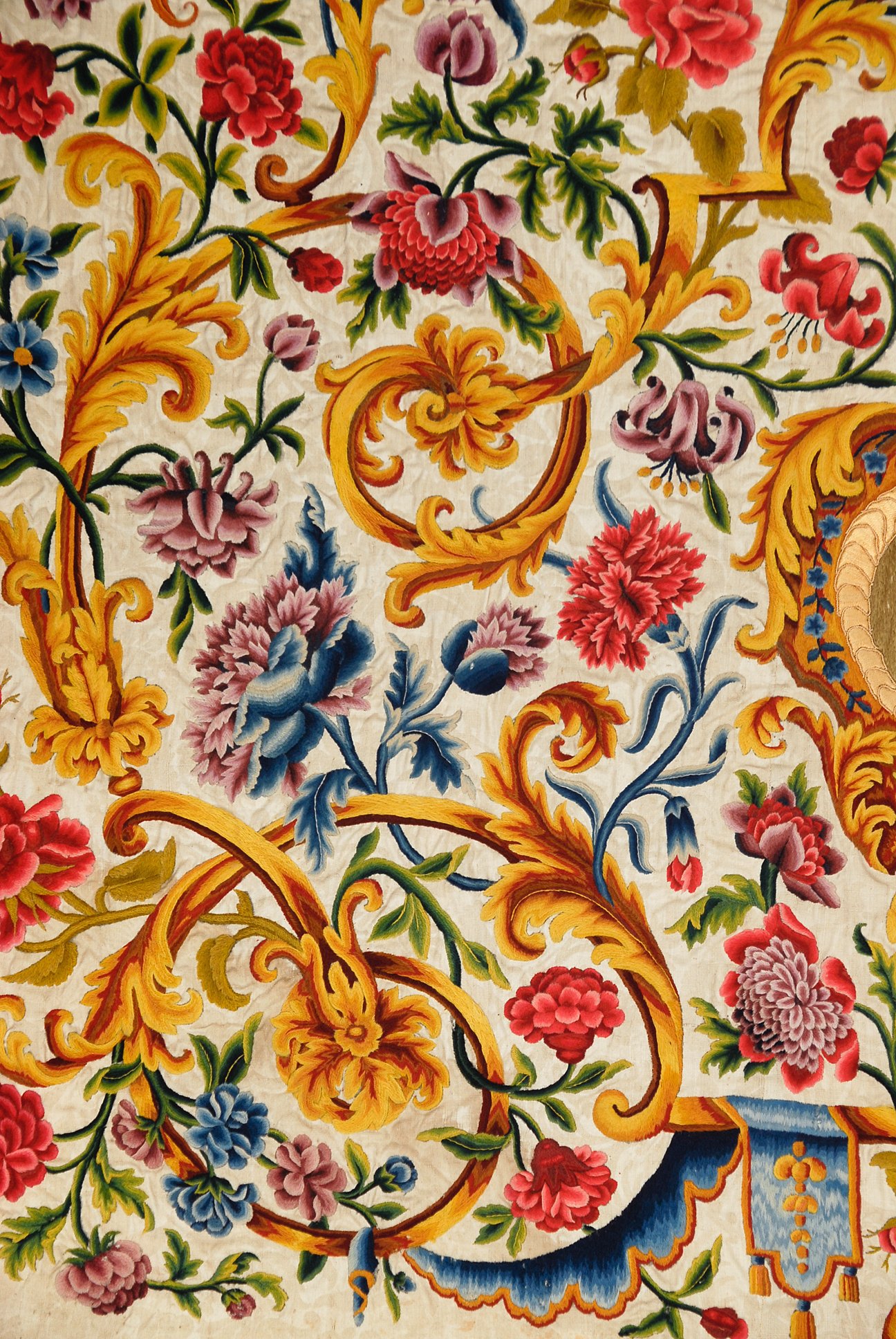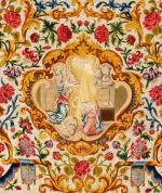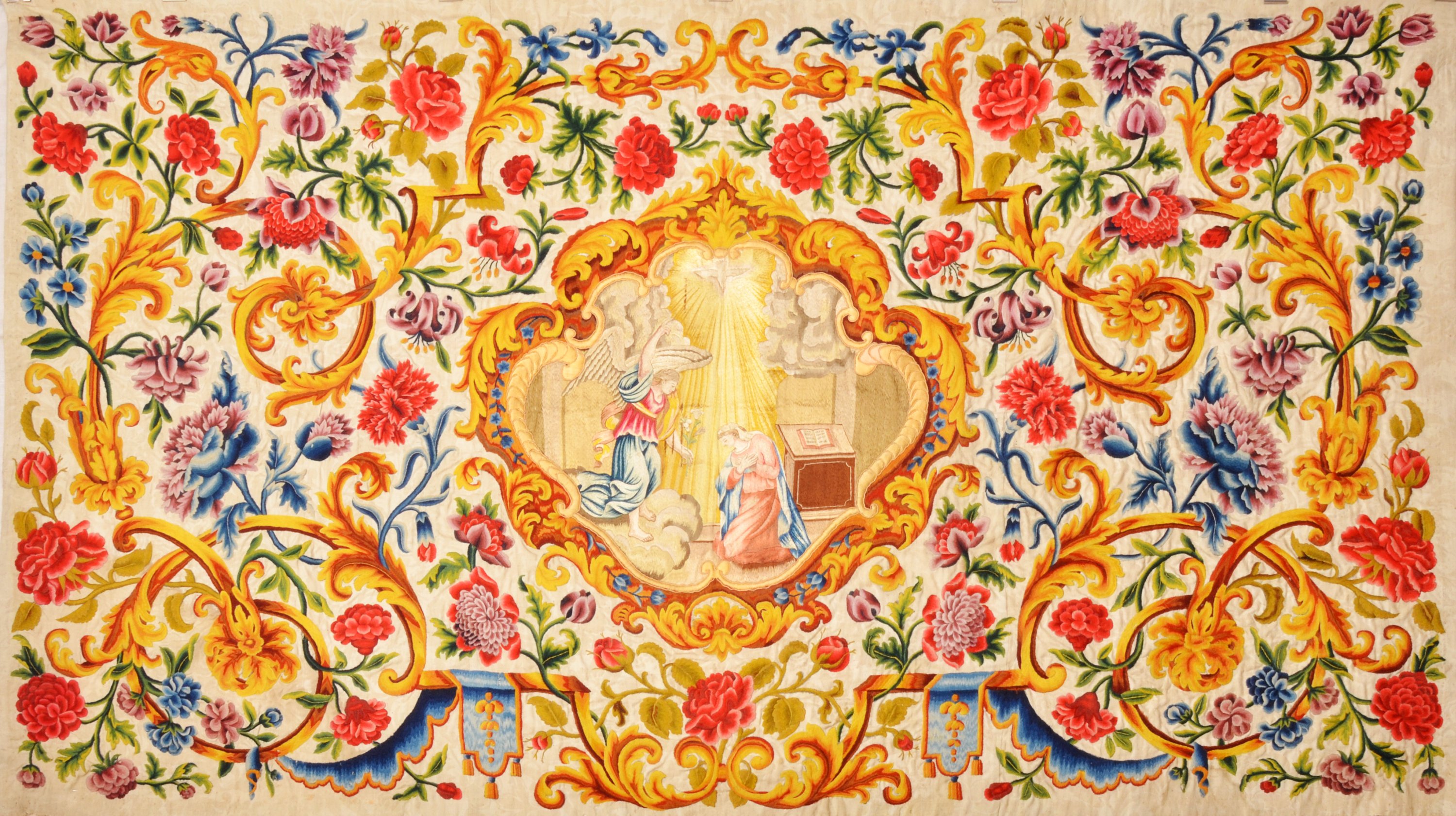 A ca. 1700 embroidered and painted woolen altar frontal depicting the Annunciation. Presumably made in a French convent.