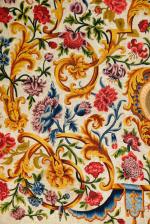 en toile de laine blanchie imprimée d'un décor ramage crème donnant un aspect damassé pour le fond ; la broderie du champ faite de laines polychromes au point passé et la représentation de l'Annonciation en peinture à l'aiguille en soies polychromes.