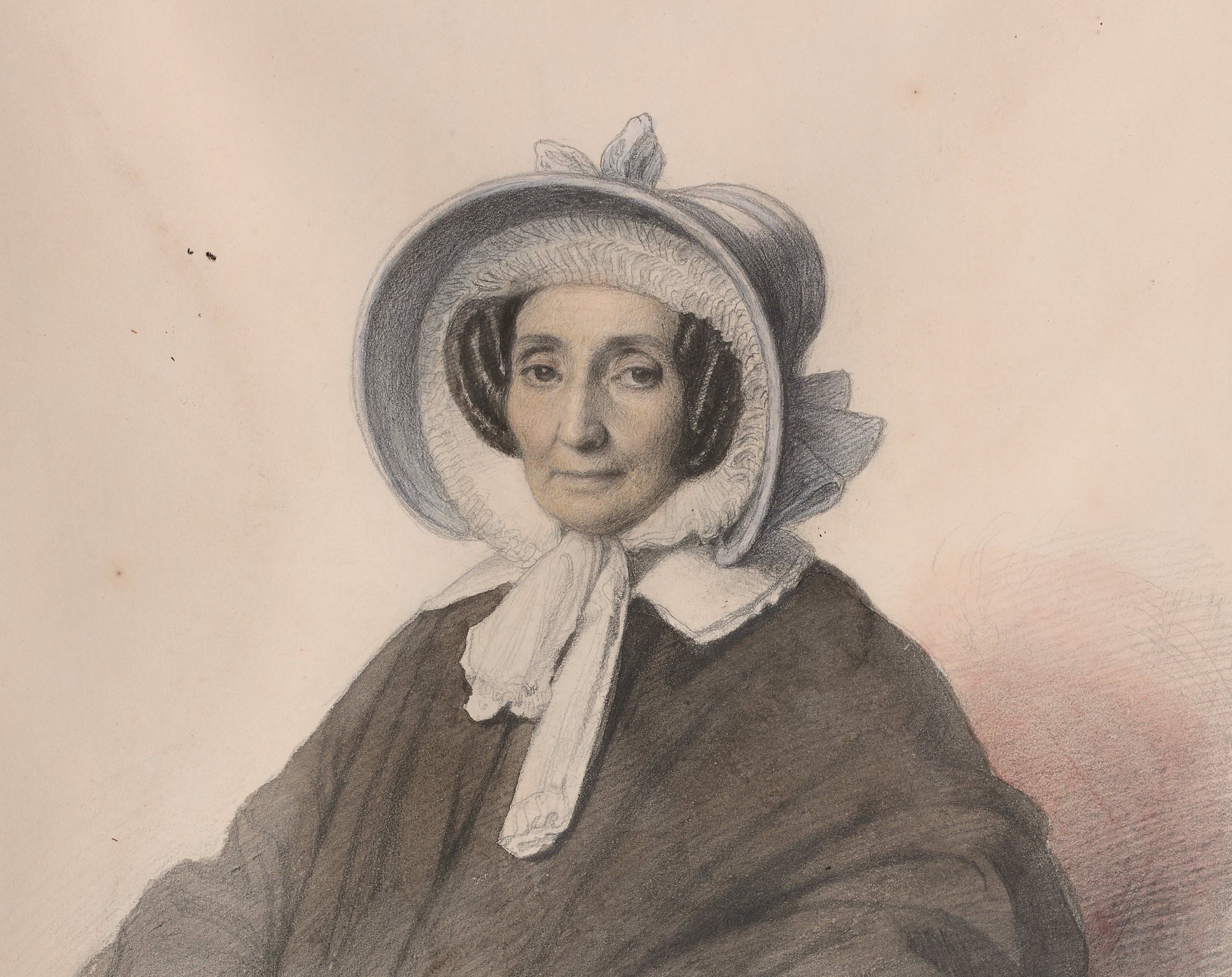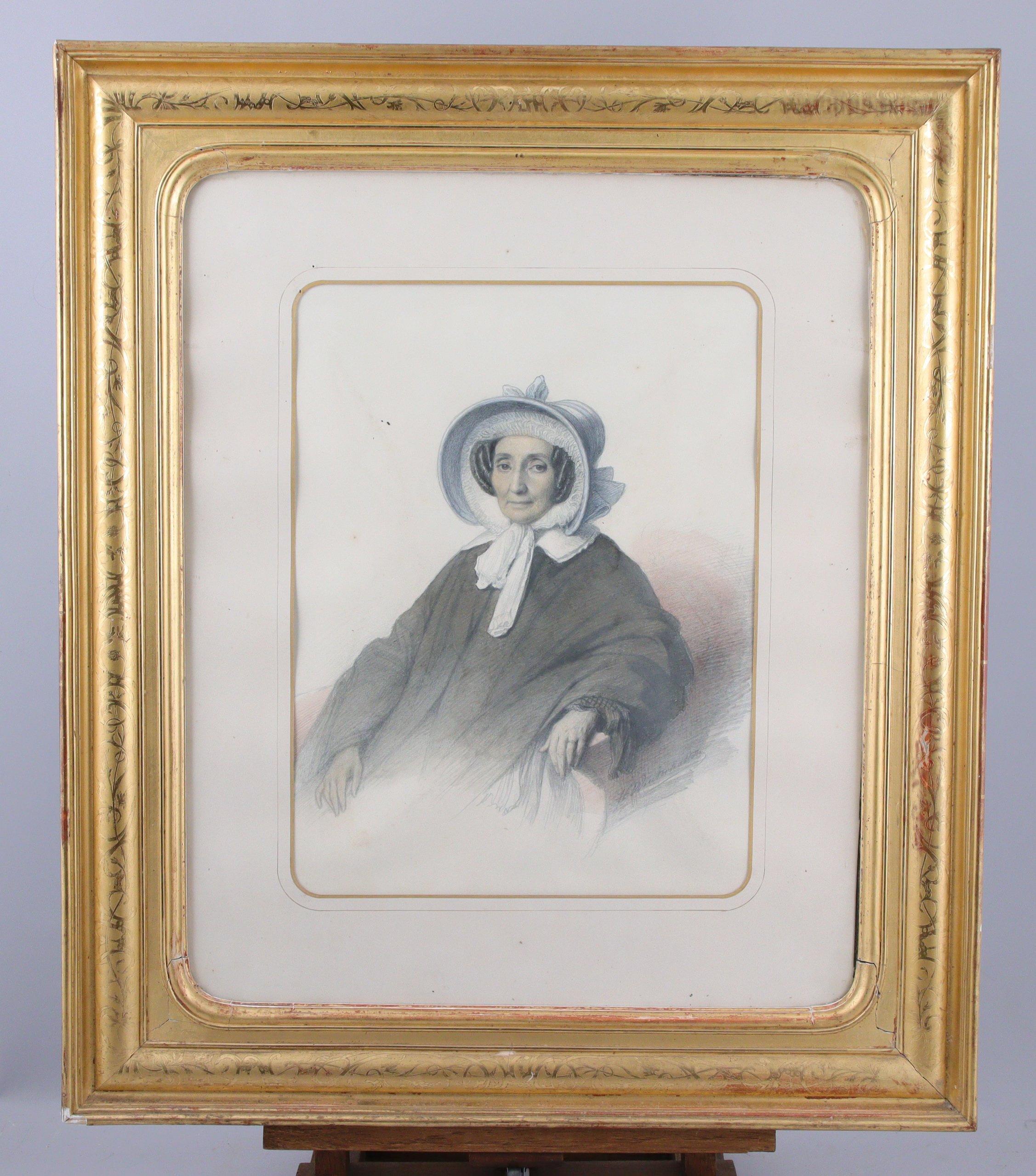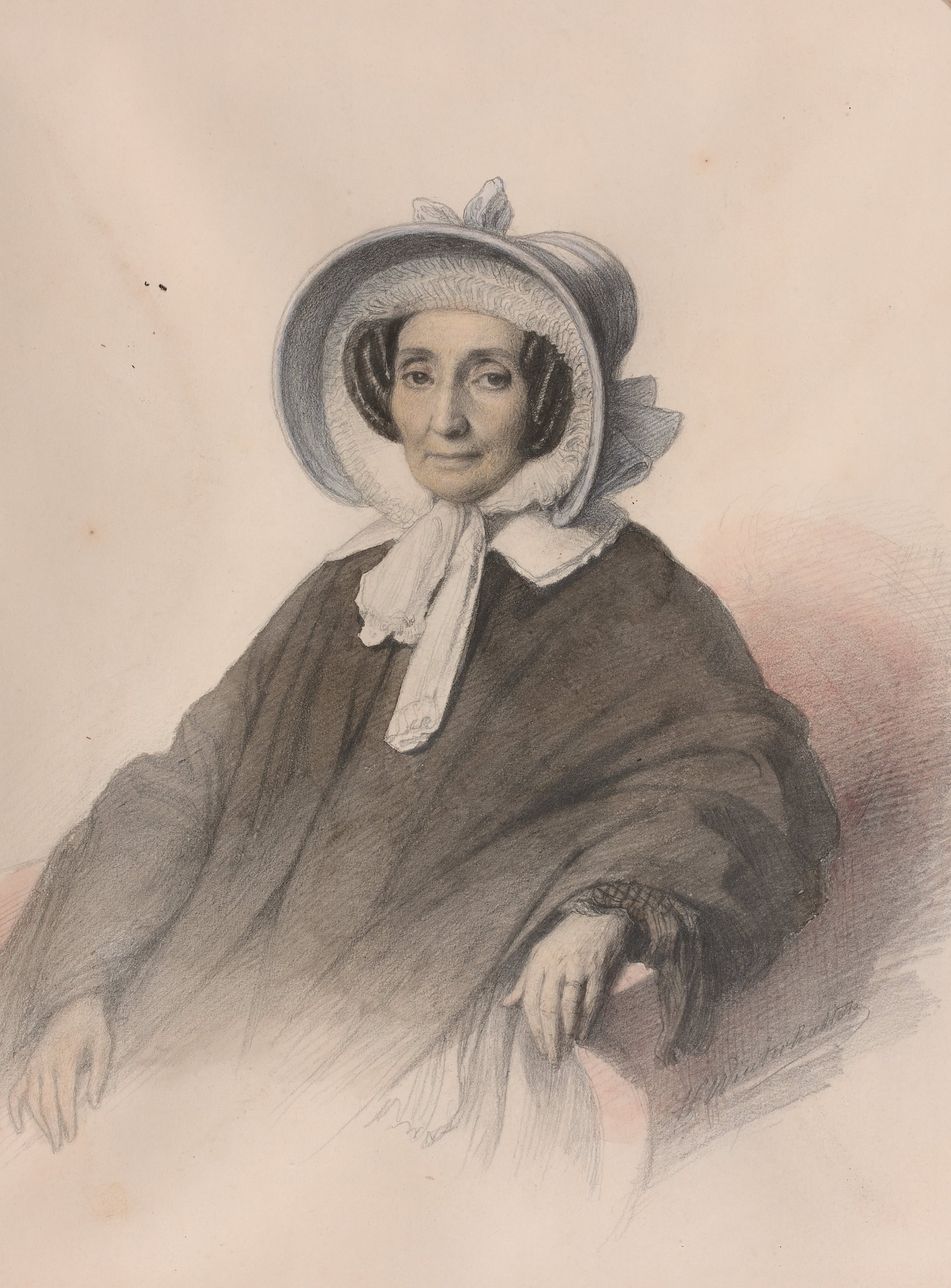 A portrait of Adèle d'Osmond, Countess of Boigne, by Hermann Winterhalter. Black pencil and watercolor. Signed.