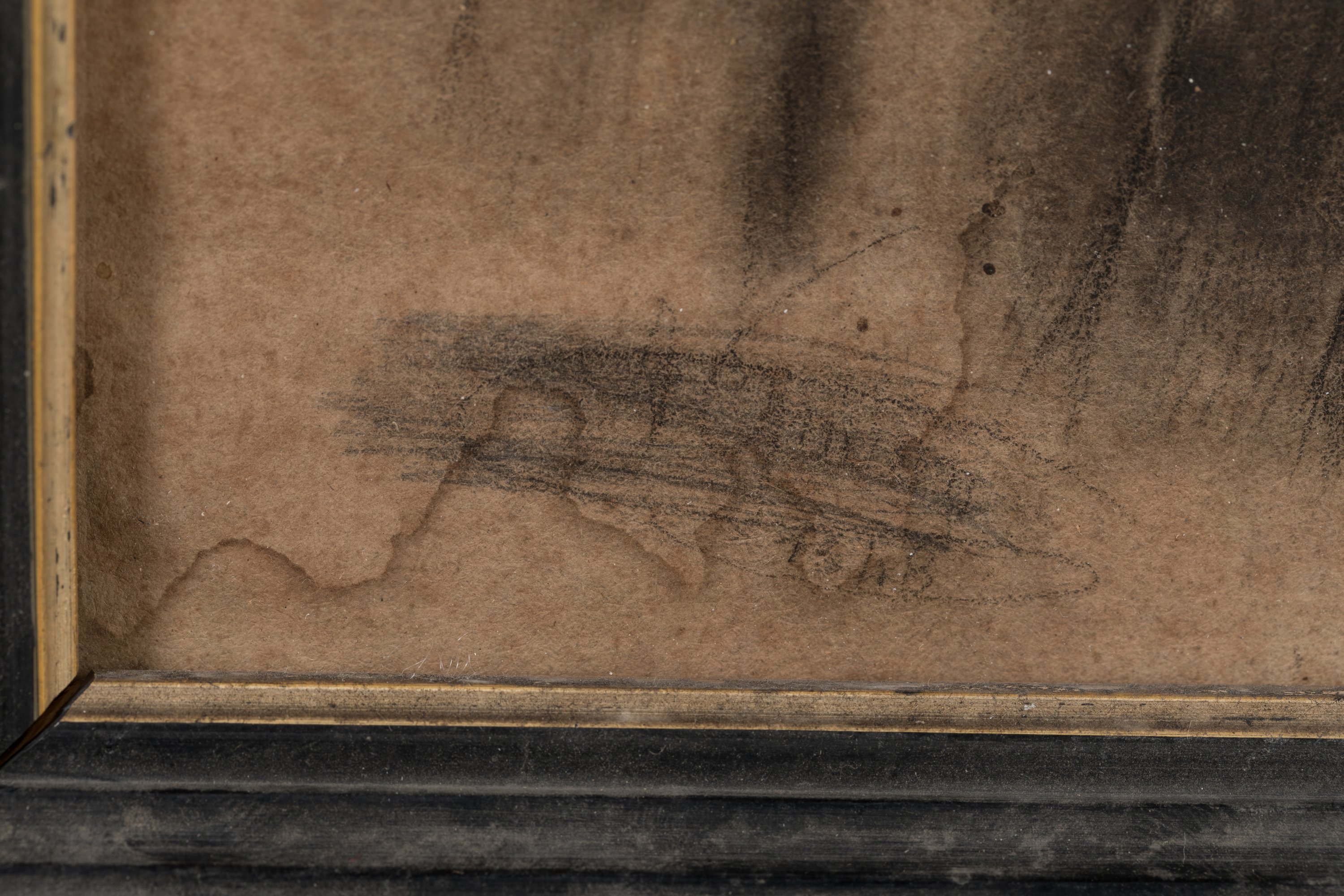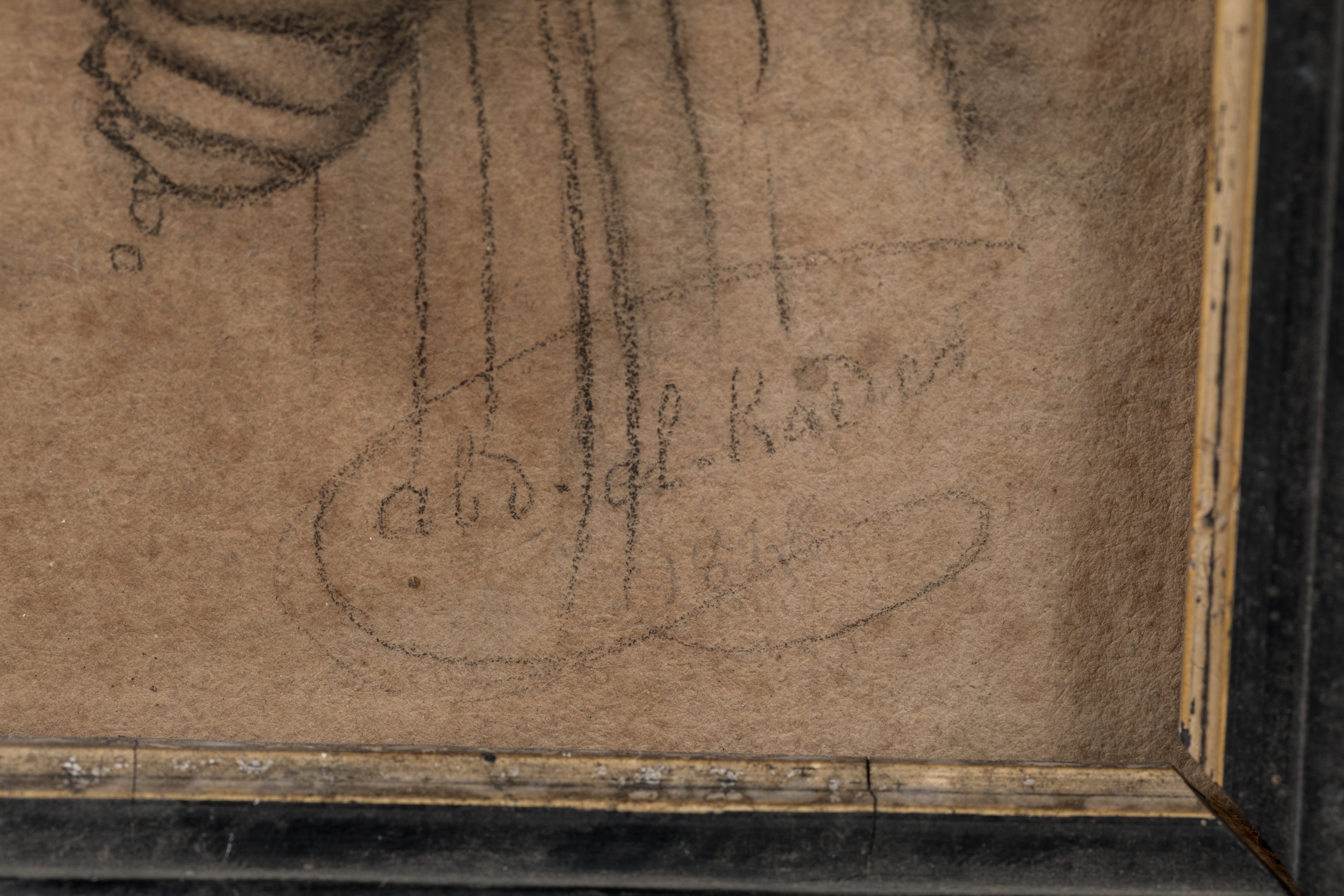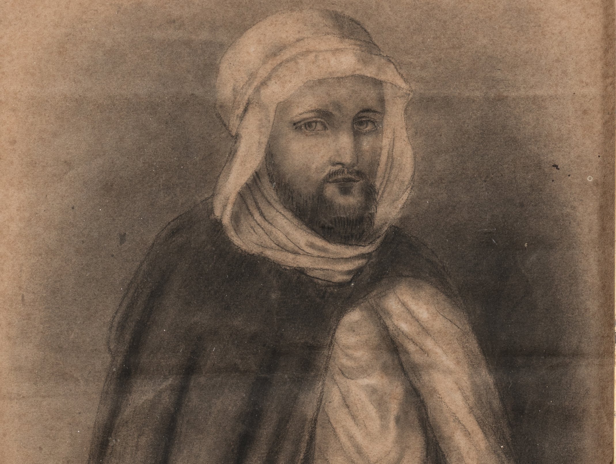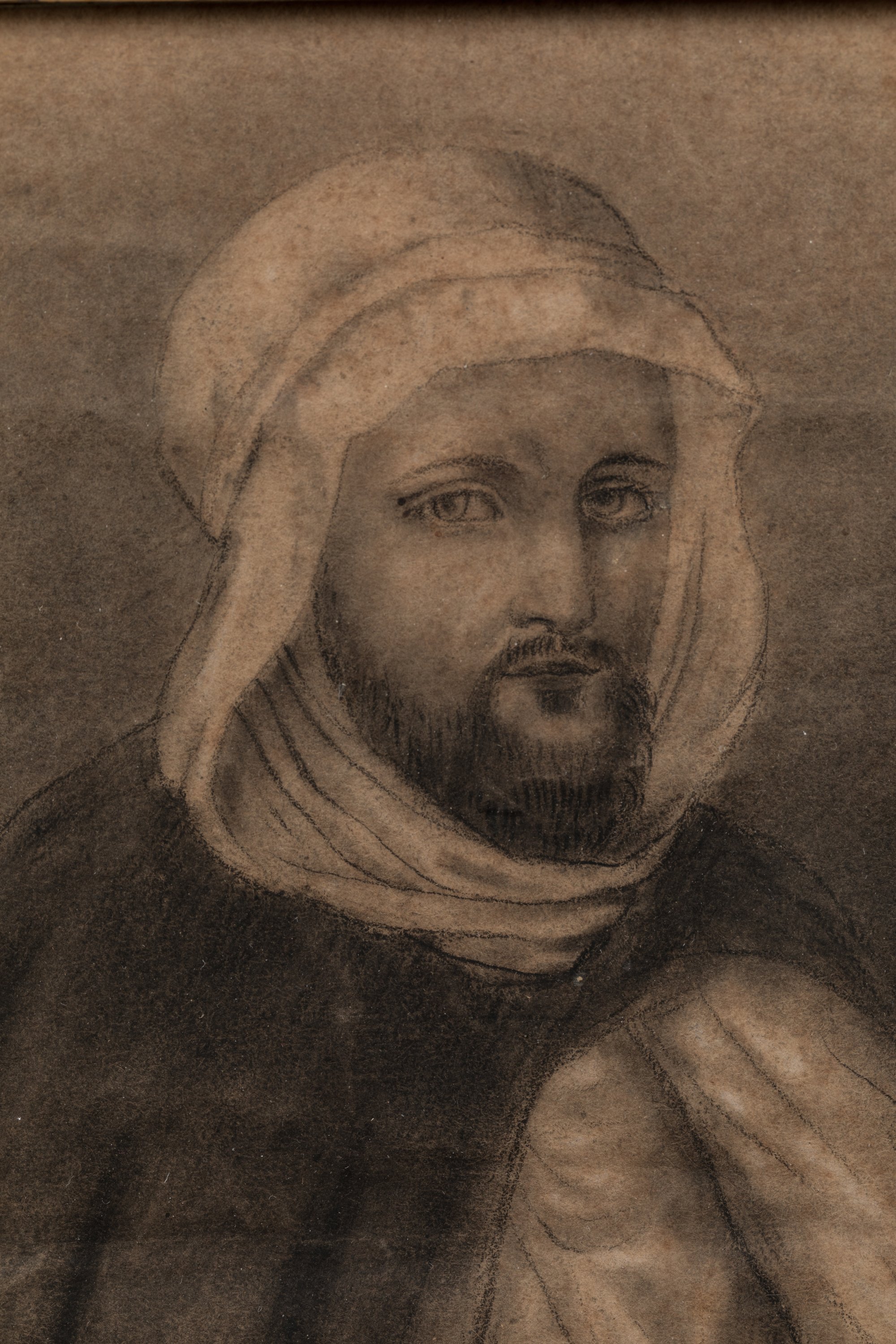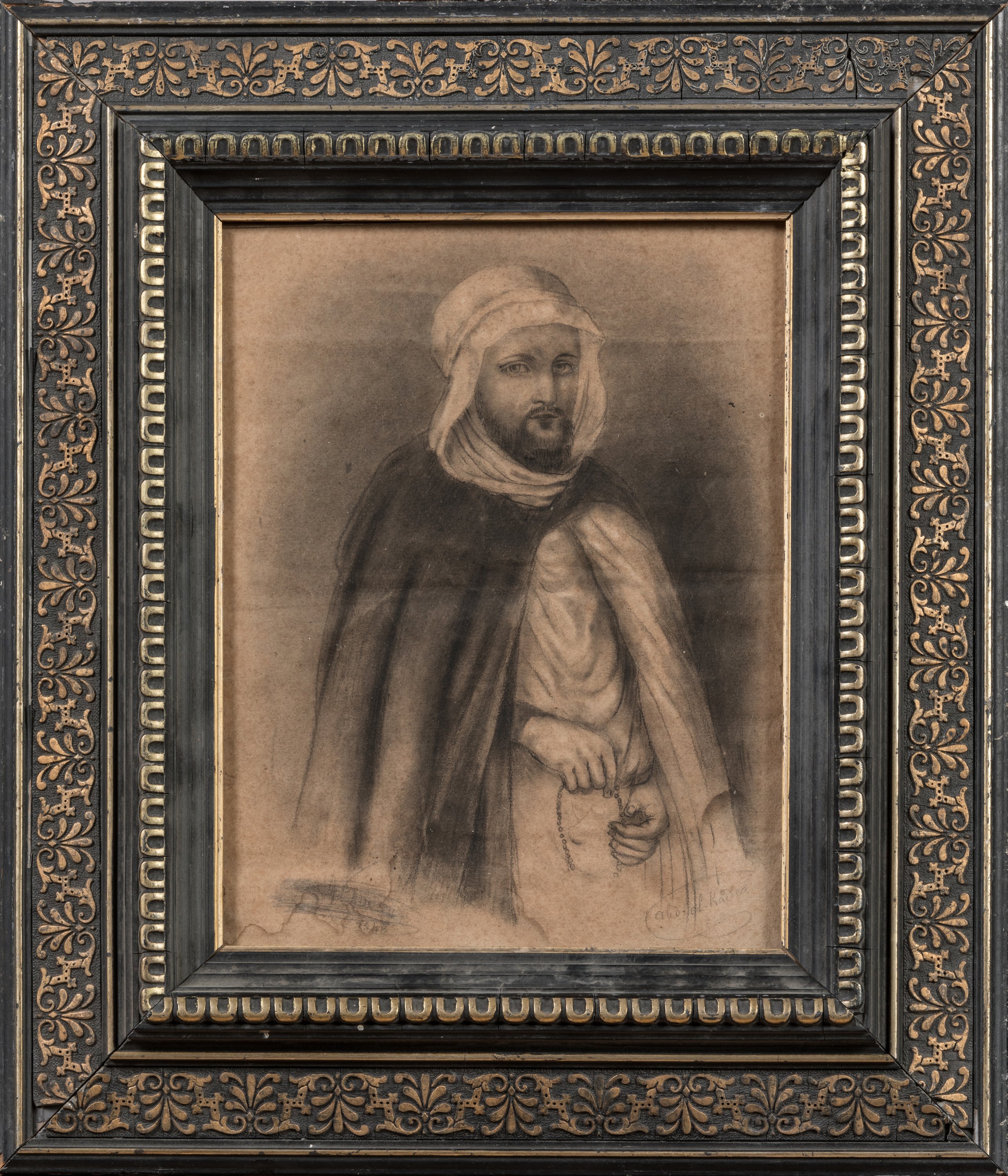 Malgré sa victoire dans l'ouest algérien lors de la bataille de Sidi-Brahim en 1845, l'émir Abdelkader est contraint de se rendre à la France à la fin de l'année 1847. Il est emprisonné à Toulon, puis à Pau, avant d'arriver au château d'Amboise en novembre 1848. Cette composition inédite présente le chef de l'insurrection algérienne tenant à la main son chapelet de prière. Encore jeune, en comparaison de ses représentations plus tardives, il dévisage le spectateur de son beau regard triste. La signature du dessinateur ayant été biffée, il est difficile de savoir s'il s'agit d'une interprétation d'un jeune admirateur, comme le dessinateur Suisse Adolphe Gandon (1828-1889), ou du travail d'un militaire ayant approché l'émir lors de sa captivité.