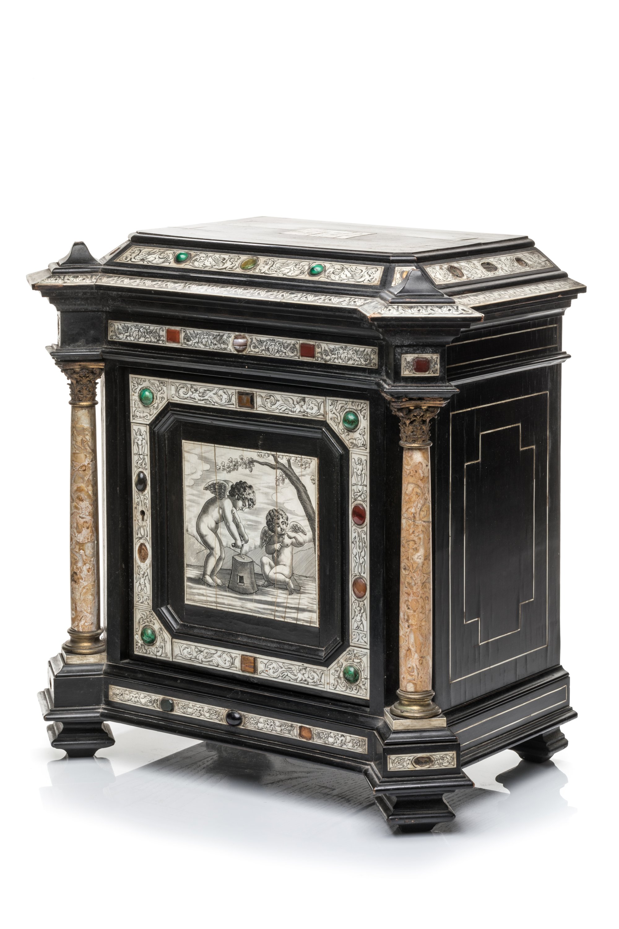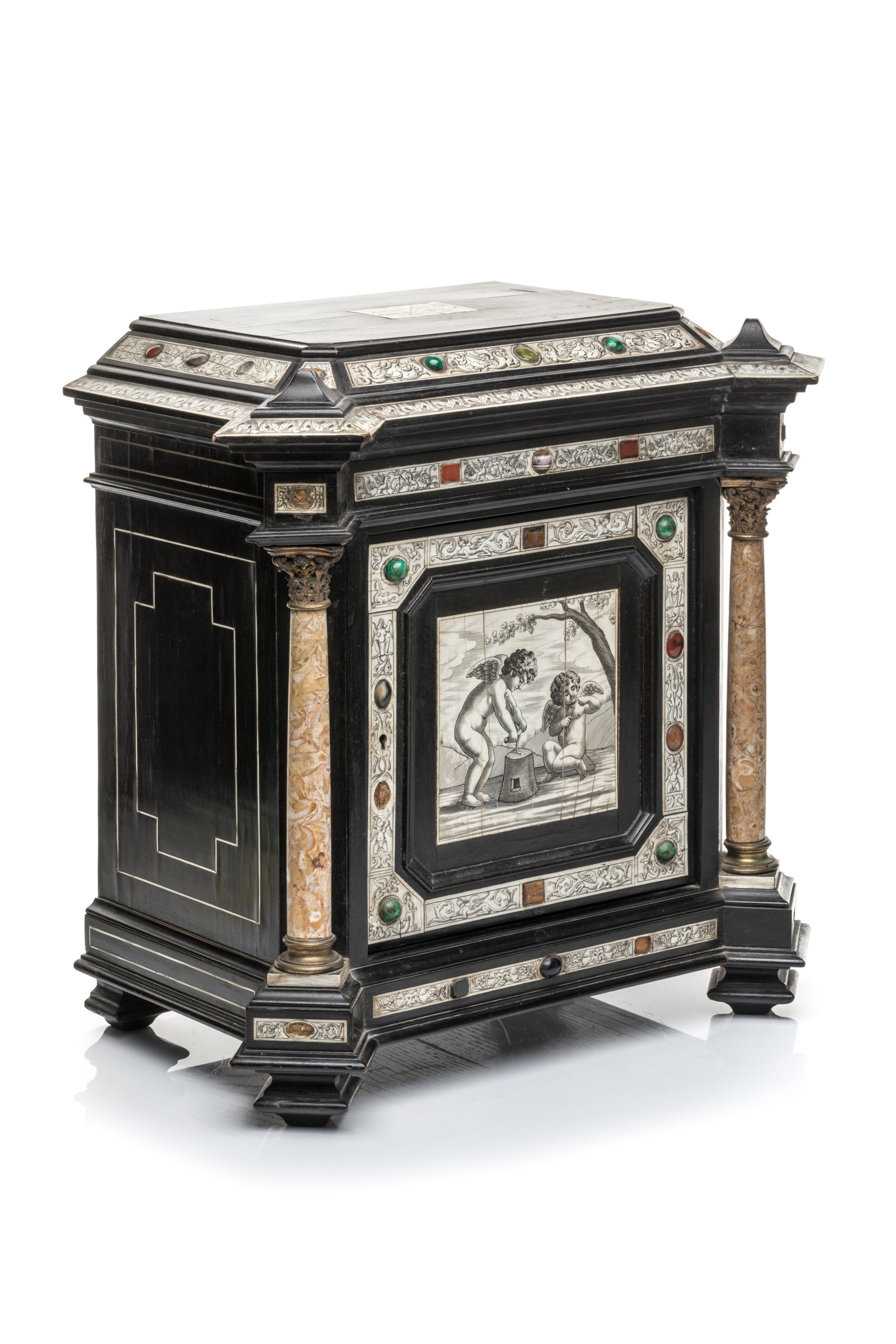 en poirier noirci flanqué de deux colonnes en marbre beige surmontées de chapiteaux corinthiens en bronze doré. Il est orné de cabochons de pierres dures de couleurs. La porte présente une plaque d'ivoire gravée d'une scène aux Amours affutant leurs flèches. Encadrements et plaques décoratives de griffons ailés en ivoire, tout comme le pourtour du dessus en doucine.