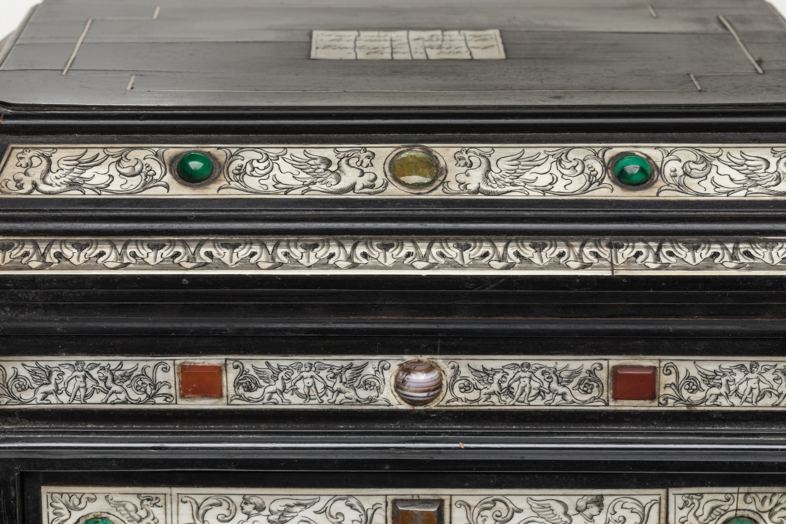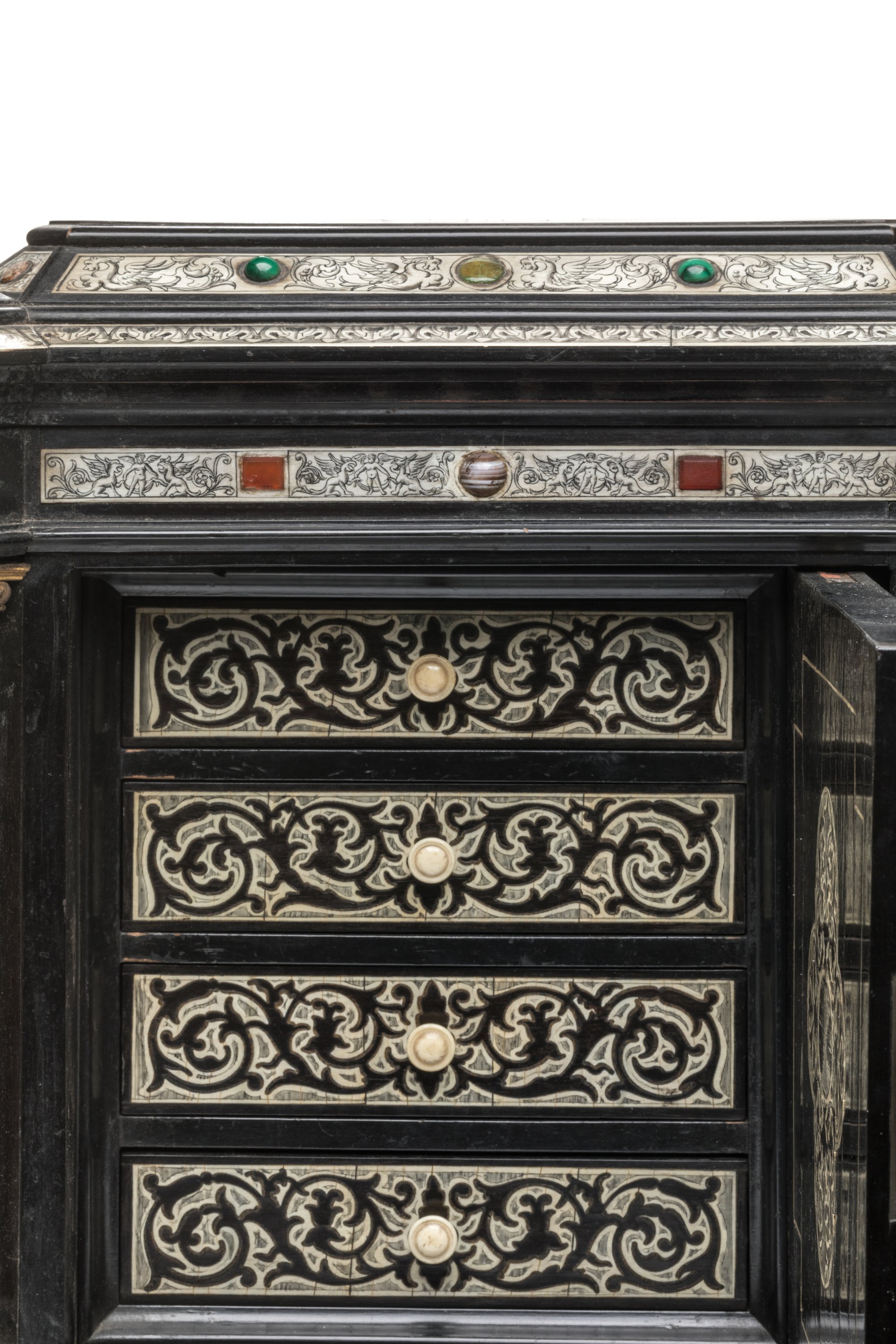 A 19th century blackened pearwood jewelry cabinet with marble columns, bronze ornaments, colored stones and ivory inlays. 17th century Florentine style.