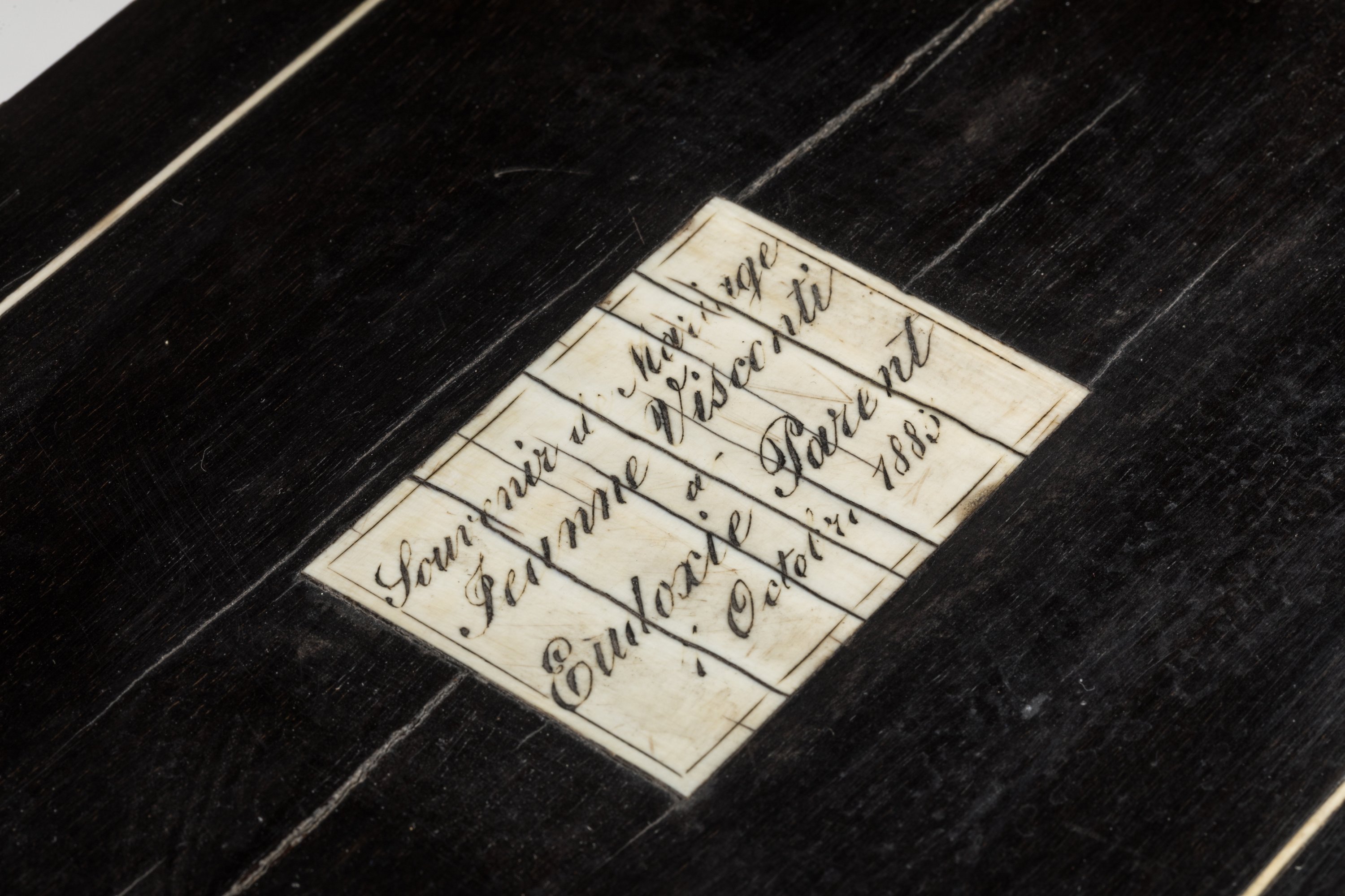 Le dessus encadré de filets d'ivoire présente une plaque d'ivoire gravée: