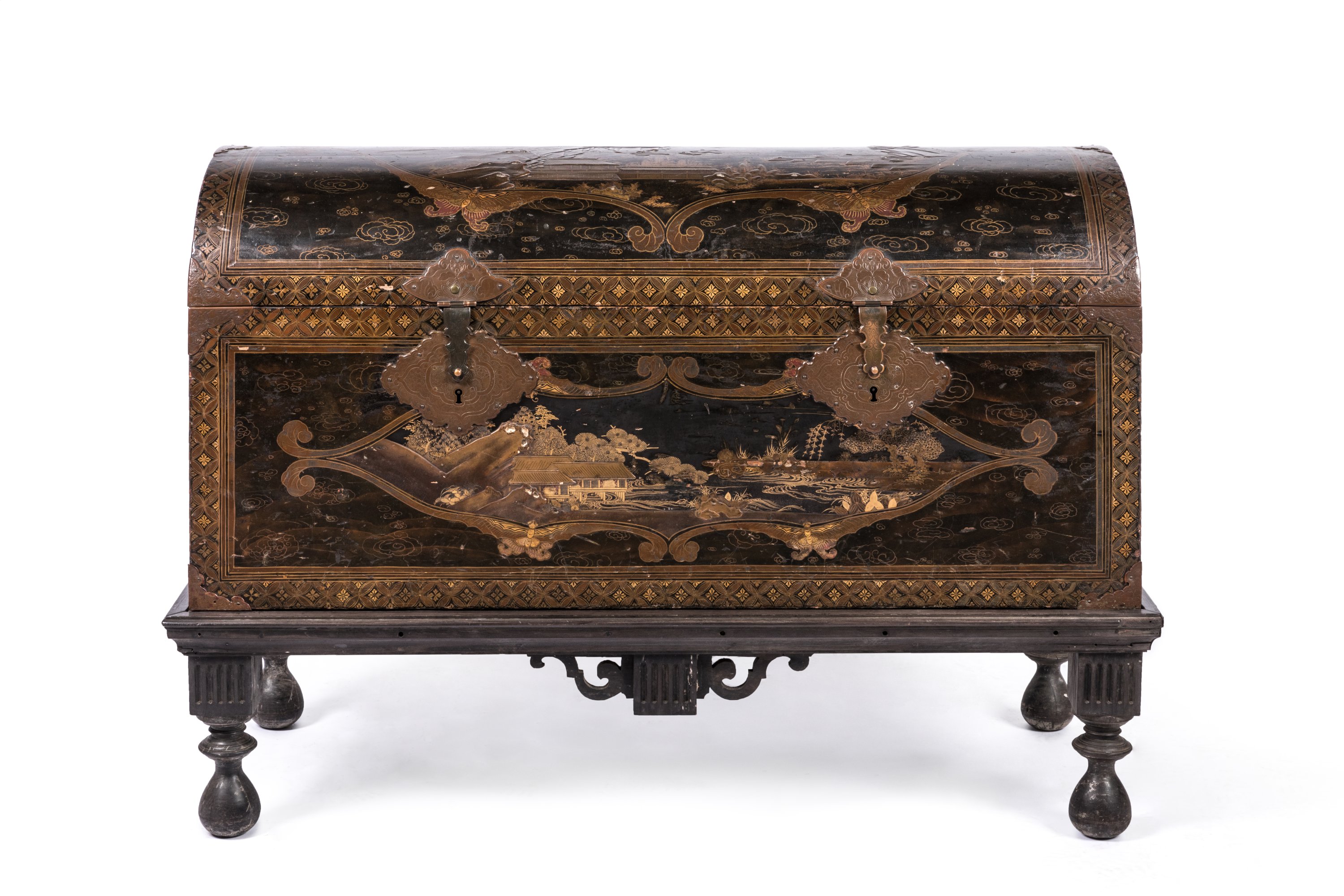 A Japanese lacquer chest decorated with scenes reminiscent of the Eight Views of Omi. Early Edo period. Atop a more recent black wooden base.