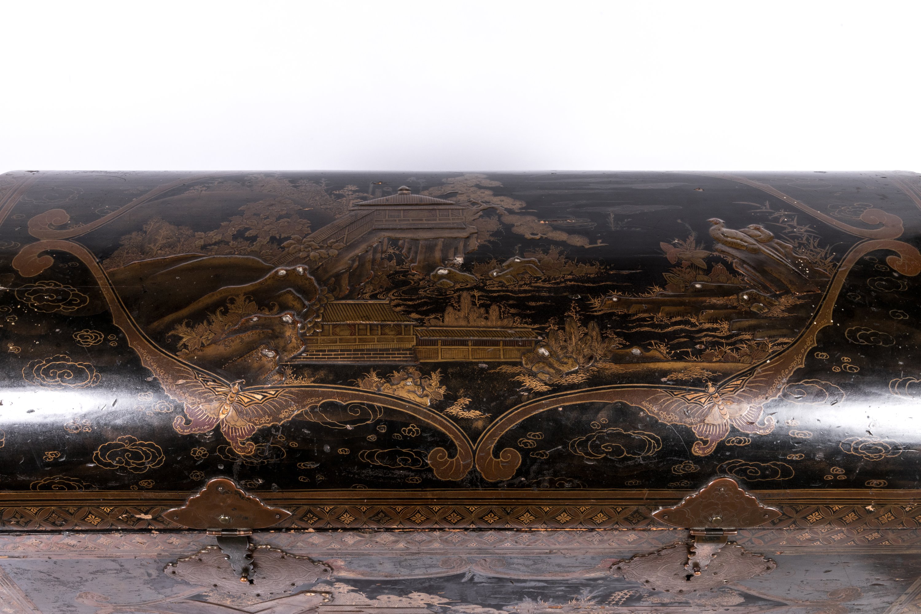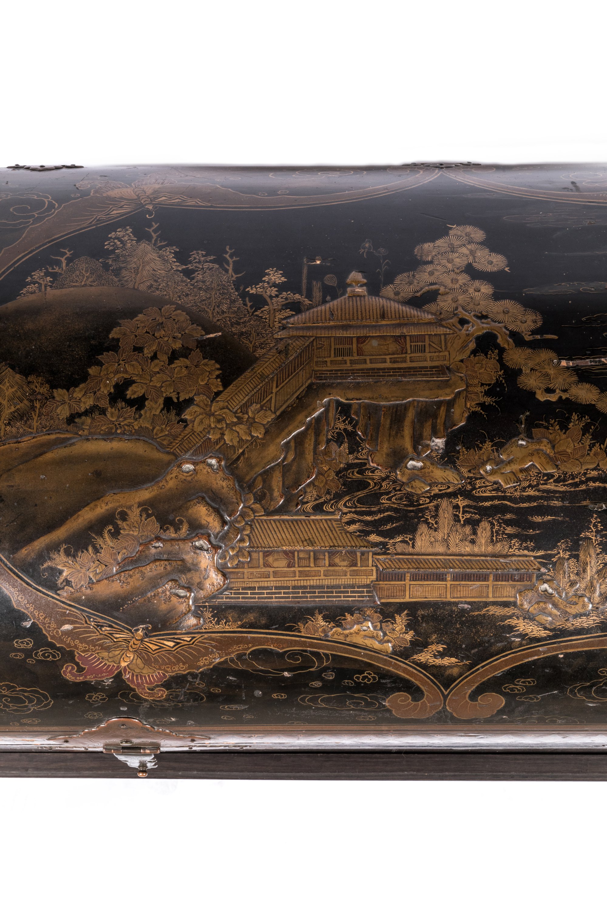 en bois laqué noir, le couvercle bombé à décor en takamaki-e, hiramaki-e de laque or et kirigane de pavillons au bord de l'eau et couple de faisans perchés parmi les pins et les bambous, évoquant les huit vues d'Omi (Omi Hakkei) dans un cartouche formé par quatre papillons aux ailes en laque nashiji, sur fond de motifs de nuages kumo.