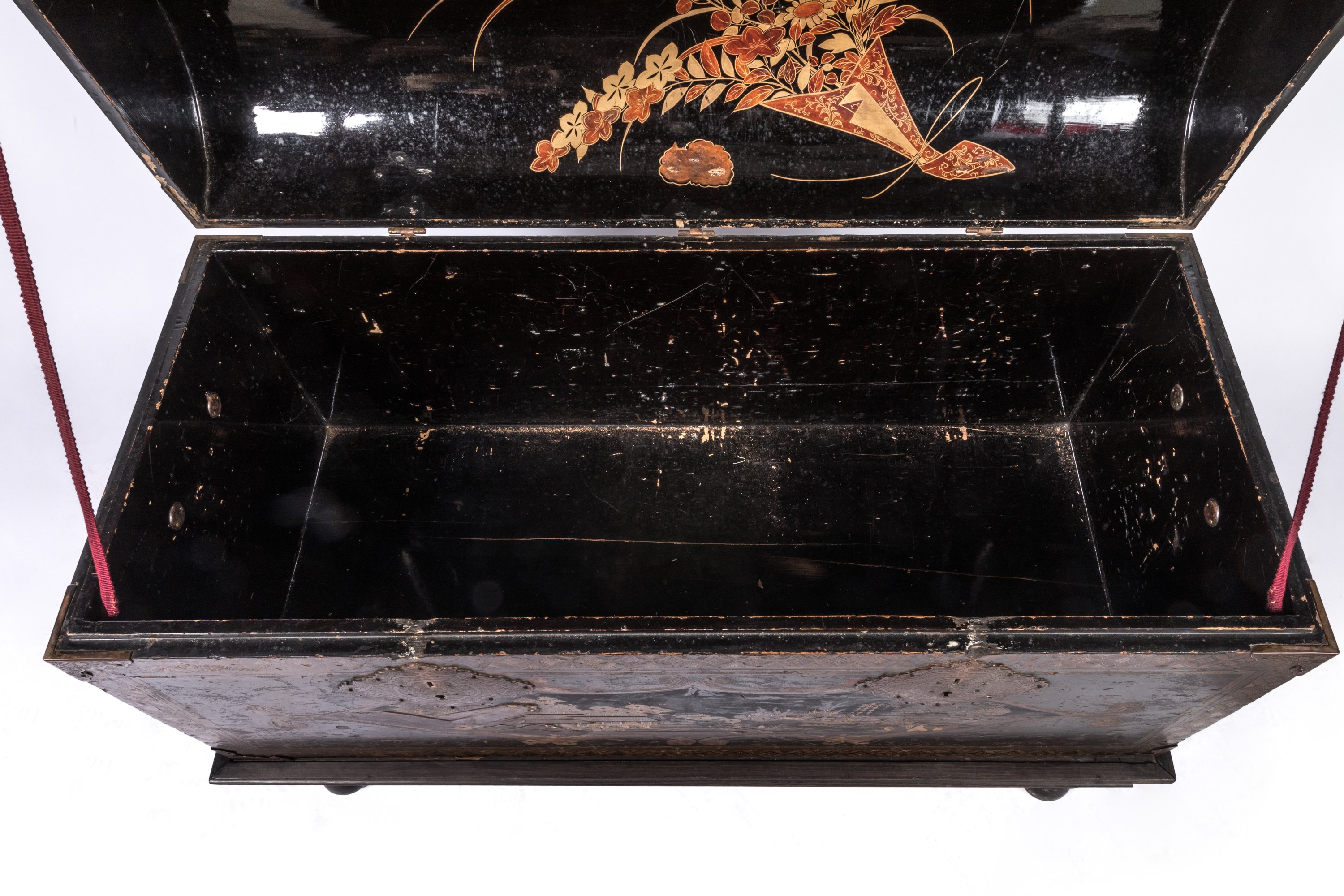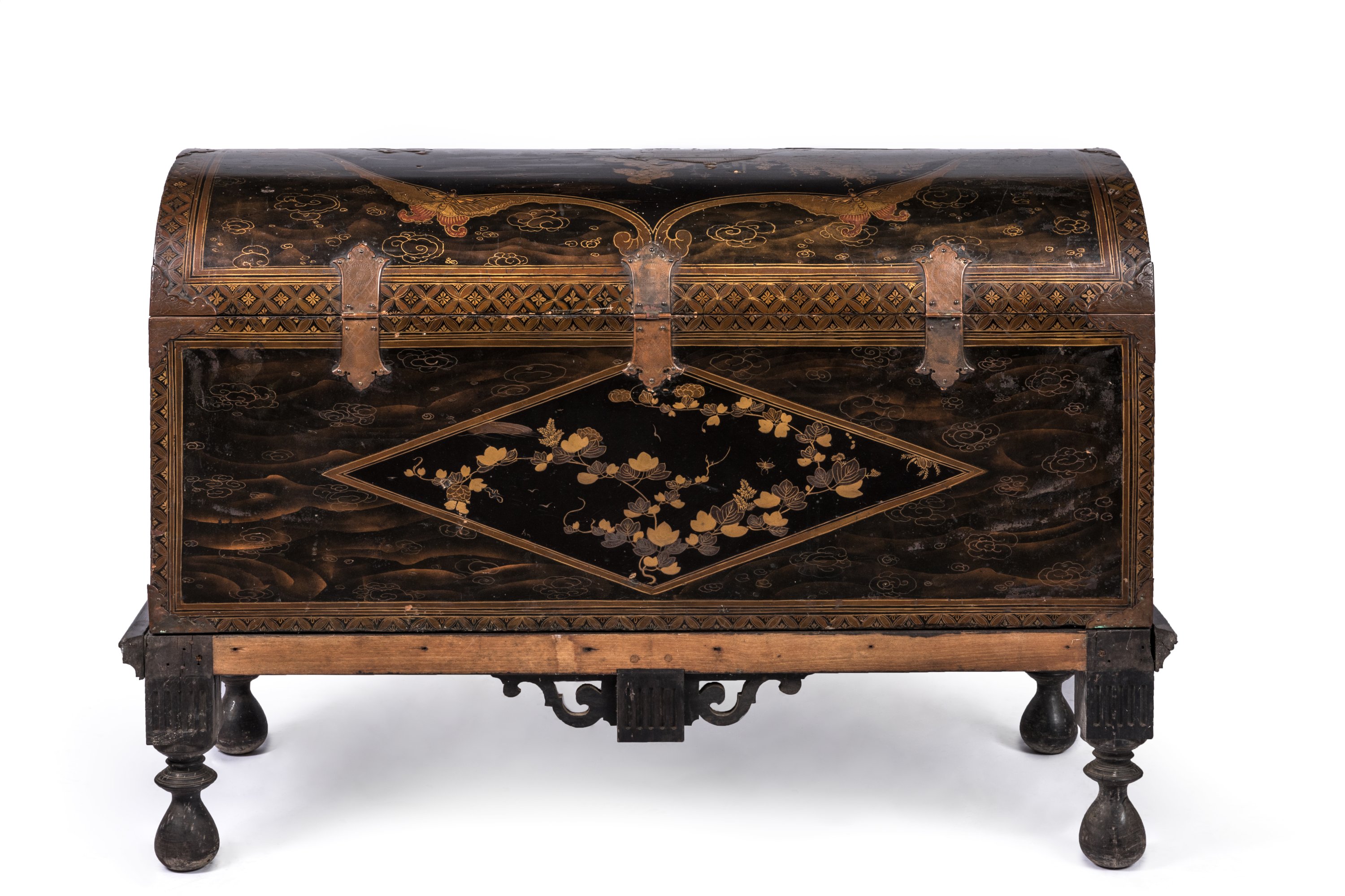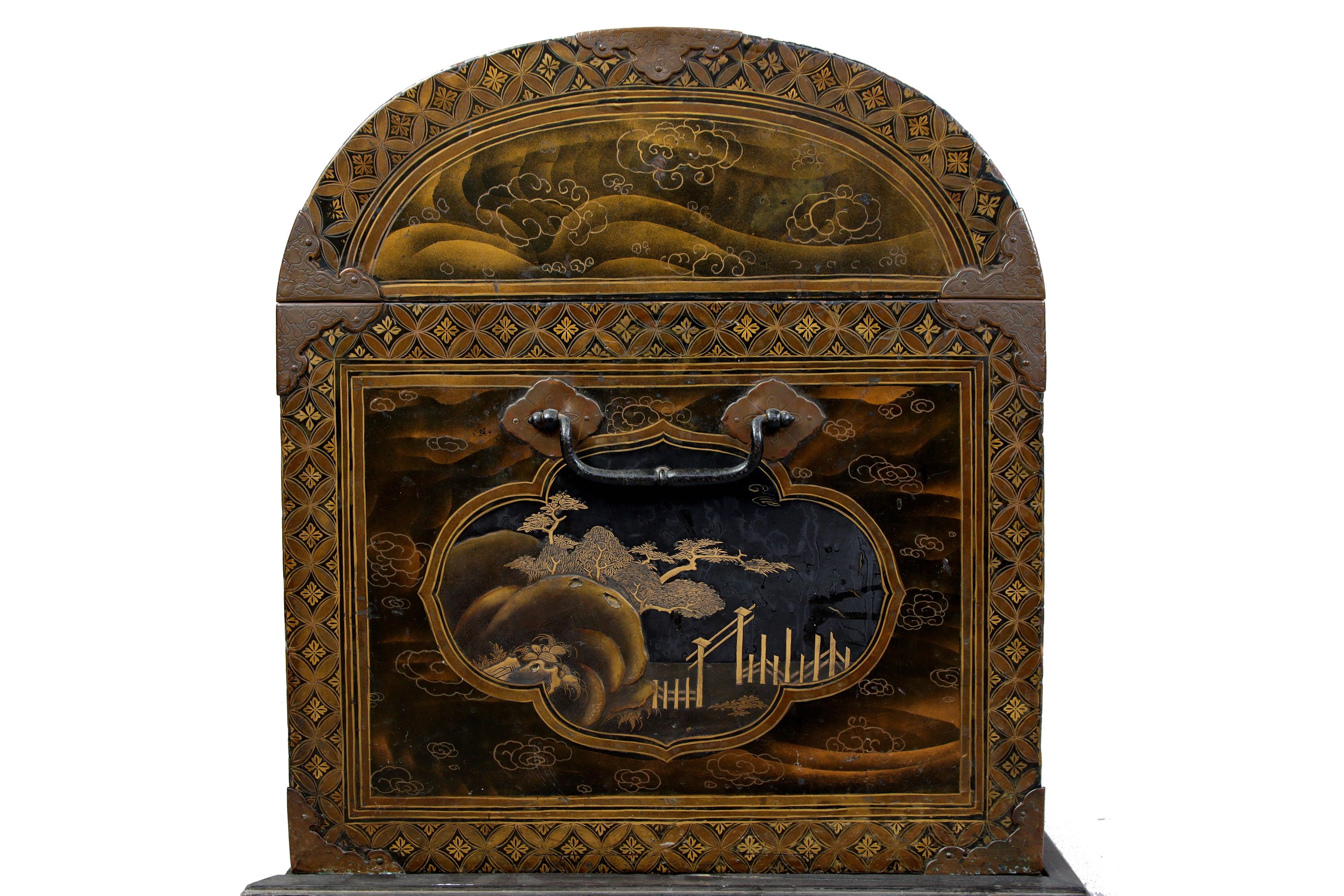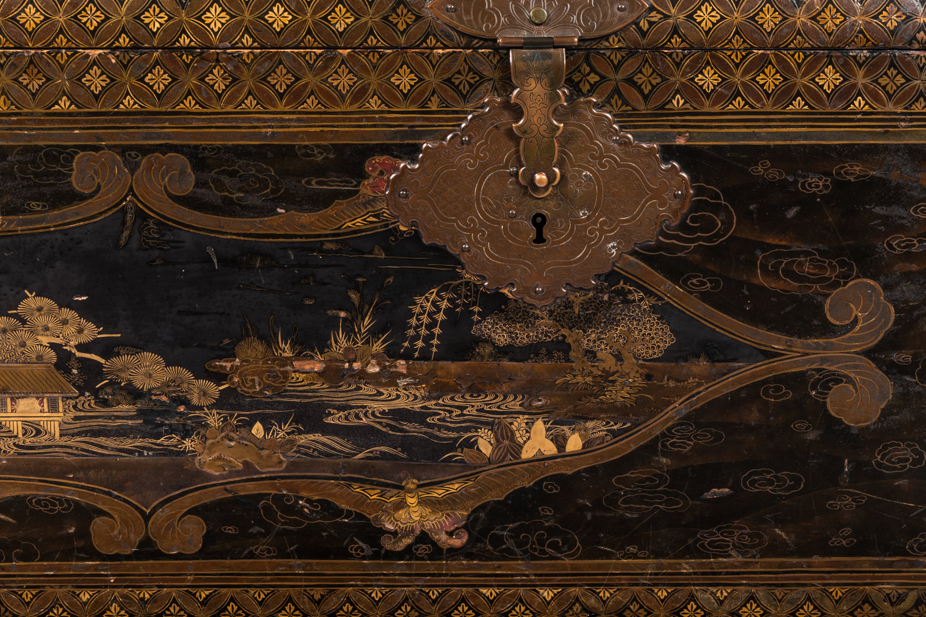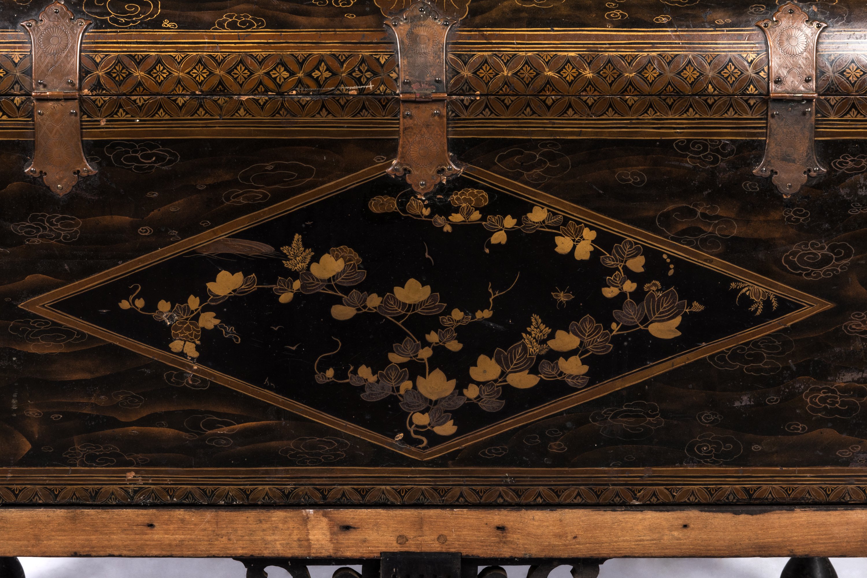 Les rebords ornés d'une frise de motifs shippo et hanabishi en hiramaki-e de laque or et brun, les ferrures en cuivre mouvementé ciselées de motifs végétaux et rinceaux, celles des poignées figurant des fleurs stylisées.