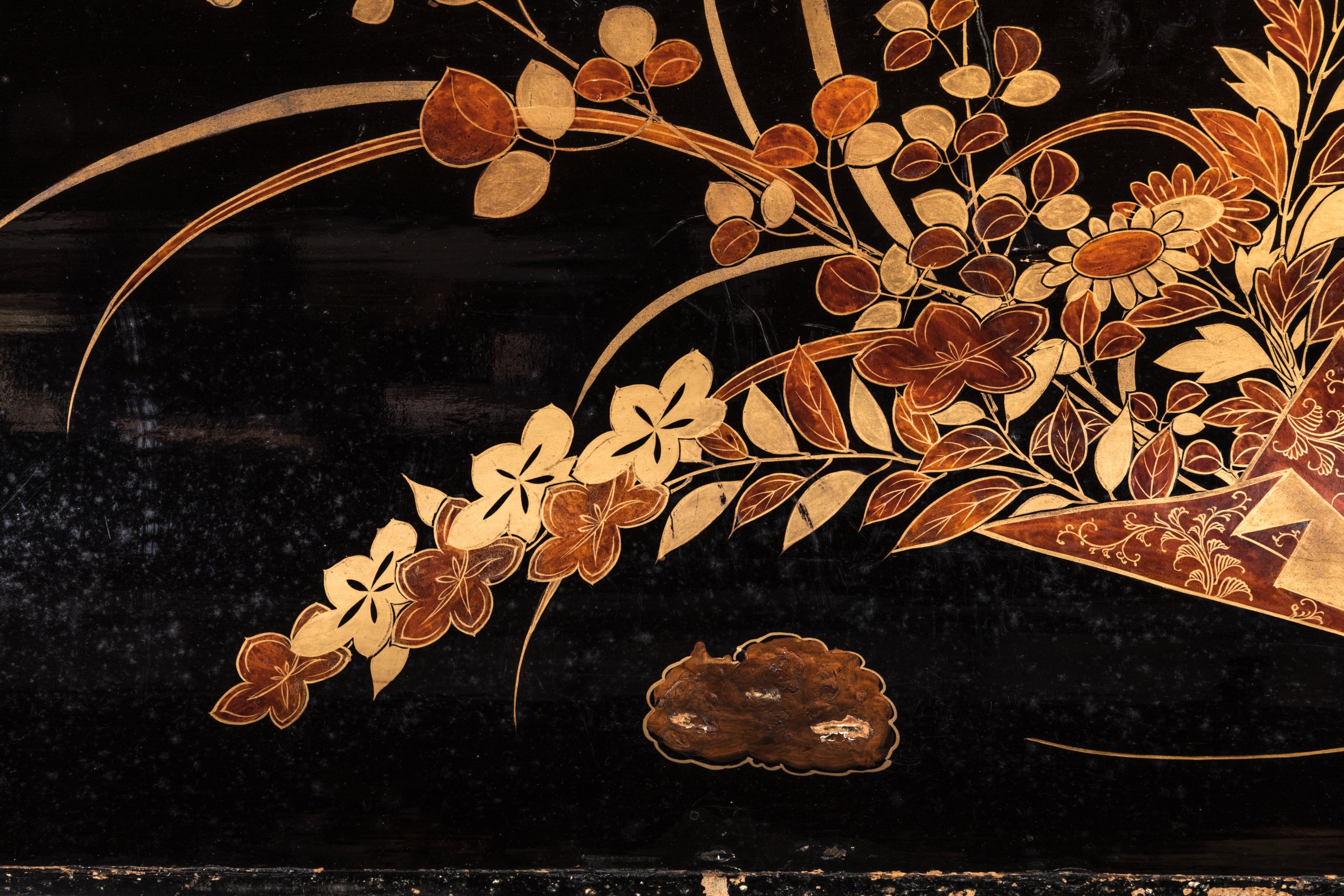 L'intérieur laqué noir à décor en hiramaki-e de laque or et brun d'un bouquet de fleurs d'automne près d'une pierre.