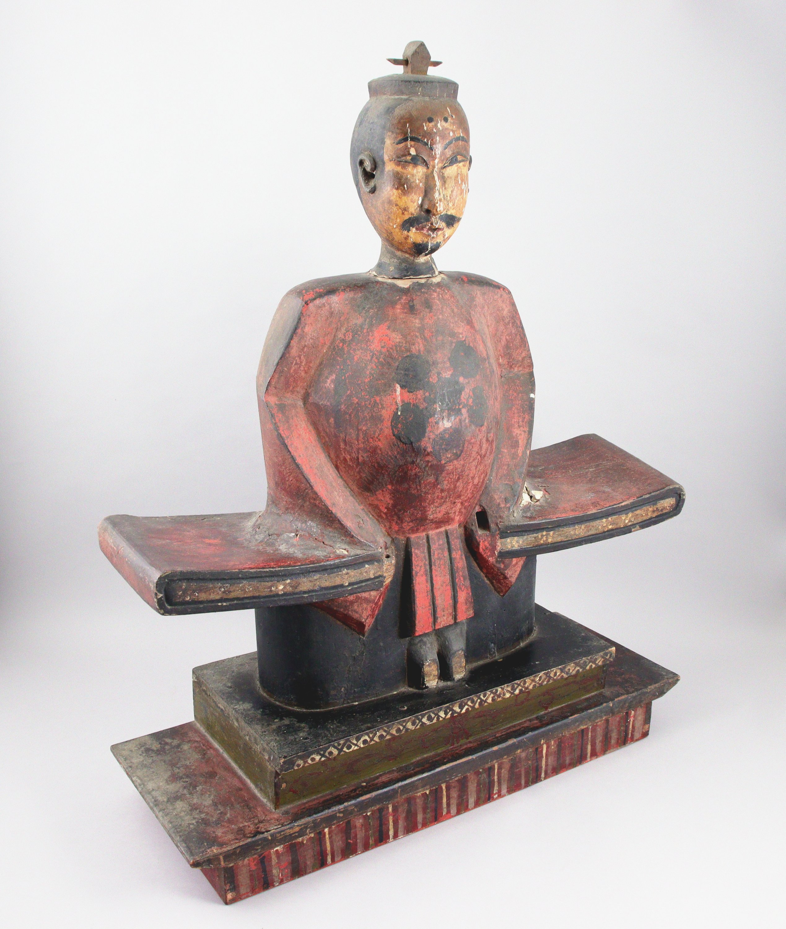 en bois laqué rouge et noir, assis sur une base rectangulaire. Coiffé de son chapeau.