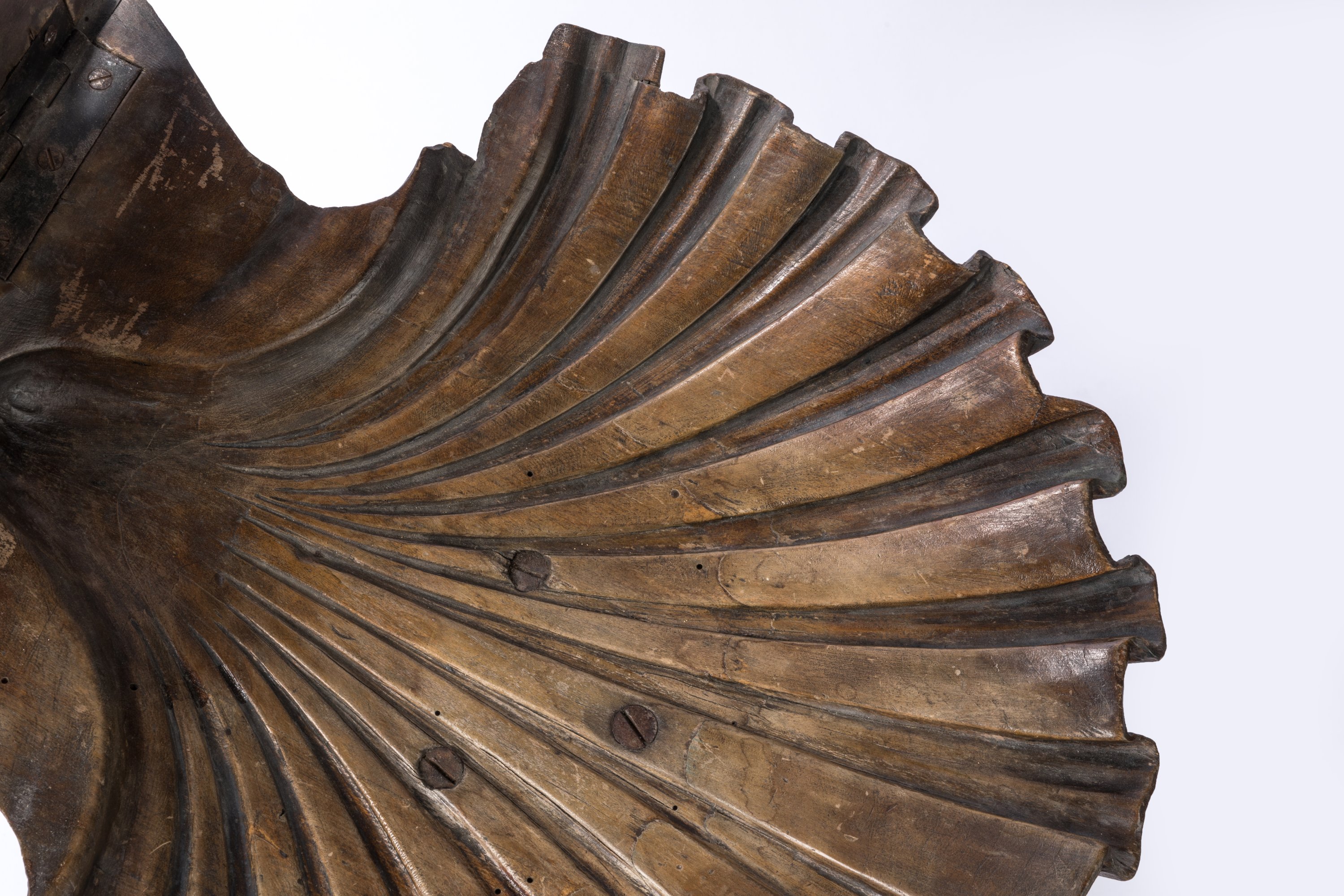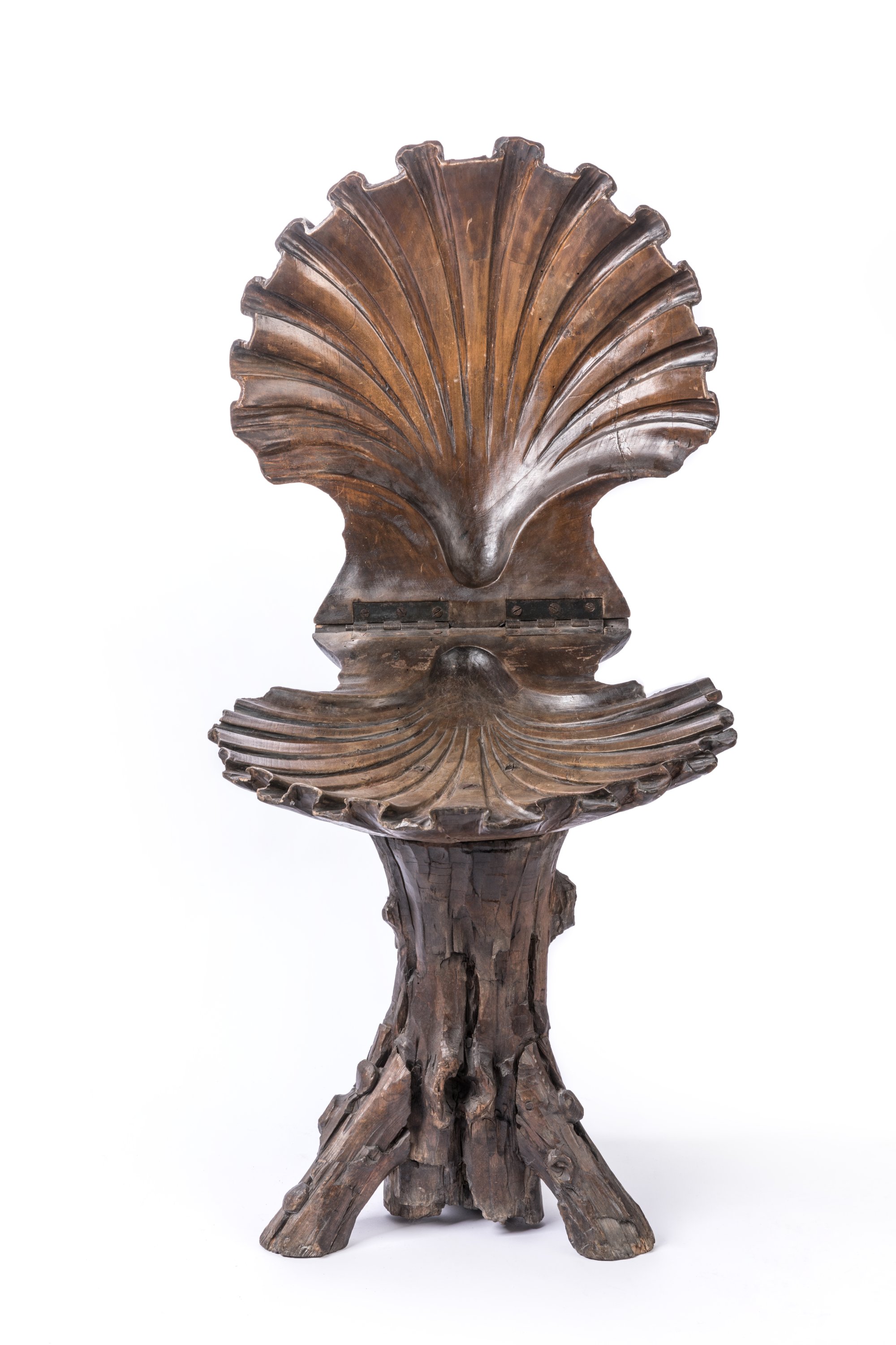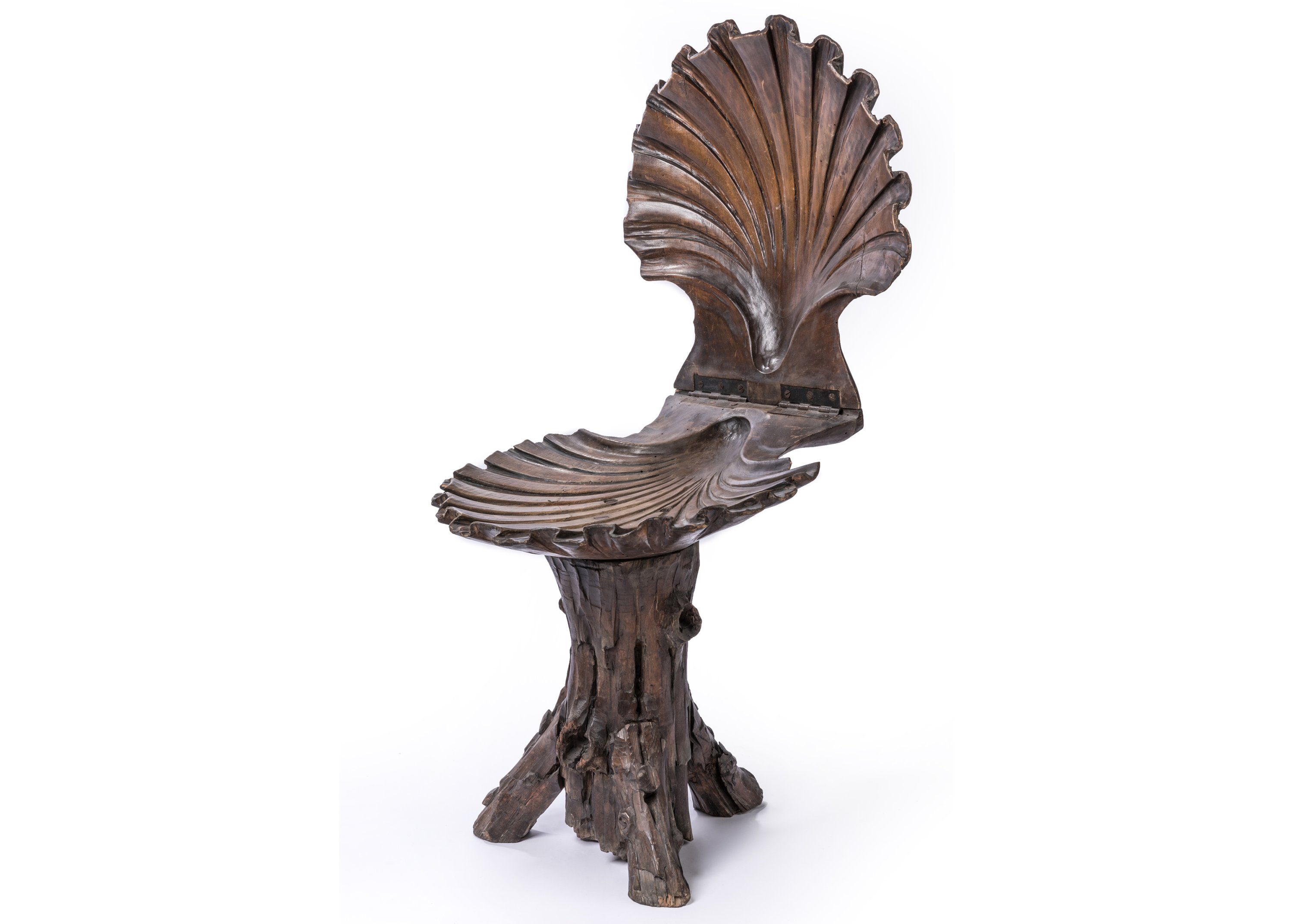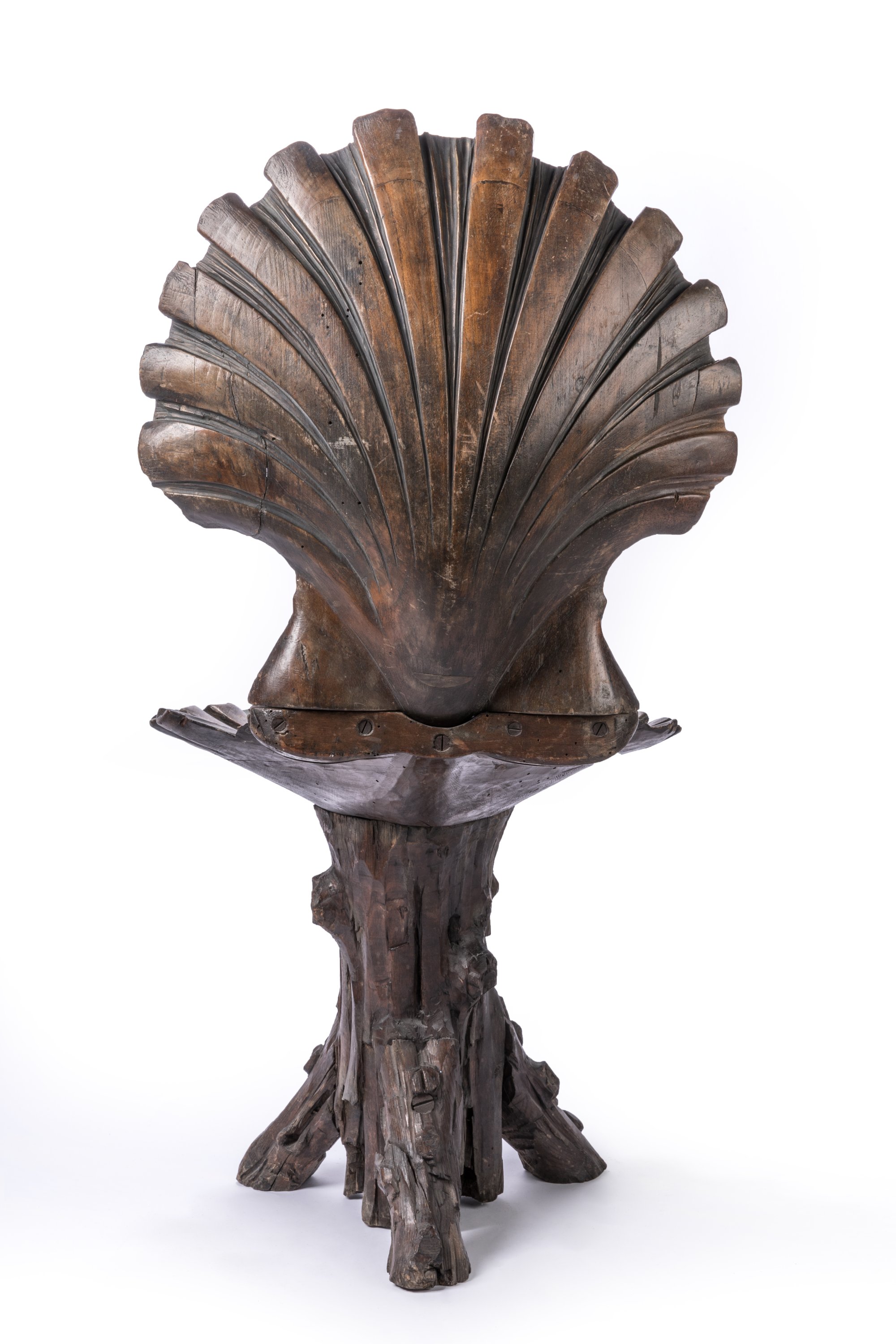 A late 19th-early 20th century Venitian carved and distressed wooden stool by maison Pauly & Cie in the shape of a scallop lying on a tree trunk.