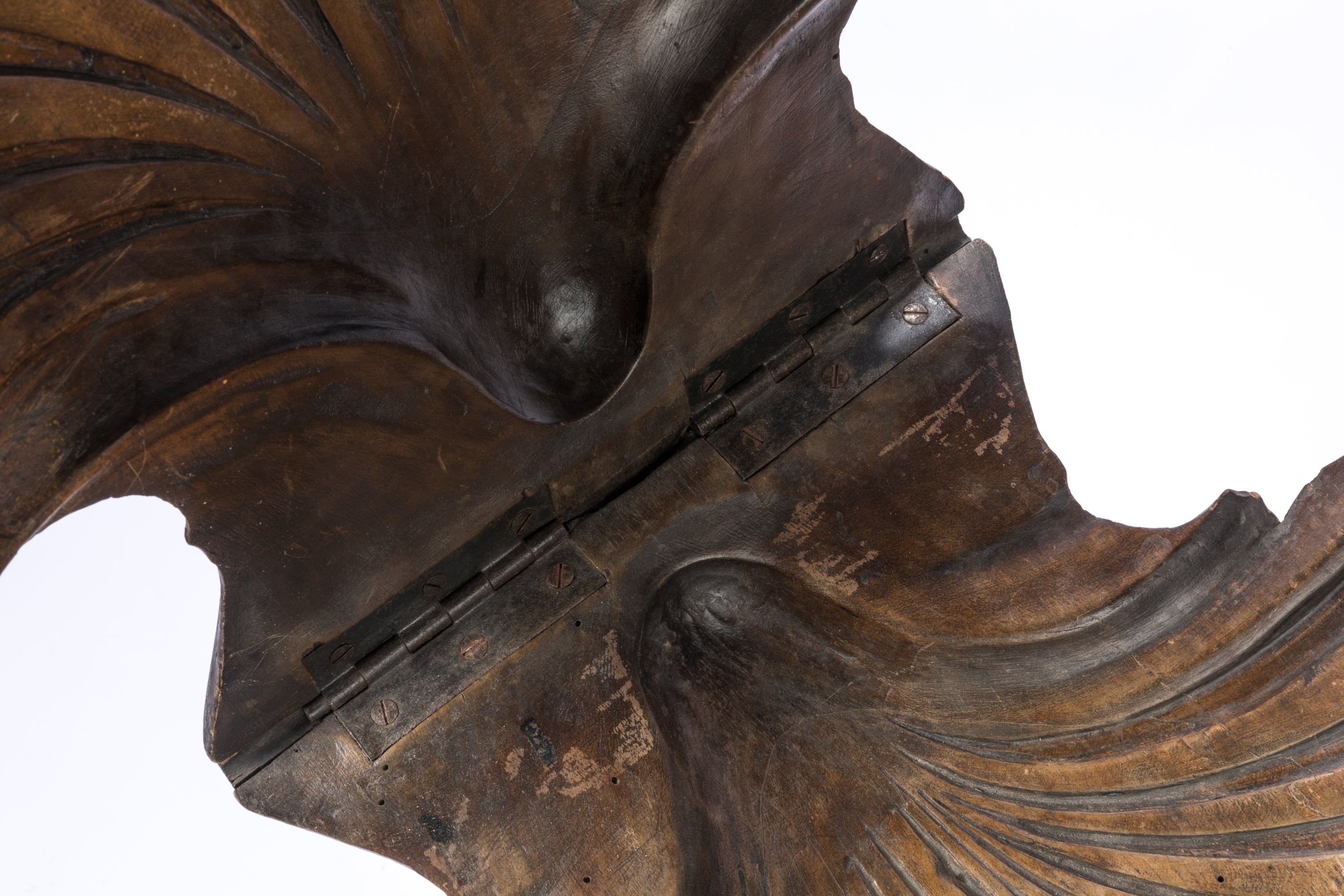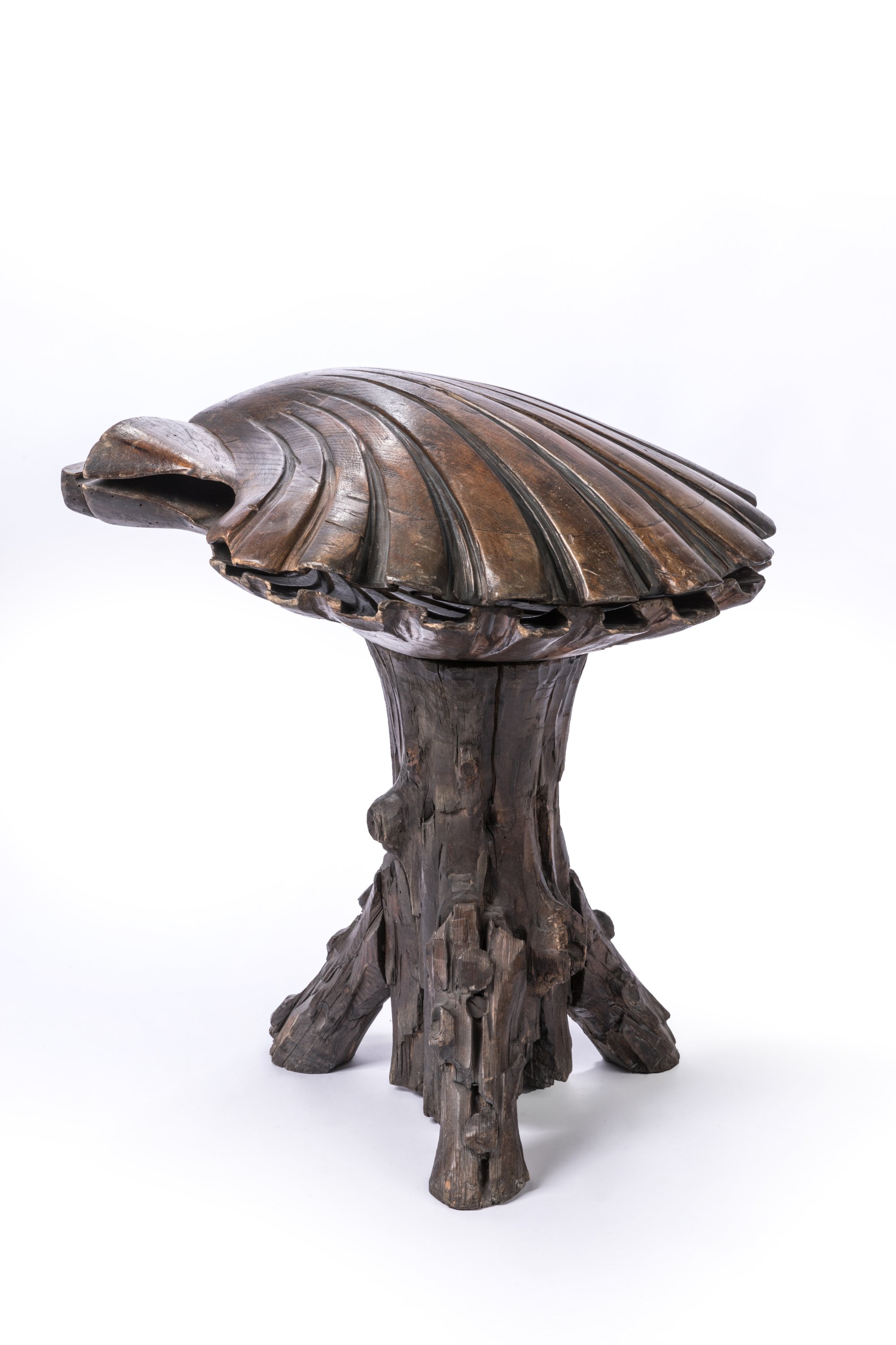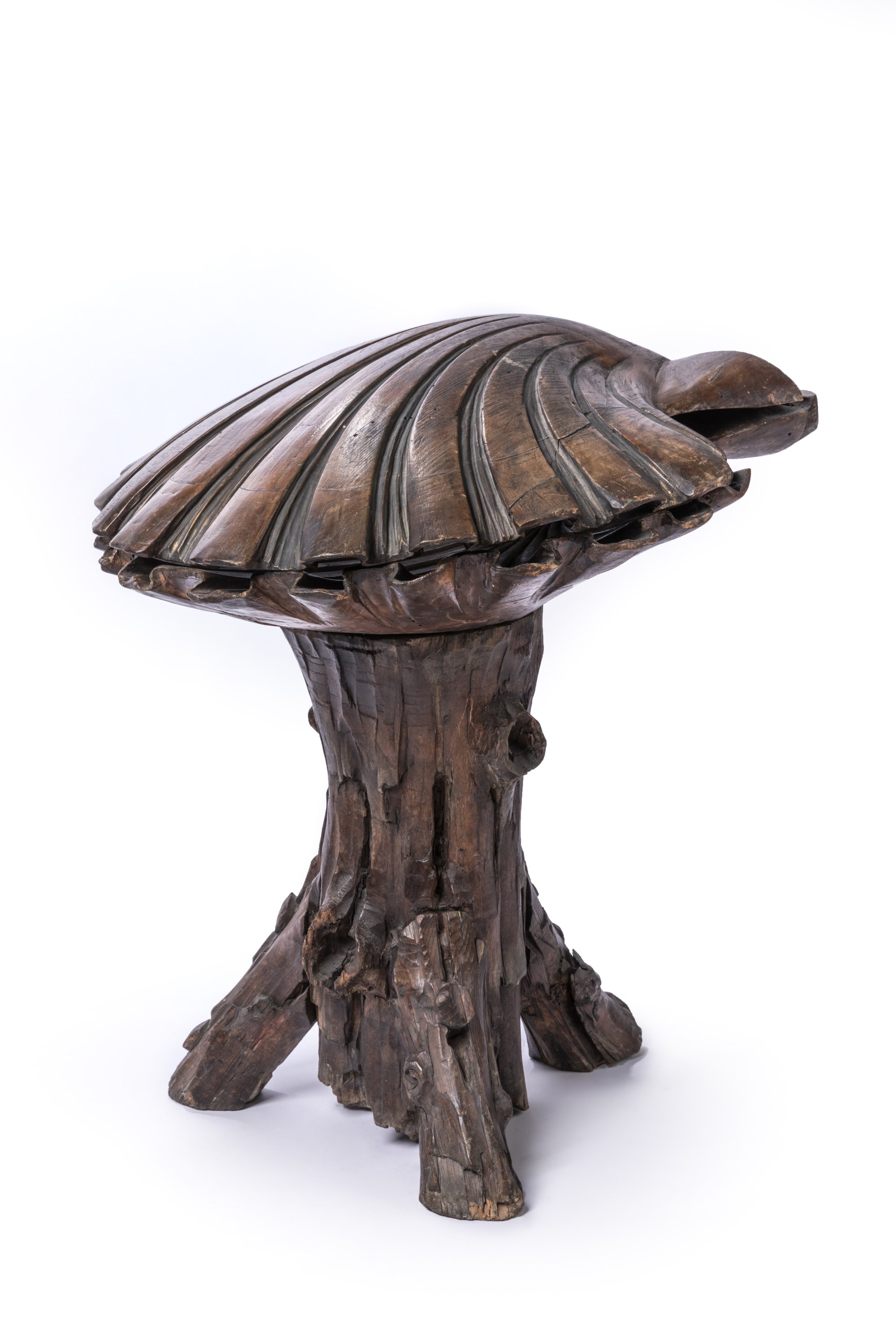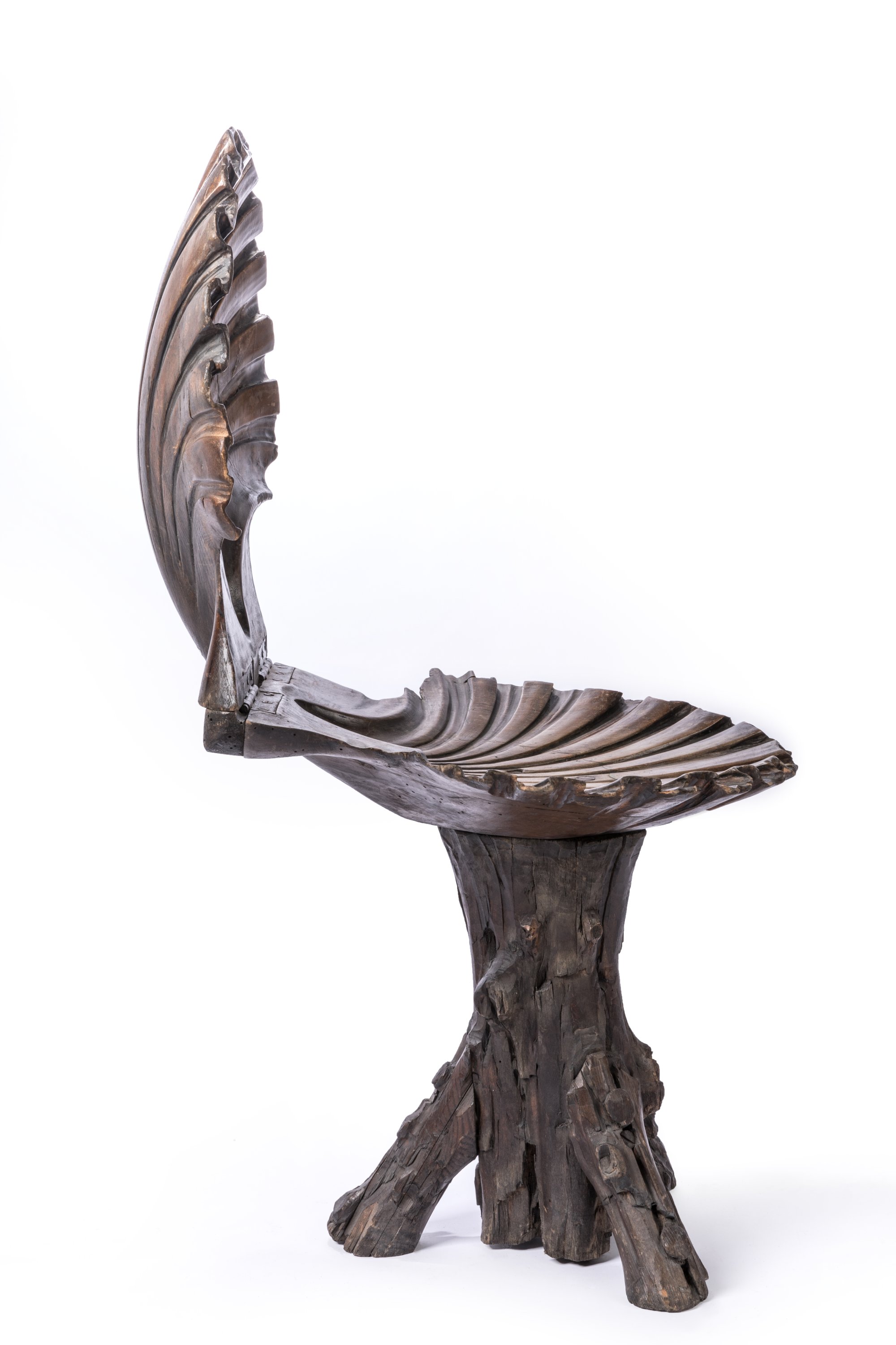 en bois sculpté et patiné. Le dossier relevable forme avec l'assise lorsqu'il est abaissé une coquille Saint-Jacques. Le piétement tripode imite un tronc d'arbre et ses racines.