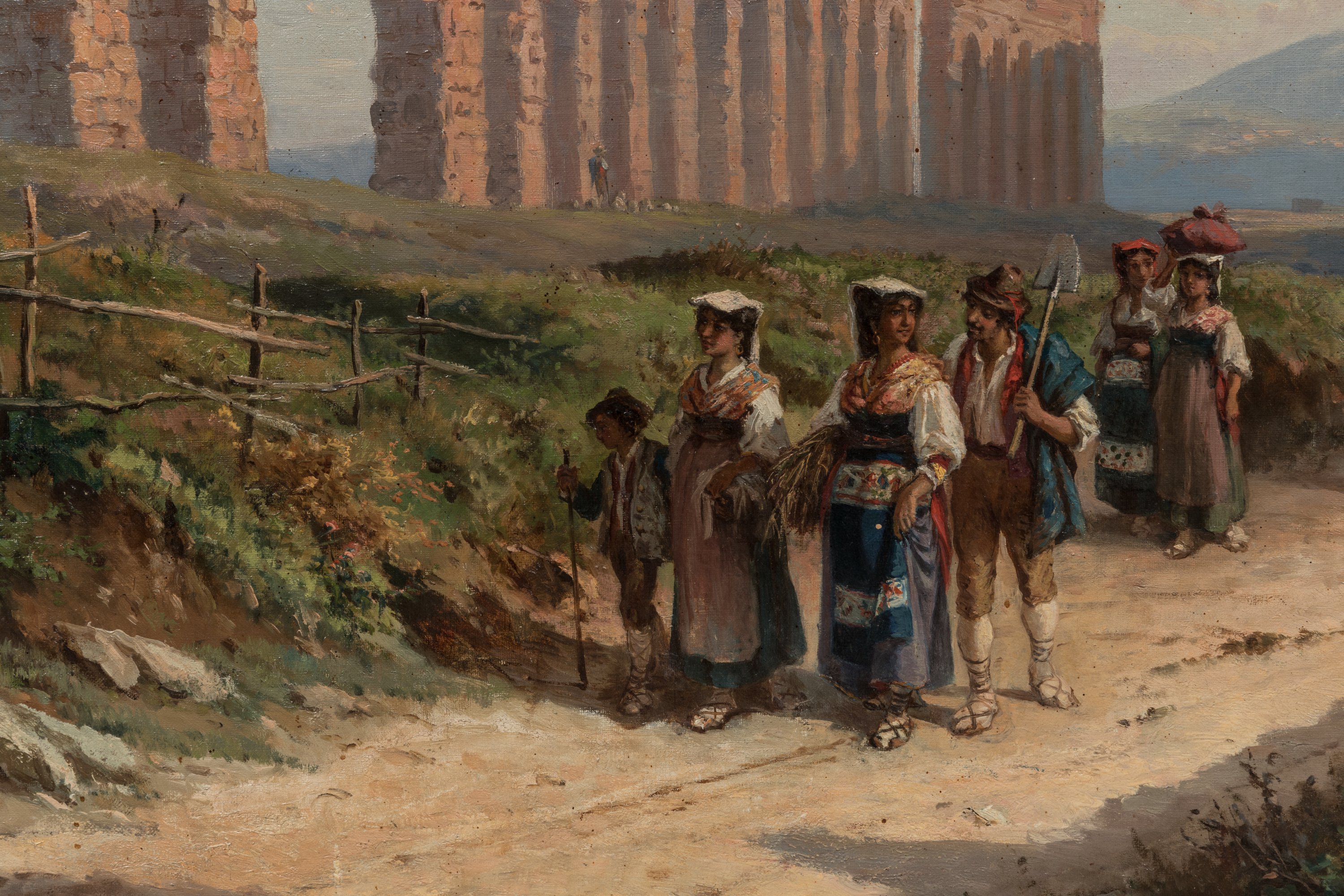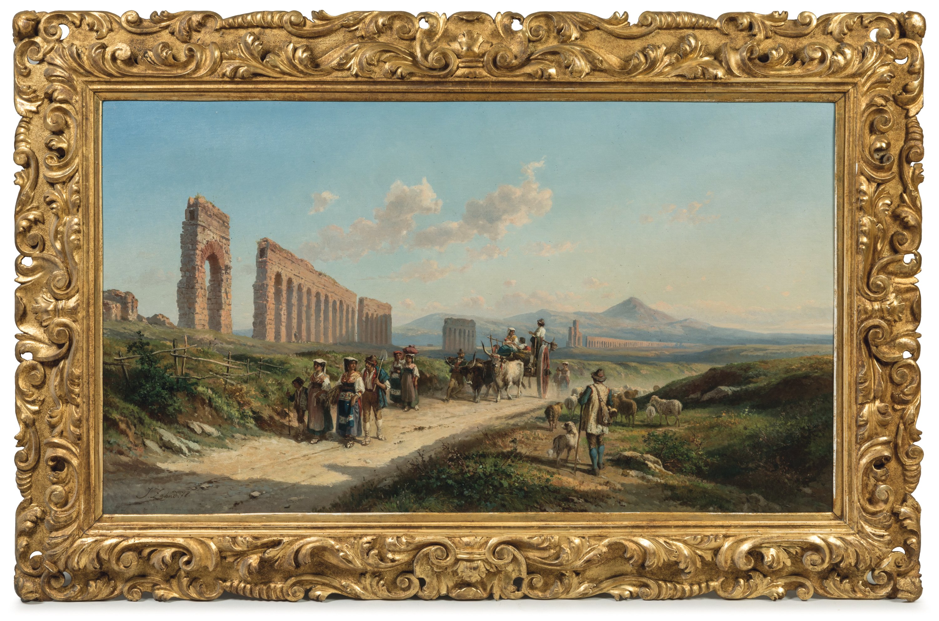 A 1878 painting by Johann Zahnd depicting a scene by the Roman Aqua Claudia aqueduct. Signed and dated canvas.