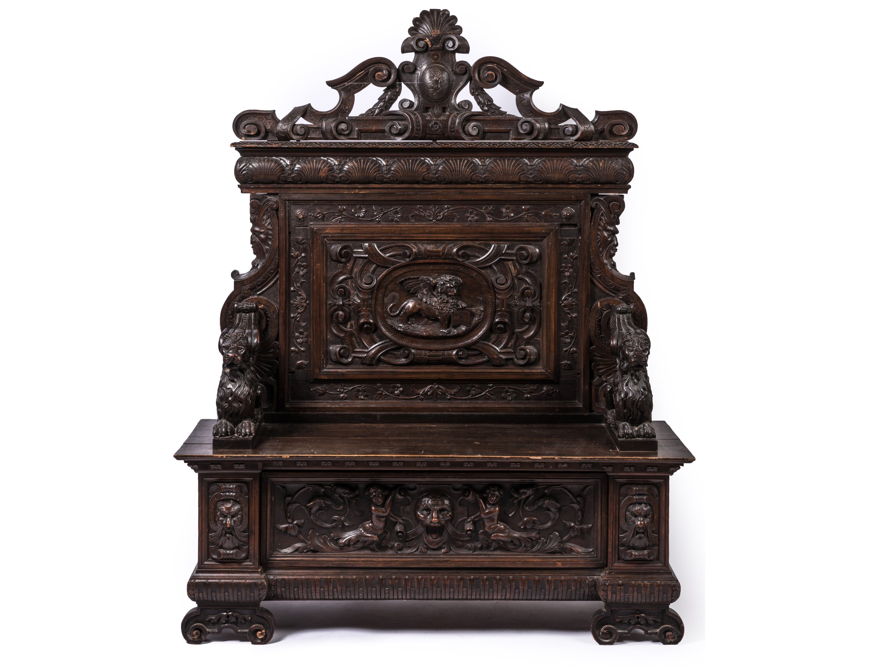 A 19th century carved wooden cathedra decorated with the Lion of Saint Mark.