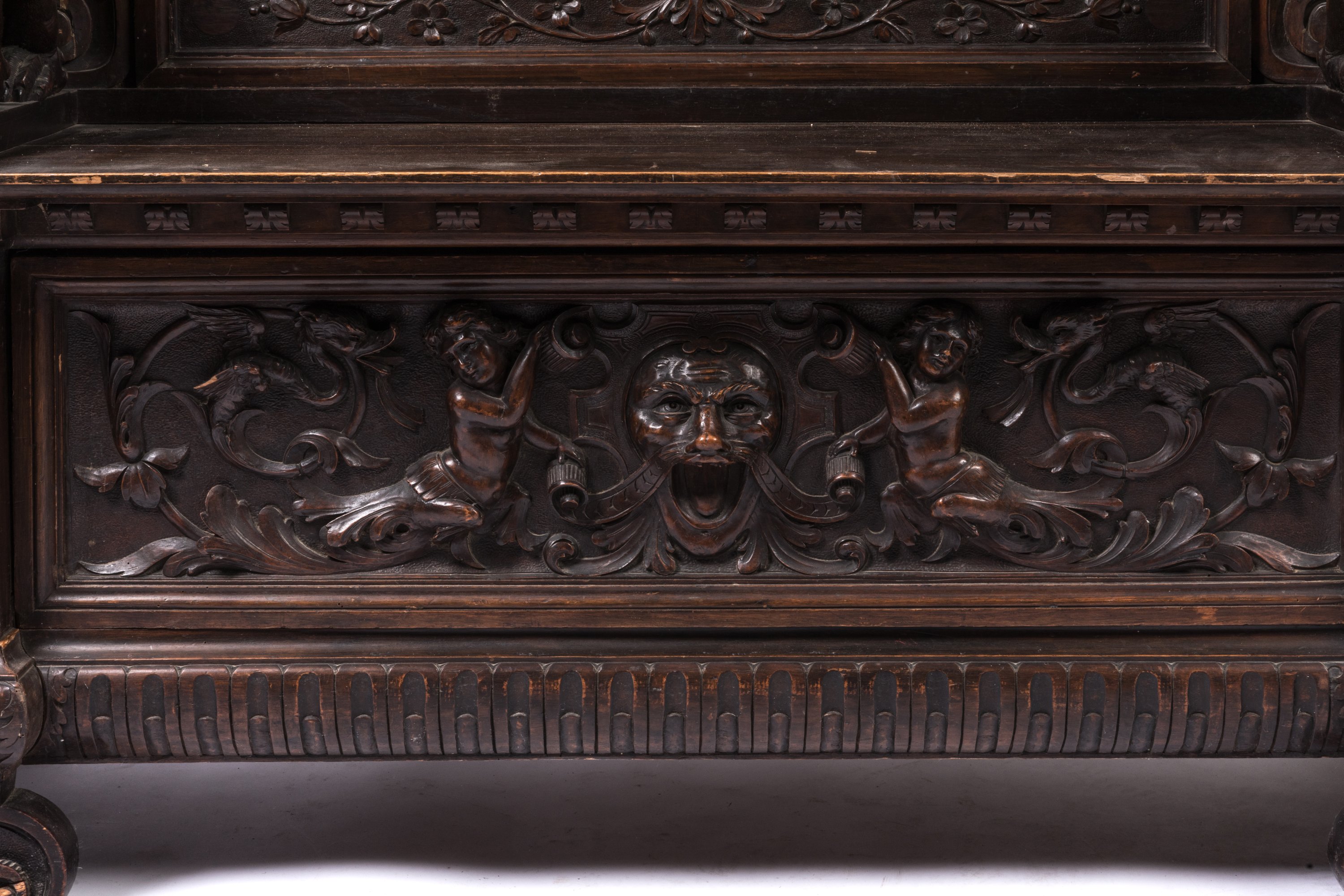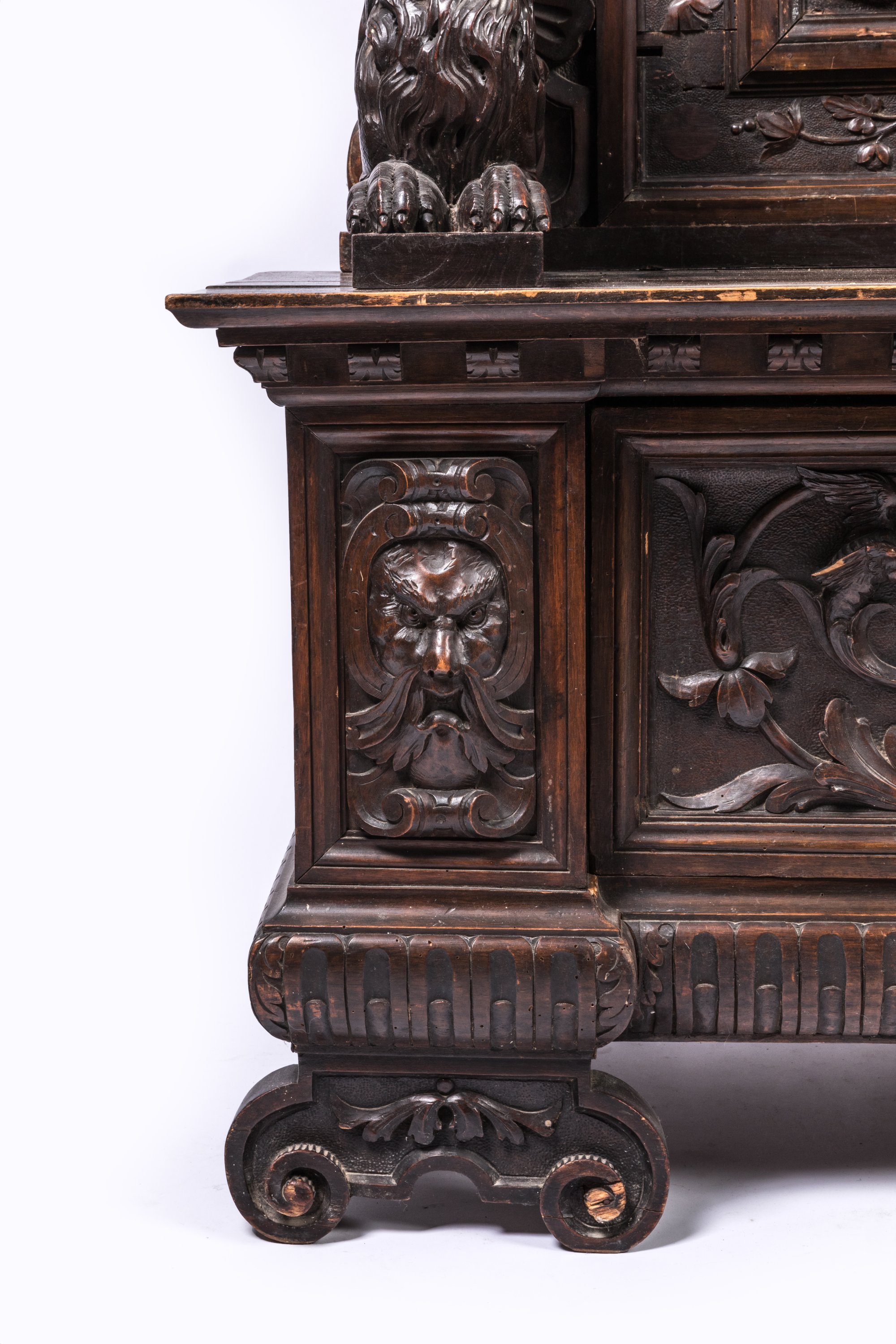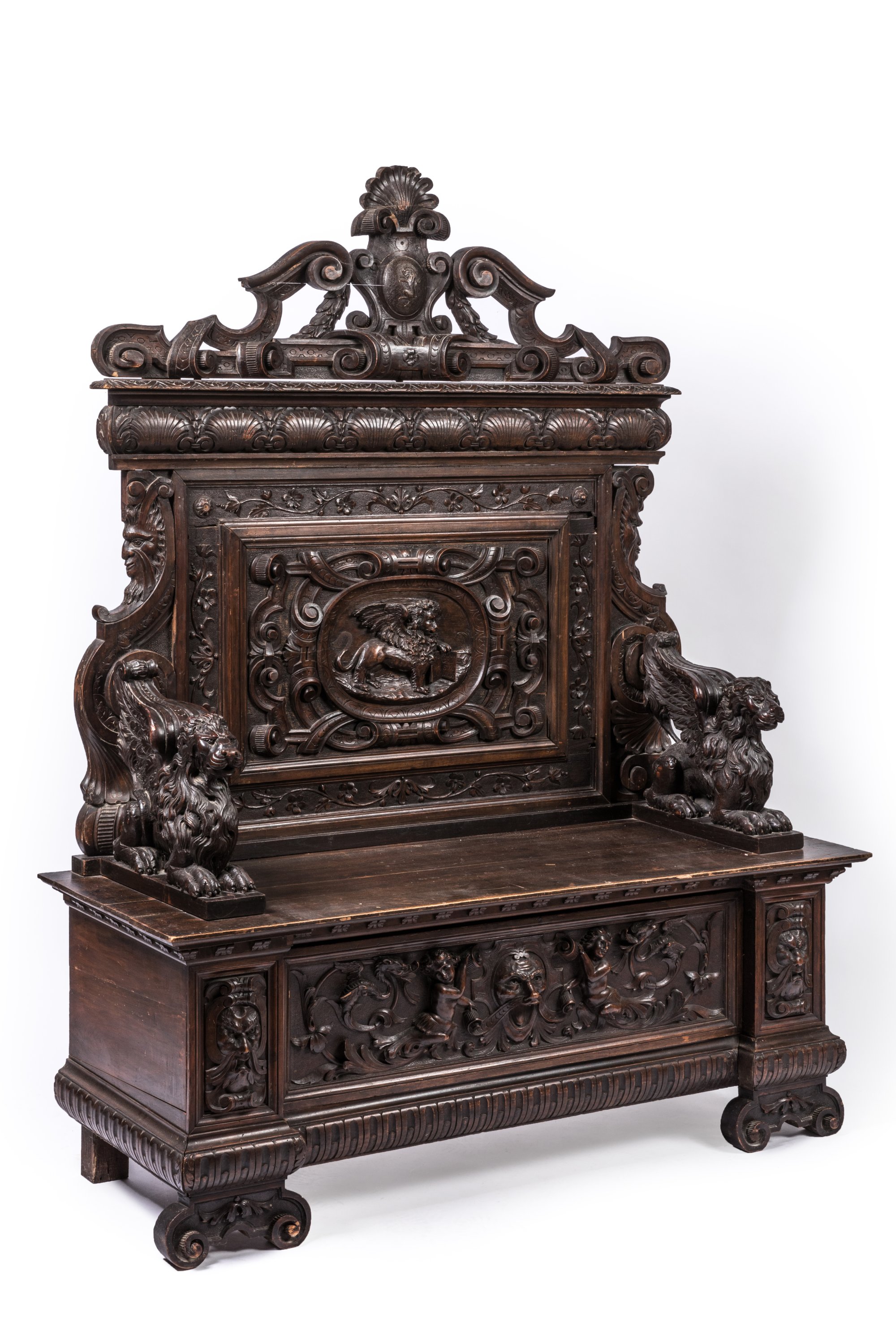 en bois mouluré et sculpté. Le dossier est orné du Lion de saint Marc dans un médaillon, de motifs géométriques, d'arabesques et de coquilles. Les accotoirs figurent également des lions. La partie basse du meuble ouvre à un tiroir, et est ornée sur les côtés d'arabesques, de sirènes, de mascarons et de coquilles. Piétement à volute.