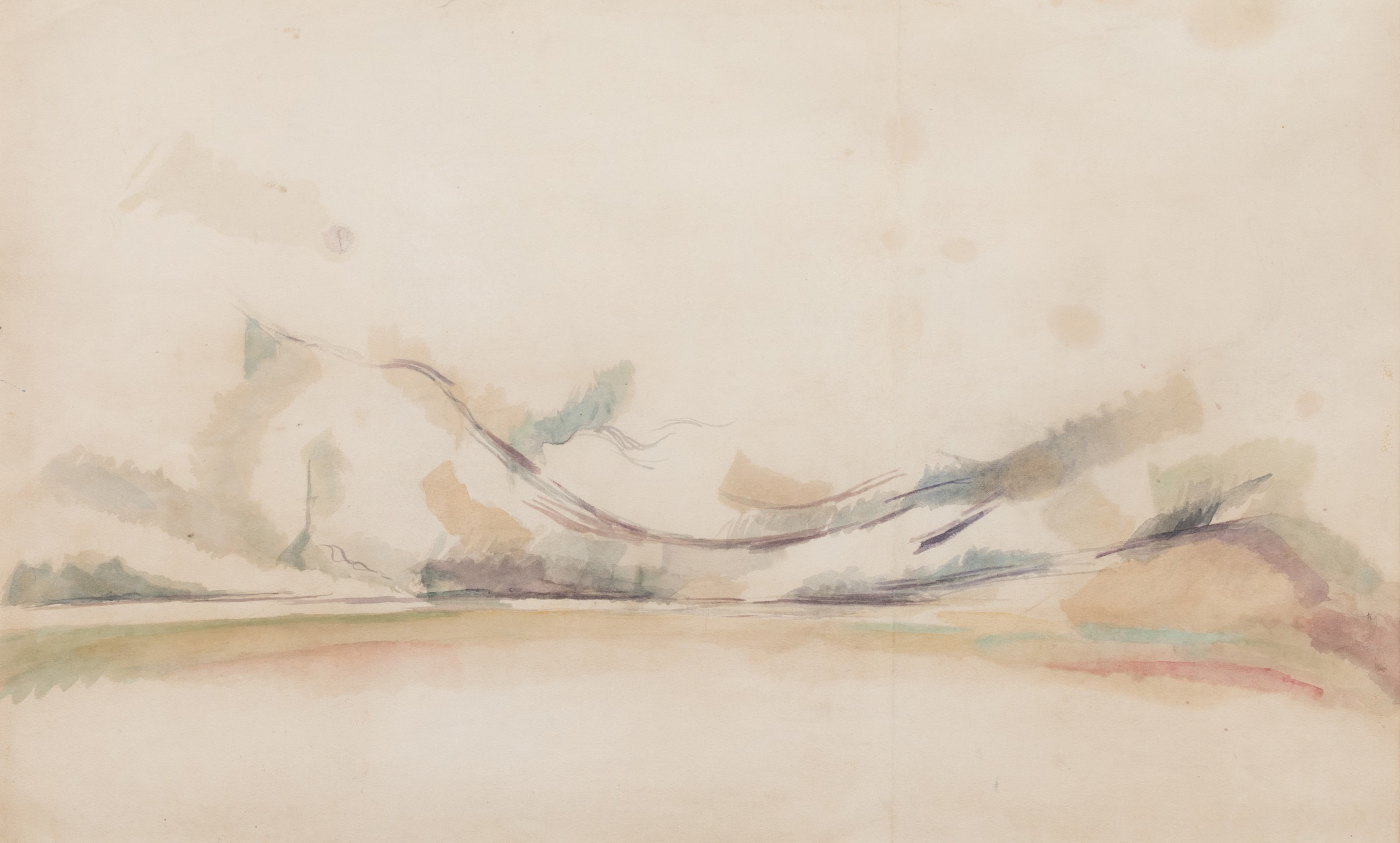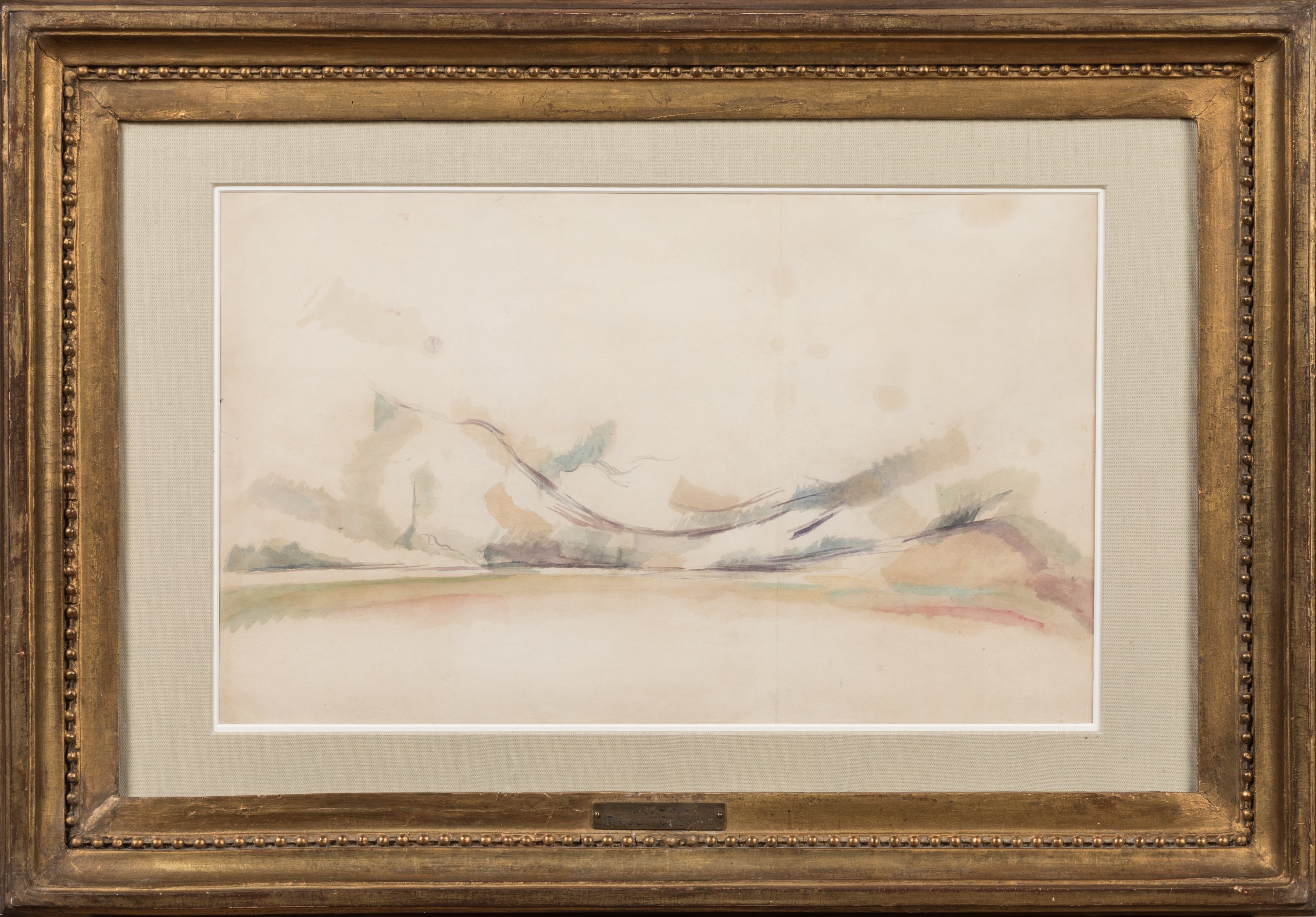 Les quelques taches et, surtout, les lignes liquides et colorées de notre aquarelle témoignent de la puissance silencieuse de la nature grandiose, comme si le lac d'Annecy s'inscrivait en miroir de sa chère montagne Sainte-Victoire.