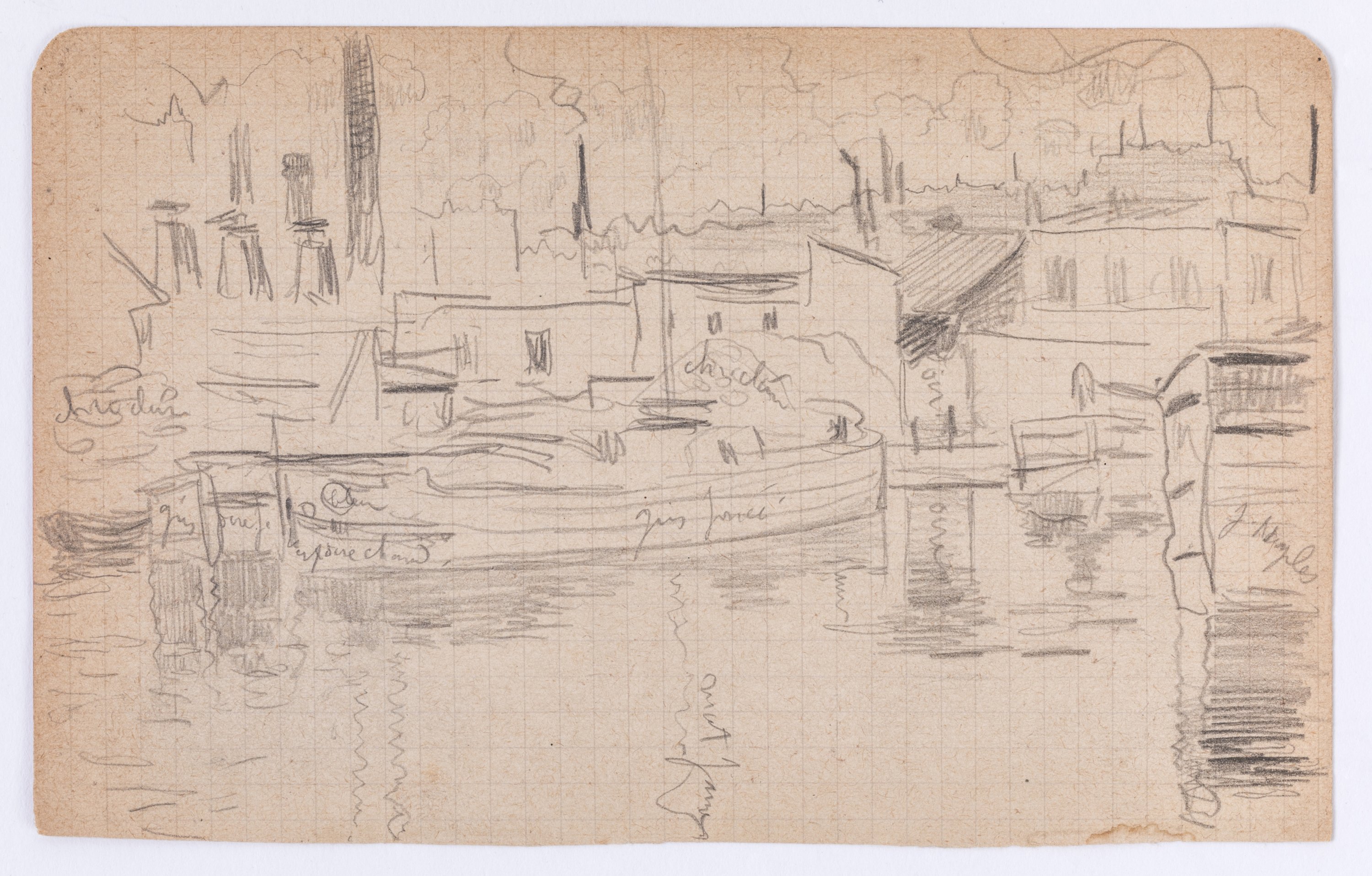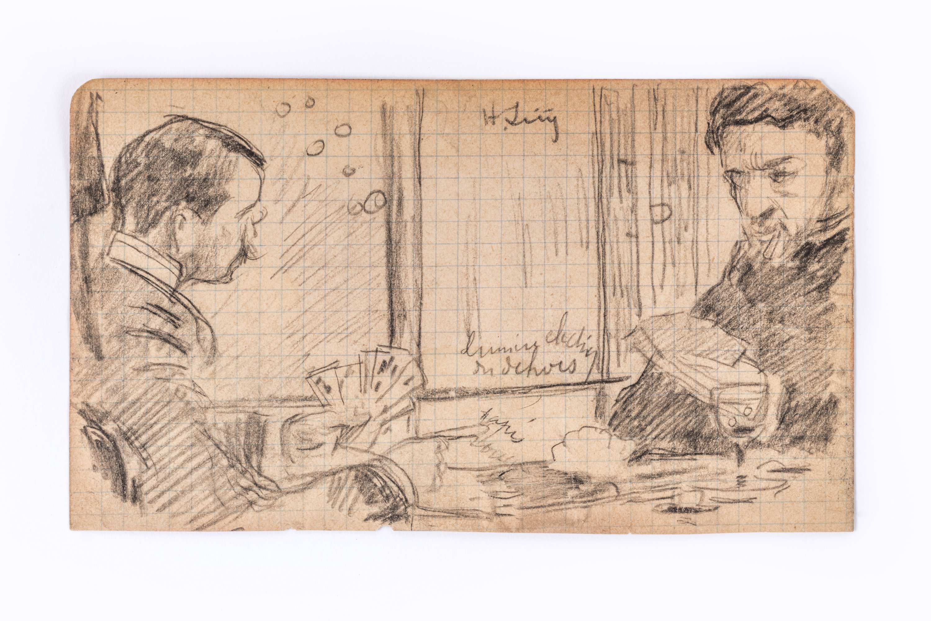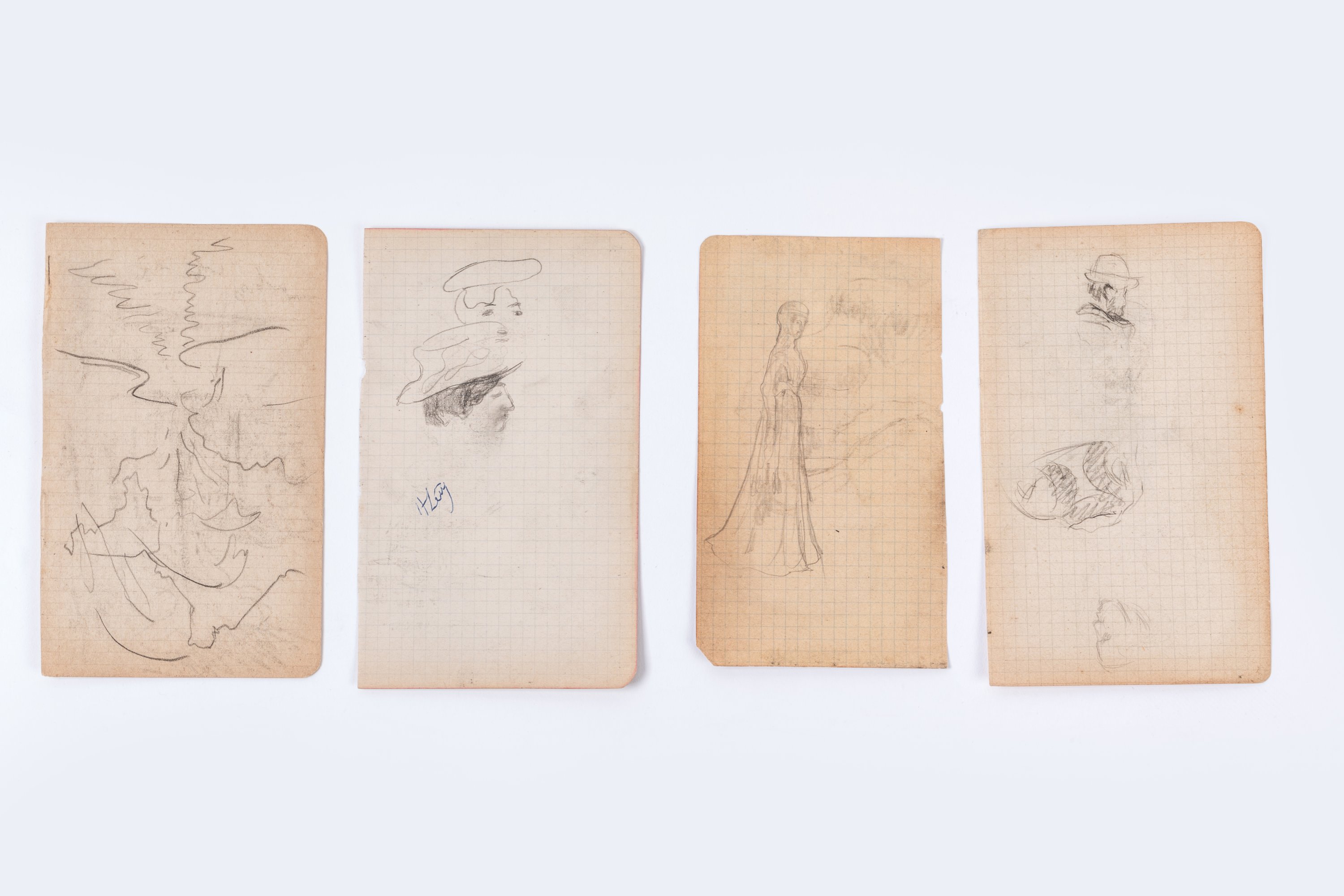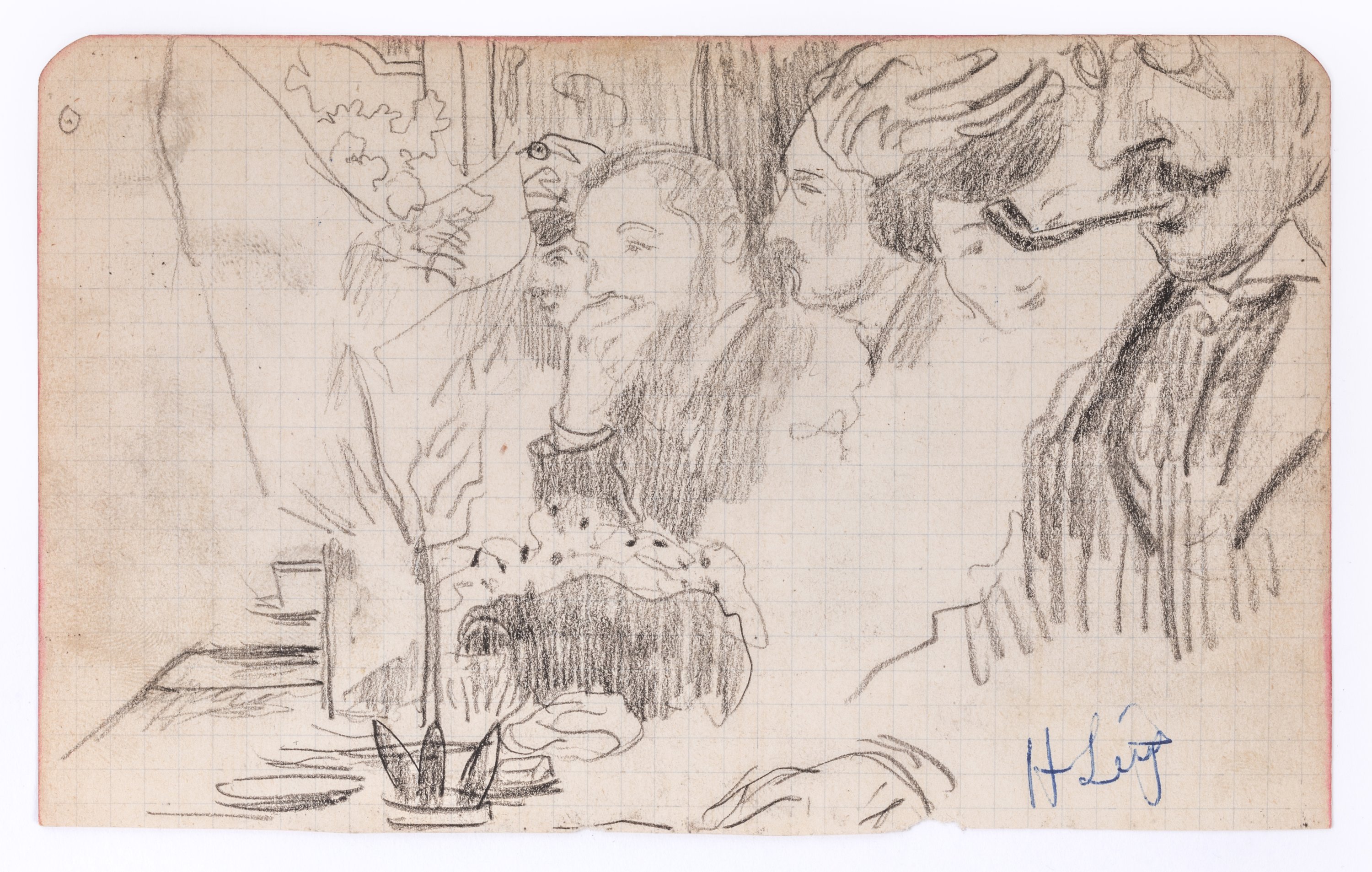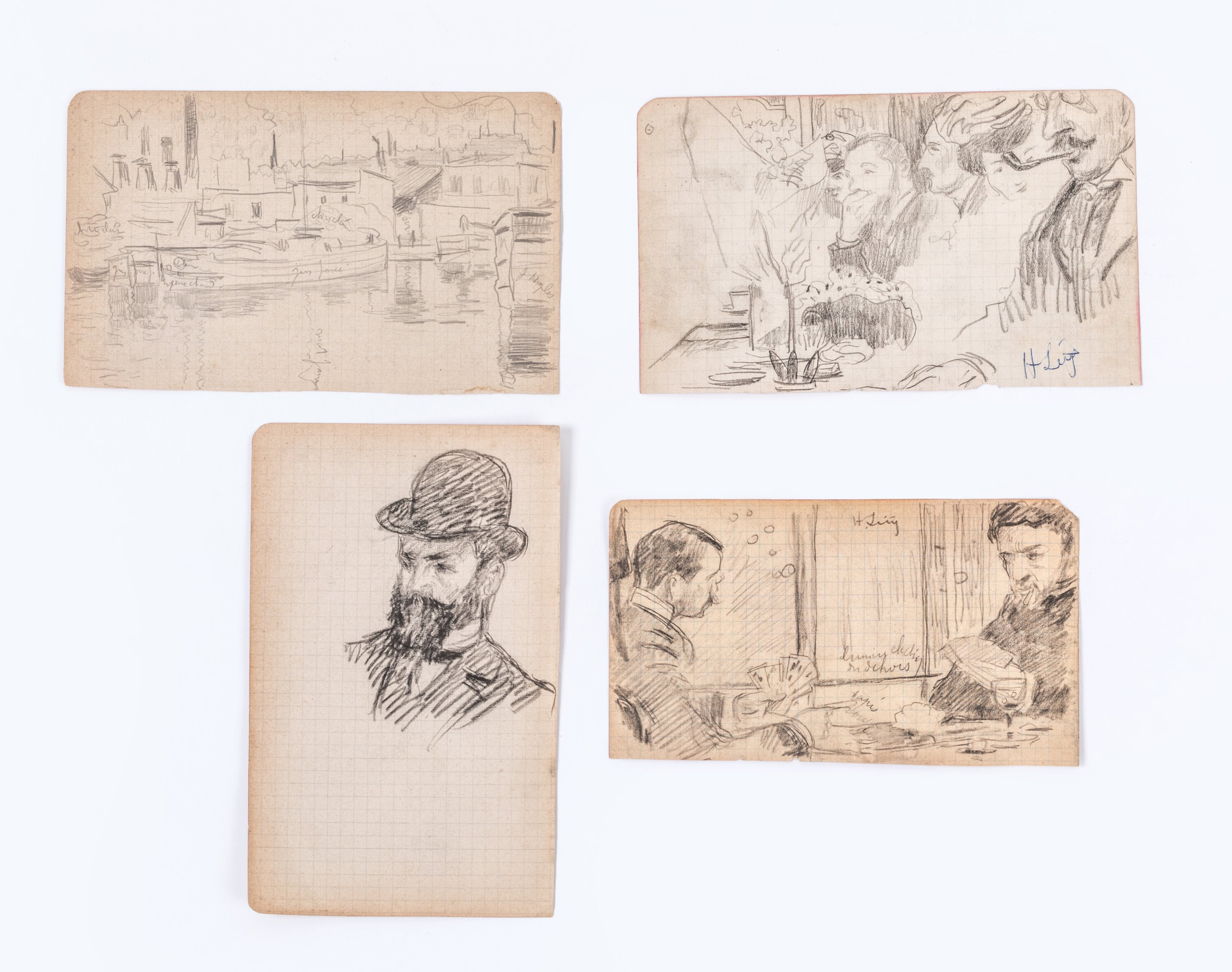 A set of four pencil sketches attributed to Henri Michel Lévy representing the "Groupe des Batignolles": presumed portraits of Manet, Theo and Vincent Van Gogh, card players, and a Seine river quay. Signed H. Lévy.
