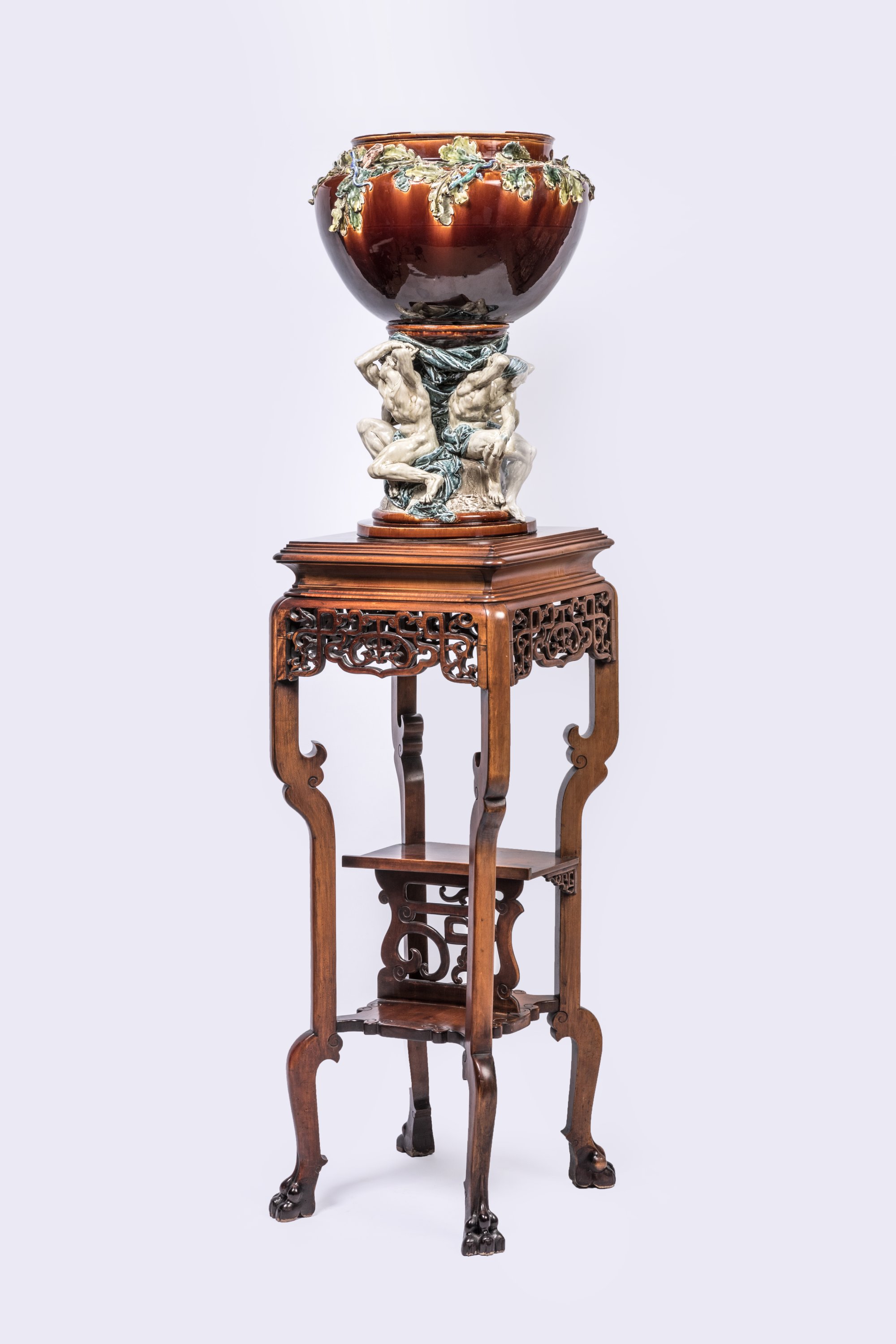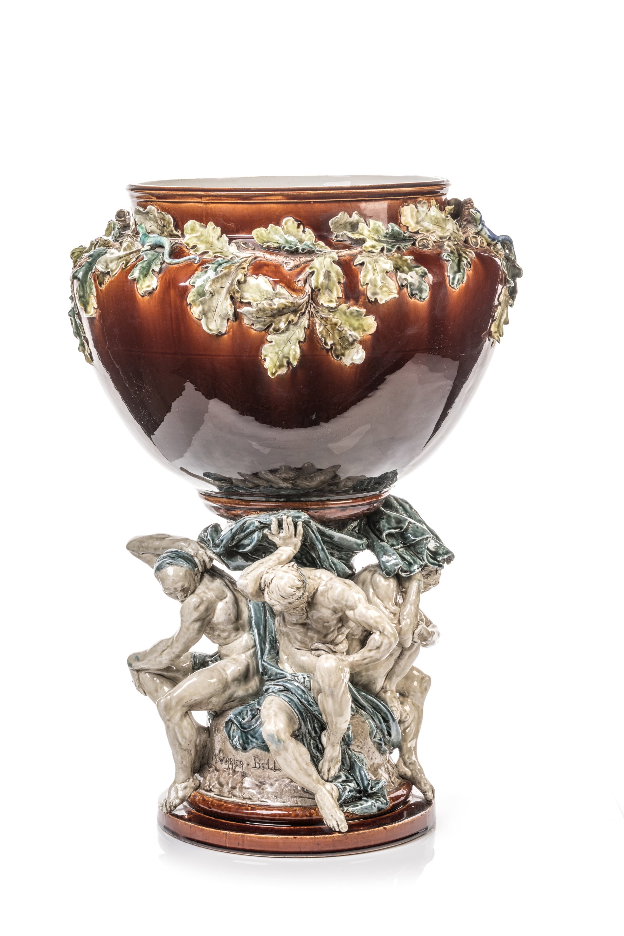 Signée de Carrier-Belleuse, la Jardinière aux Titans sest longtemps faite discrète dans lhistoire des arts décoratifs. Trois exemplaires complets seulement étaient répertoriés jusquen 2018, tous dans des collections muséales: au Museo Lazaro Galdiano de Madrid (n°inv.08158), au Petit Palais à Paris (n°inv ODUT 1924) et au Detroit Institute of Arts (n°inv. 2003.32). Un quatrième exemplaire non émaillé est quant à lui conservé au musée Rodin à Paris (n°inv. S.02682.RF.). Les quatre atlantes qui forment le piétement de la vasque ont en effet été modelés par Auguste Rodin. Leurs maquettes en terre cuite sont dailleurs conservées au Museum of Fine Arts de Houston (n°inv 58.20.1 et 2). Cest en 1877 que Rodin renoue avec Albert Carrier-Belleuse, le directeur de la manufacture de Sèvres, dont il avait quitté latelier. Il crée alors ce support complètement inédit au retour dun voyage en Italie. Celui qui nest pas encore le maître incontestable de la sculpture française rend ainsi hommage au travail de Michel-Ange, quil vient de découvrir. Toutefois, ce nest pas à Sèvres, mais à Choisy-le-Roi que la Jardinière des Titans est commercialisée à partir de 1884 sous le seul nom de Carrier-Belleuse. Son fils Louis-Robert y officie en effet comme directeur artistique entre 1890 et 1895. Dailleurs, plus quaux Titans du piétement, cest dabord aux lézards de la vasque que le catalogue de vente de la manufacture rend hommage en 1895