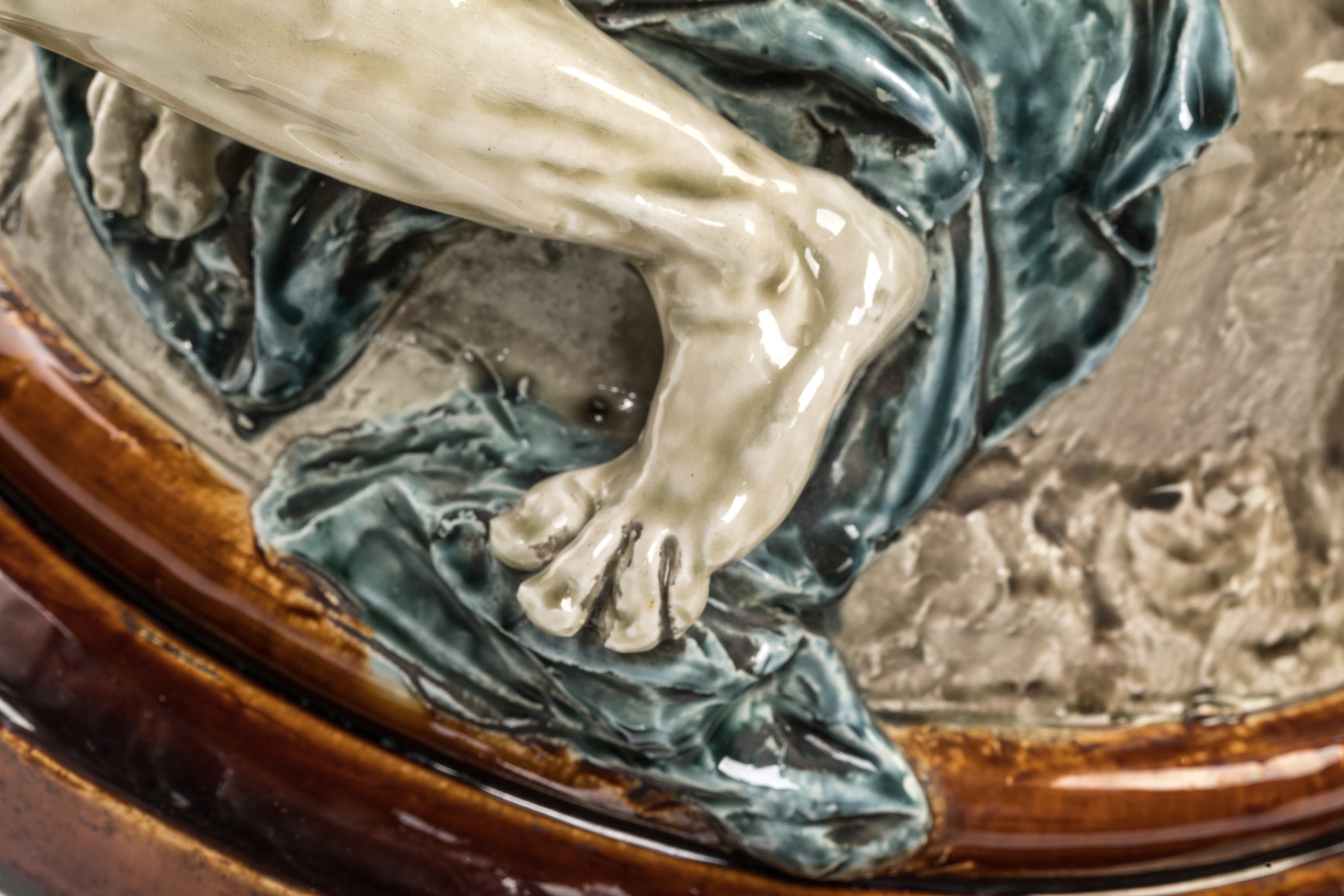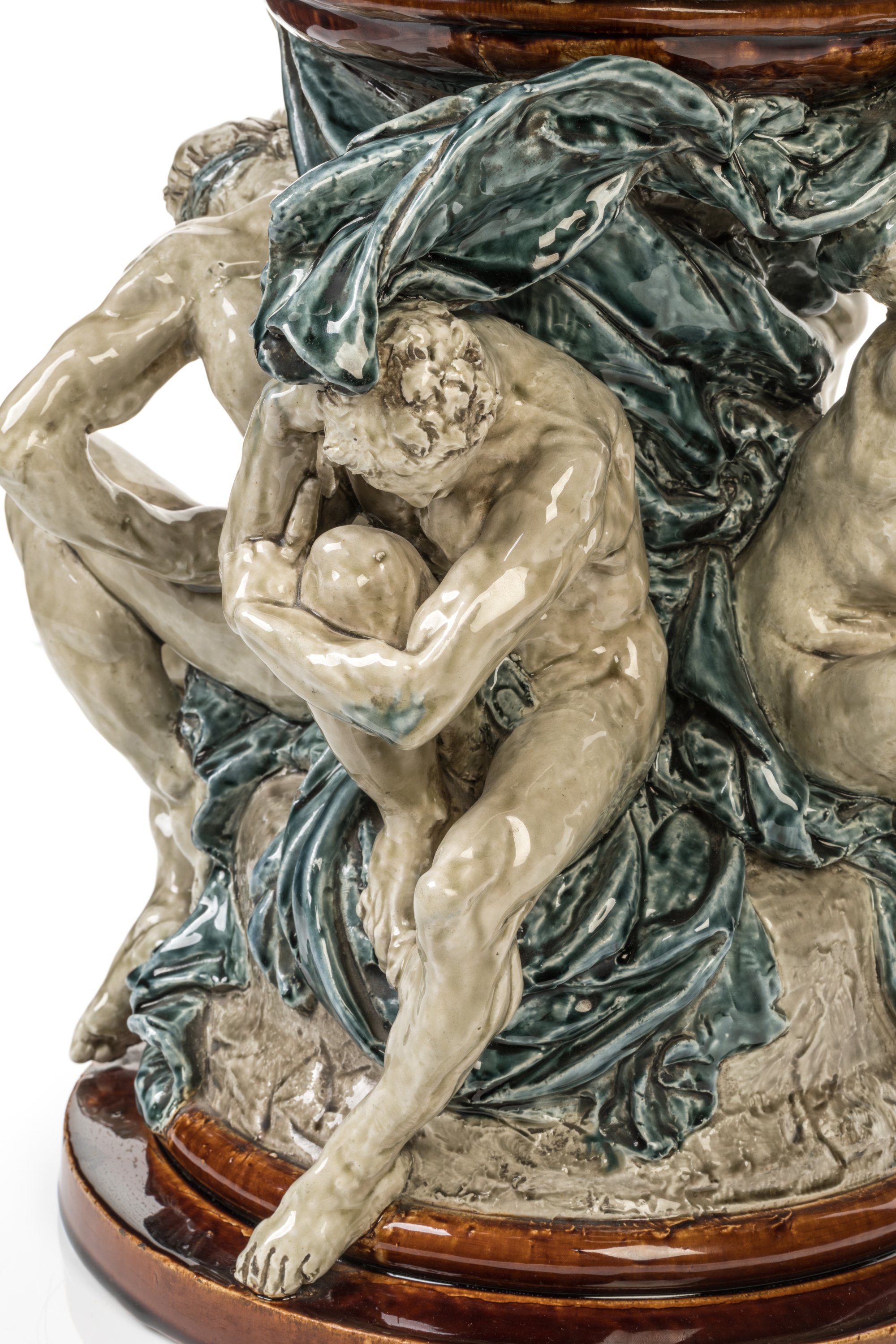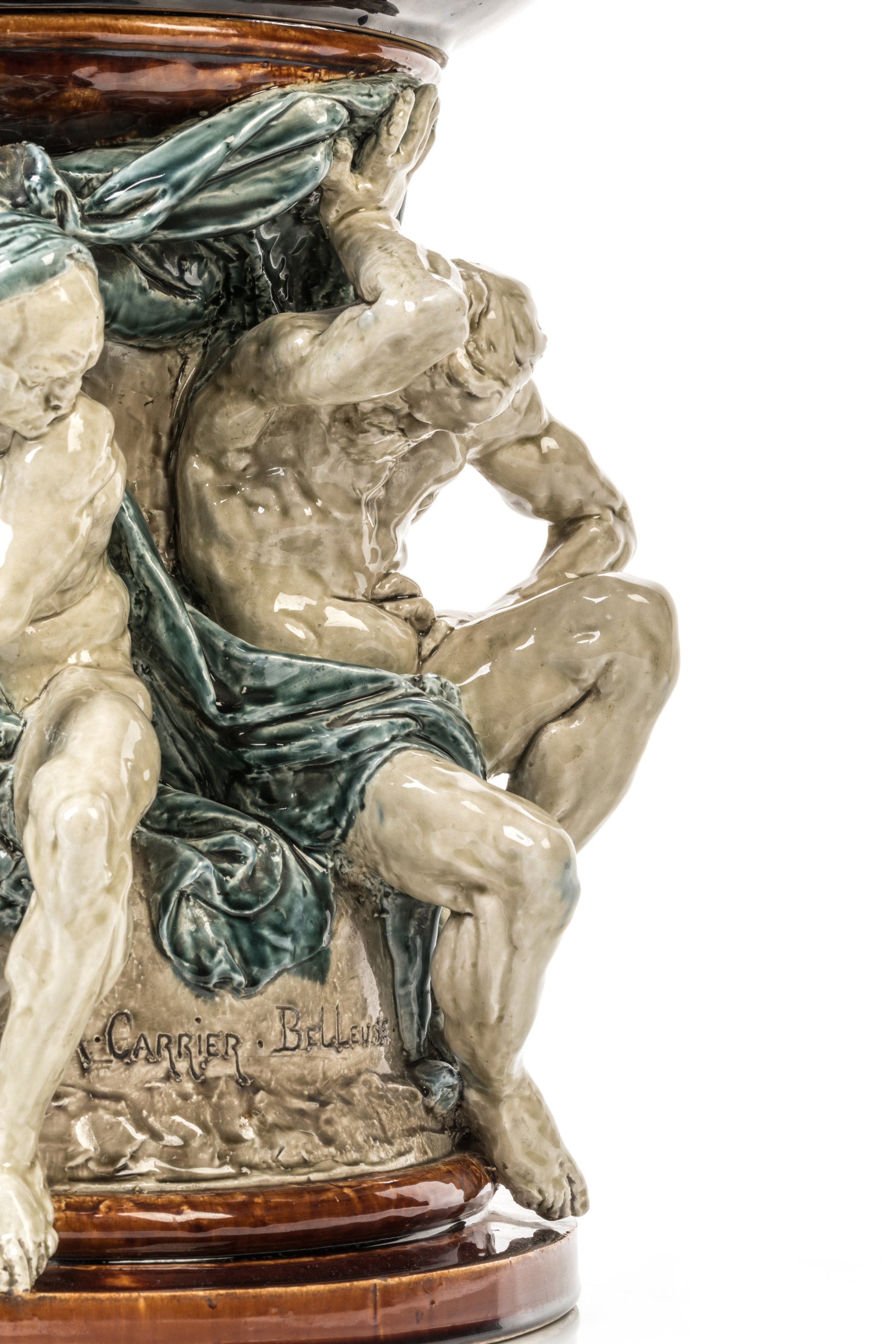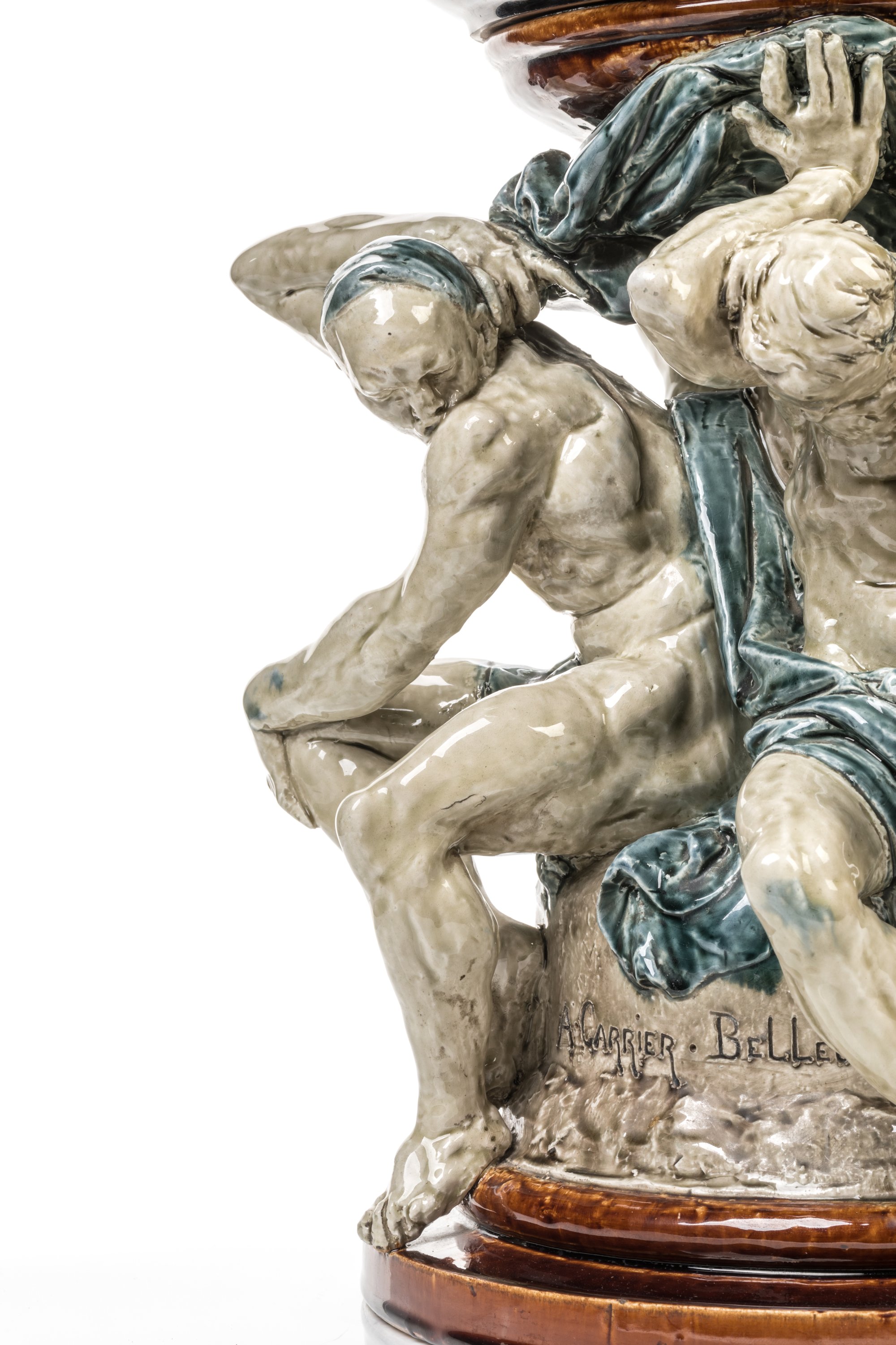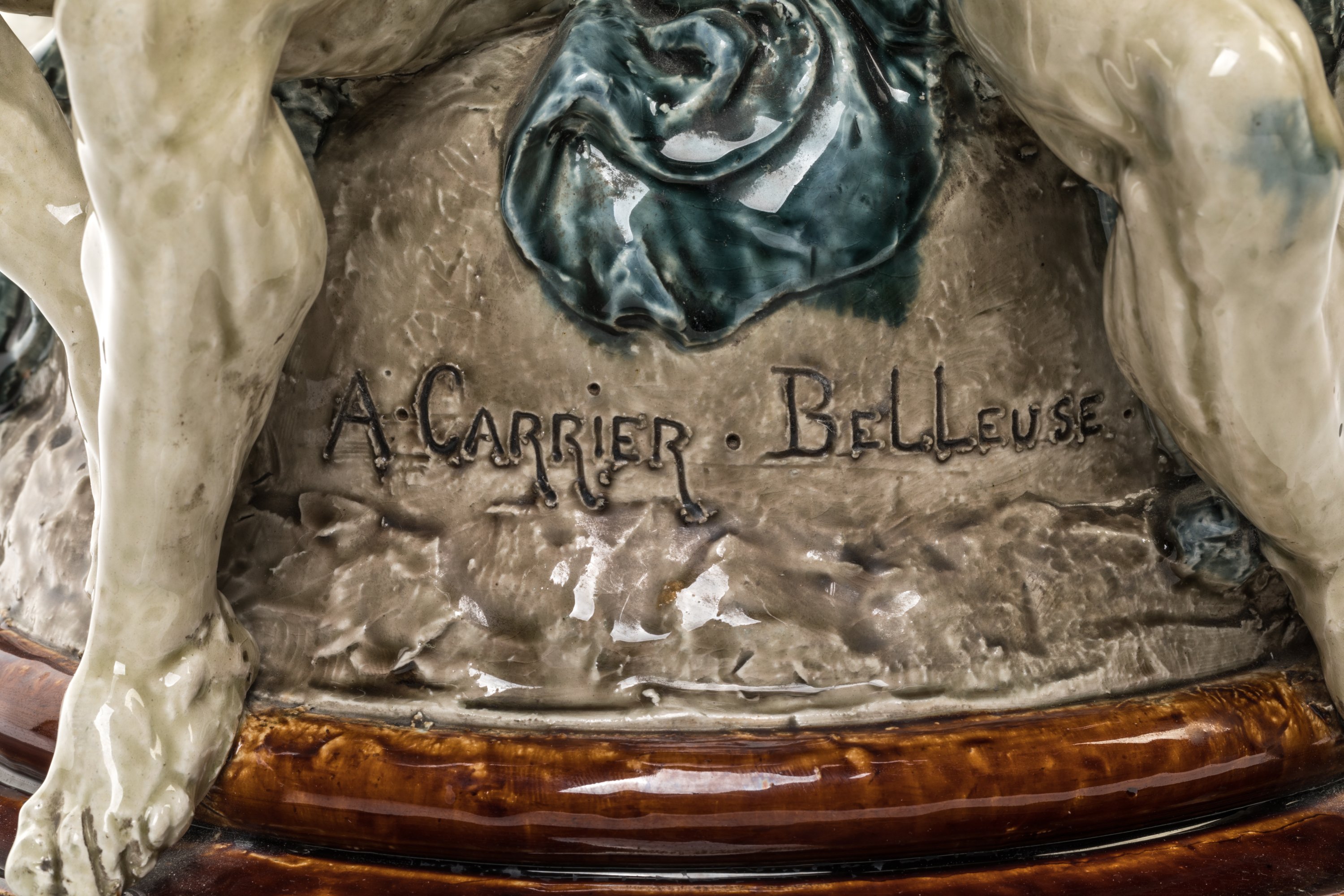 Le piétement composé de quatre Titans en relief en faïence émaillée. Signé " A. CARRIER-BELLEUSE ".