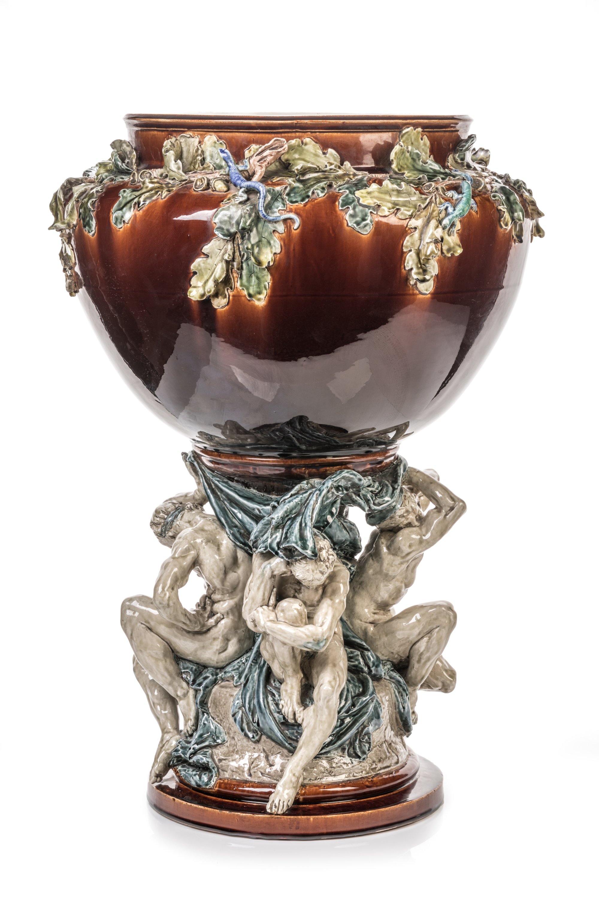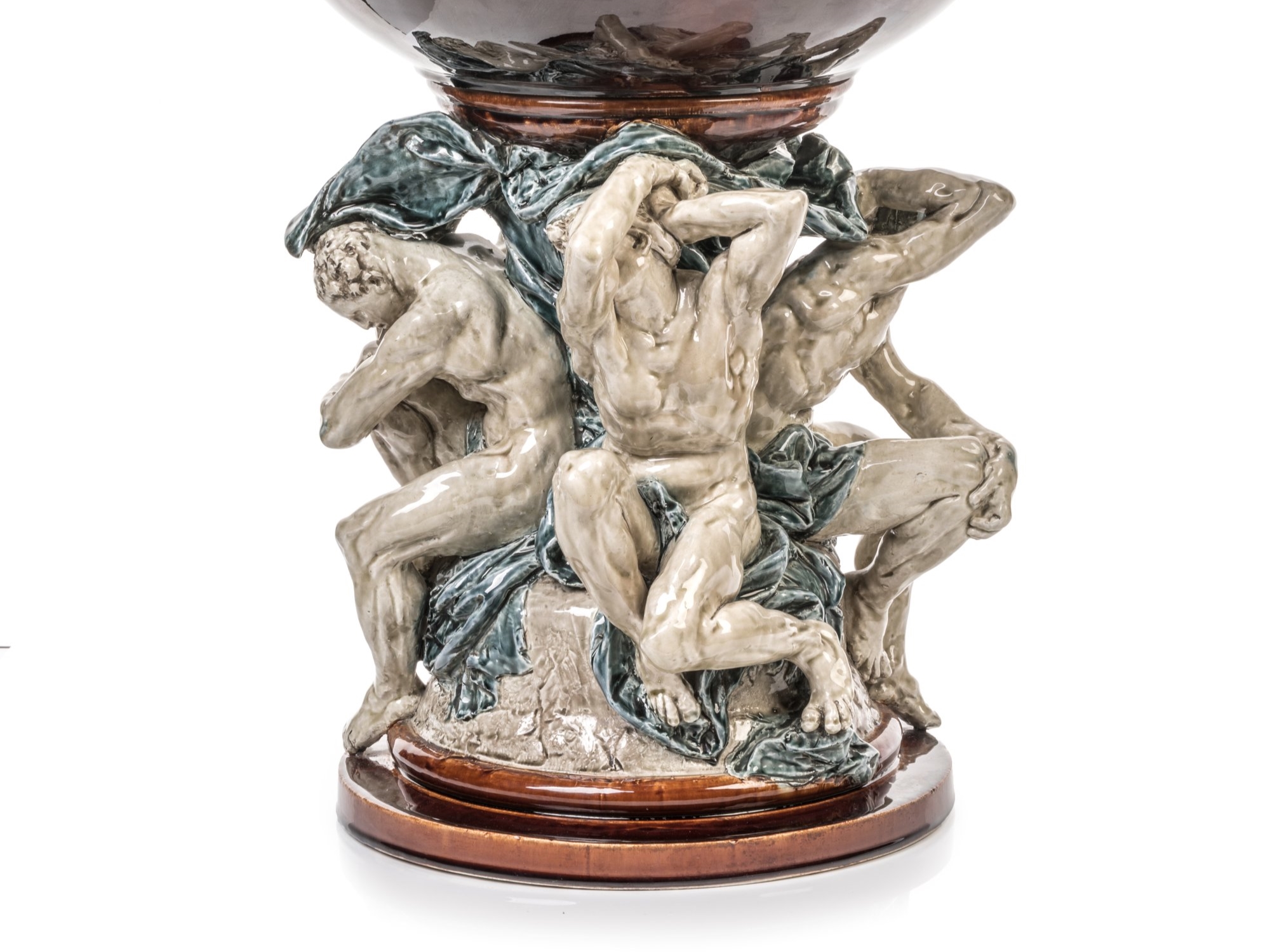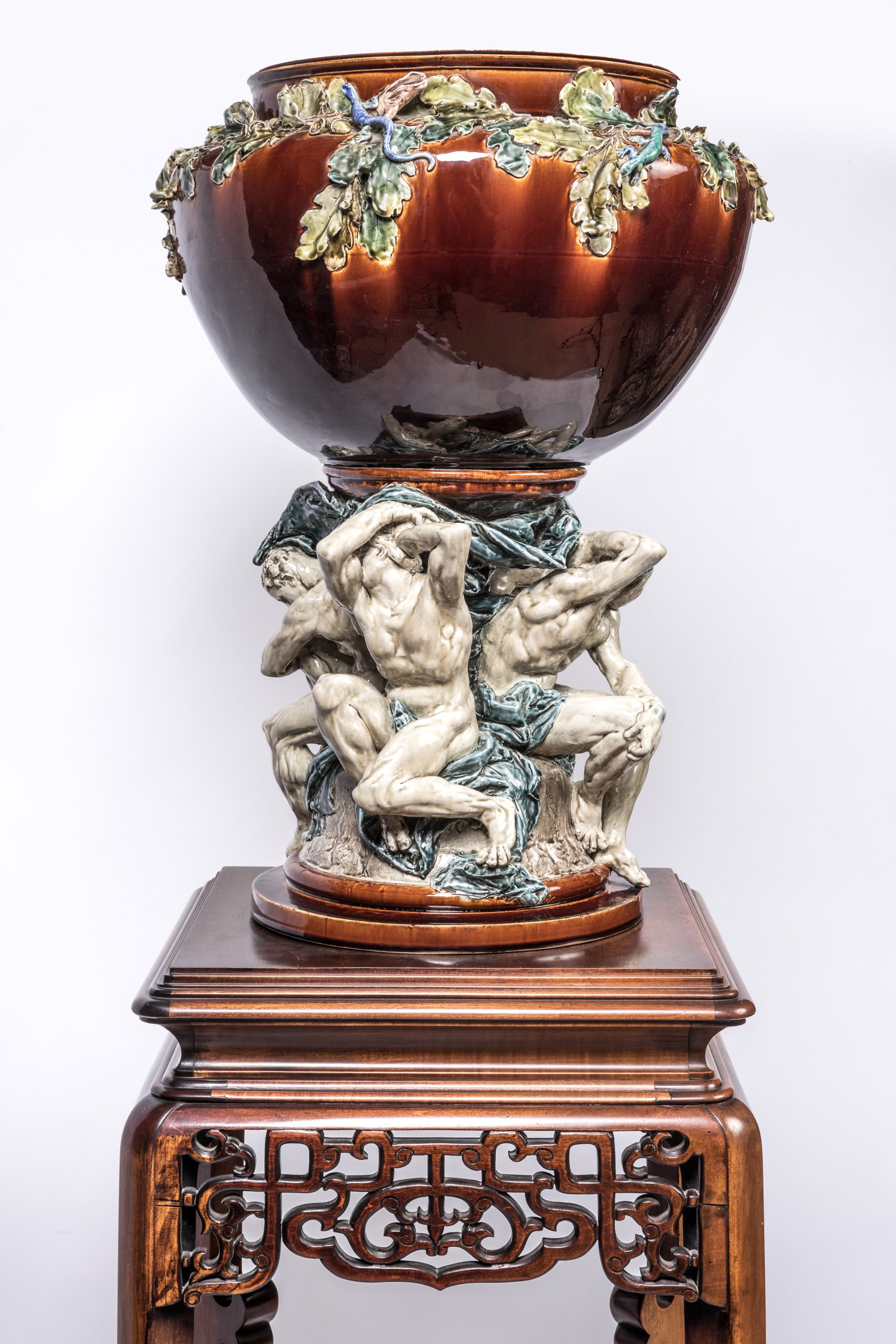 One of only six known versions of the "Vase of the Titans" by Auguste Rodin and Albert-Ernest Carrier-Belleuse depicting four Titans supporting an urn decorated with reptiles playing in oak branches. Glazed polychrome terracotta.
