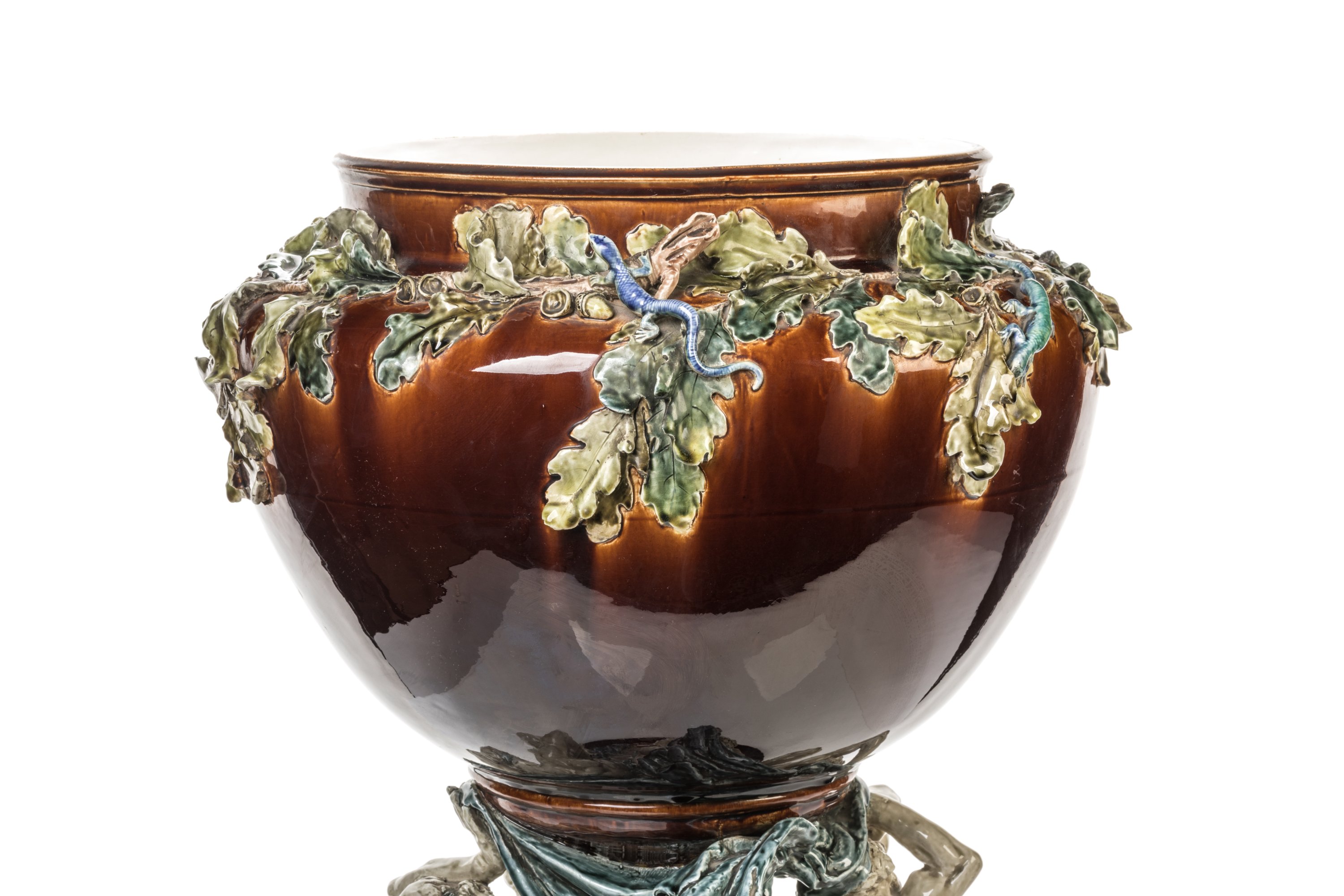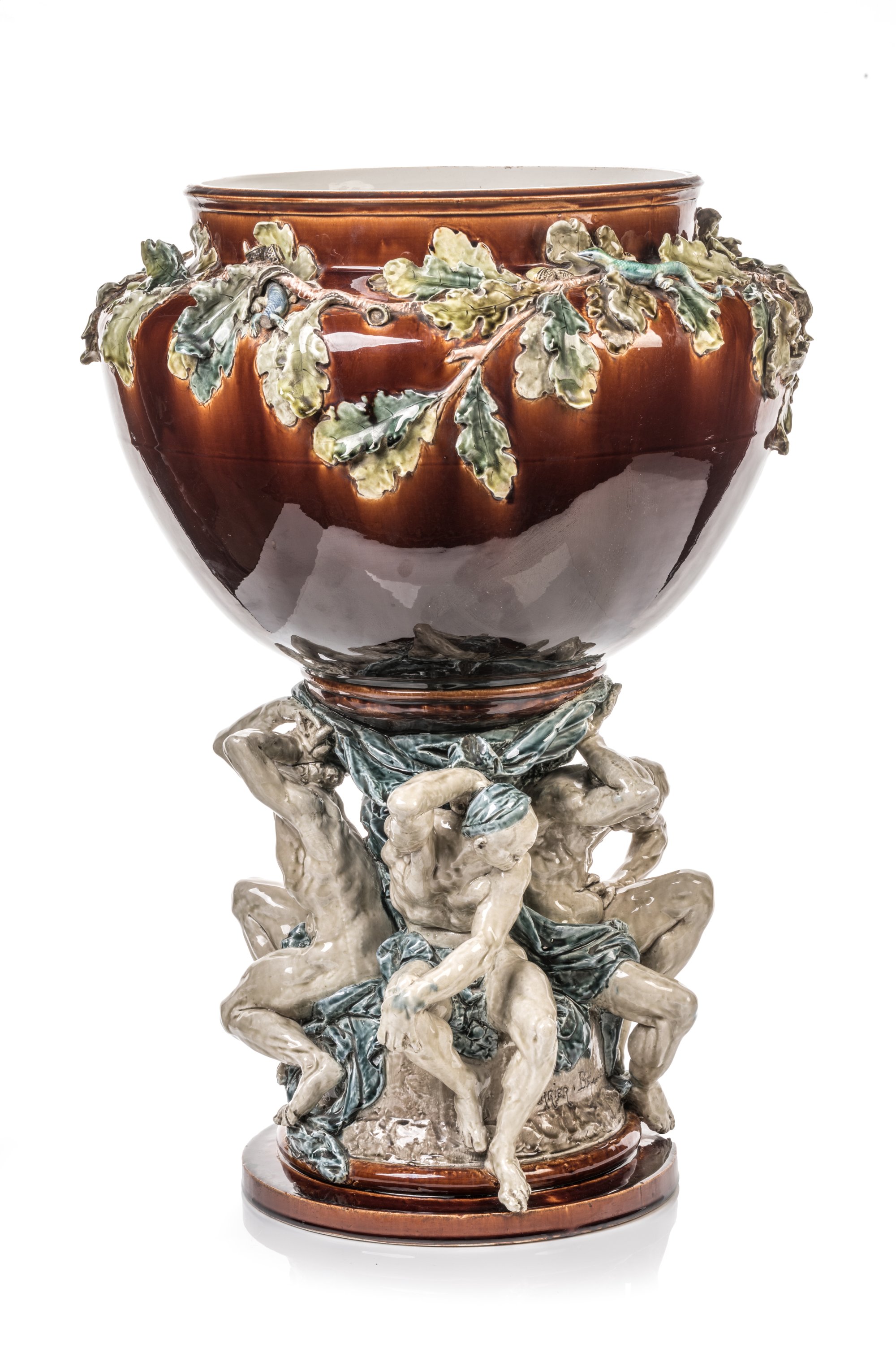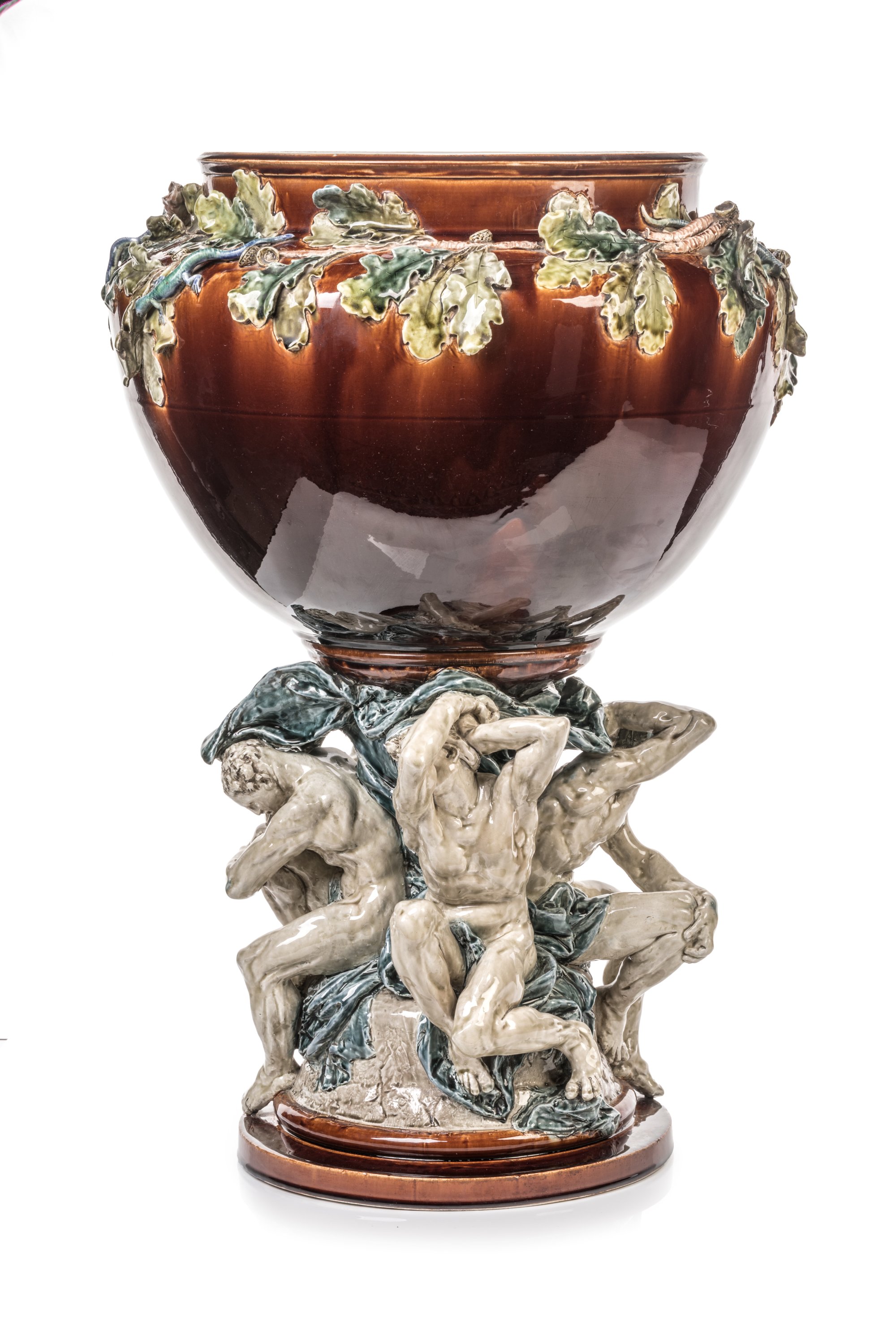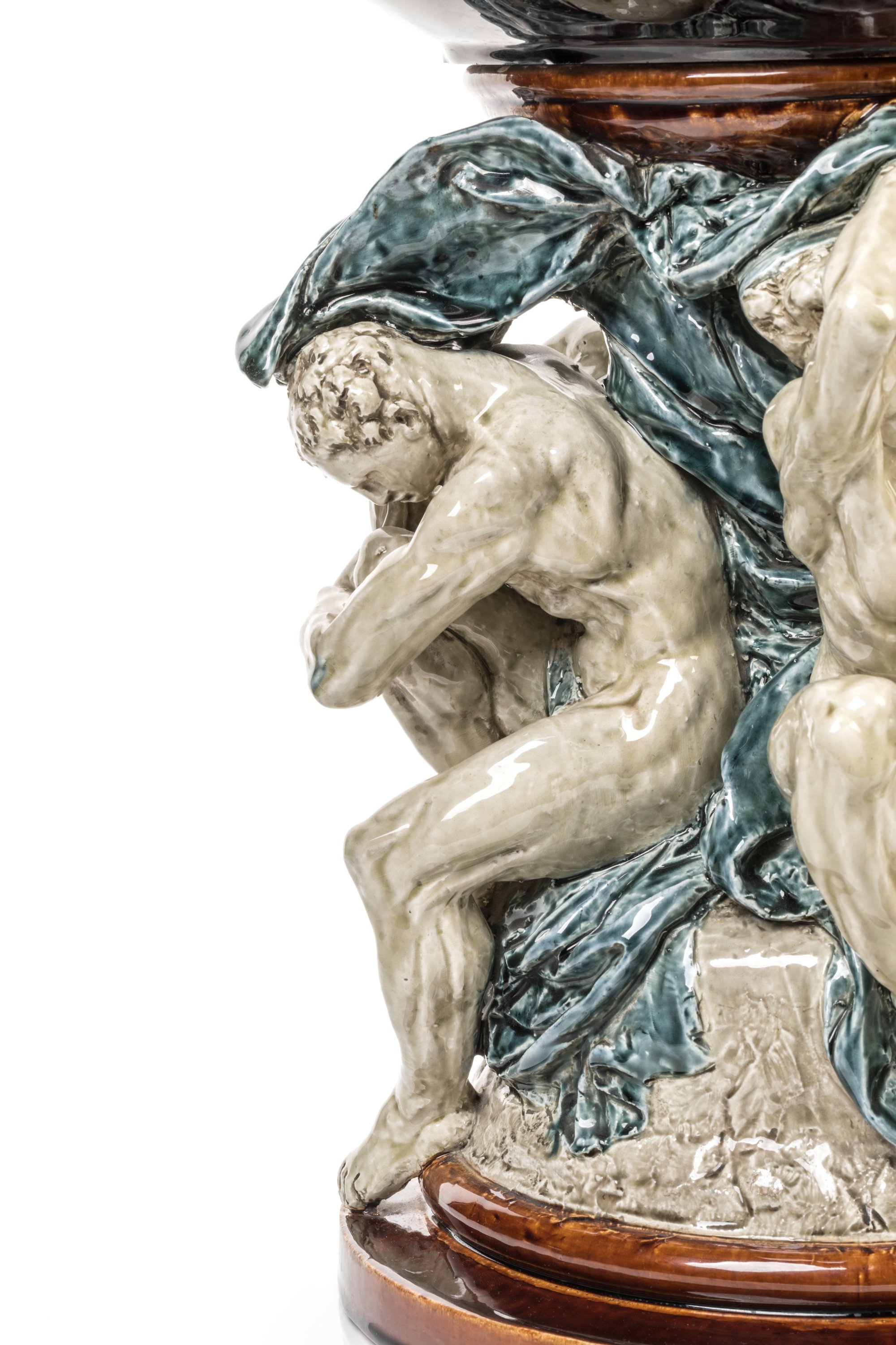 One of only six known versions of the "Vase of the Titans" by Auguste Rodin and Albert-Ernest Carrier-Belleuse depicting four Titans supporting an urn decorated with reptiles playing in oak branches. Glazed polychrome terracotta.