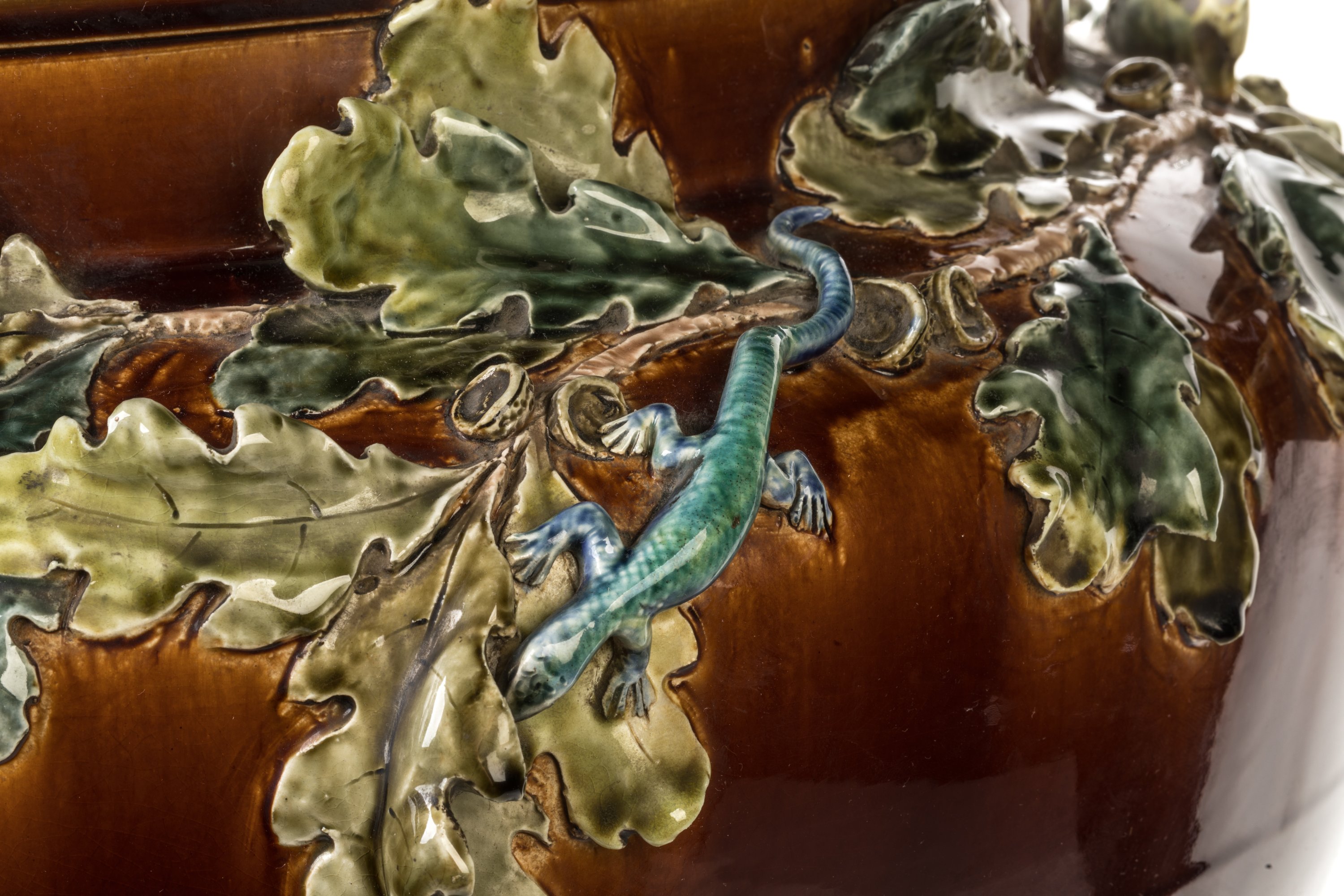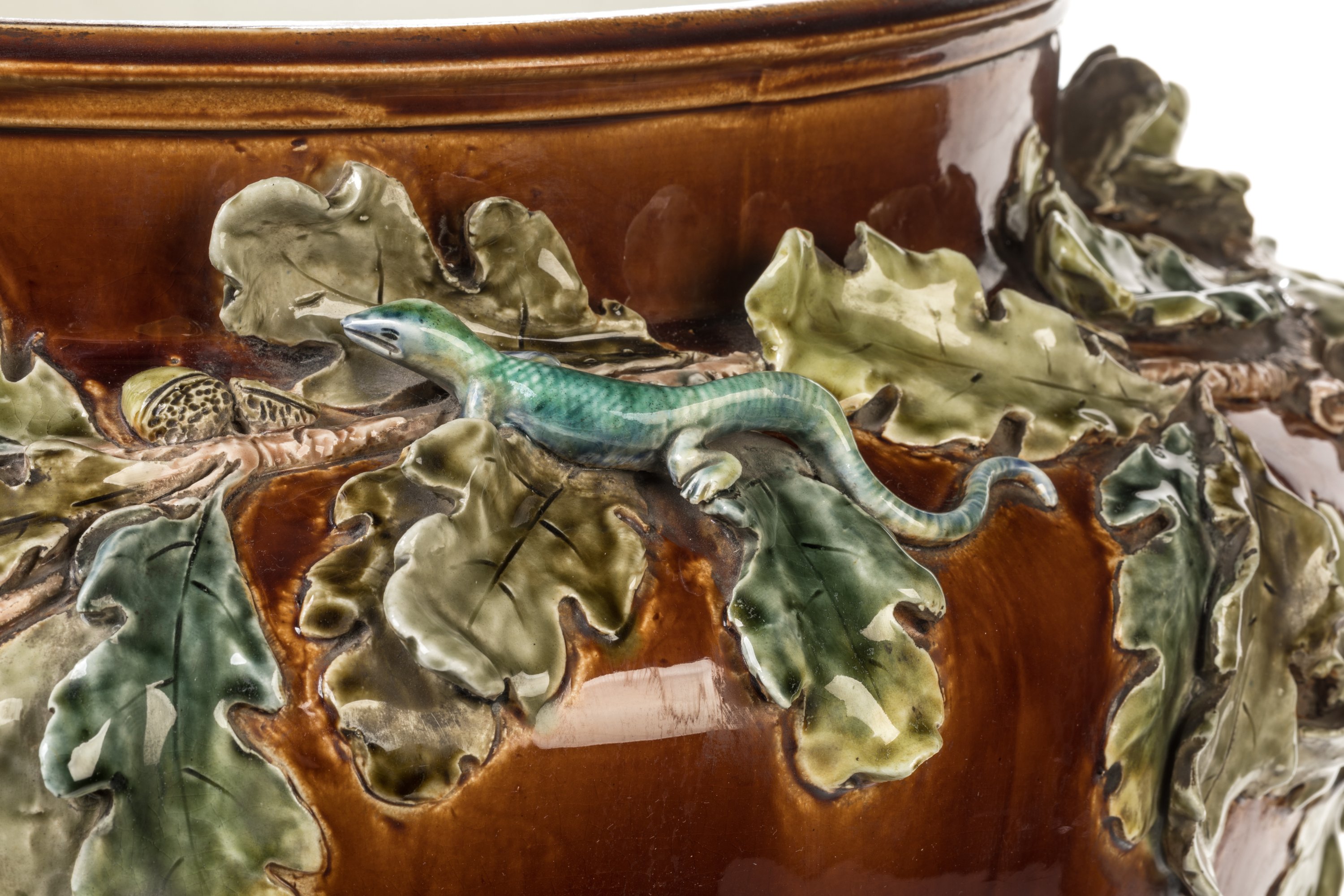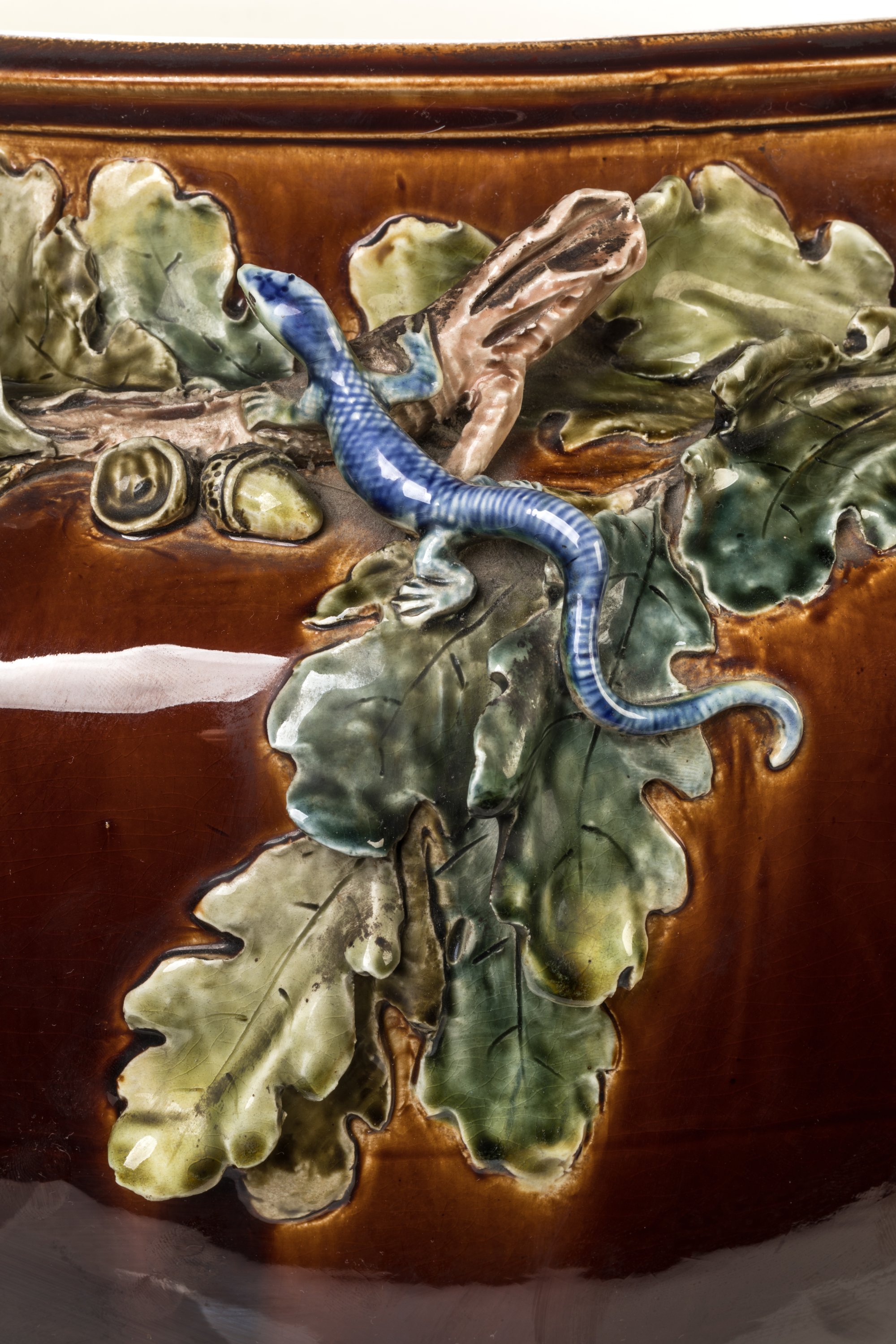 La vasque aux lézards en faïence émaillée chocolat irisé à décor en applique de quatre reptiles jouant dans des branches, feuilles et glands de chêne.