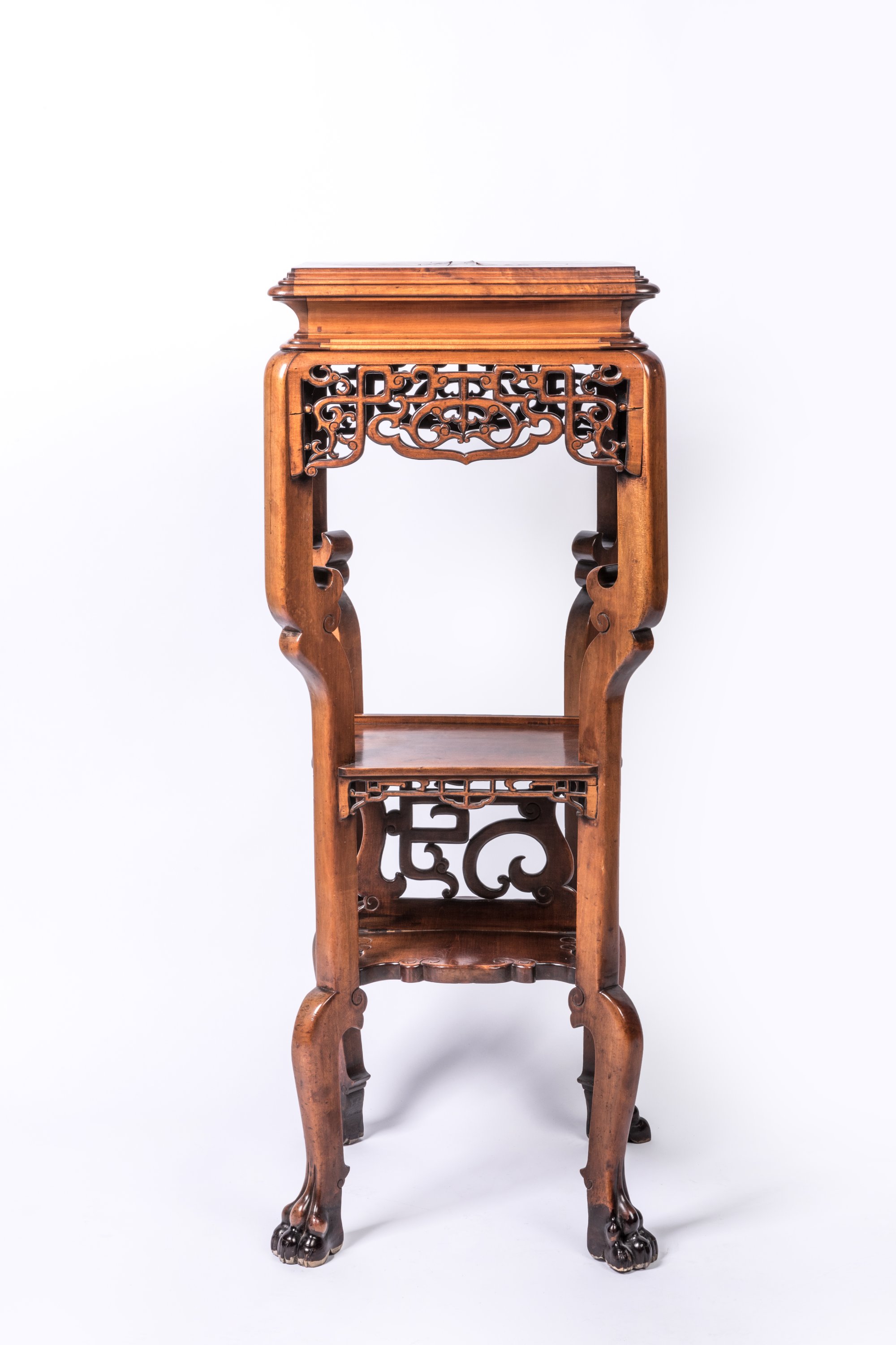 Joint: Sellette japonisante en bois à tablettes reposant sur quatre pieds en griffe, dans le goût de Gabriel Viardot. Haut. 120 Larg. 46 Prof. 46 cm.