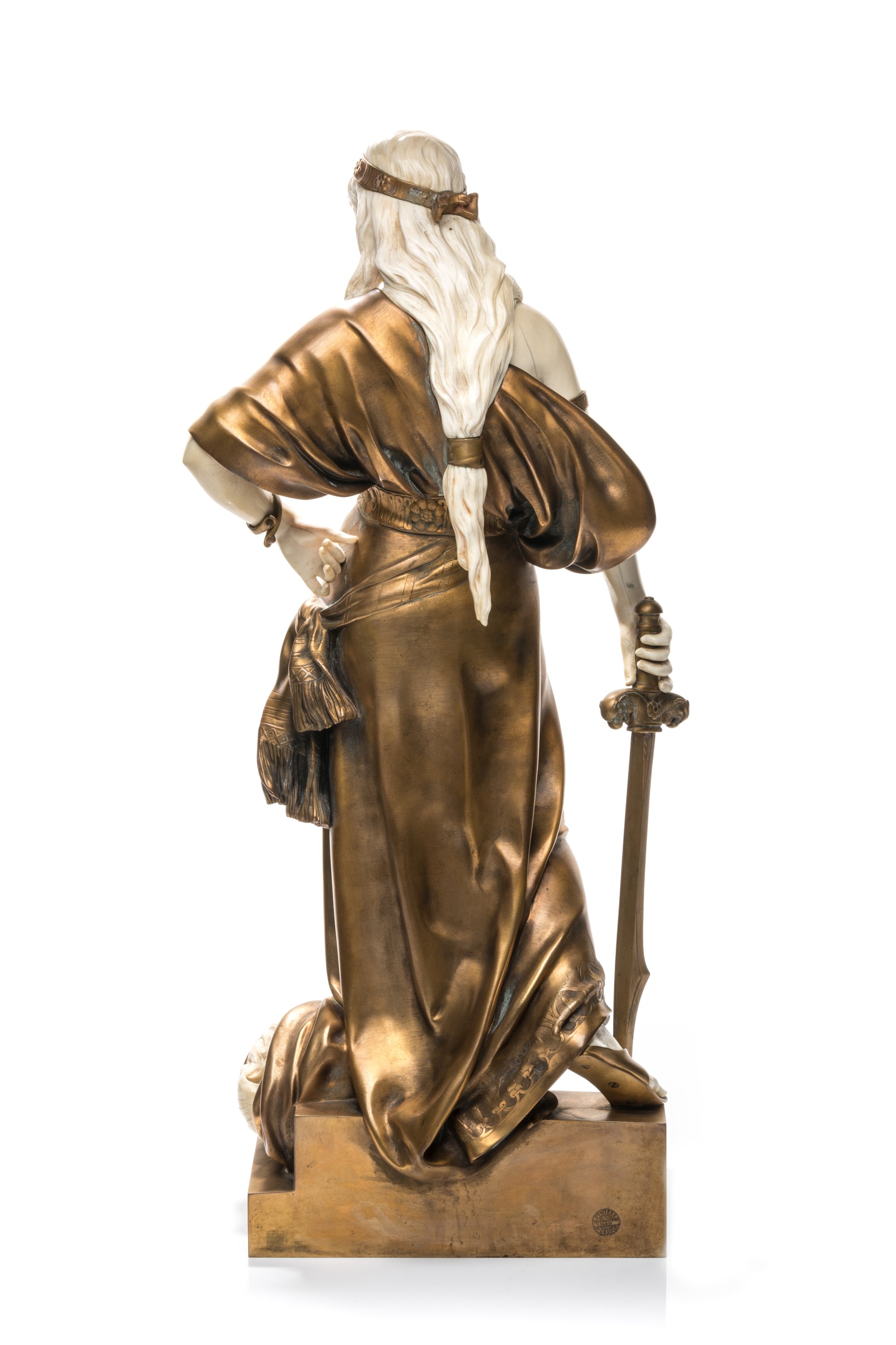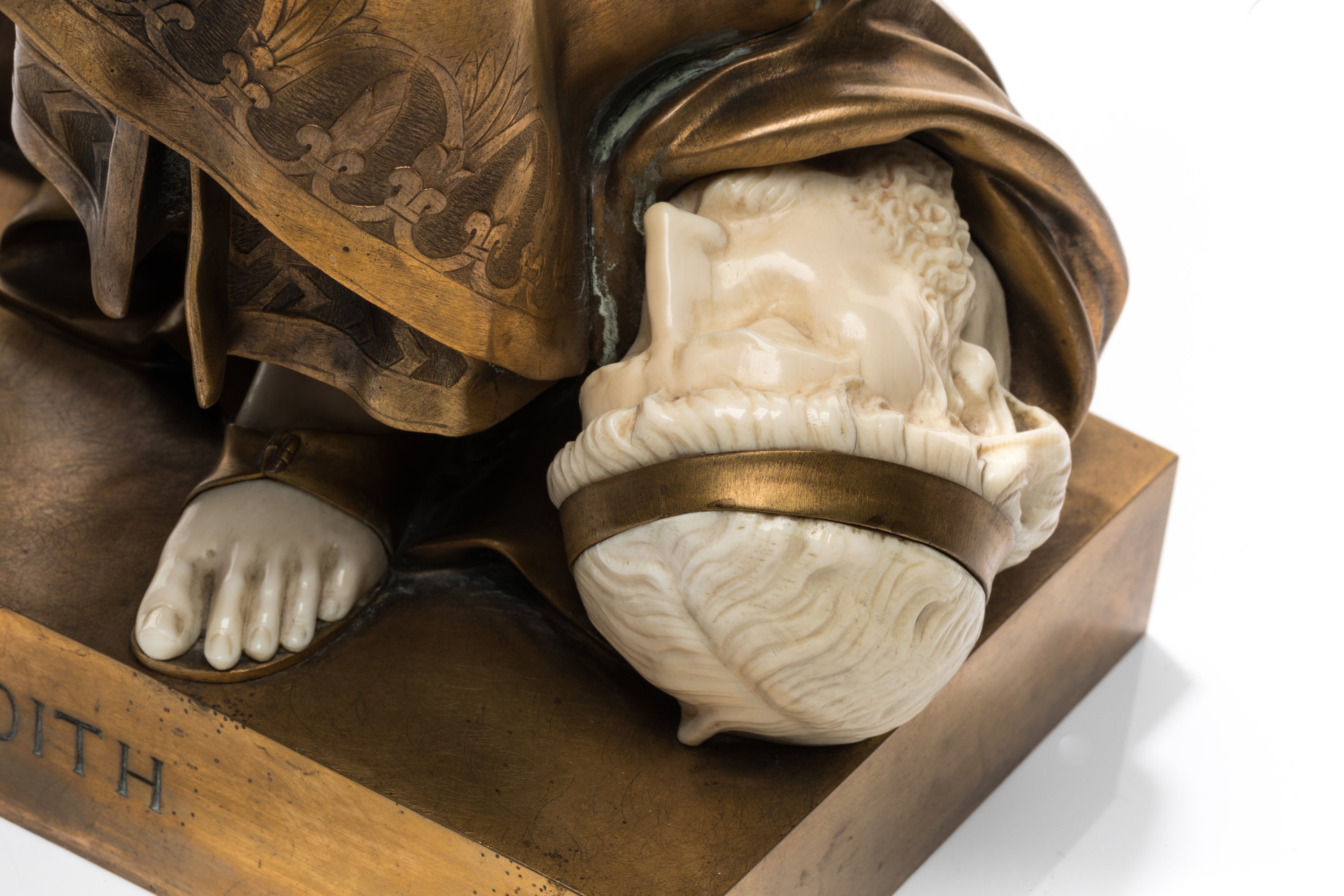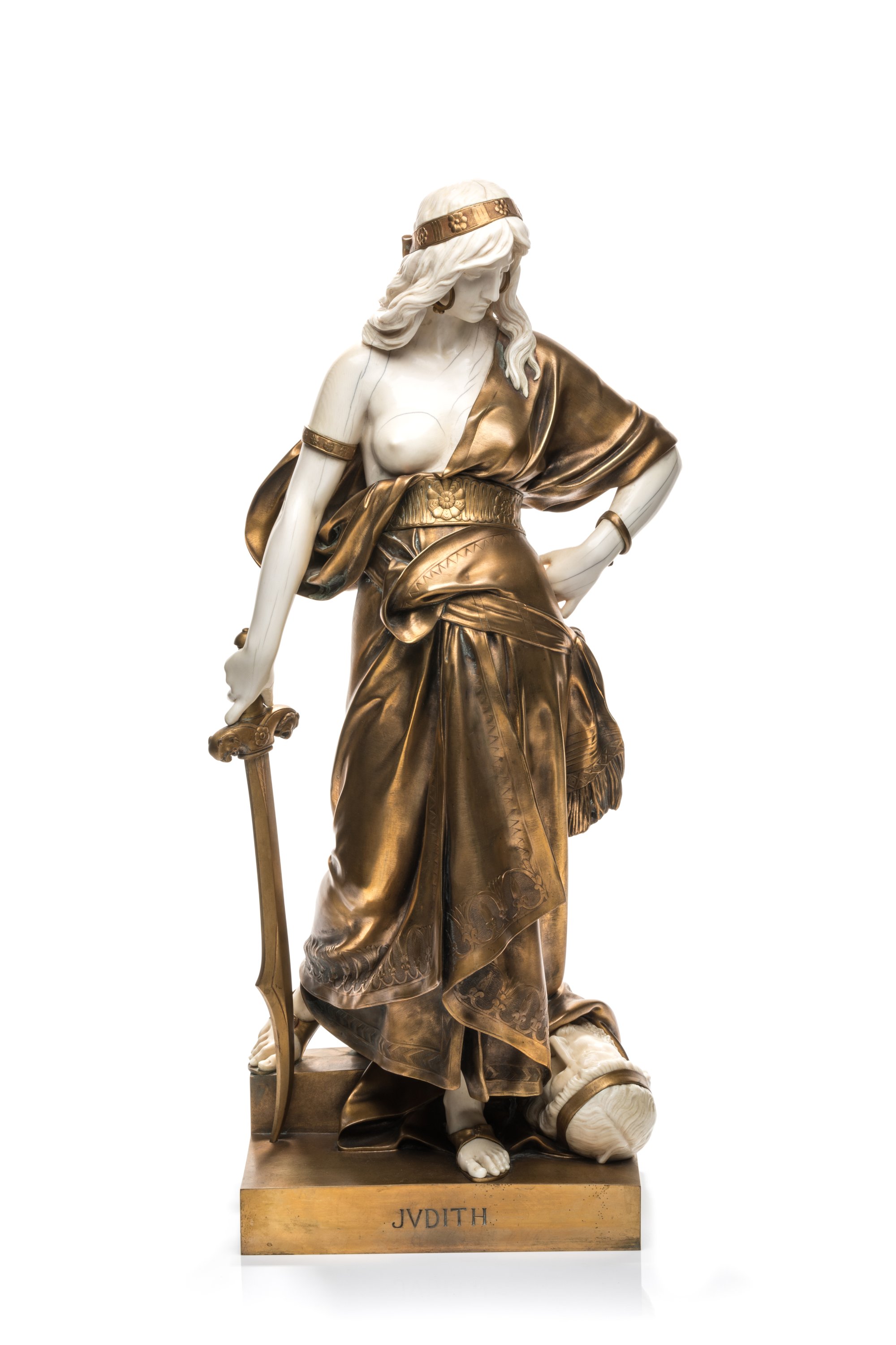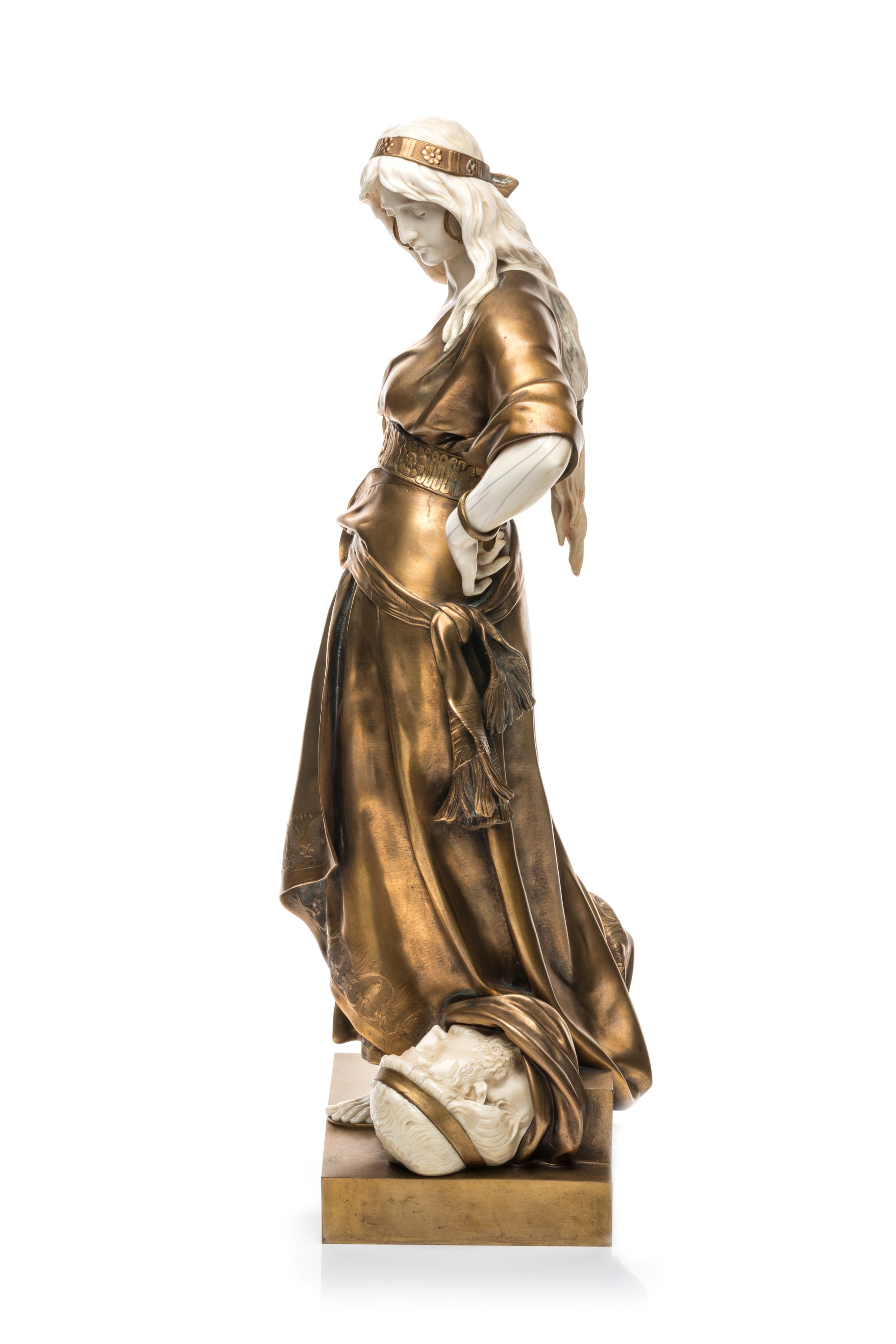 A ca. 1900 ivory and gilded bronze sculpture of Judith by Eugène Antoine Aizelin. Signed.