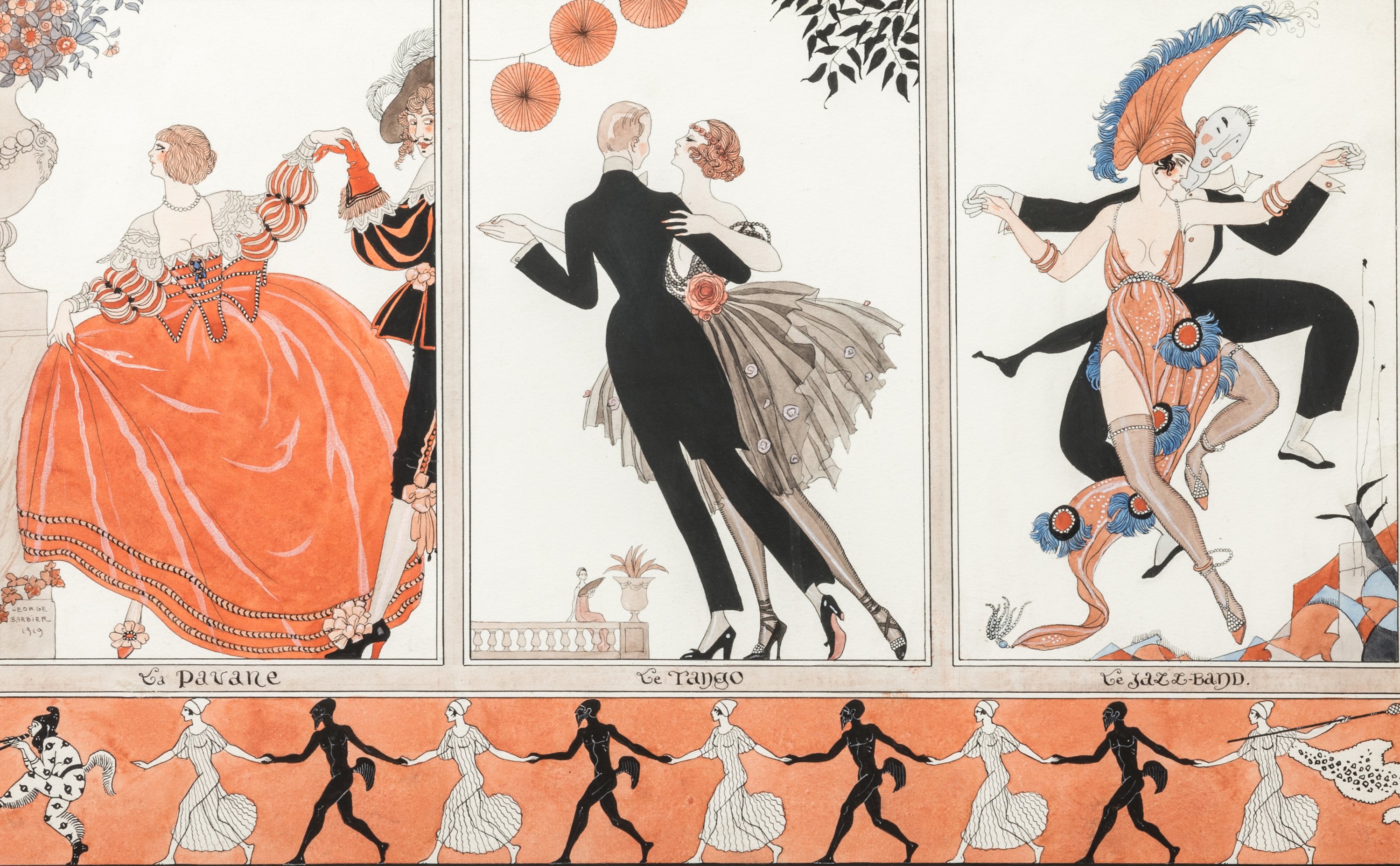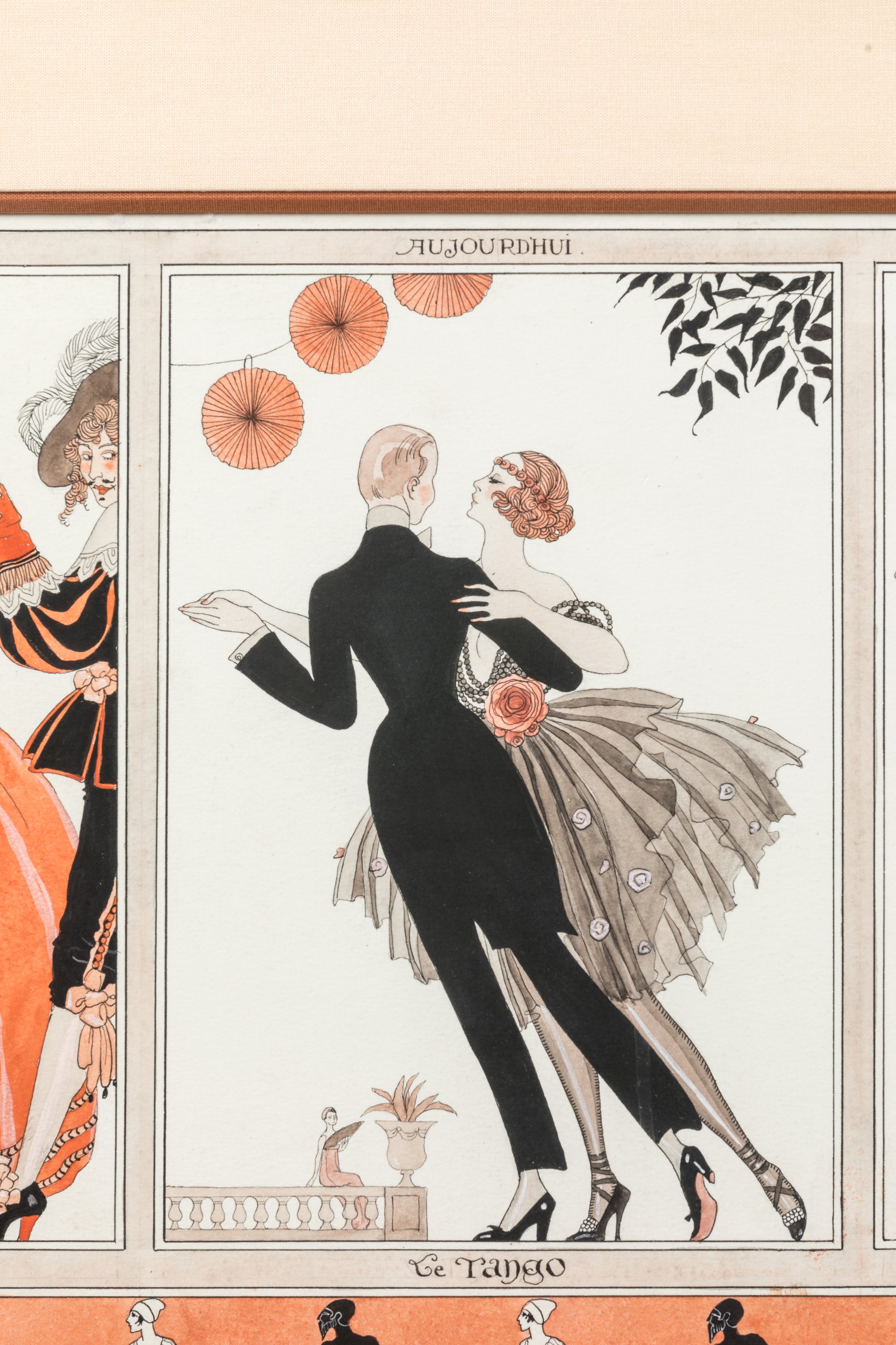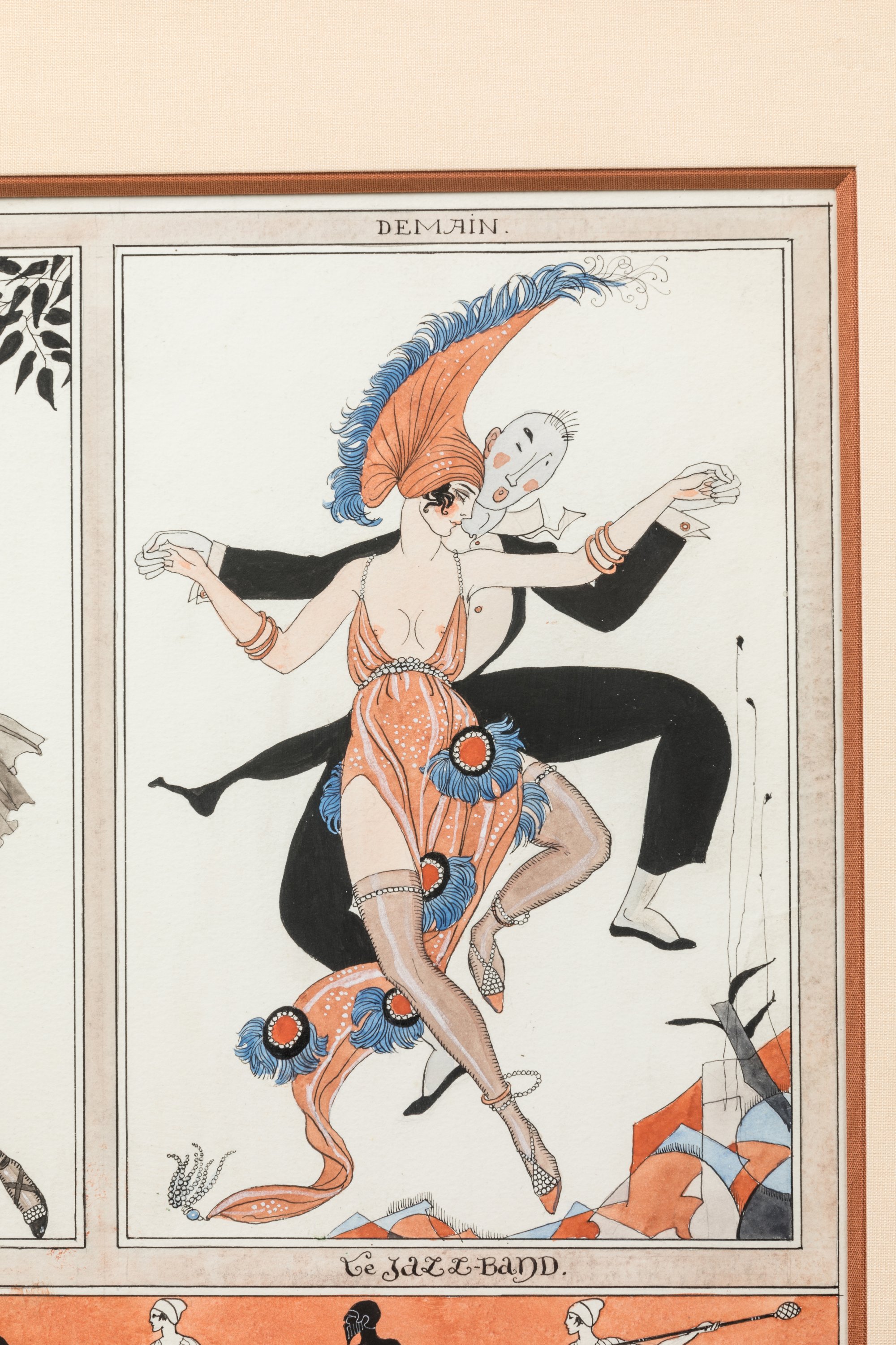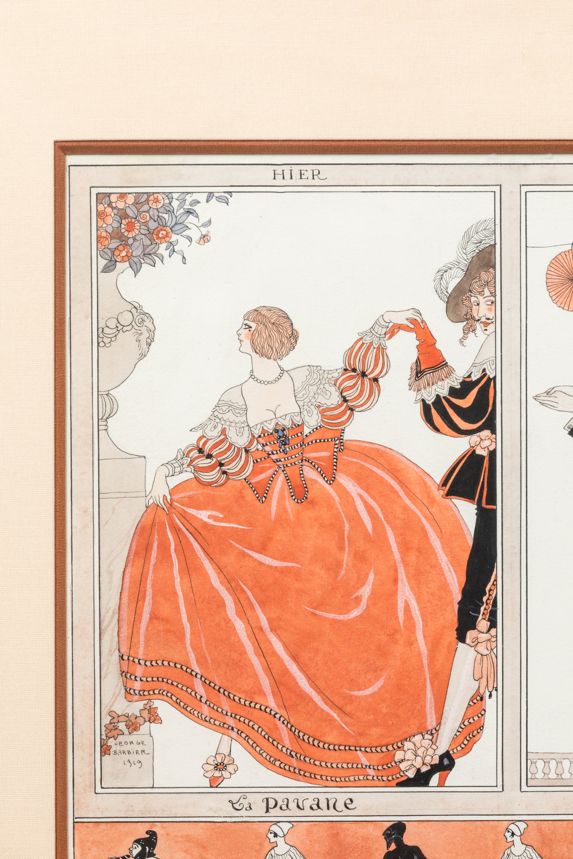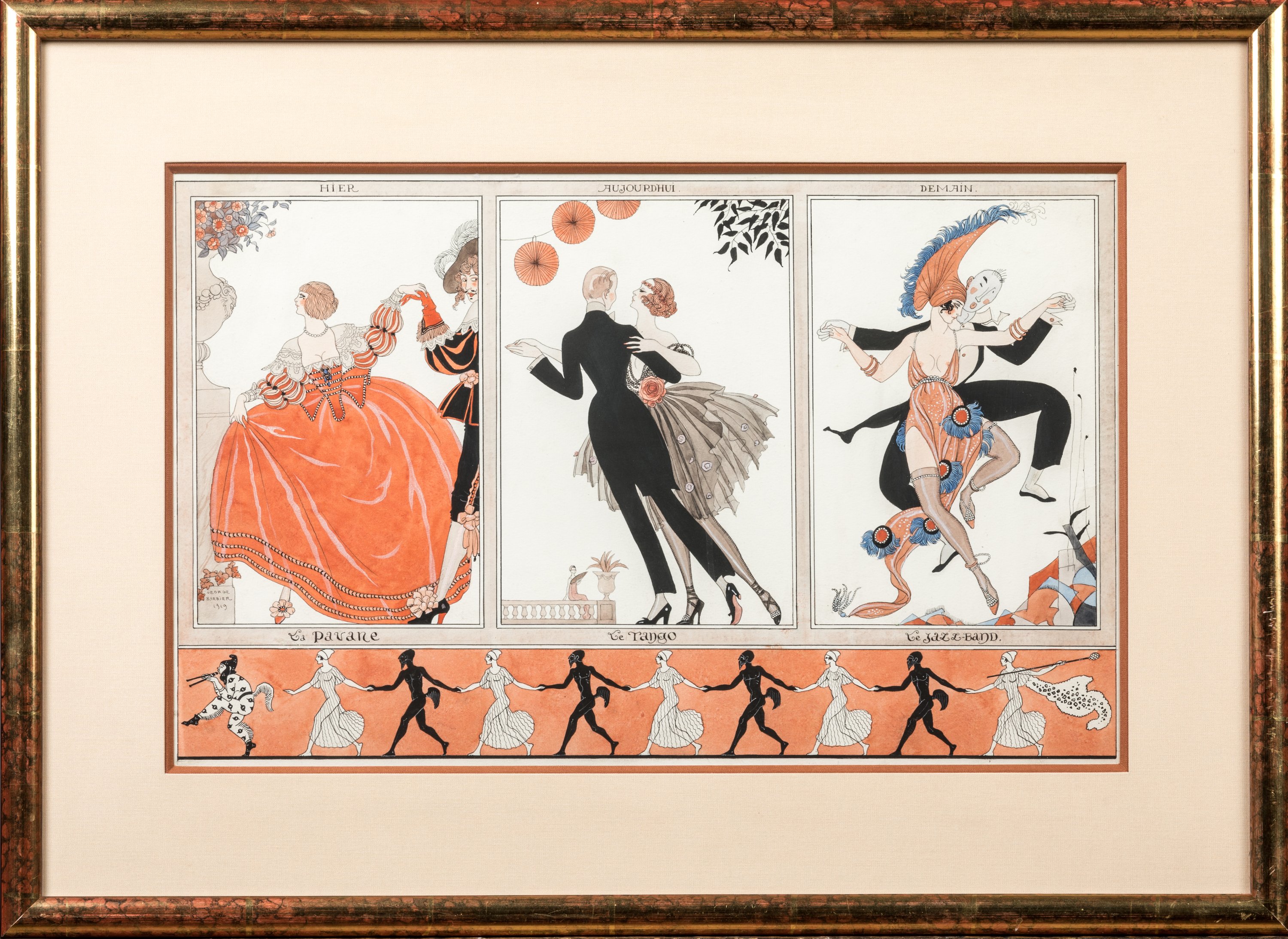A 1919 watercolor and black ink painting by George Barbier entitled "Yesterday, Today and Tomorrow". Signed and dated.