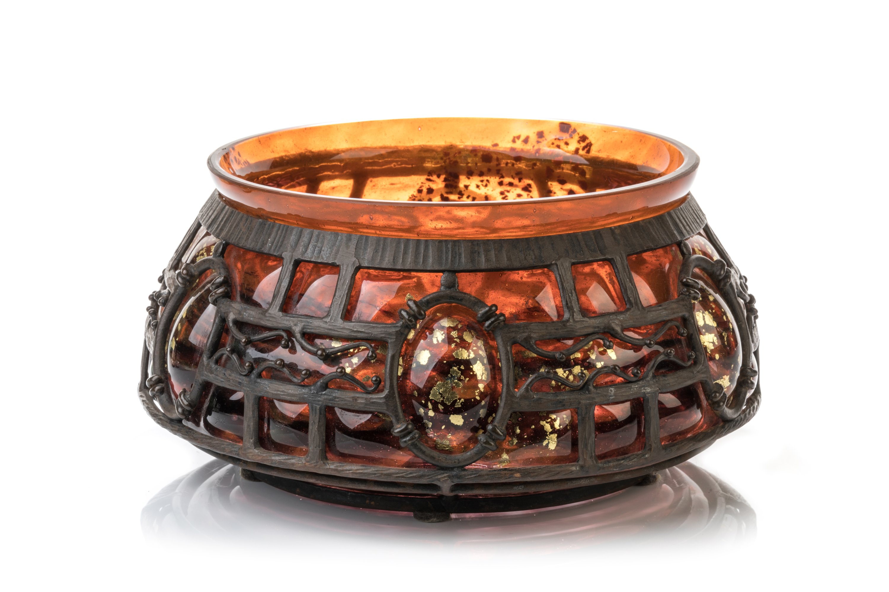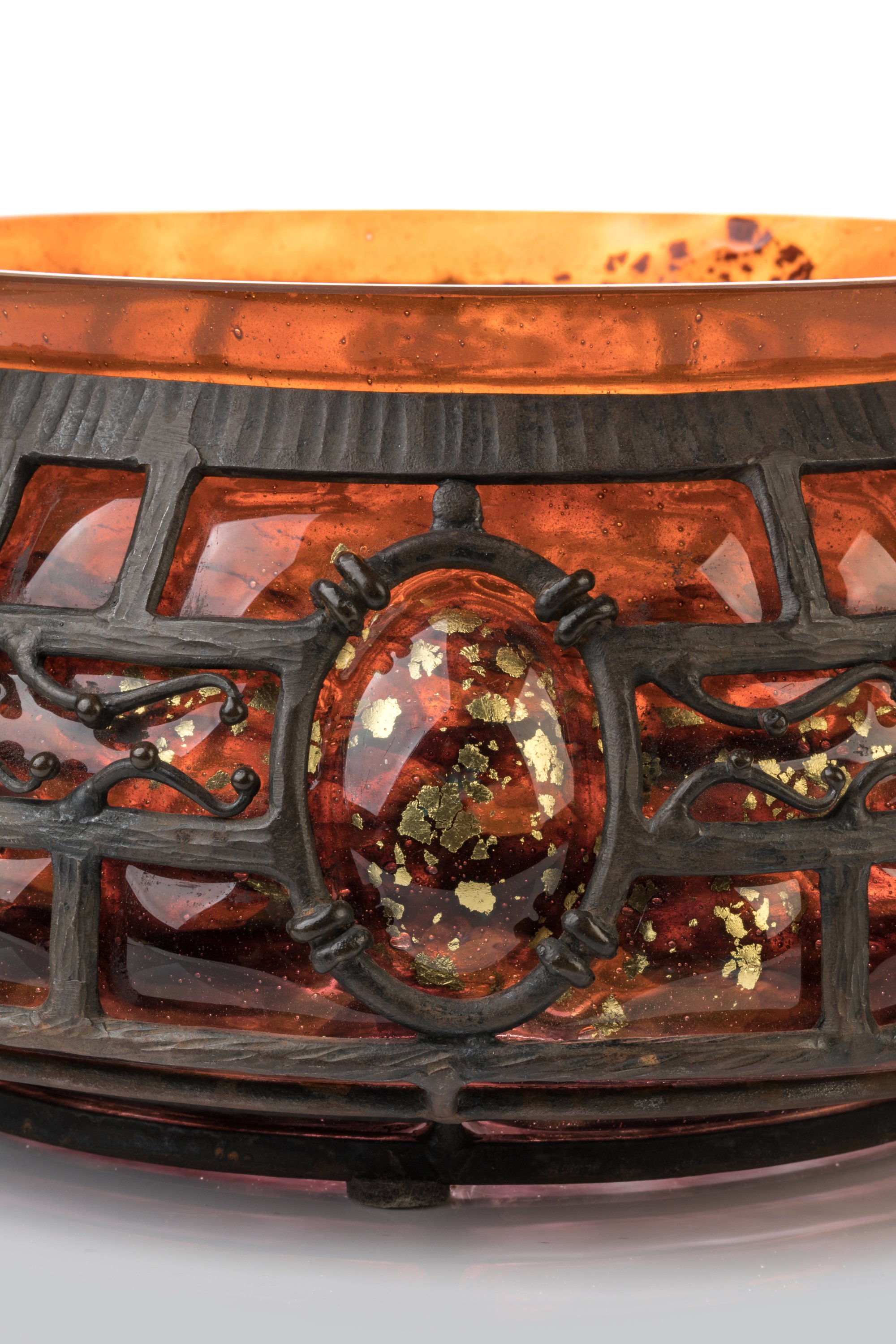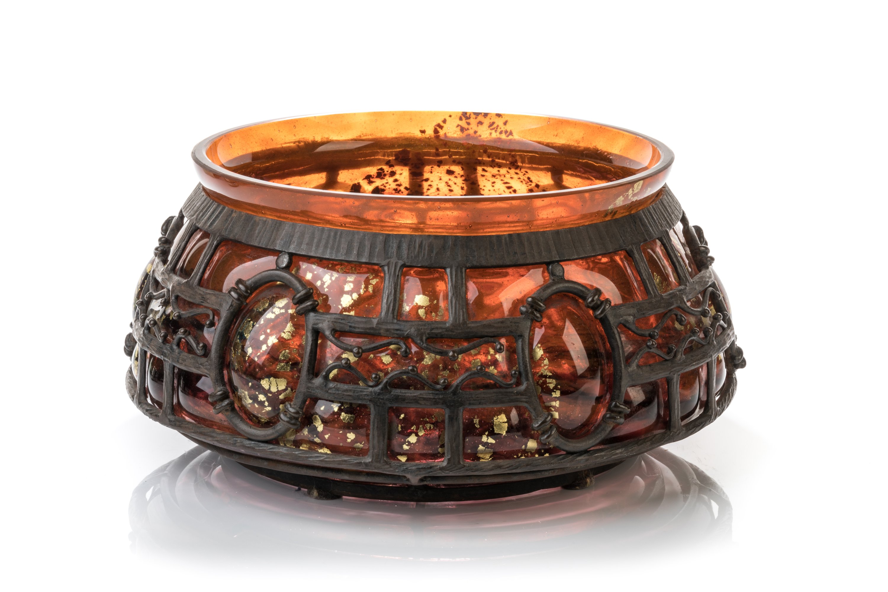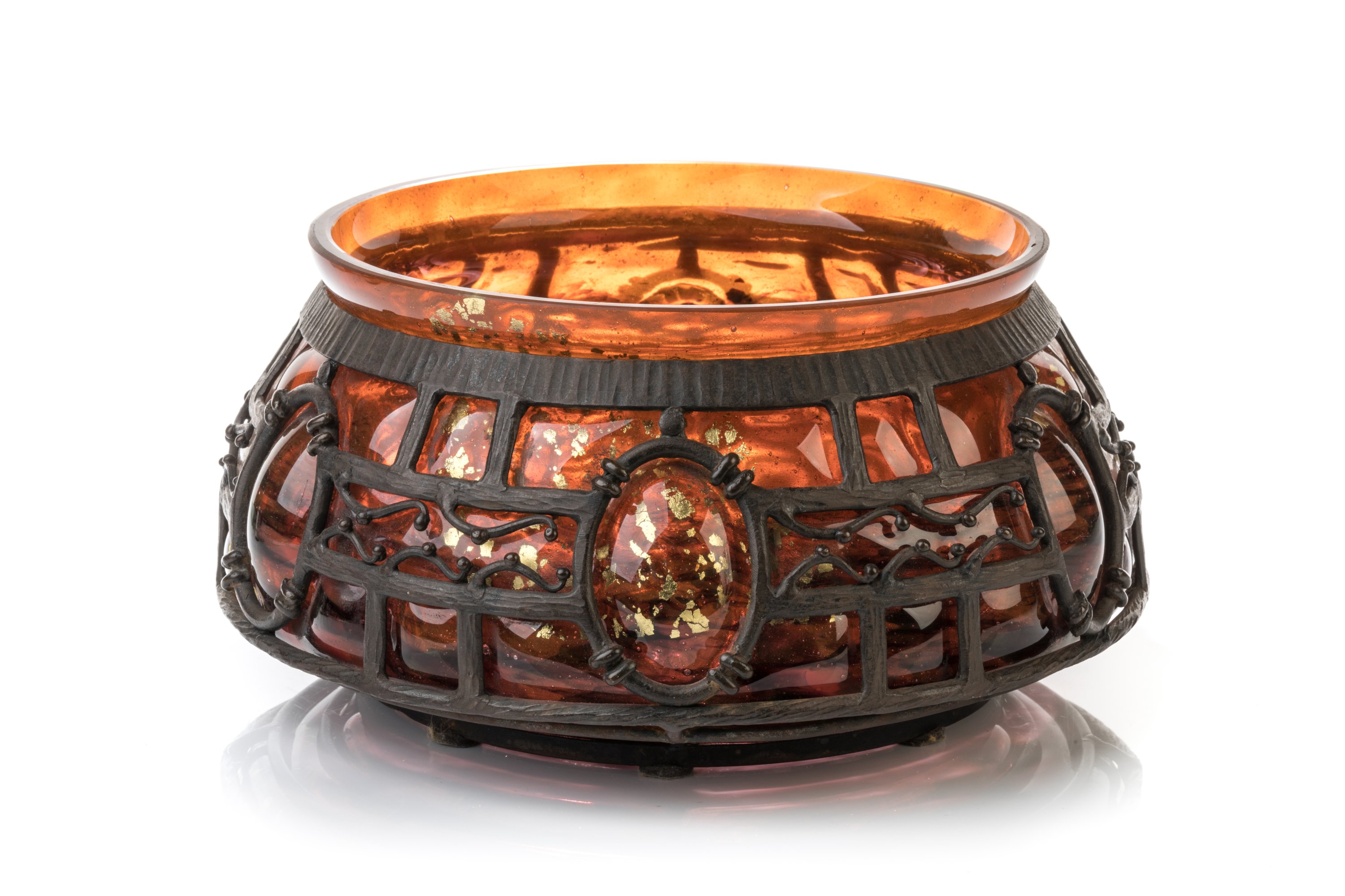 A large ca. 1920 Daum round bowl in a Majorelle iron mount. Signed Daum Nancy and L. Majorelle.