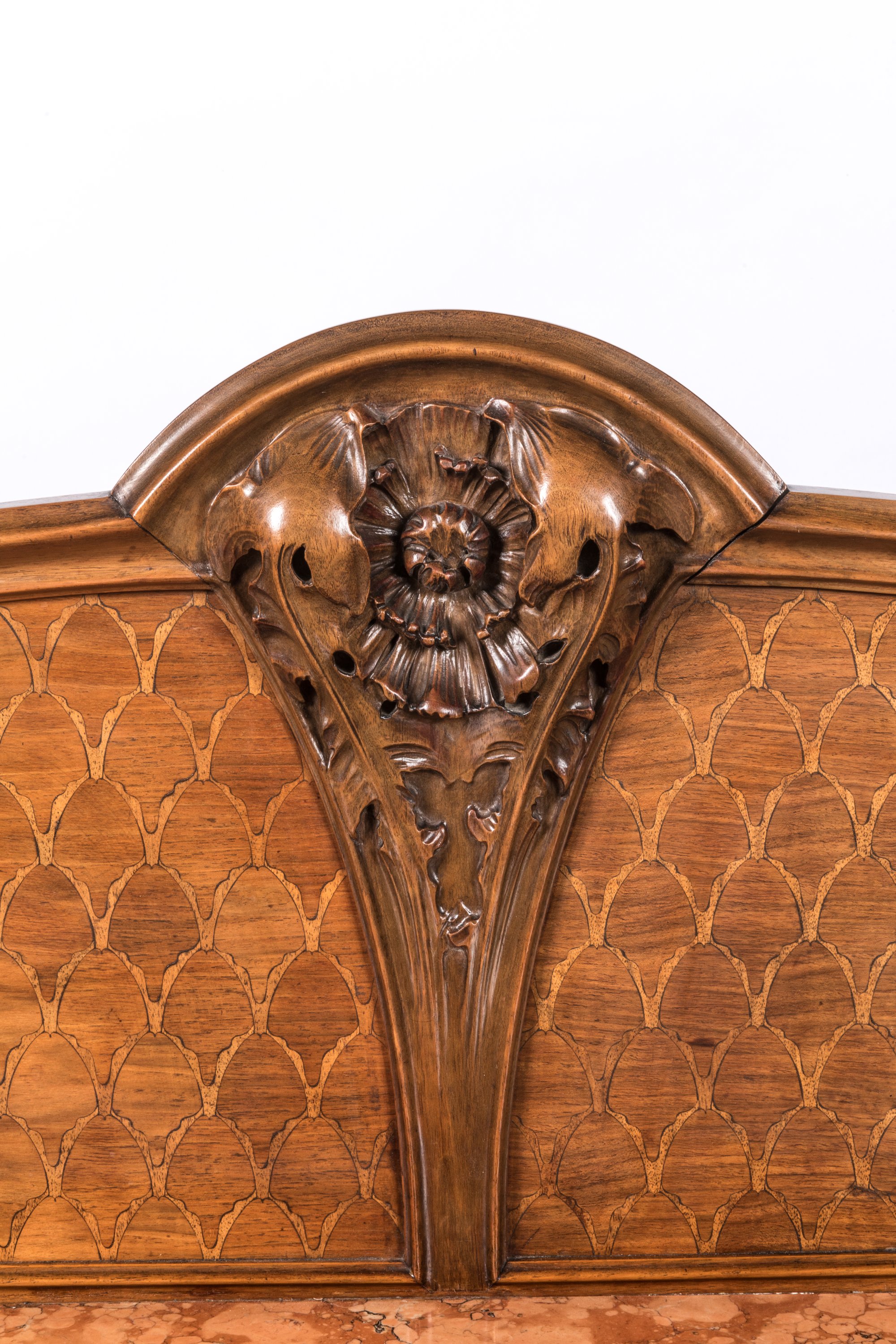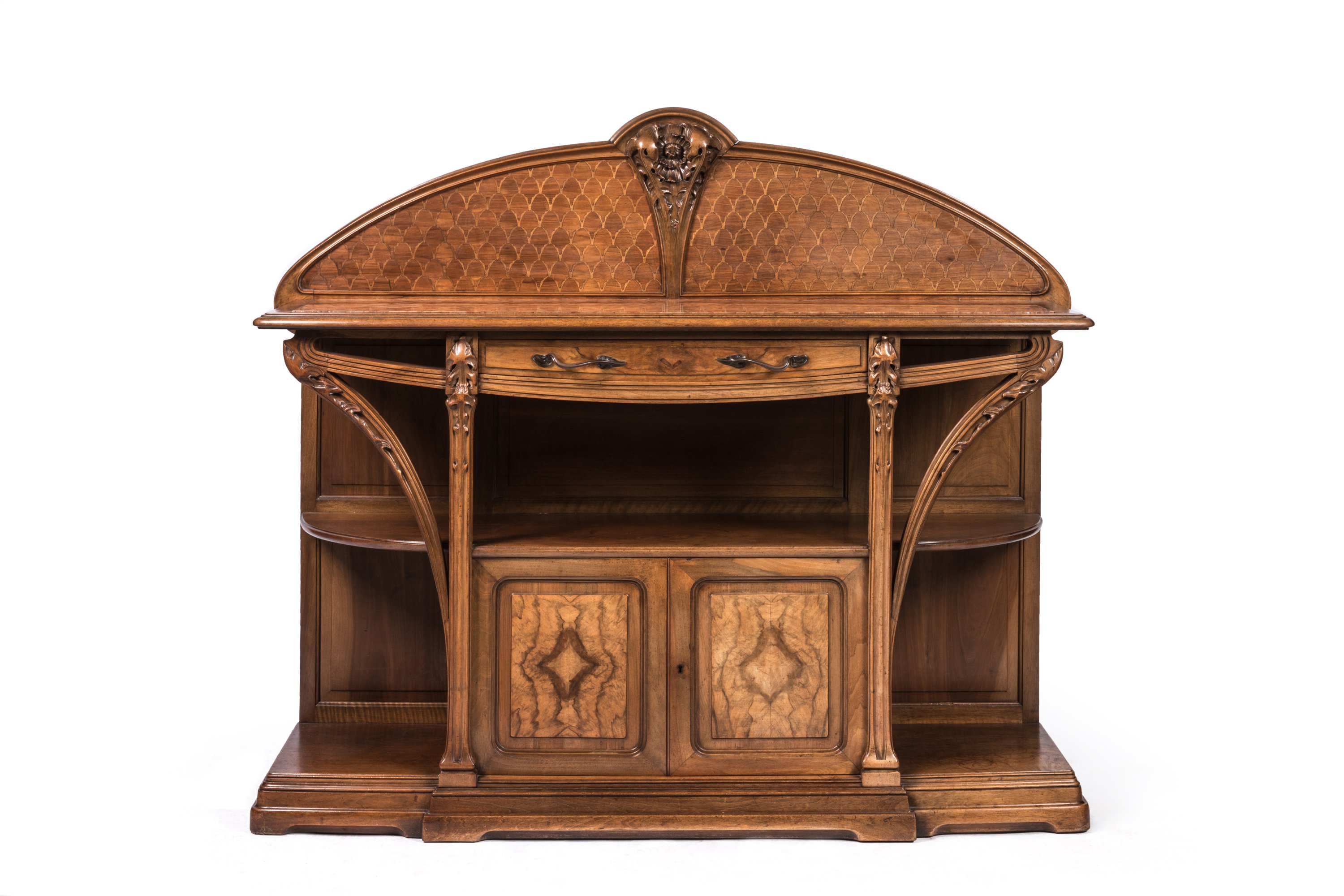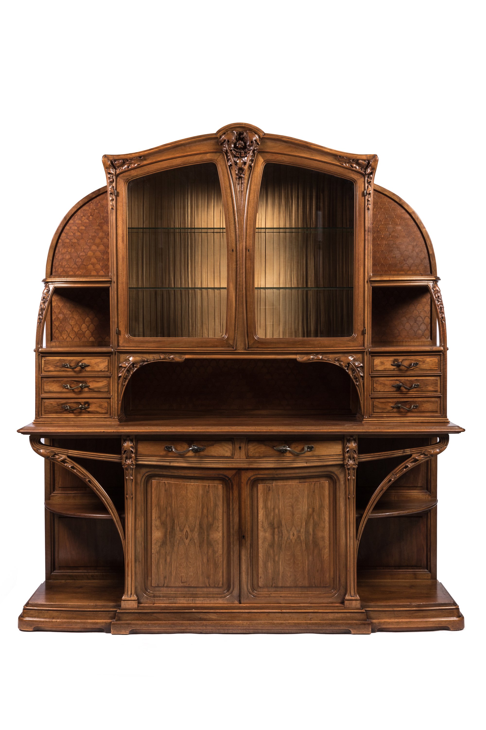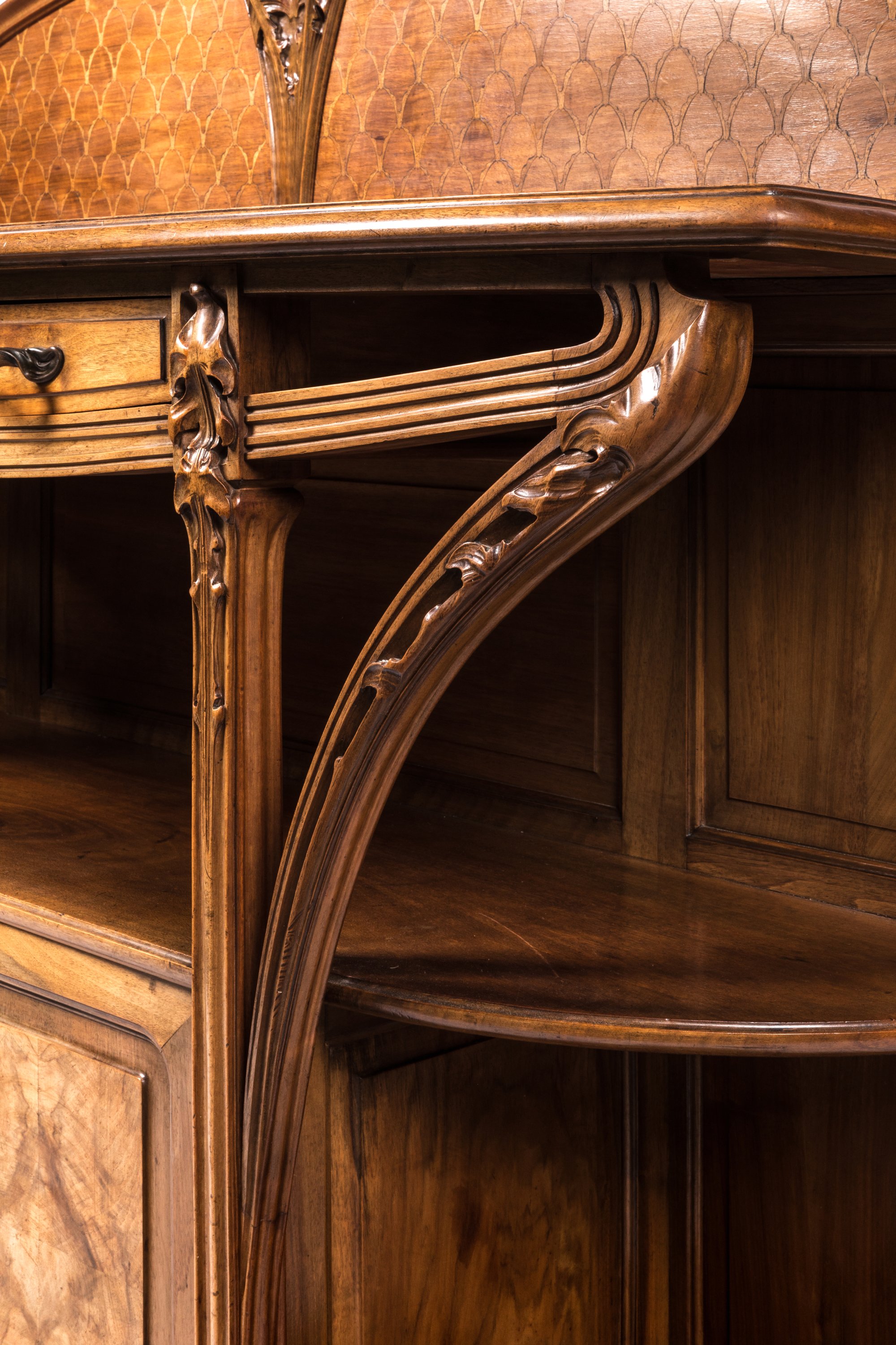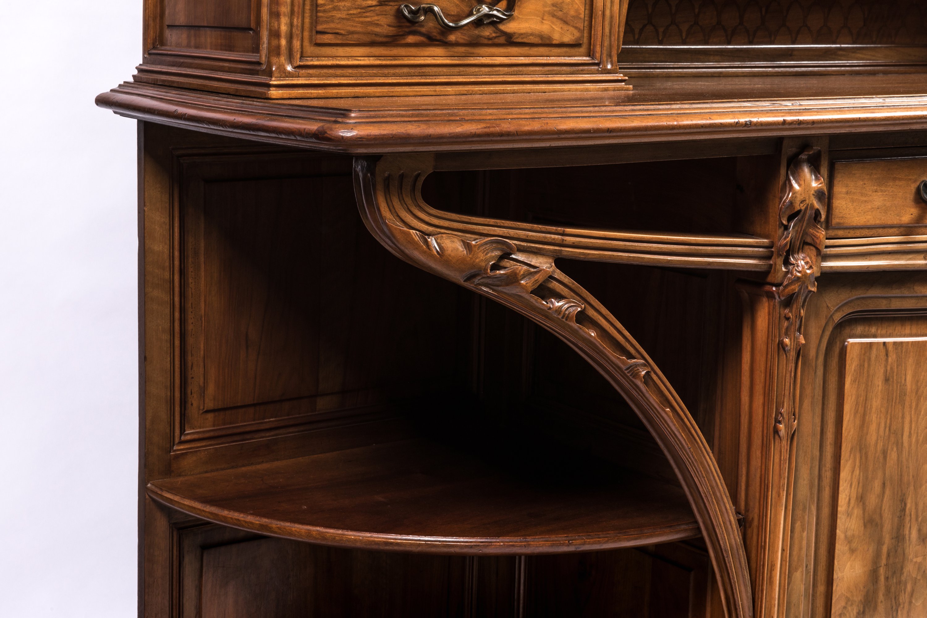 Le corps supérieur du buffet, en retrait de la partie basse, présente un caisson central soutenu par deux bras en console sculpté d’un motif de feuilles de chicorée. Il ouvre par deux portes en verre biseauté. Les côtés présentent trois tiroirs et deux tablettes latérales de forme mouvementée. La partie basse ouvre par deux vantaux enrichis d'un médaillon central en placage de noyer. Les montants sont enrichis d’une sculpture de feuille de chicorée. Les poignées de tirage en bronze suivent un modèle sinueux à motif de feuilles.