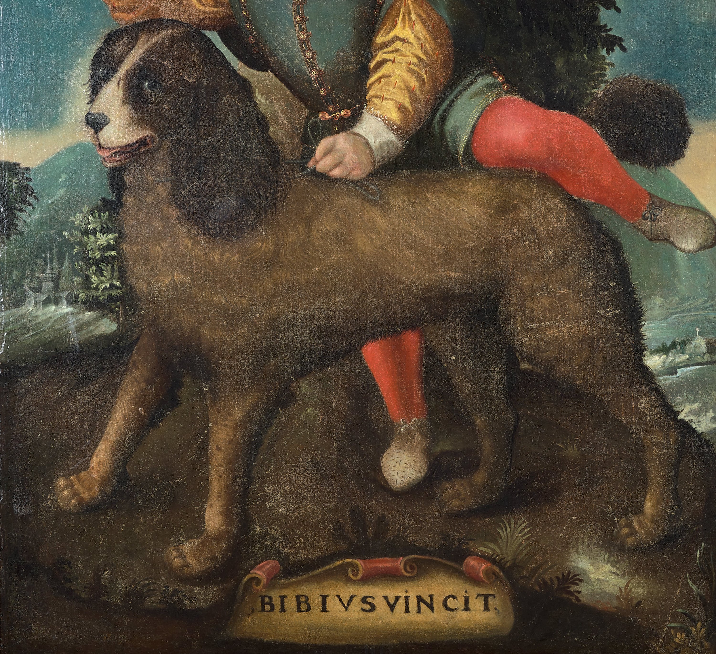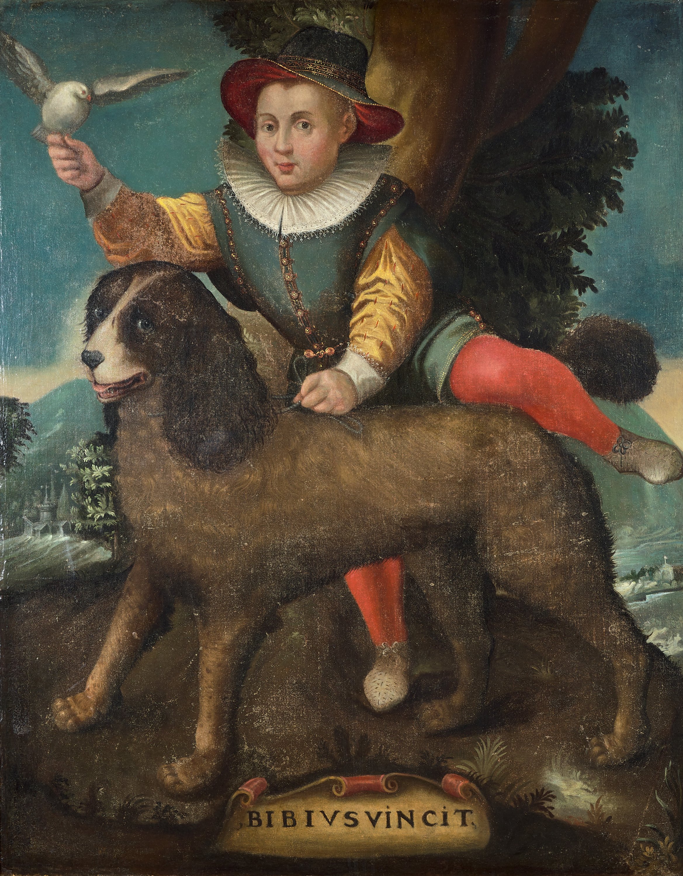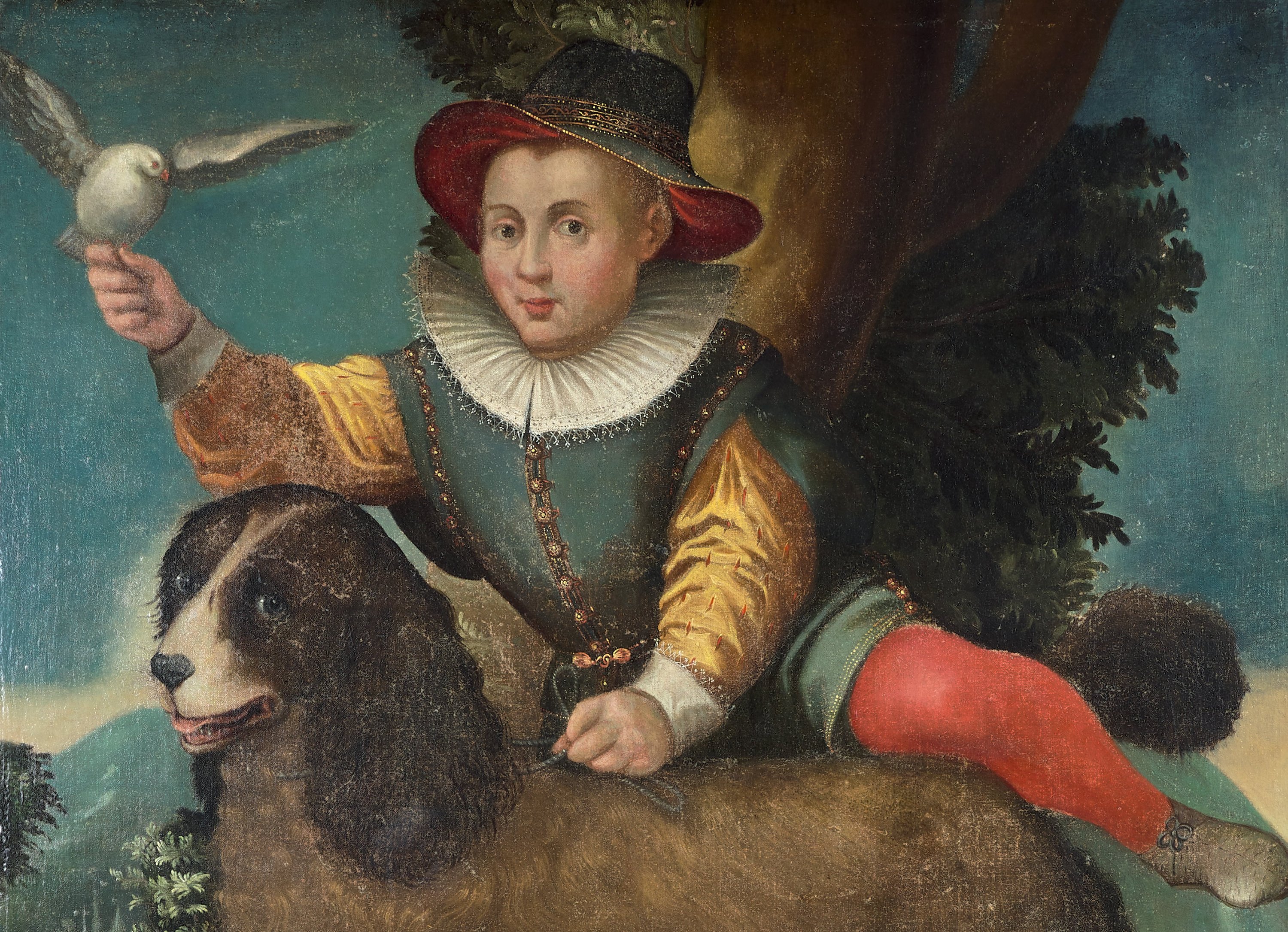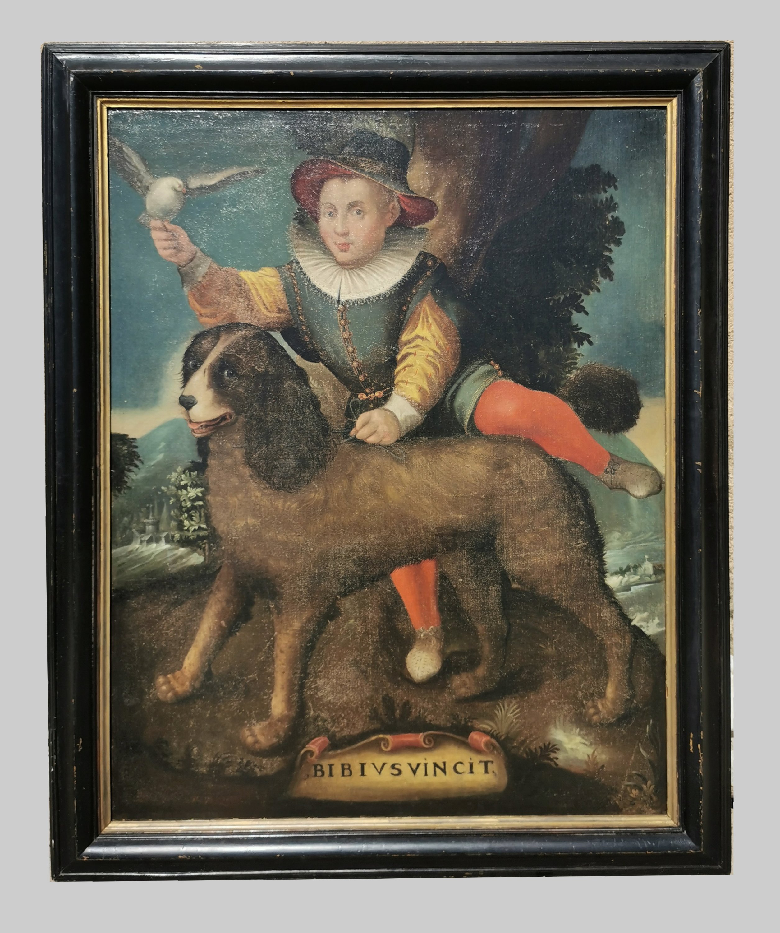 A 17th century Dutch school portrait of a child straddling a dog. Oil on canvas.