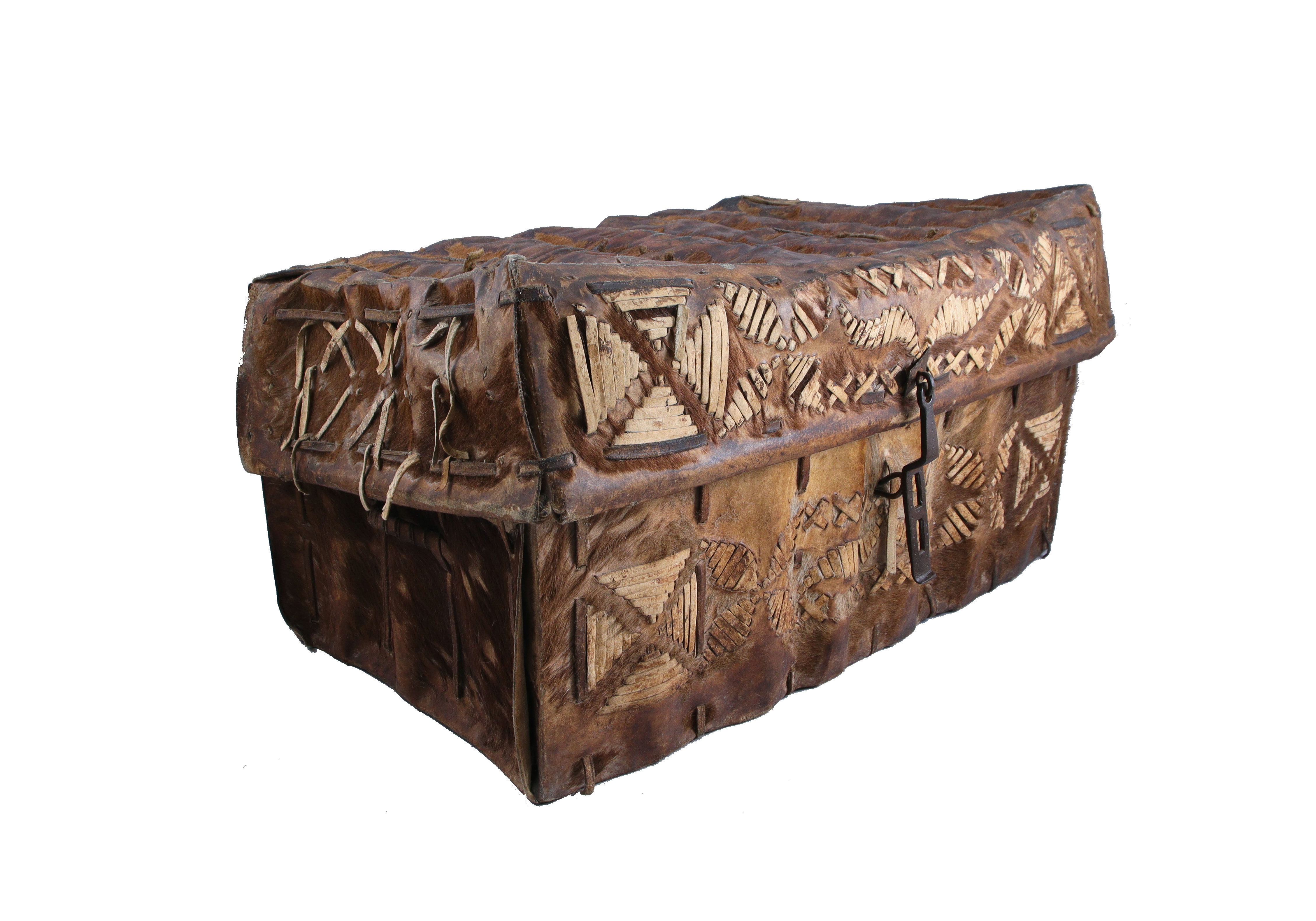 en bandes de cuirs et de peaux assemblées en différents motifs ornementaux et ornées de lanières de cuir suivant des formes géométriques. Les décors des quatre faces et des couvercles des malles reprennent le style « mudéjar » espagnol. Les ossatures en cuir sont renforcées par des lamelles de bois et les couvercles sont fermés par des serrures de métal. Poignées de cuir sur les côtés.