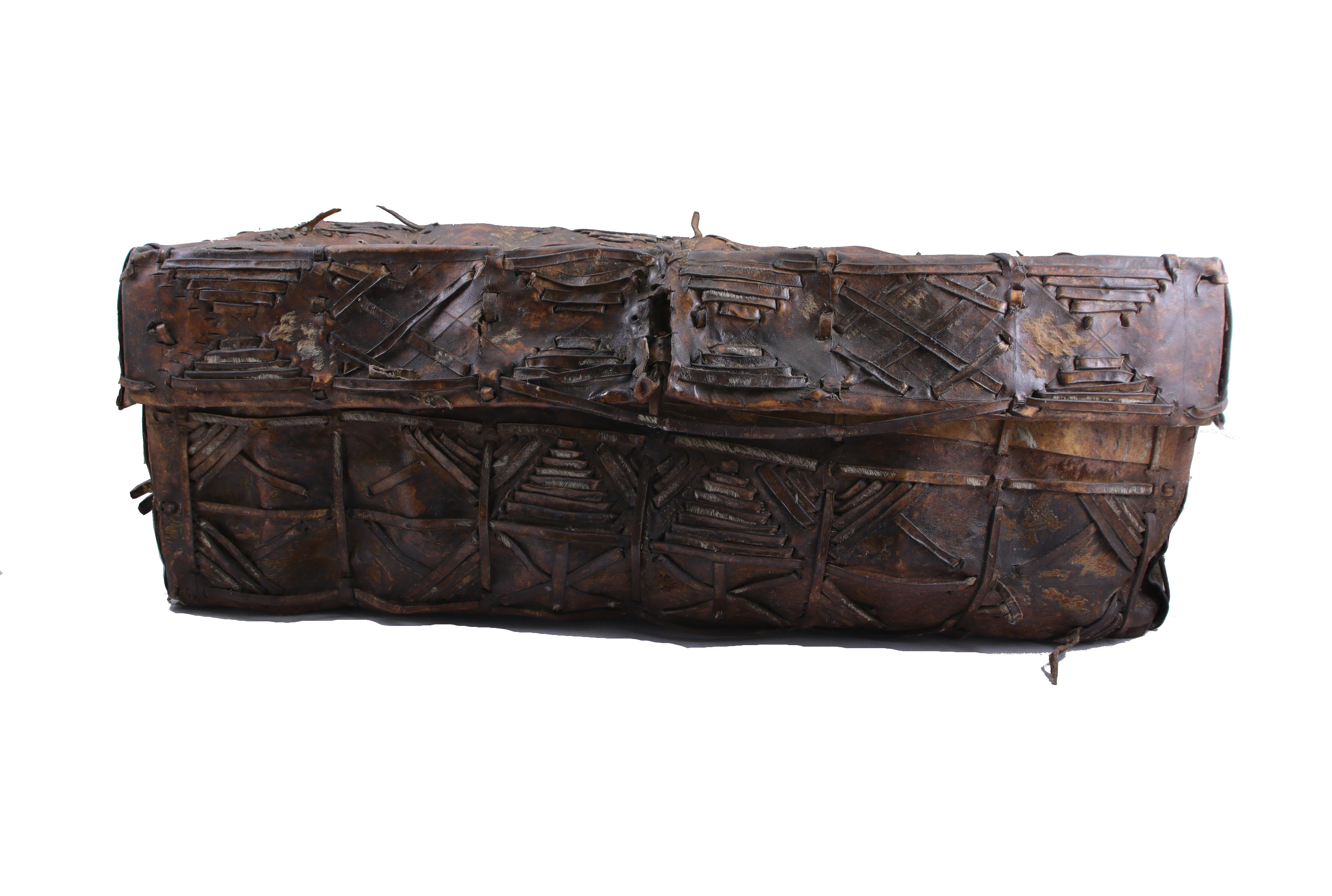en bandes de cuirs sur un cadre composé de lamelles de bois. Fermée par de simples liens de cuir, ses garnitures sont faites de bandes de cuir tendues formant des lames, des croix, des étoiles et diverses combinaisons des mêmes motifs géométriques. Cette technique semble dériver des sacs, valises et reliures de style espagnol, cousus sur la base de cuir lisse, de figures découpées ou de bandes de cuir ajourées avec différents motifs ornementaux.