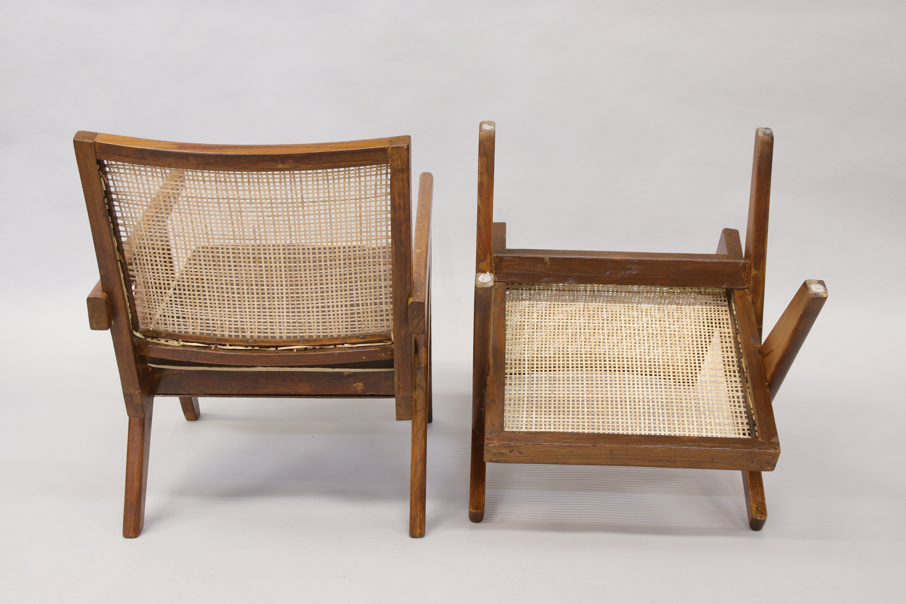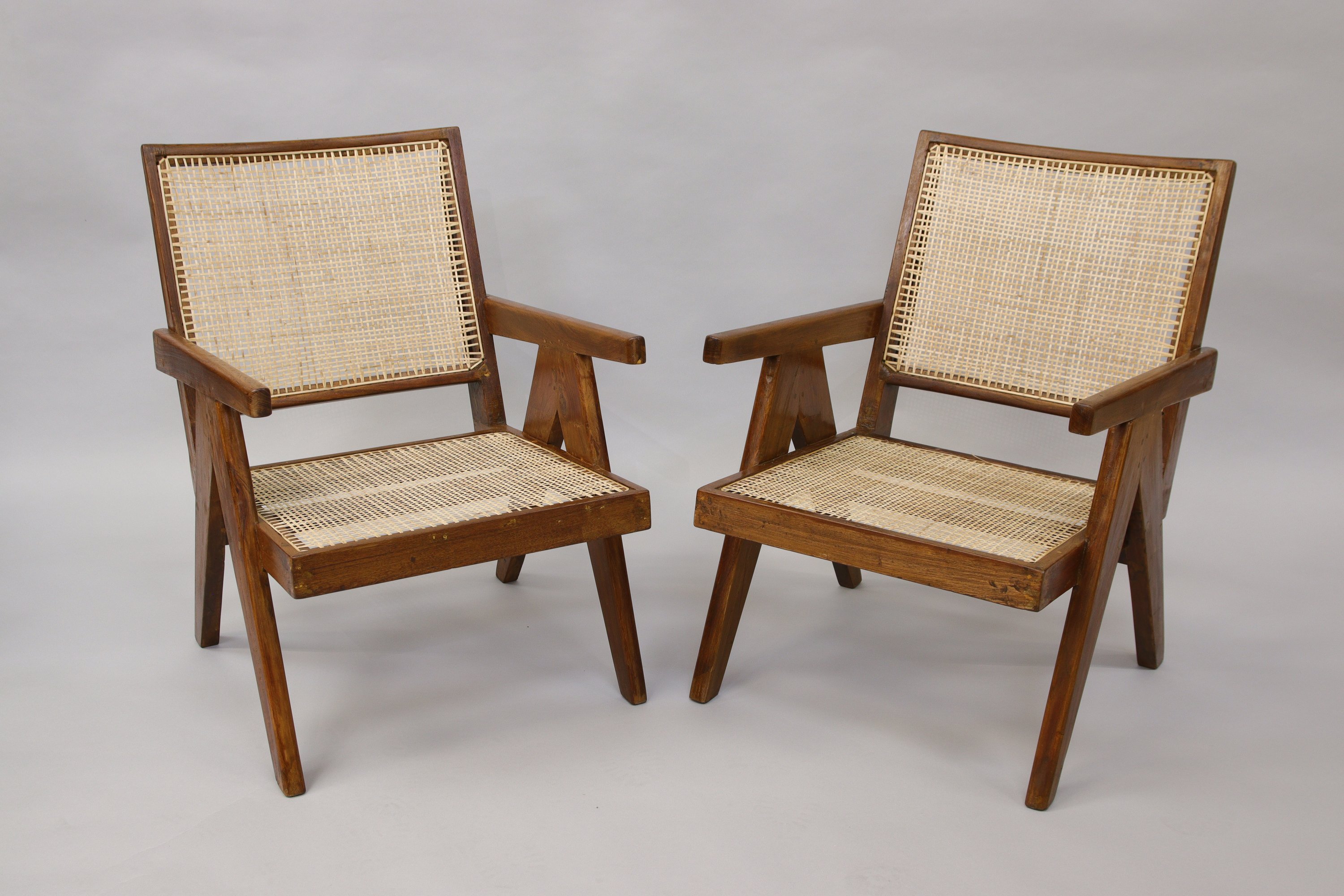 Pierre Jeanneret s’installe à Chandigarh en 1951 pour superviser les travaux d’urbanisme et d’architecture de son cousin Charles-Édouard Jeanneret, dit Le Corbusier. La nouvelle capitale du Penjab se voit appliquer le principe des « sept voies de circulation » en plus de l’érection de bâtiments des temps nouveaux. Pierre Jeanneret habille l’intérieur de ces architectures après avoir conçu lui-même les meubles de sa propre maison. Fort de ses expérimentations personnelles, il applique les théories de ce mobilier d’artiste à une production sérielle dont les meubles doivent supporter un usage intensif et public. Jeanneret s’adapte aux matériaux locaux et à la main d’œuvre des ateliers du Penjab. Le teck est ainsi extrait des forêts avoisinantes. Plusieurs gammes sont alors définies en fonction de la typologie des pieds. Ceux de forme compas répondent au type V, lequel équipe notamment nos trois fauteuils et notre bureau.