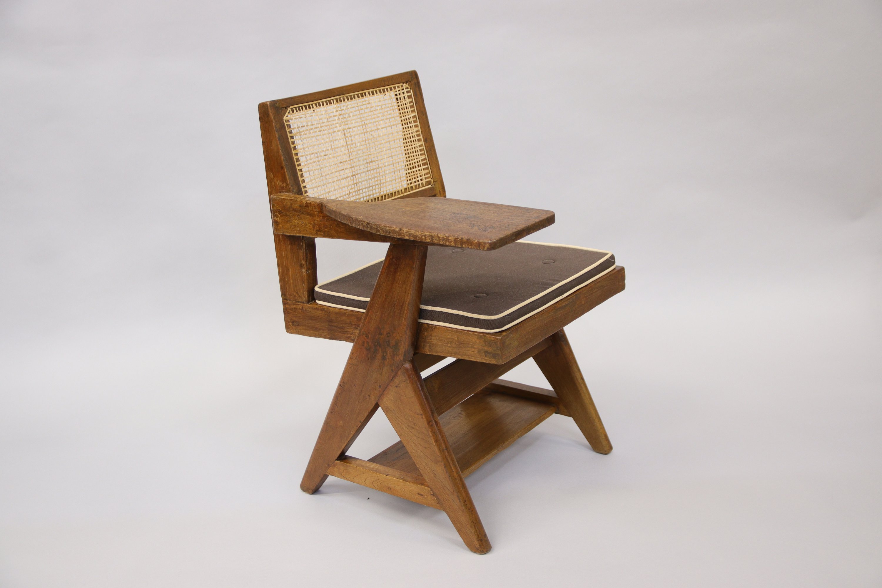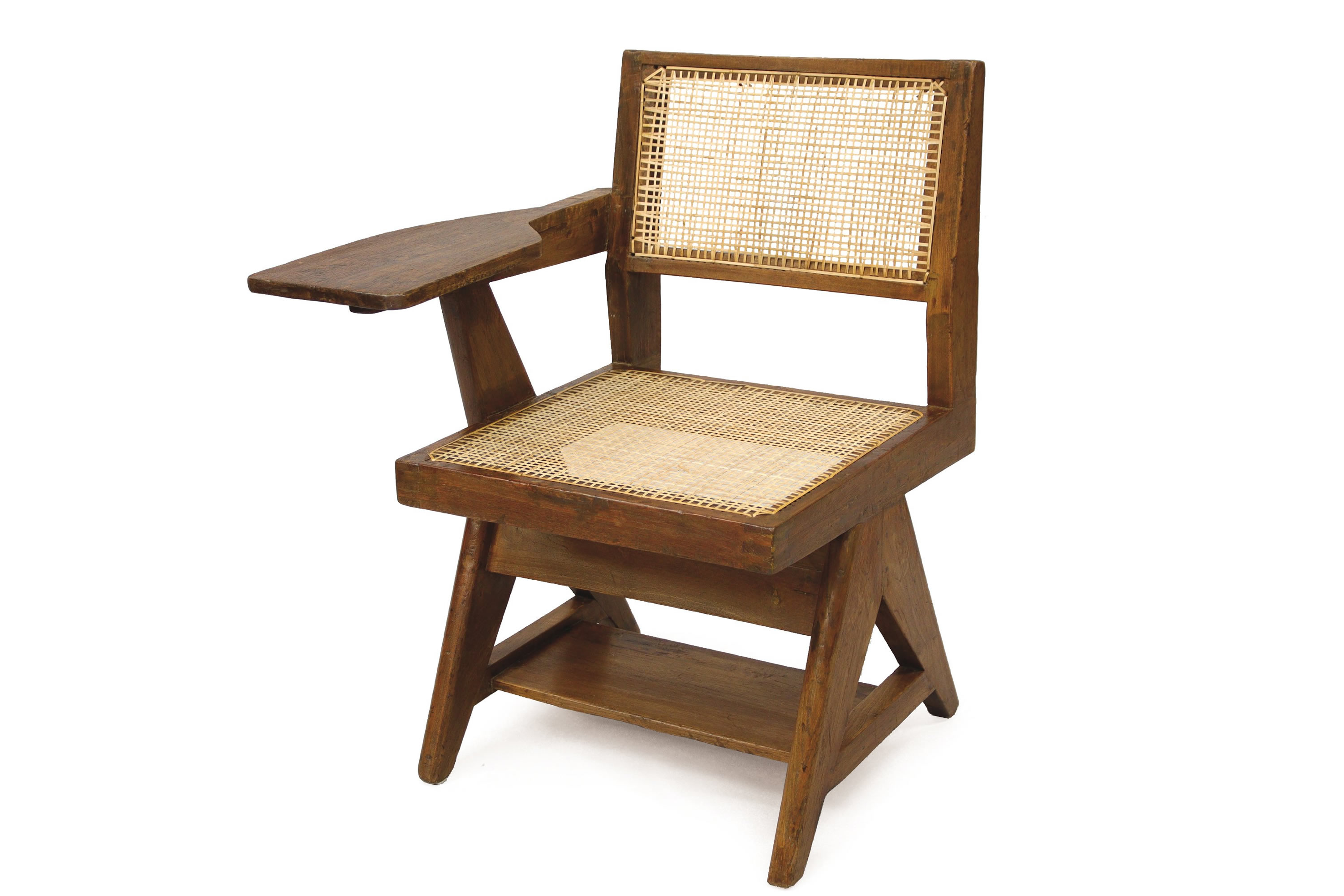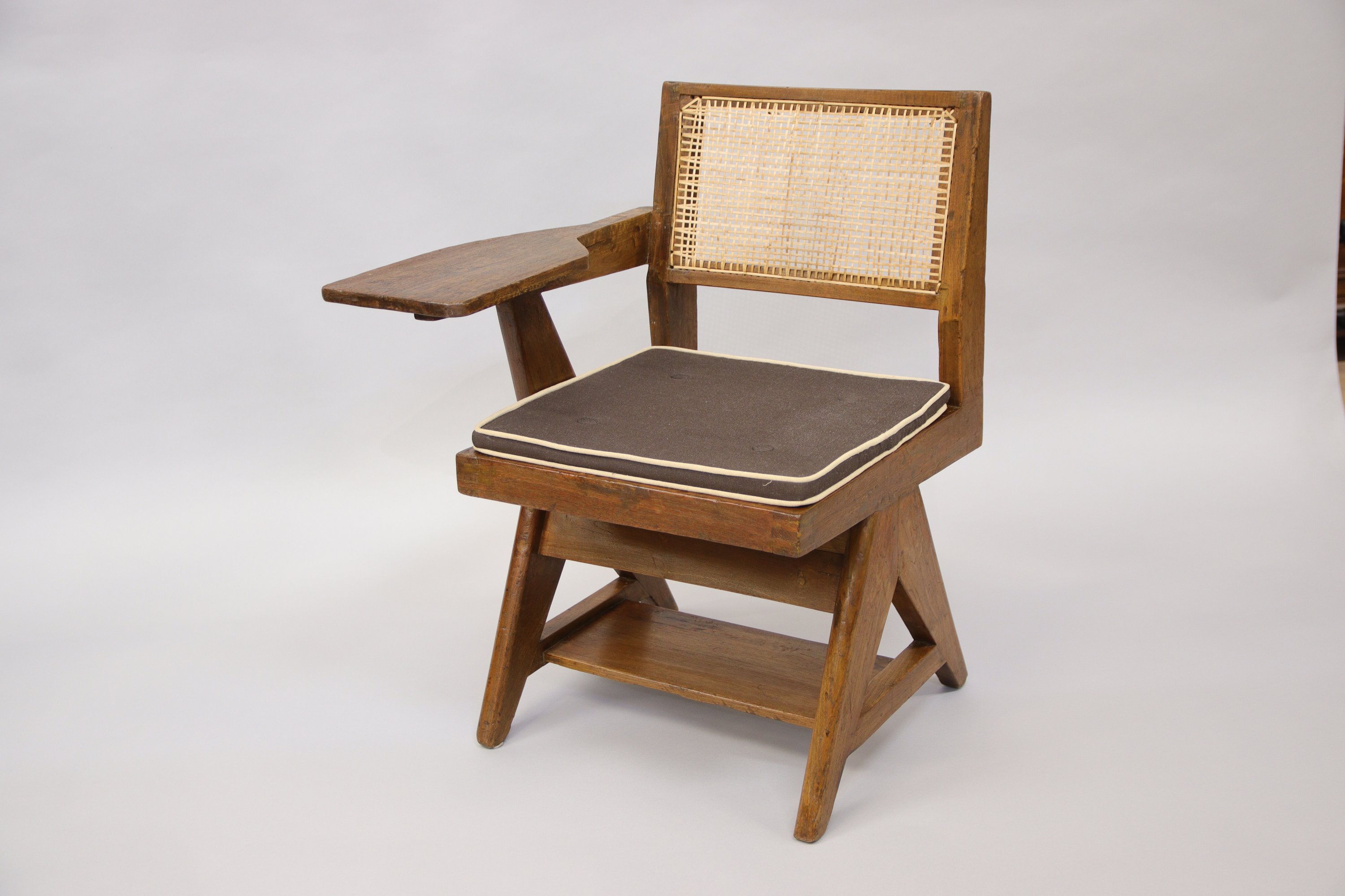 Pierre Jeanneret sinstalle à Chandigarh en 1951 pour superviser les travaux durbanisme et darchitecture de son cousin Charles-Édouard Jeanneret, dit Le Corbusier. La nouvelle capitale du Penjab se voit appliquer le principe des « sept voies de circulation » en plus de lérection de bâtiments des temps nouveaux. Pierre Jeanneret habille lintérieur de ces architectures après avoir conçu lui-même les meubles de sa propre maison. Fort de ses expérimentations personnelles, il applique les théories de ce mobilier dartiste à une production sérielle dont les meubles doivent supporter un usage intensif et public. Jeanneret sadapte aux matériaux locaux et à la main duvre des ateliers du Penjab. Le teck est ainsi extrait des forêts avoisinantes. Plusieurs gammes sont alors définies en fonction de la typologie des pieds. Ceux de forme compas répondent au type V, lequel équipe notamment nos trois fauteuils et notre bureau.