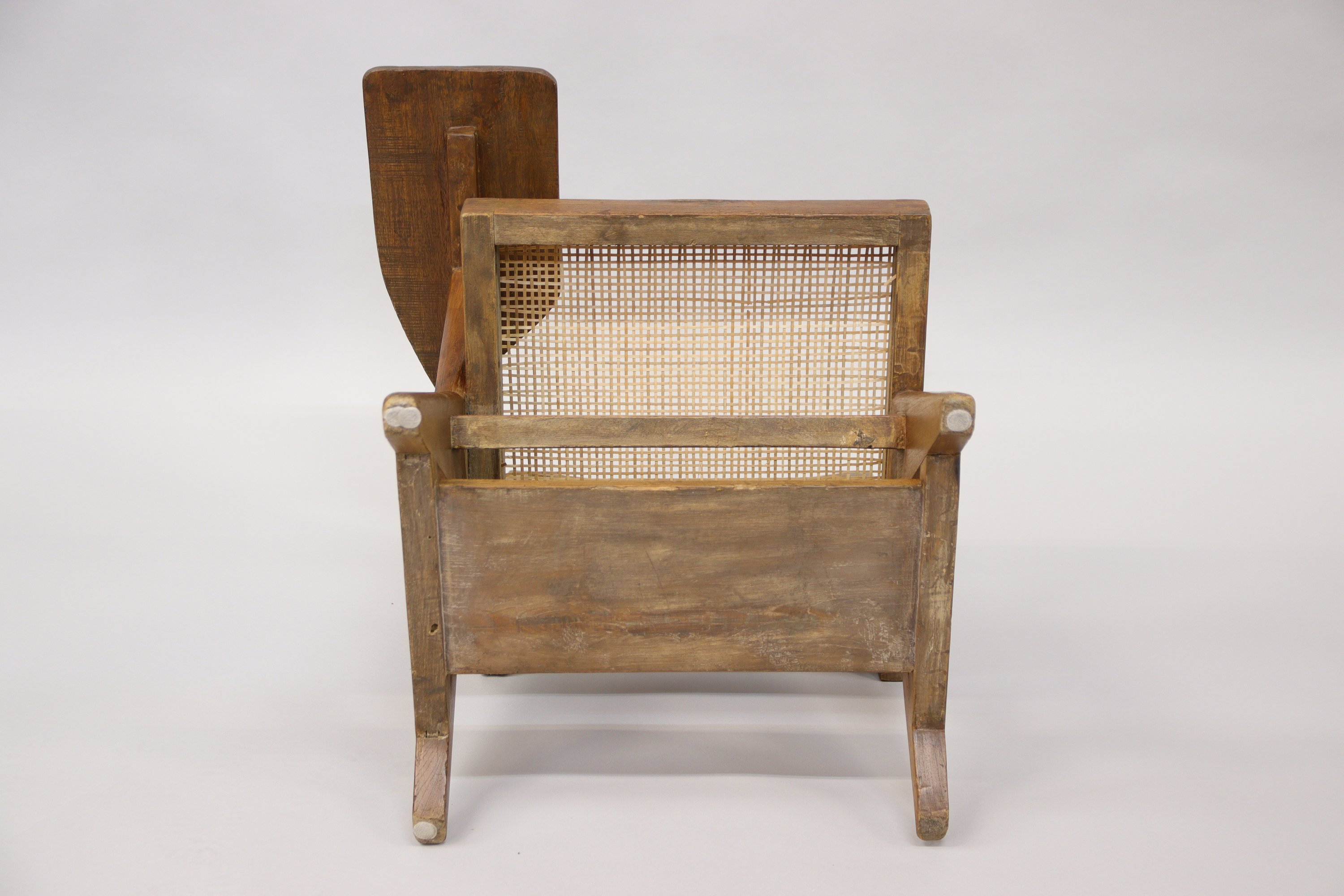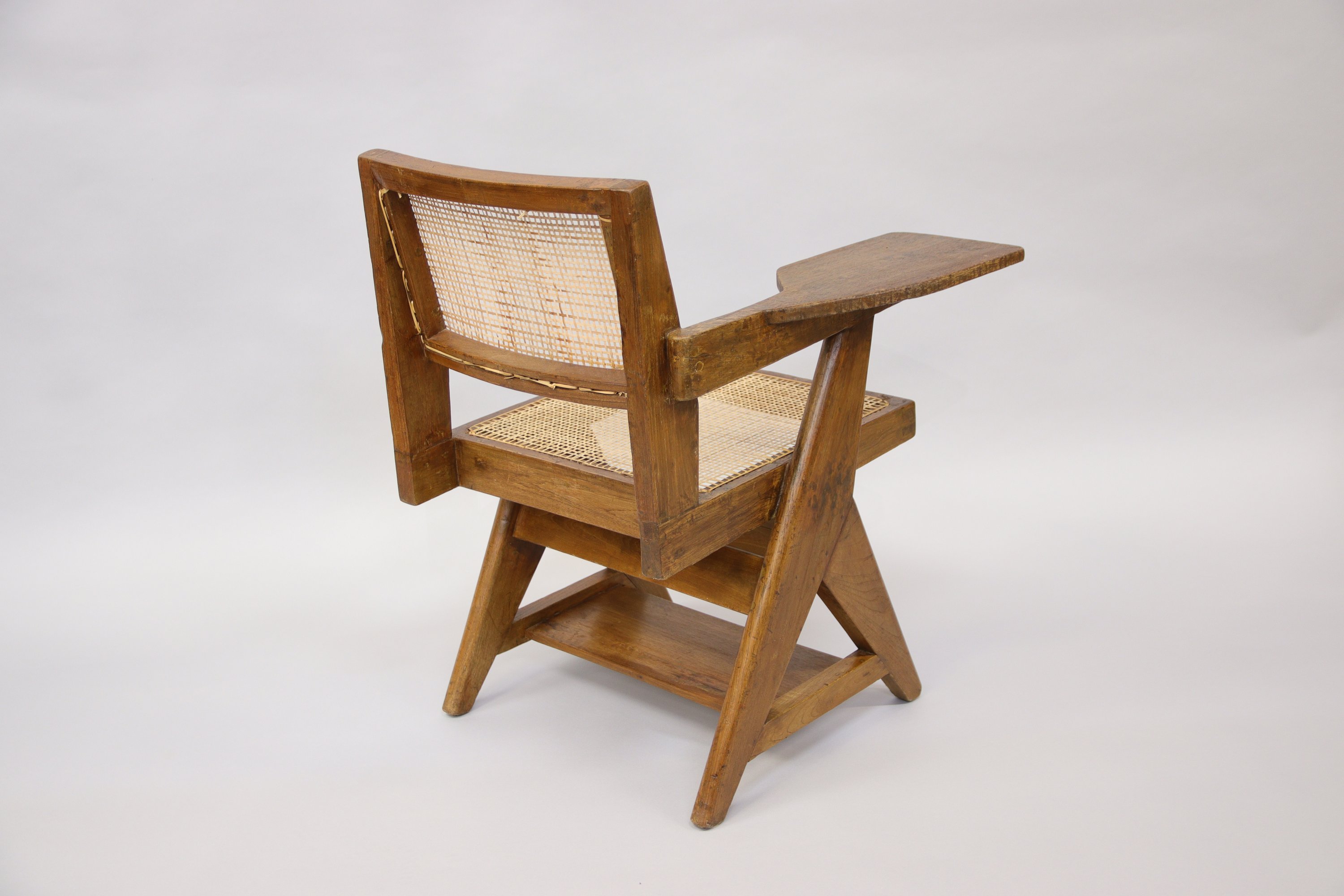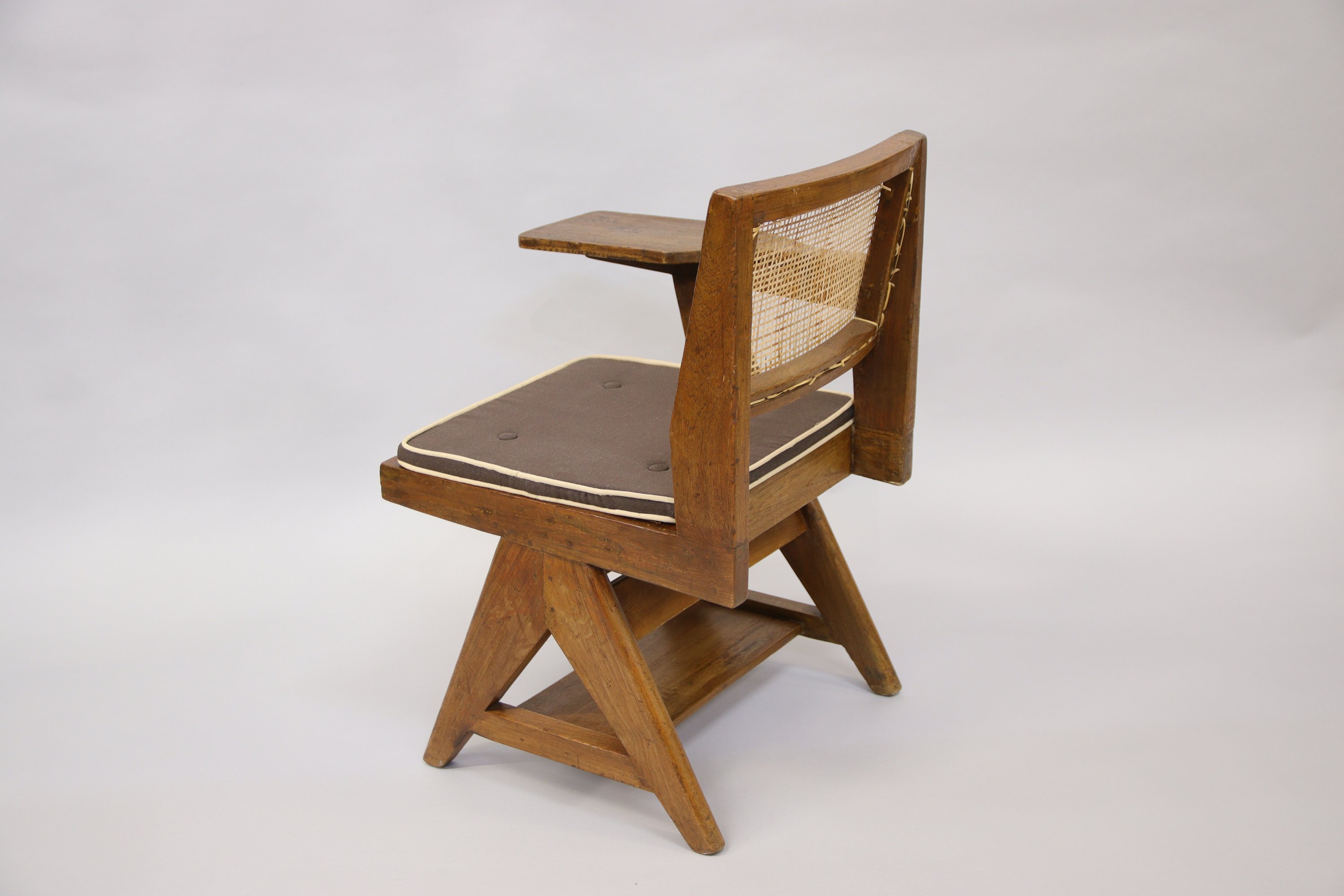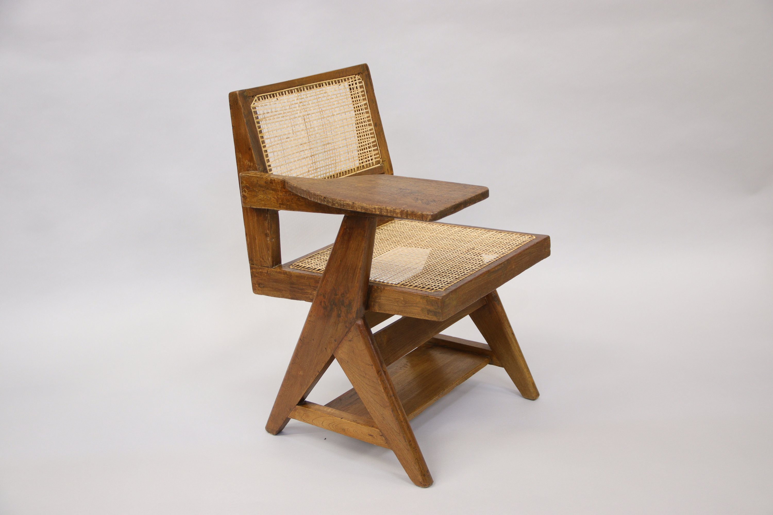 Pierre Jeanneret sinstalle à Chandigarh en 1951 pour superviser les travaux durbanisme et darchitecture de son cousin Charles-Édouard Jeanneret, dit Le Corbusier. La nouvelle capitale du Penjab se voit appliquer le principe des « sept voies de circulation » en plus de lérection de bâtiments des temps nouveaux. Pierre Jeanneret habille lintérieur de ces architectures après avoir conçu lui-même les meubles de sa propre maison. Fort de ses expérimentations personnelles, il applique les théories de ce mobilier dartiste à une production sérielle dont les meubles doivent supporter un usage intensif et public. Jeanneret sadapte aux matériaux locaux et à la main duvre des ateliers du Penjab. Le teck est ainsi extrait des forêts avoisinantes. Plusieurs gammes sont alors définies en fonction de la typologie des pieds. Ceux de forme compas répondent au type V, lequel équipe notamment nos trois fauteuils et notre bureau.