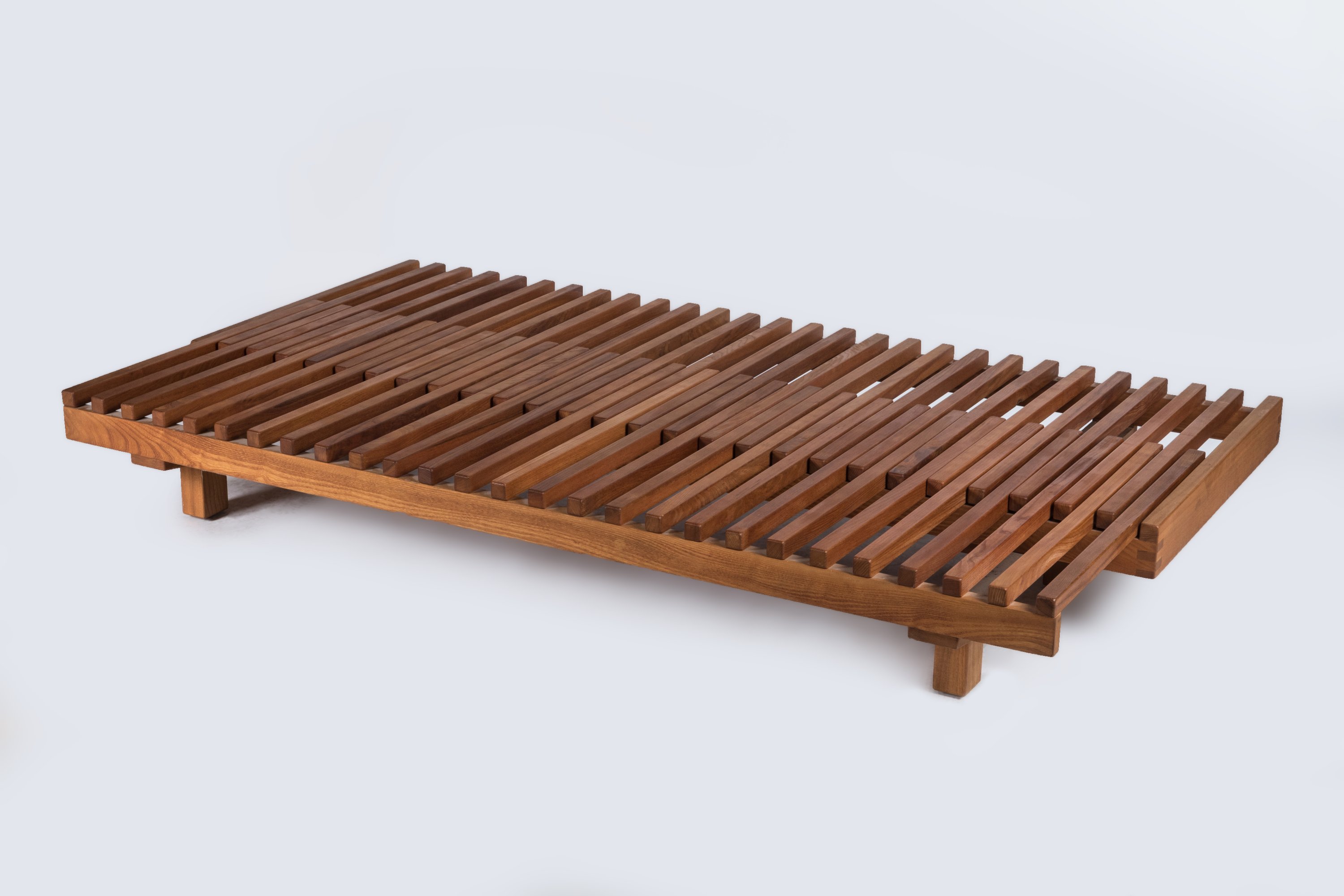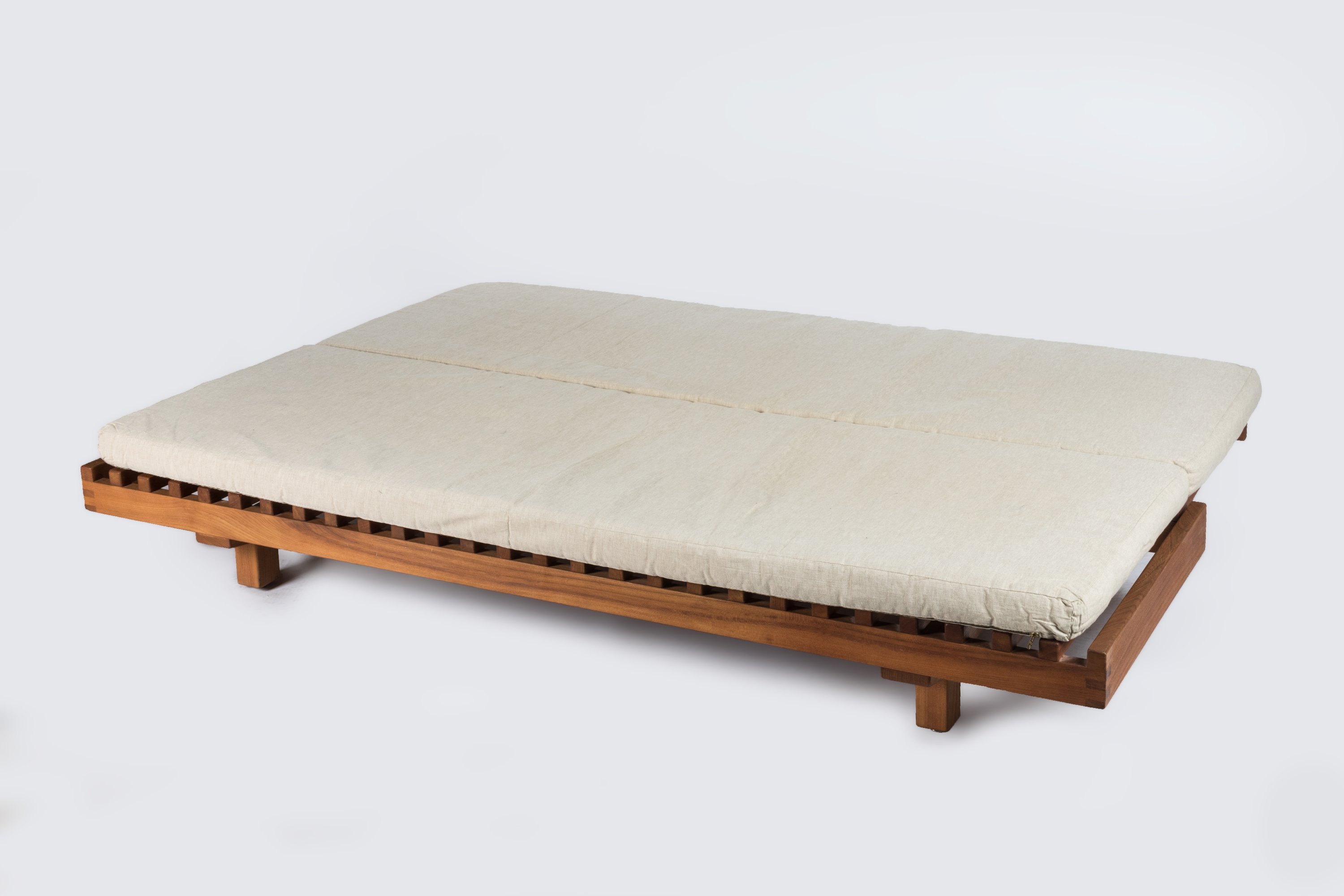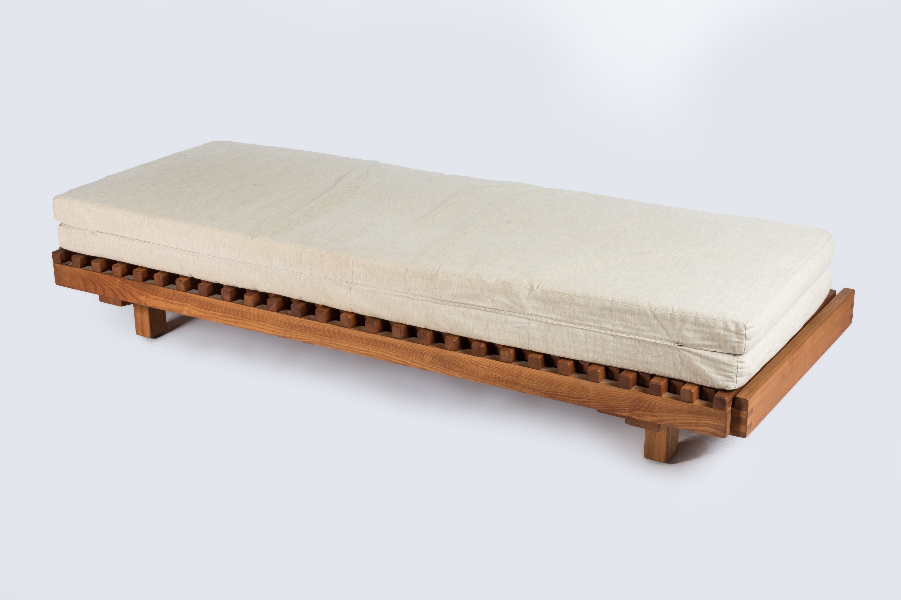 en orme massif, composée de deux bancs de lattes à claire voie coulissant l'un dans l'autre. Leur matelas à charnière s'ouvre comme un livre.