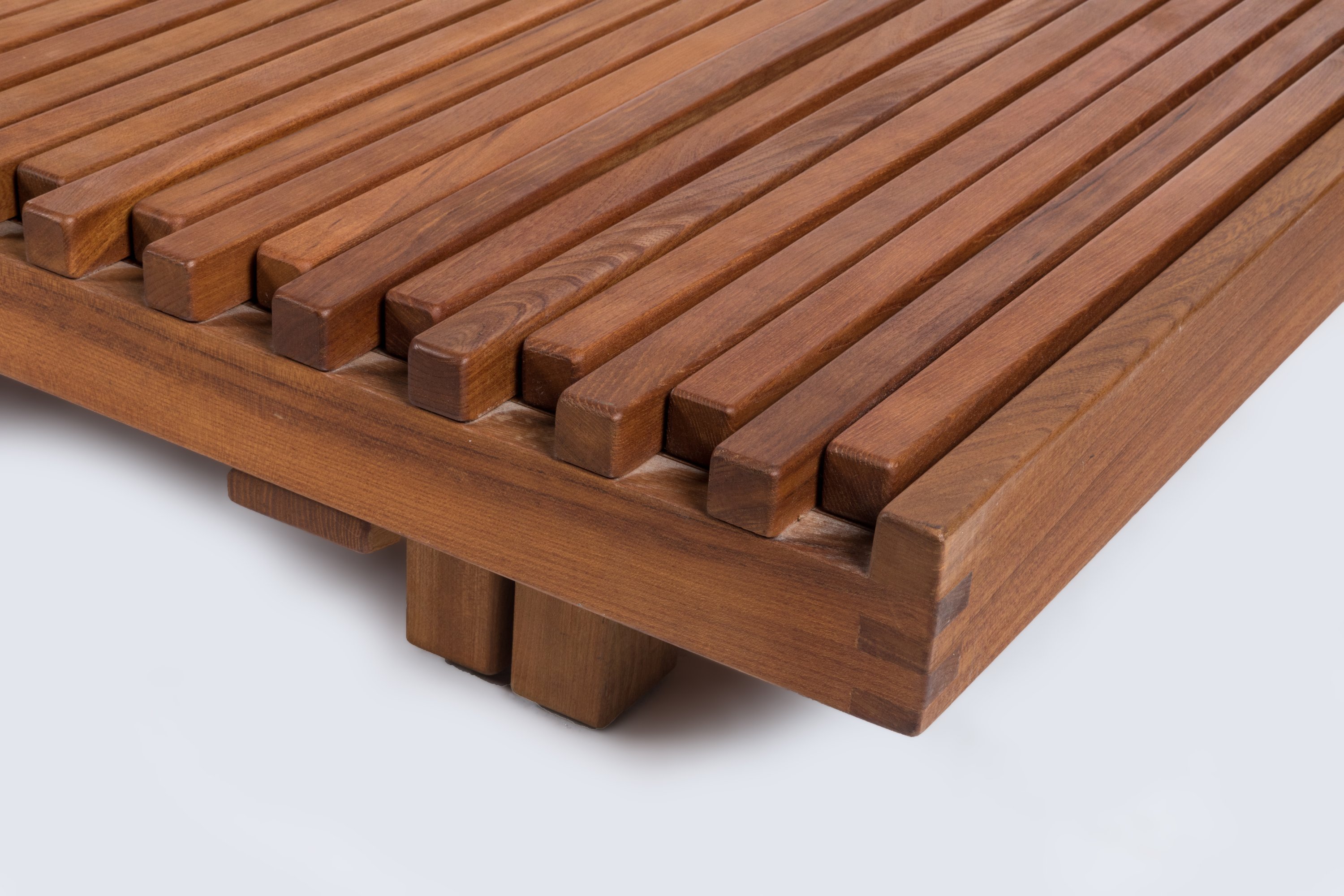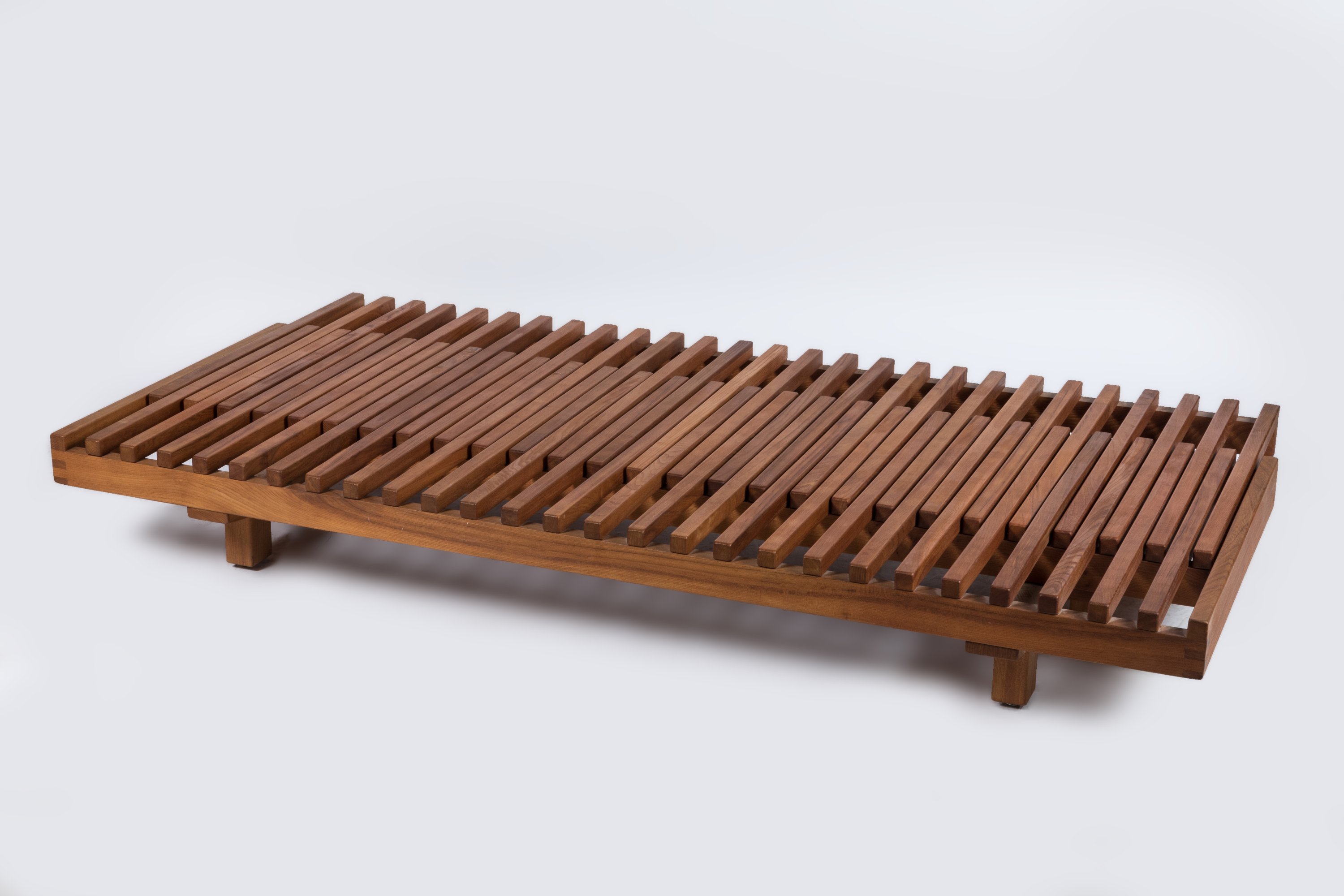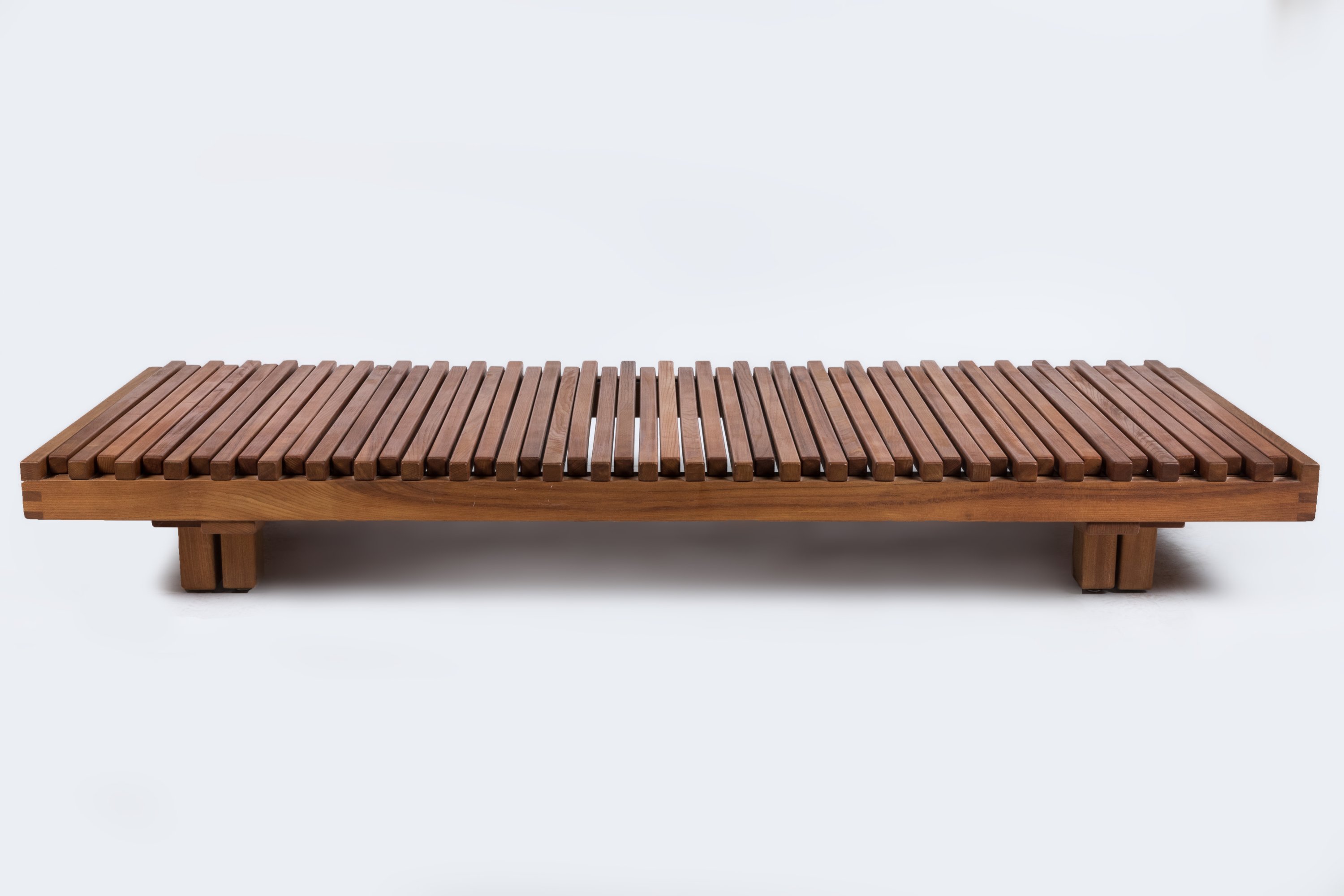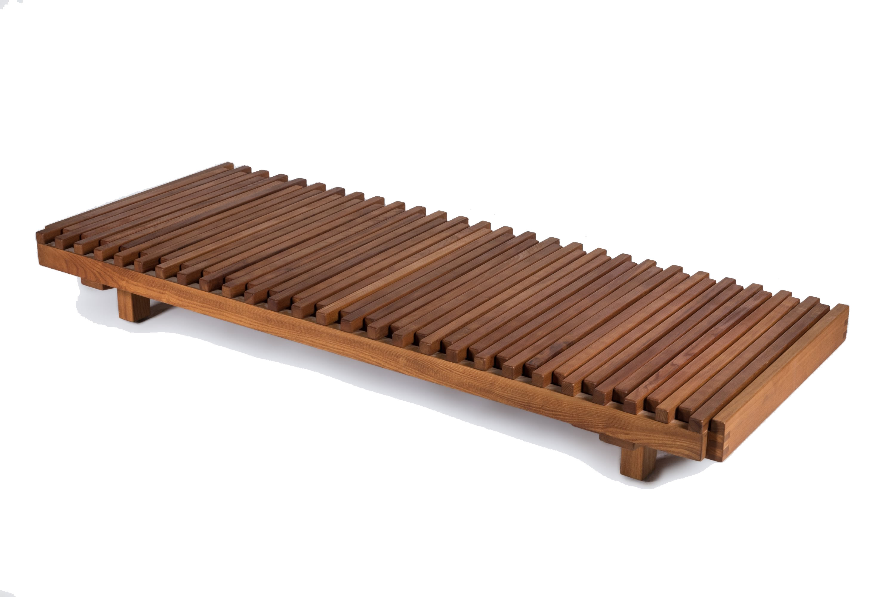 en orme massif, composée de deux bancs de lattes à claire voie coulissant l'un dans l'autre. Leur matelas à charnière s'ouvre comme un livre.