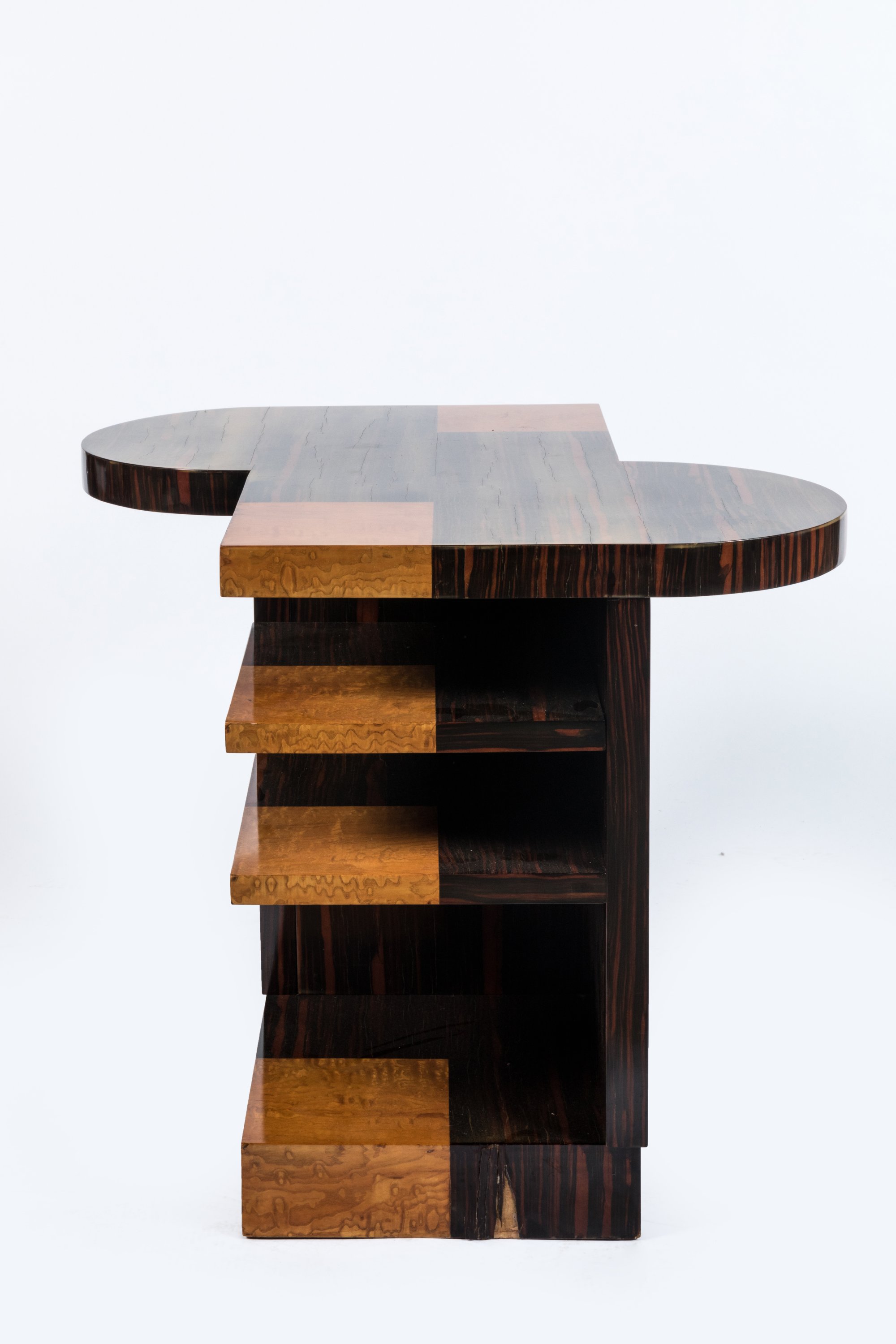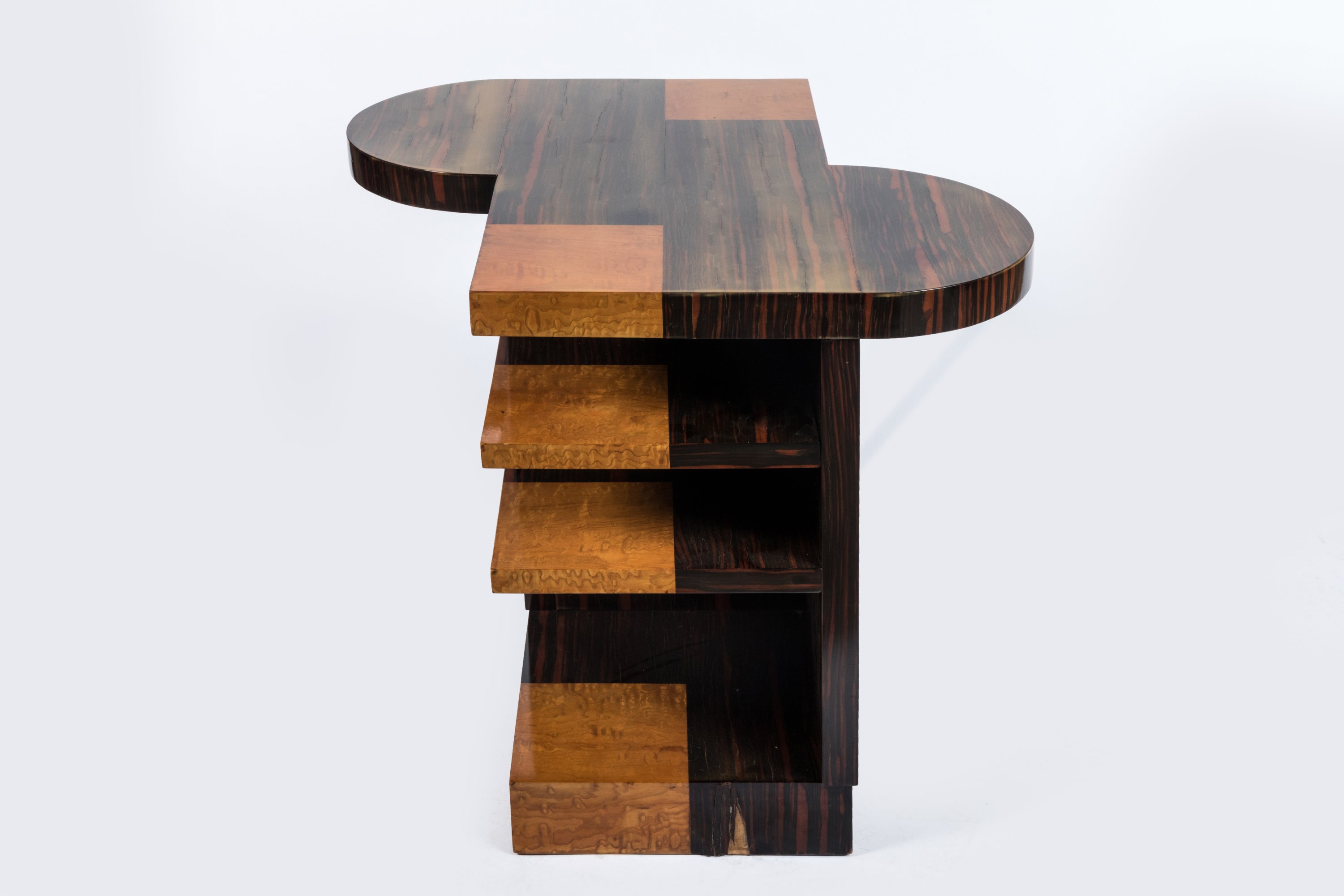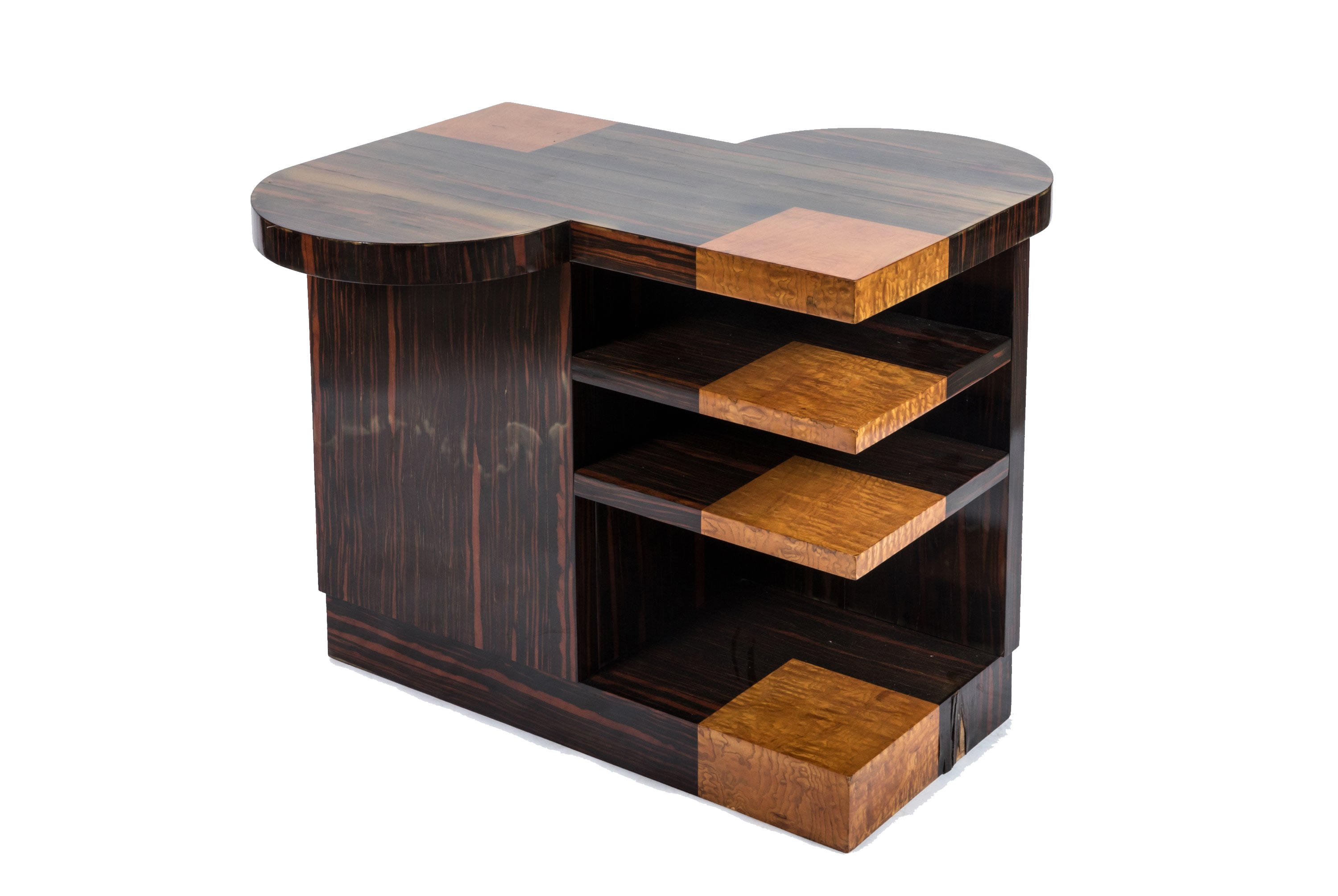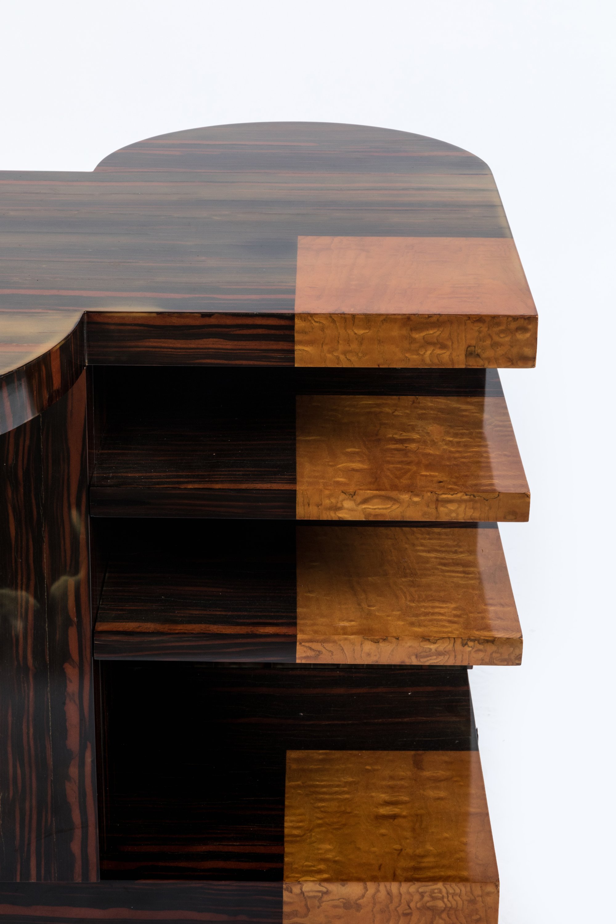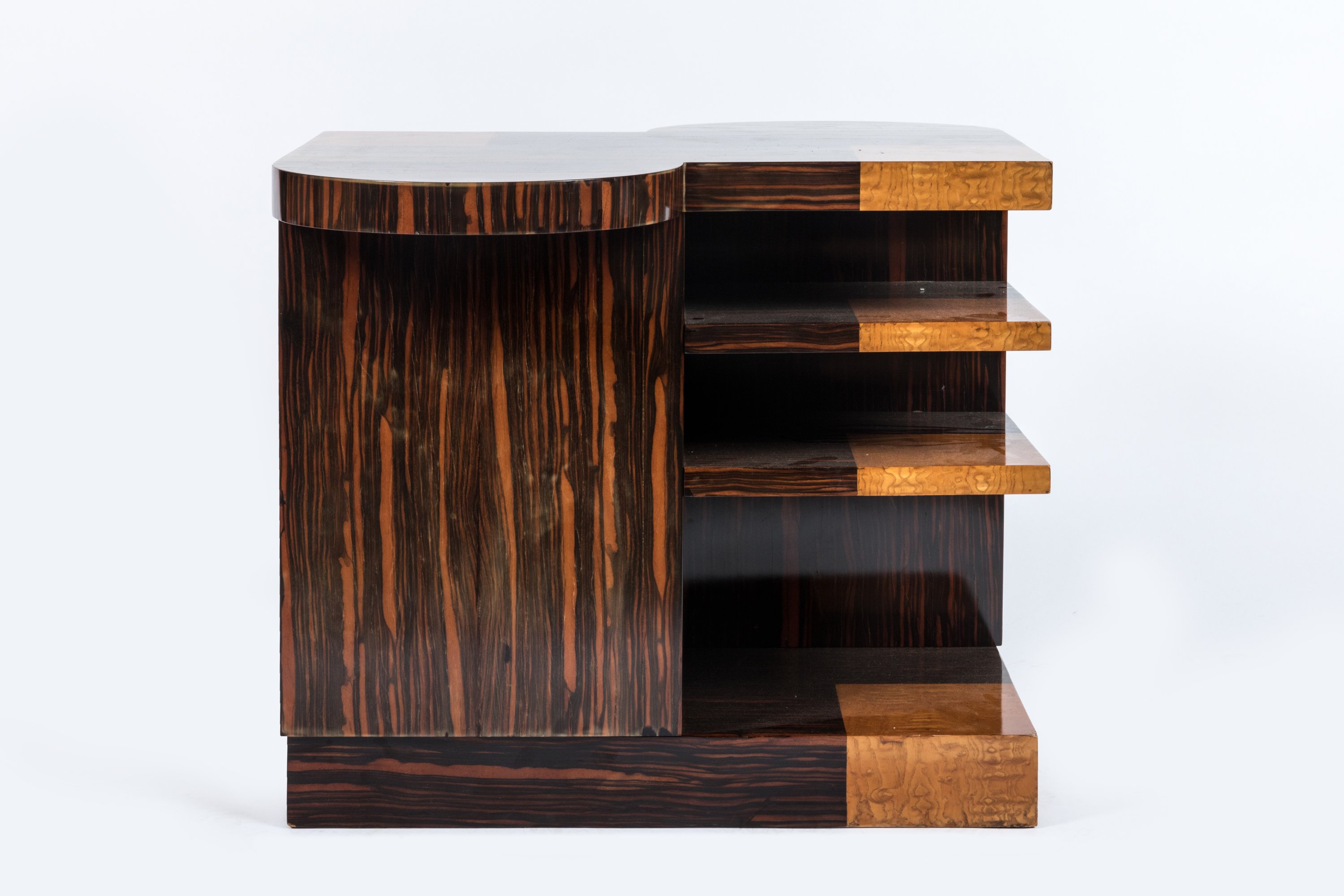 en placage d'ébène de Macassar et loupe. La structure géométrisante est ornée d'un plateau bilobé et de trois niveaux d'étagères, à décor de carrés de loupe dans les angles.