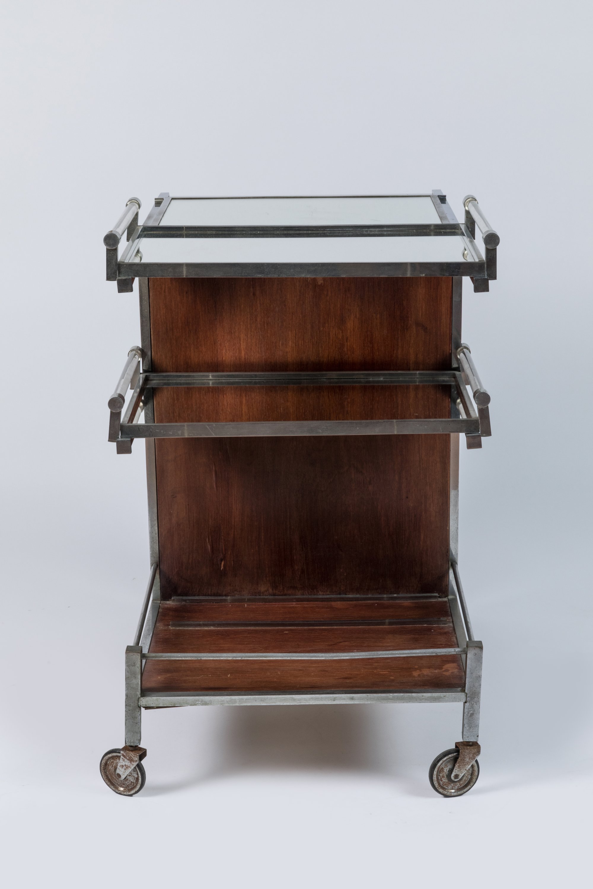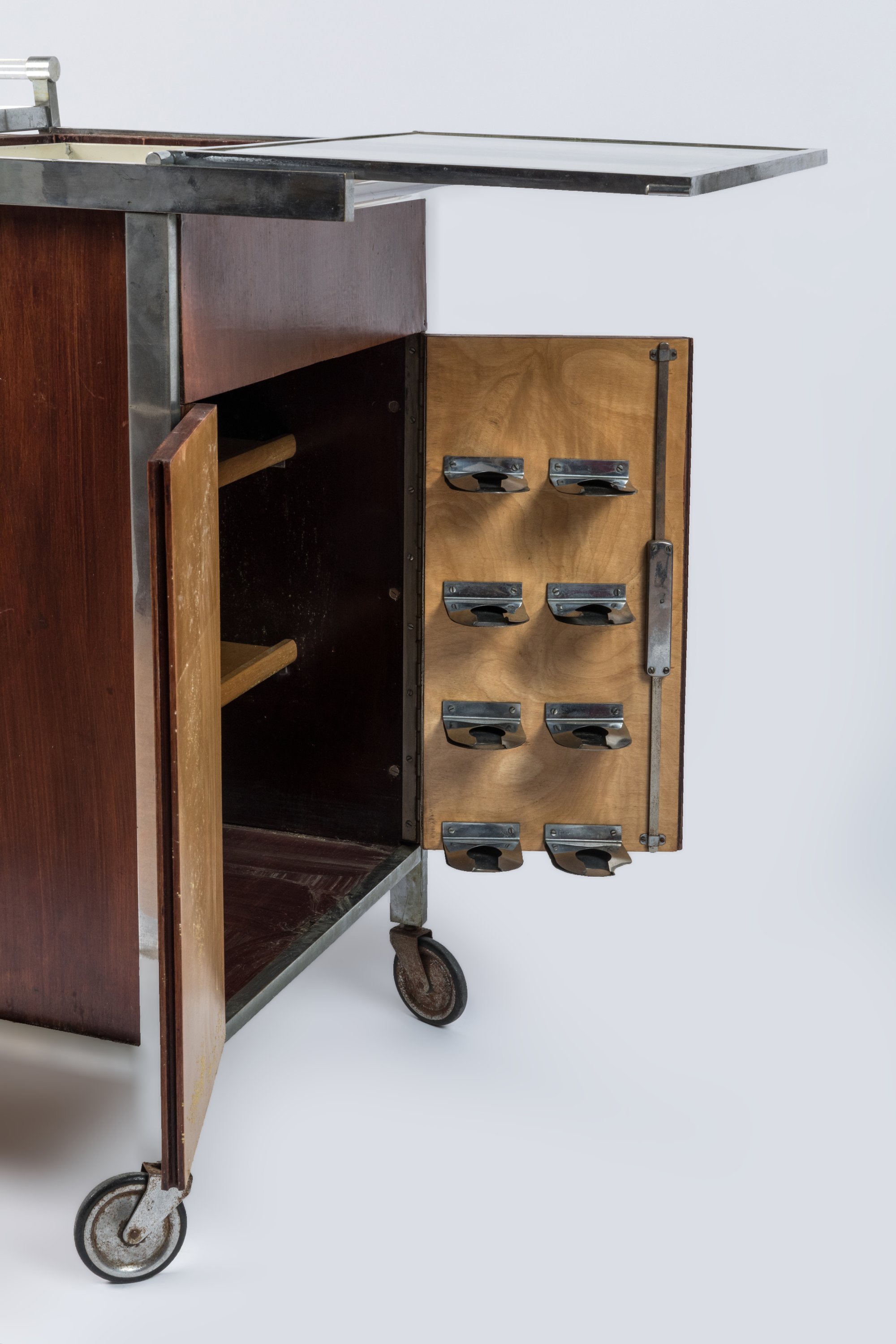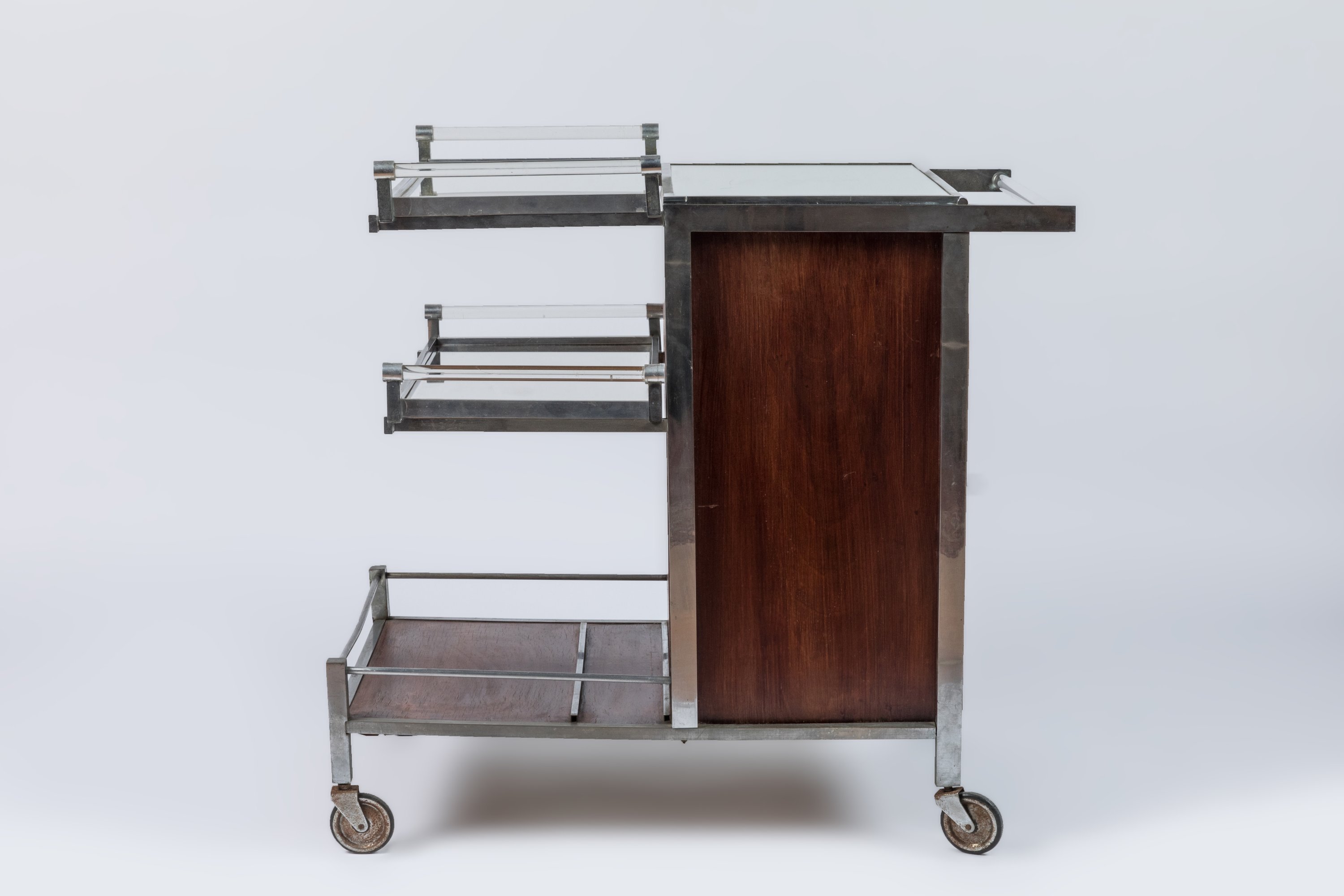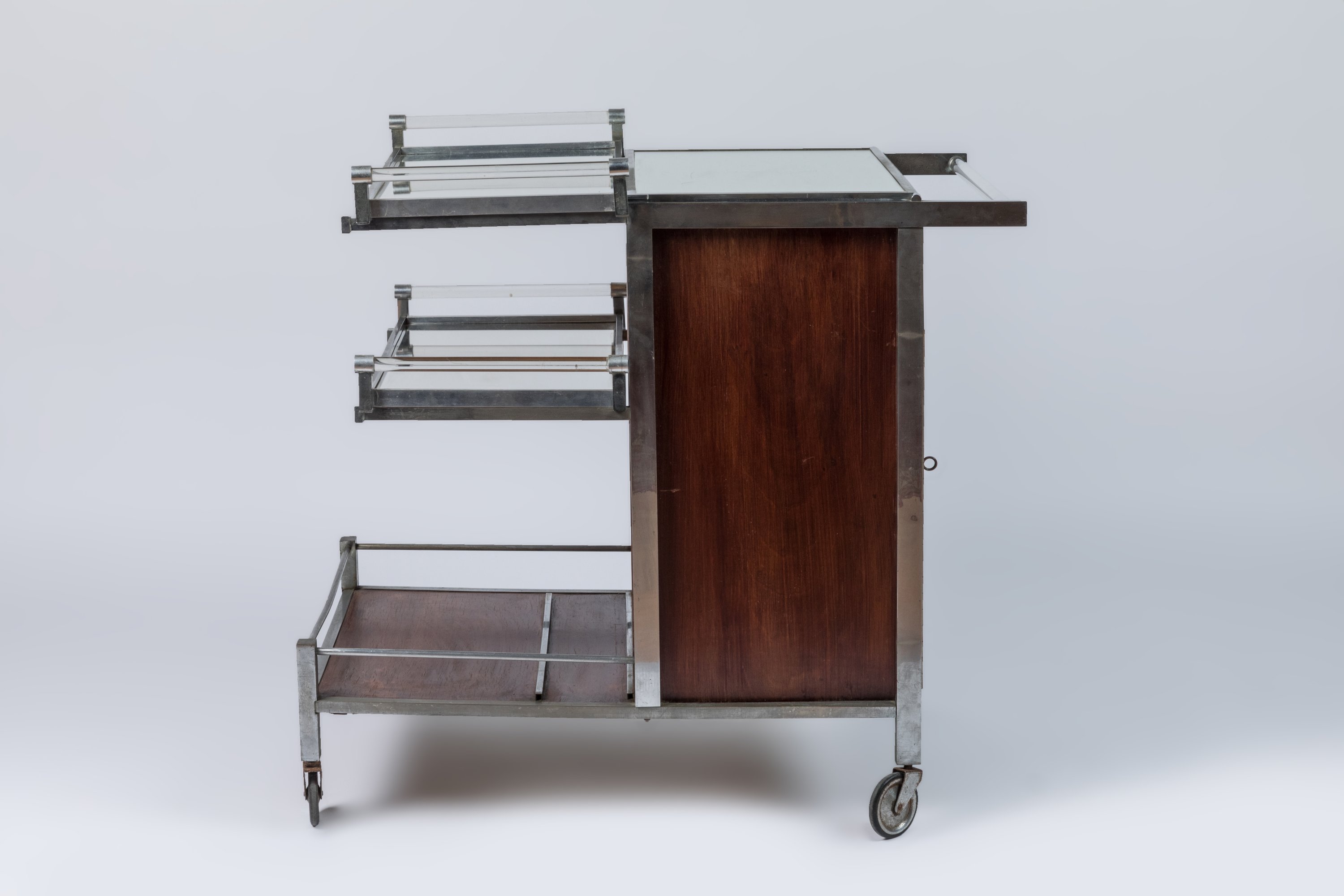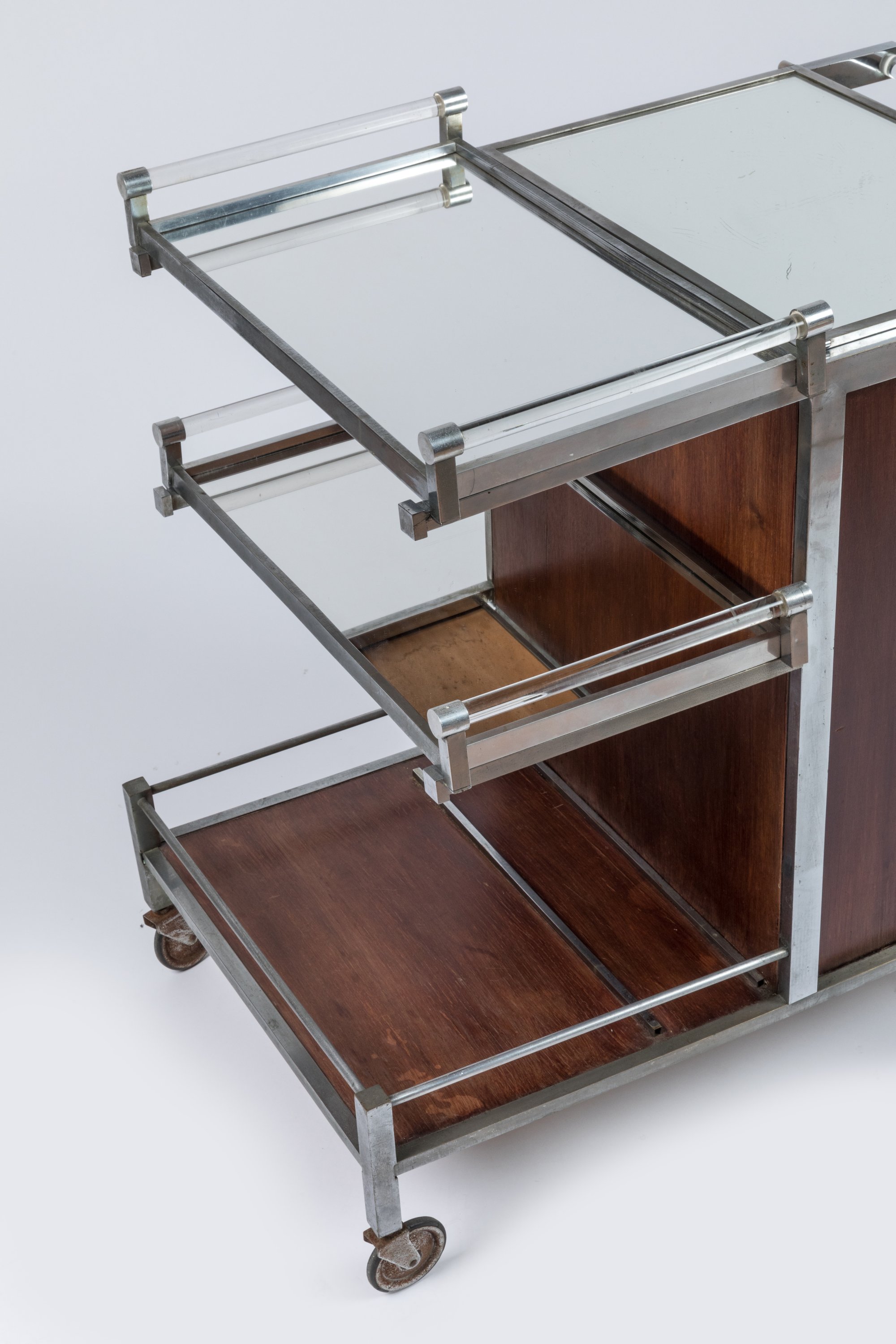en métal chromé, plexiglas, aluminium et placage de palissandre. Il ouvre en partie supérieure par un abattant foncé d'un miroir sur un bac à glaçons en métal laqué beige. Deux portes fermant à clé ouvrent sur le côté du caisson du bar. Deux plateaux foncés d'un miroir reposent de l'autre côté. Il repose sur quatre roulettes.